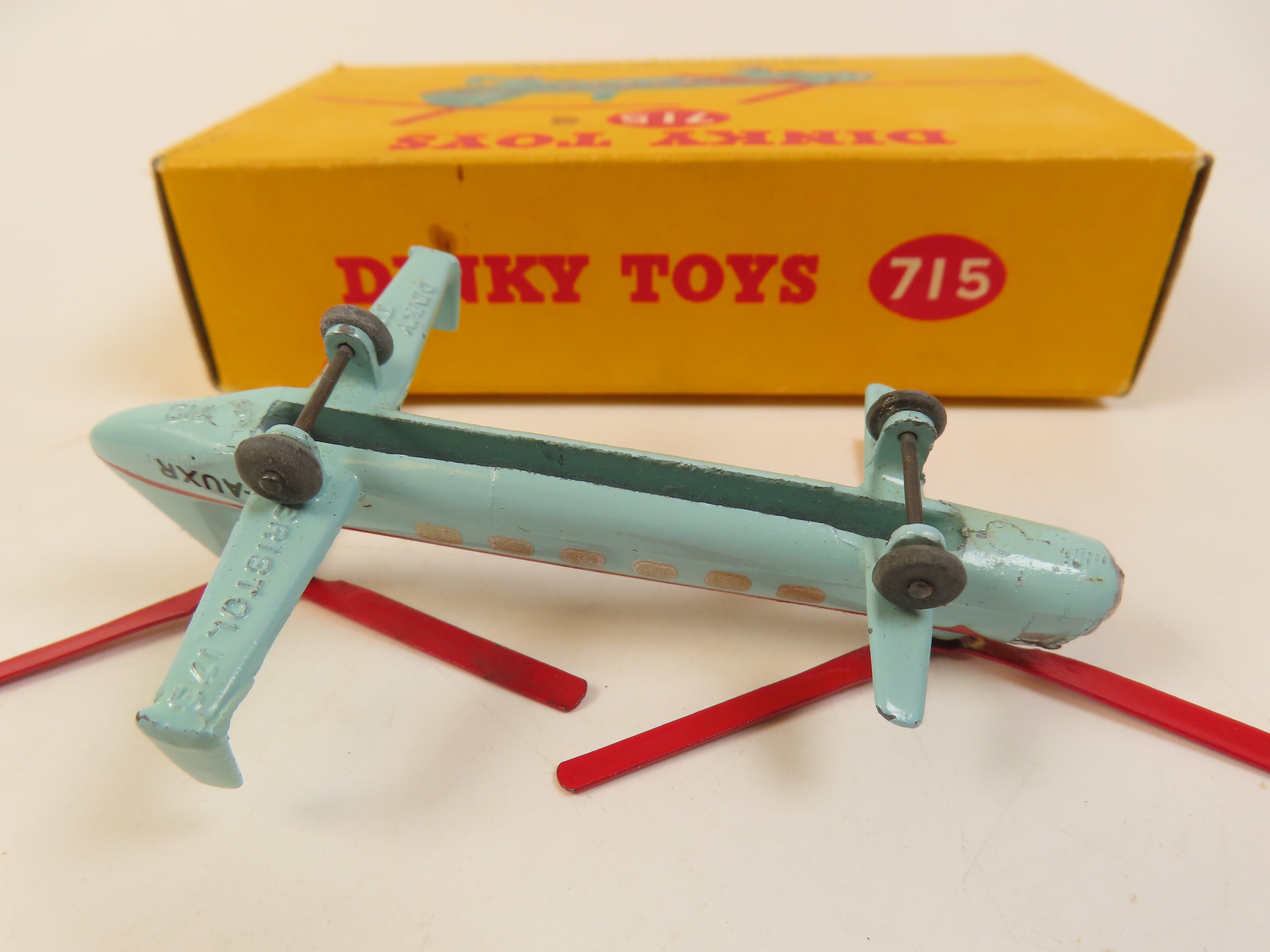 Dinky 715 Bristol 173 Helicopter in aqua with red stripes and propellor blades and black lettering to the rear.