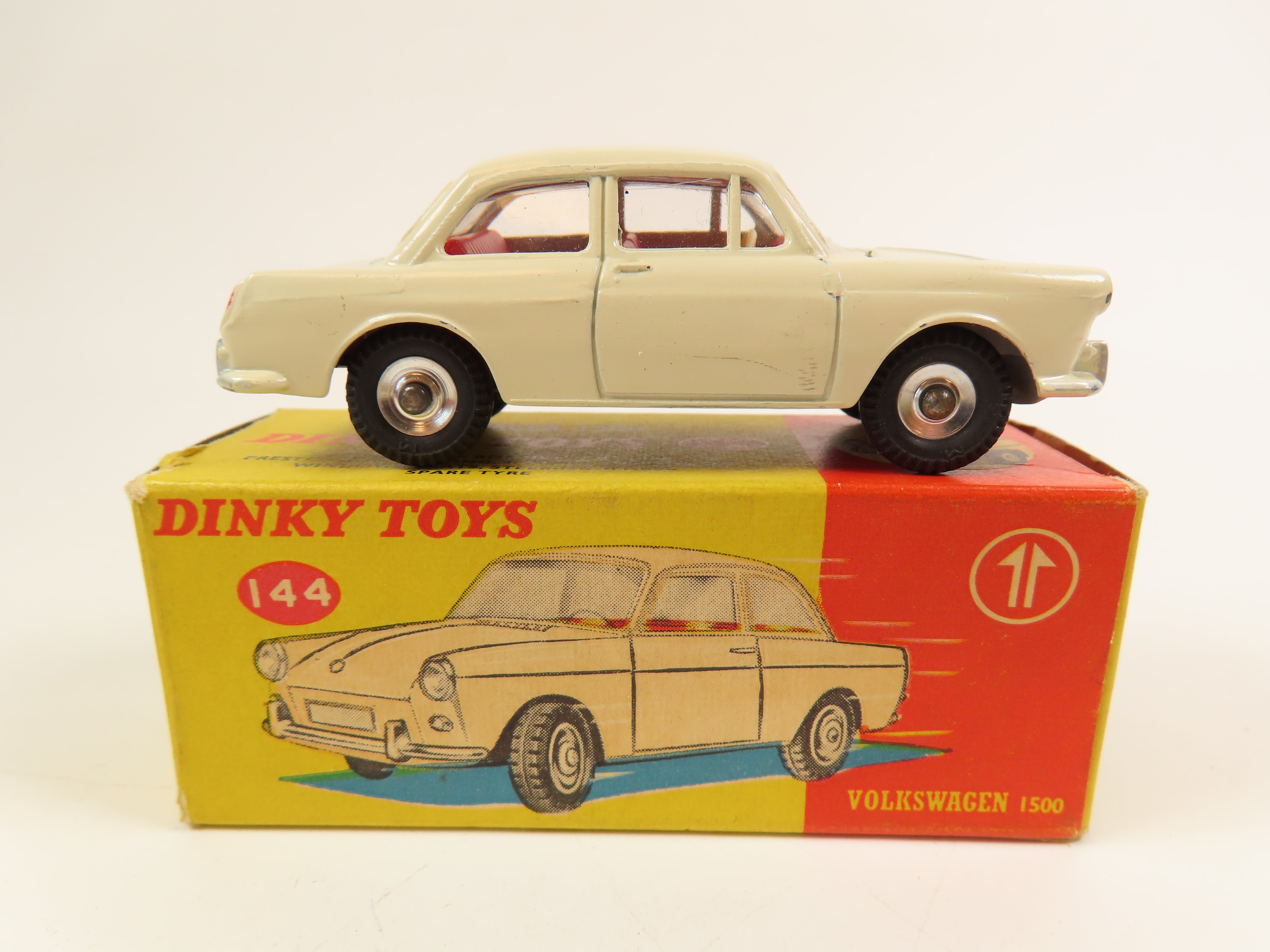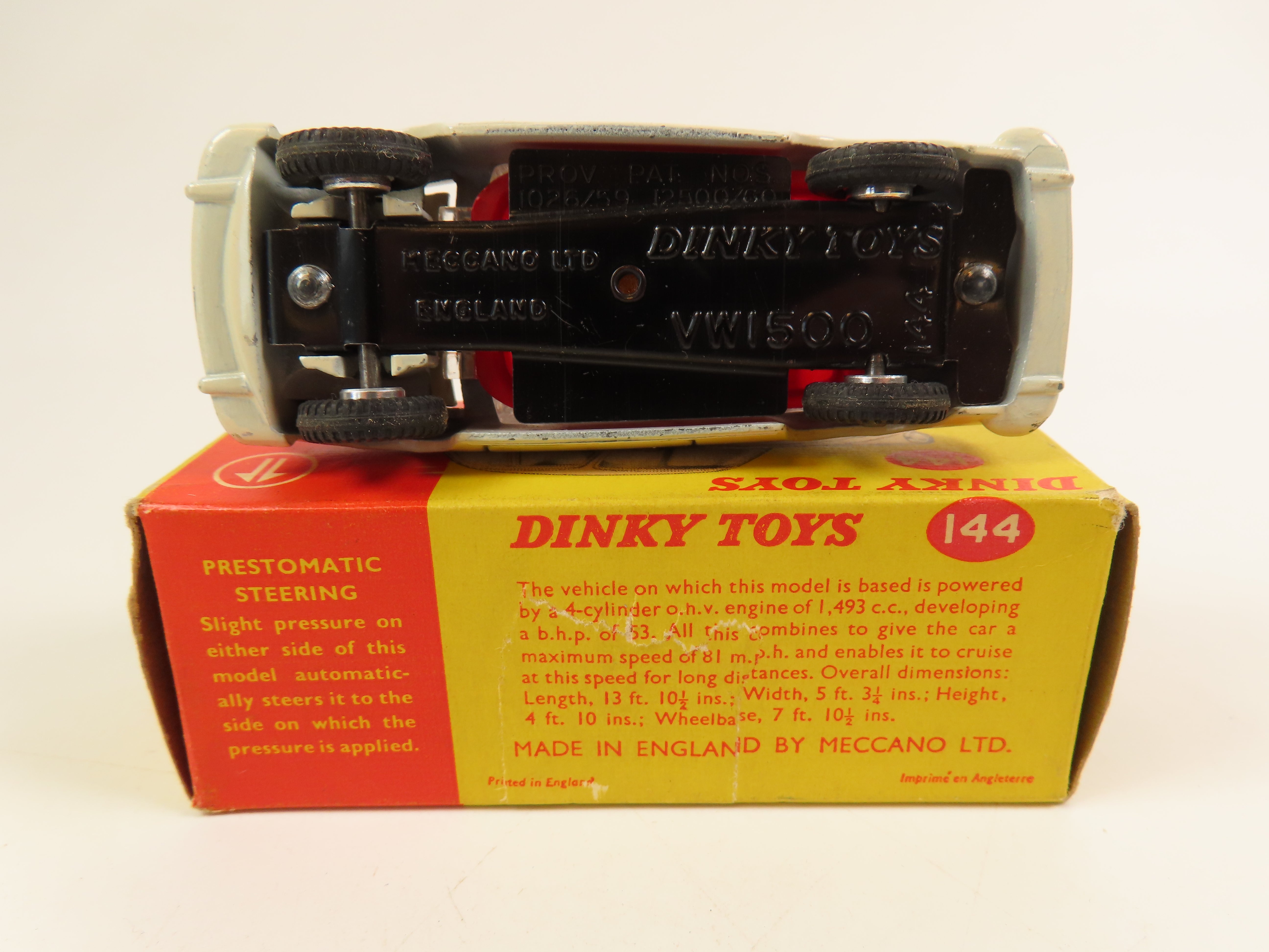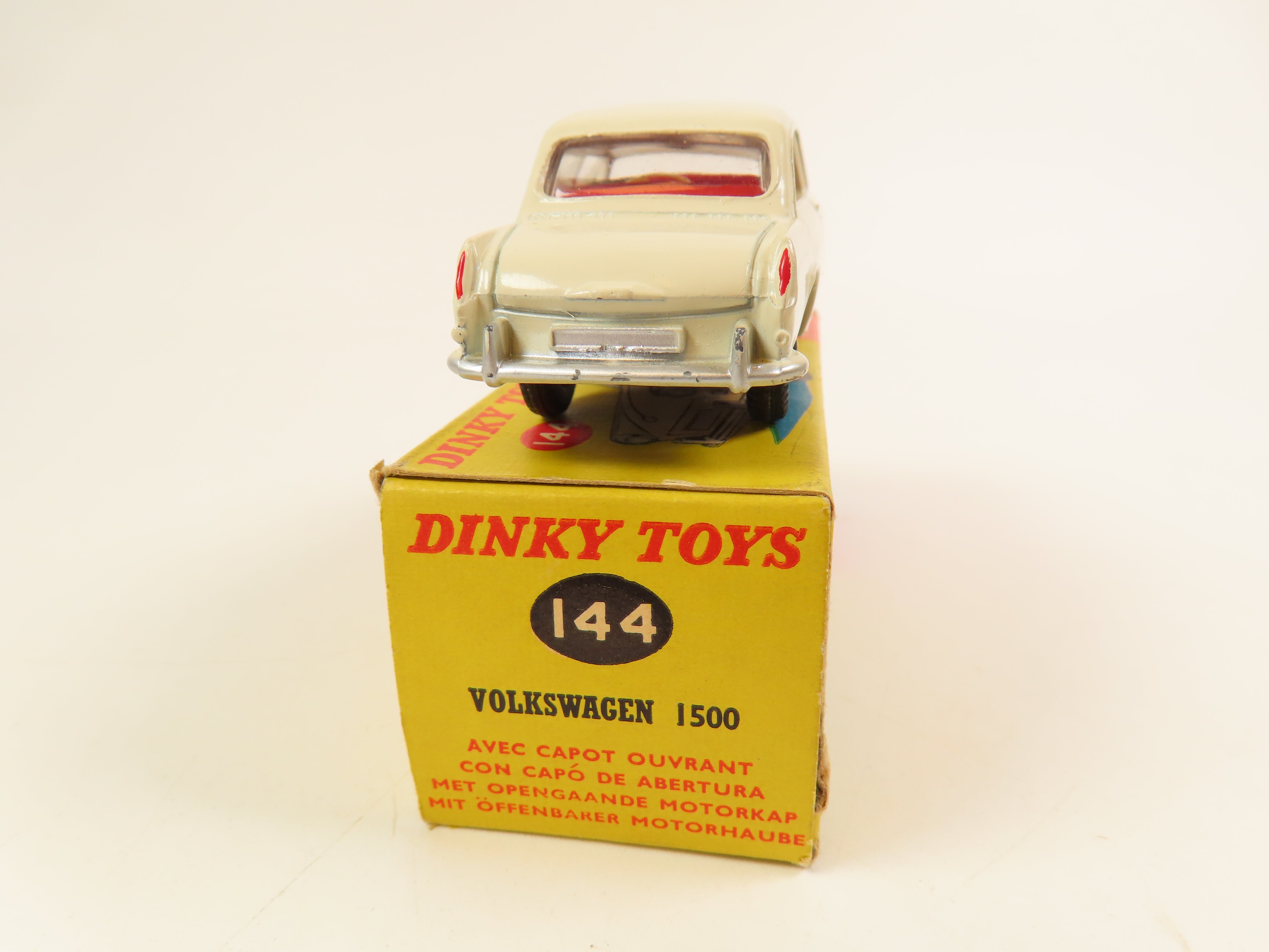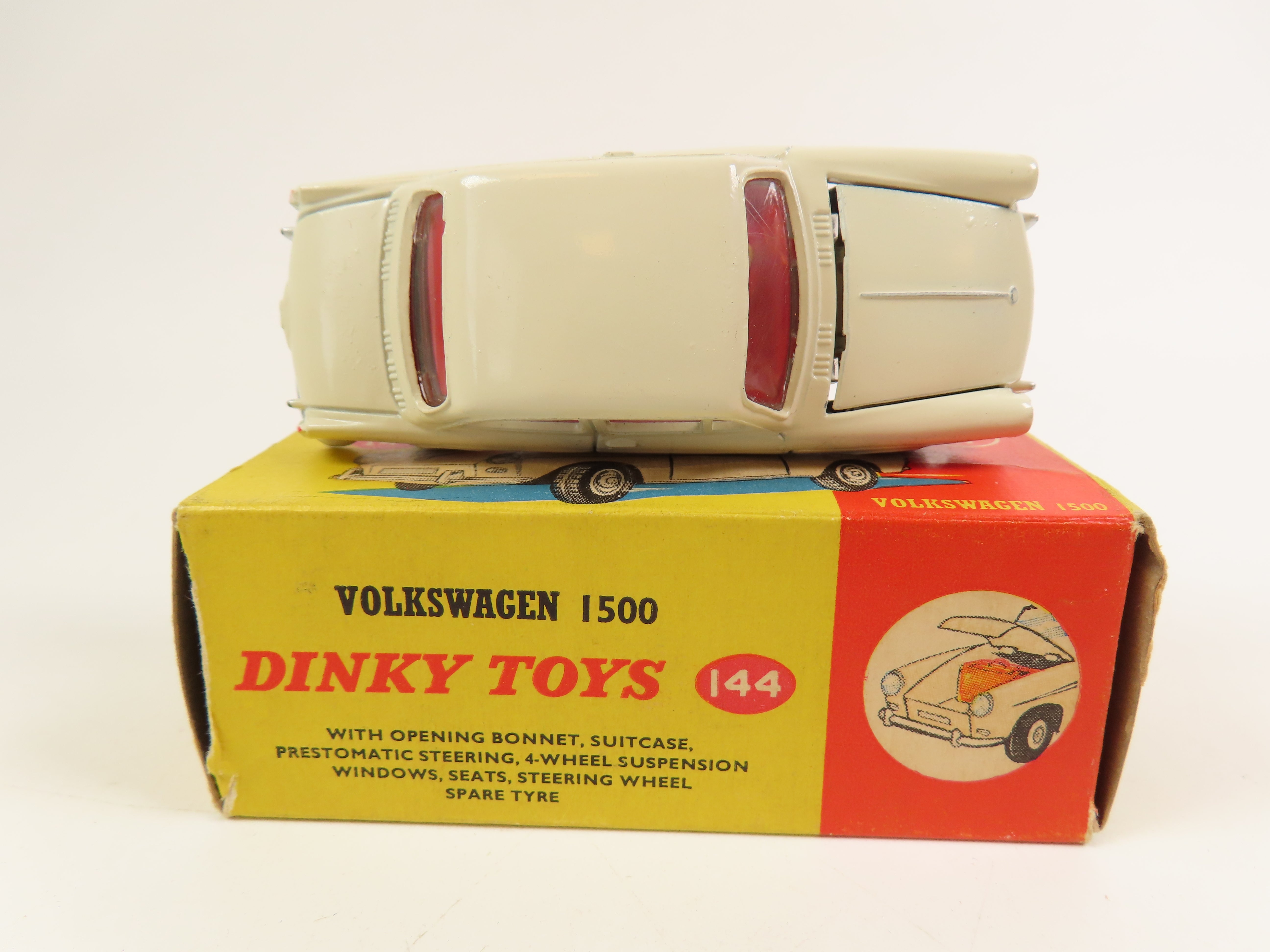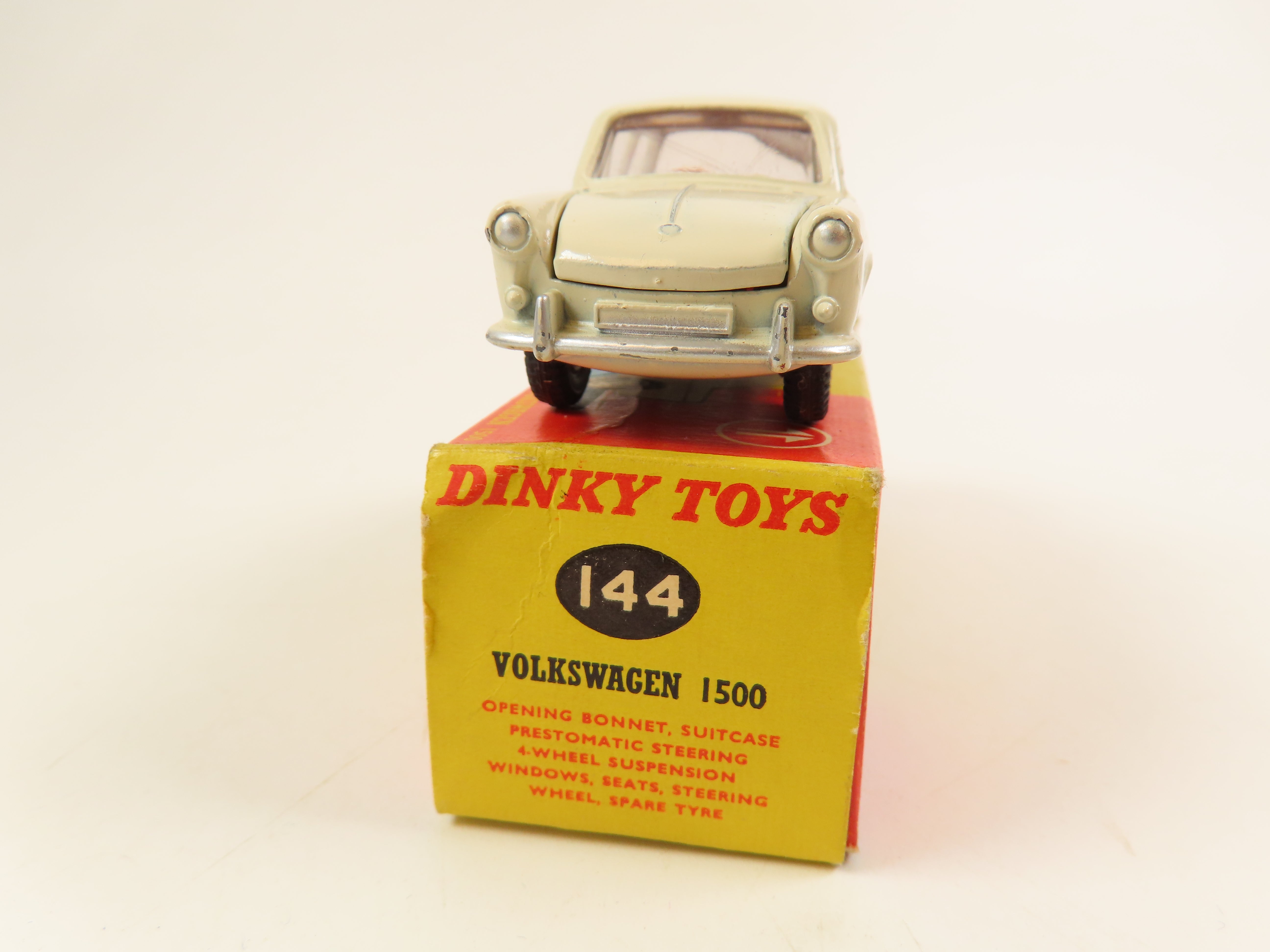 Dinky No.144 Volkswagen 1500 in ivory, with red interior and suitcase accessory.