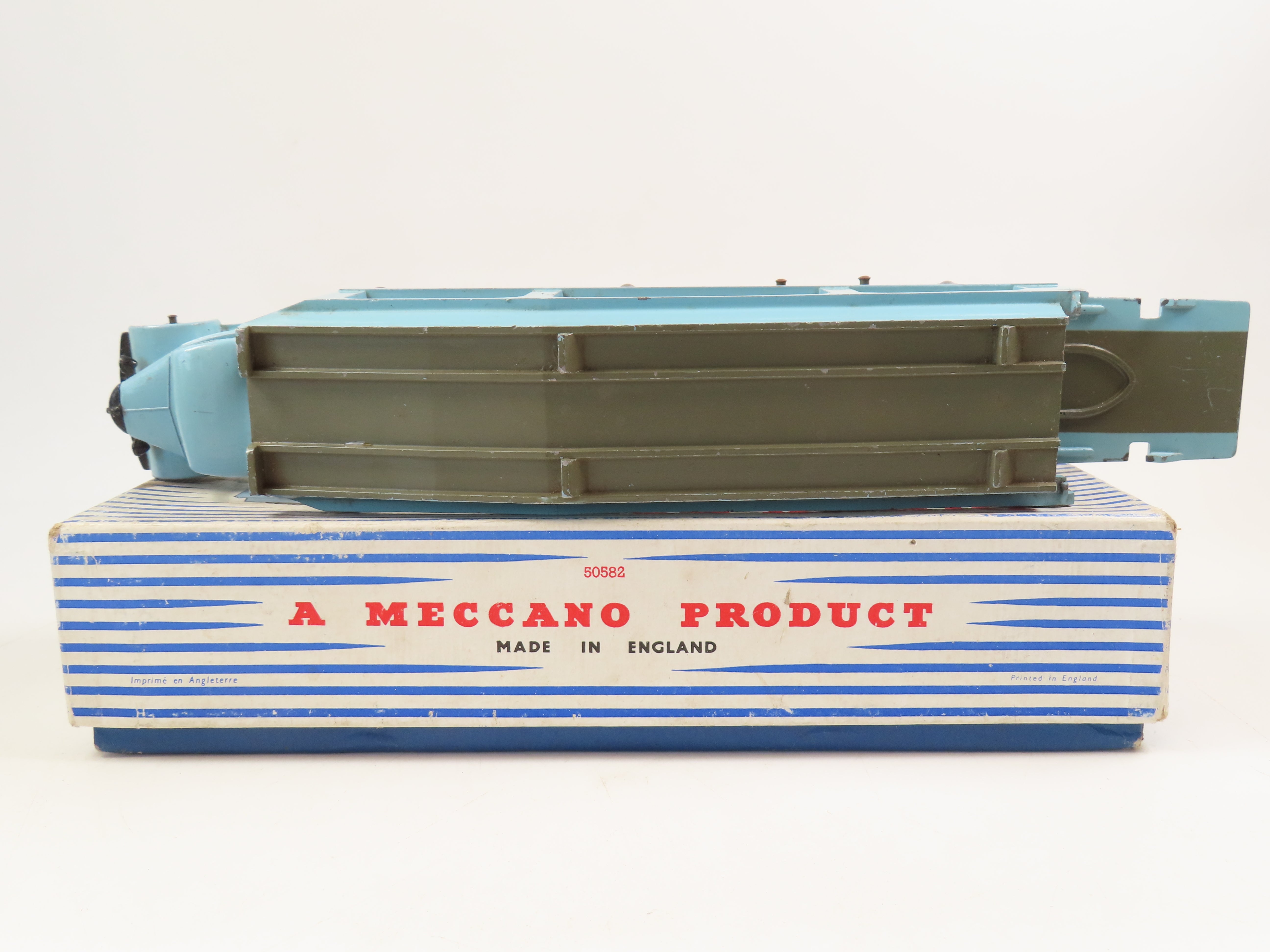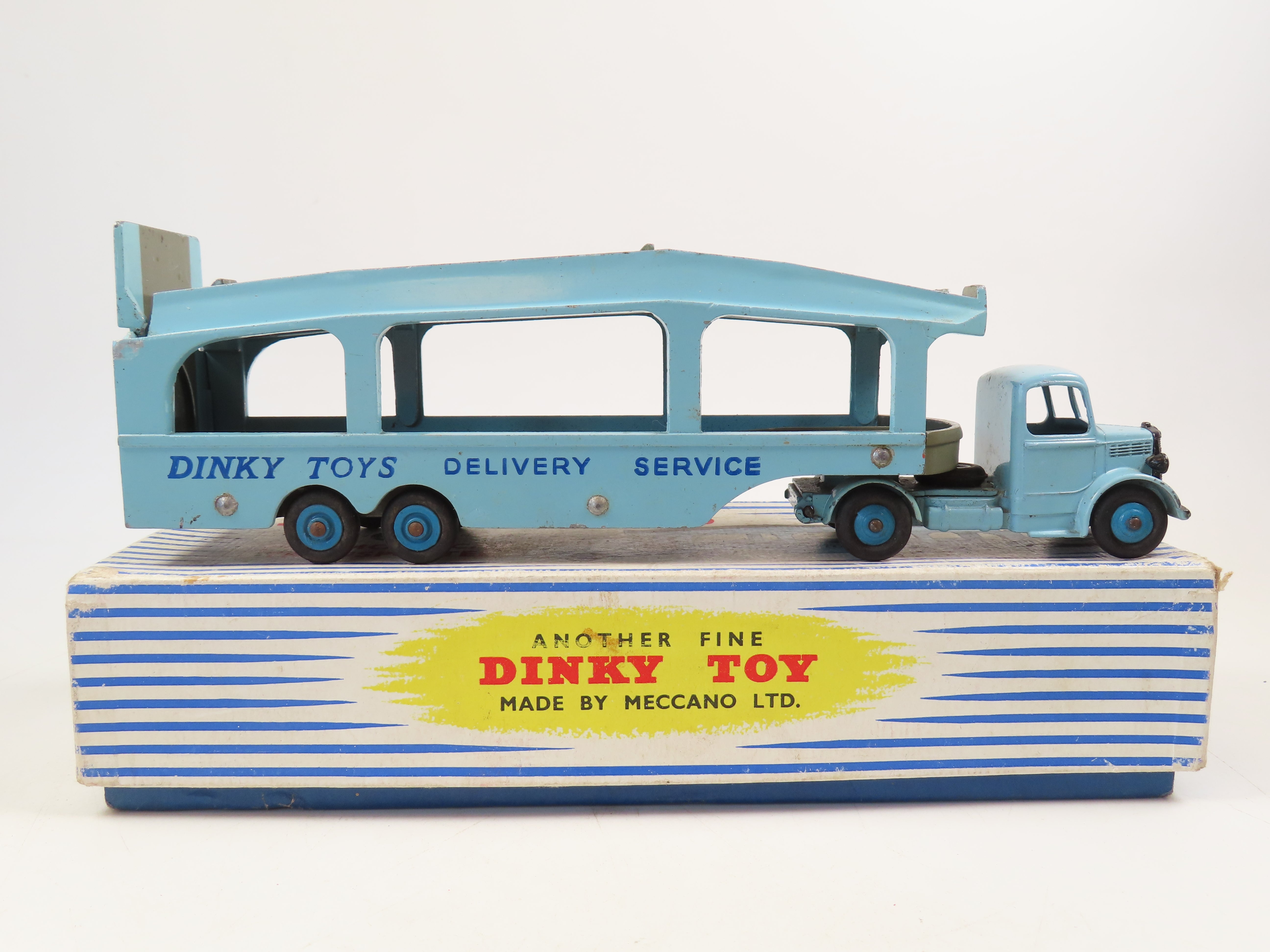 Dinky No.582 Pullmore Car Transporter in light blue with grey ramps and dark blue hubs and lettering.