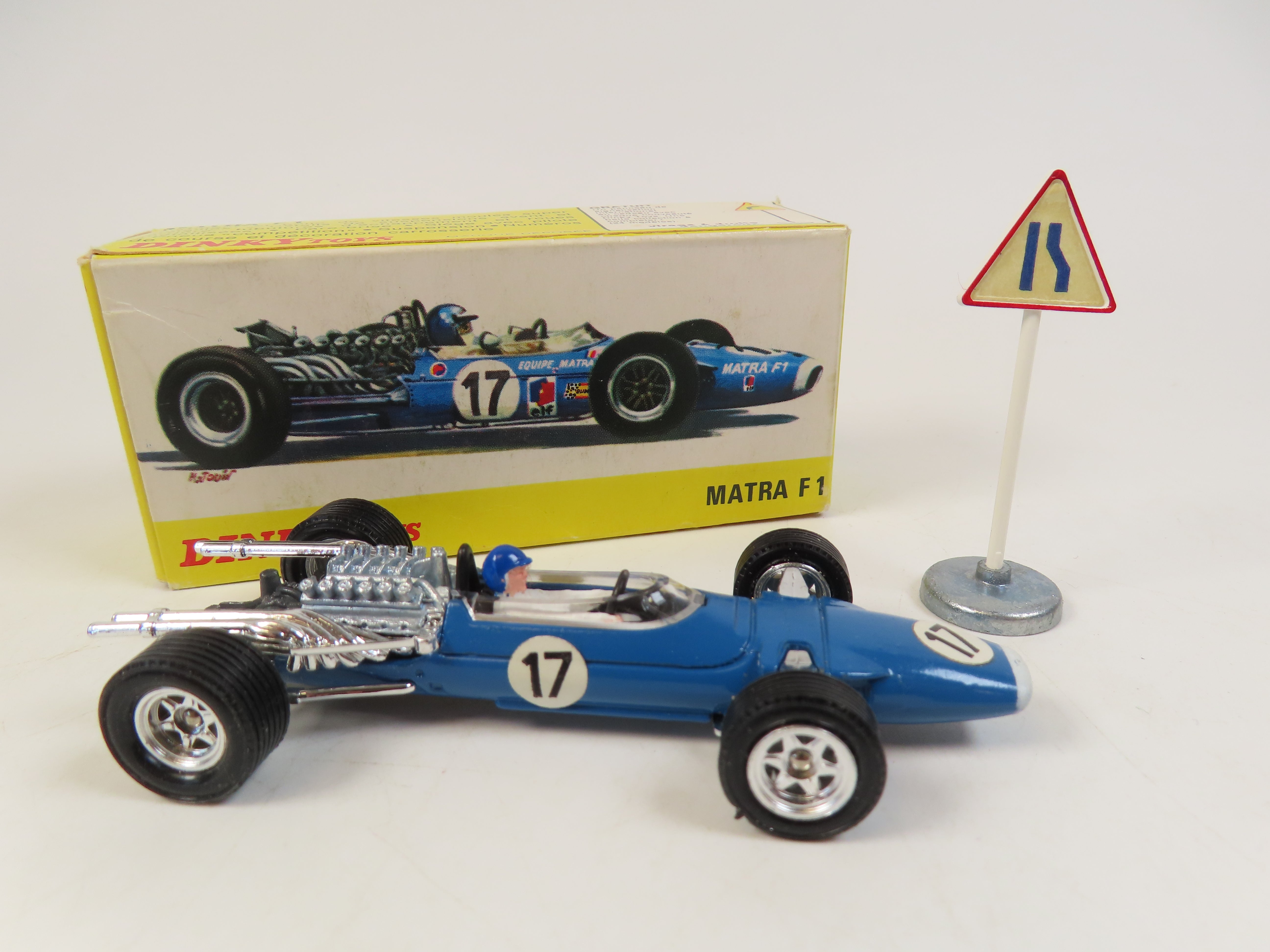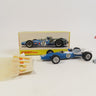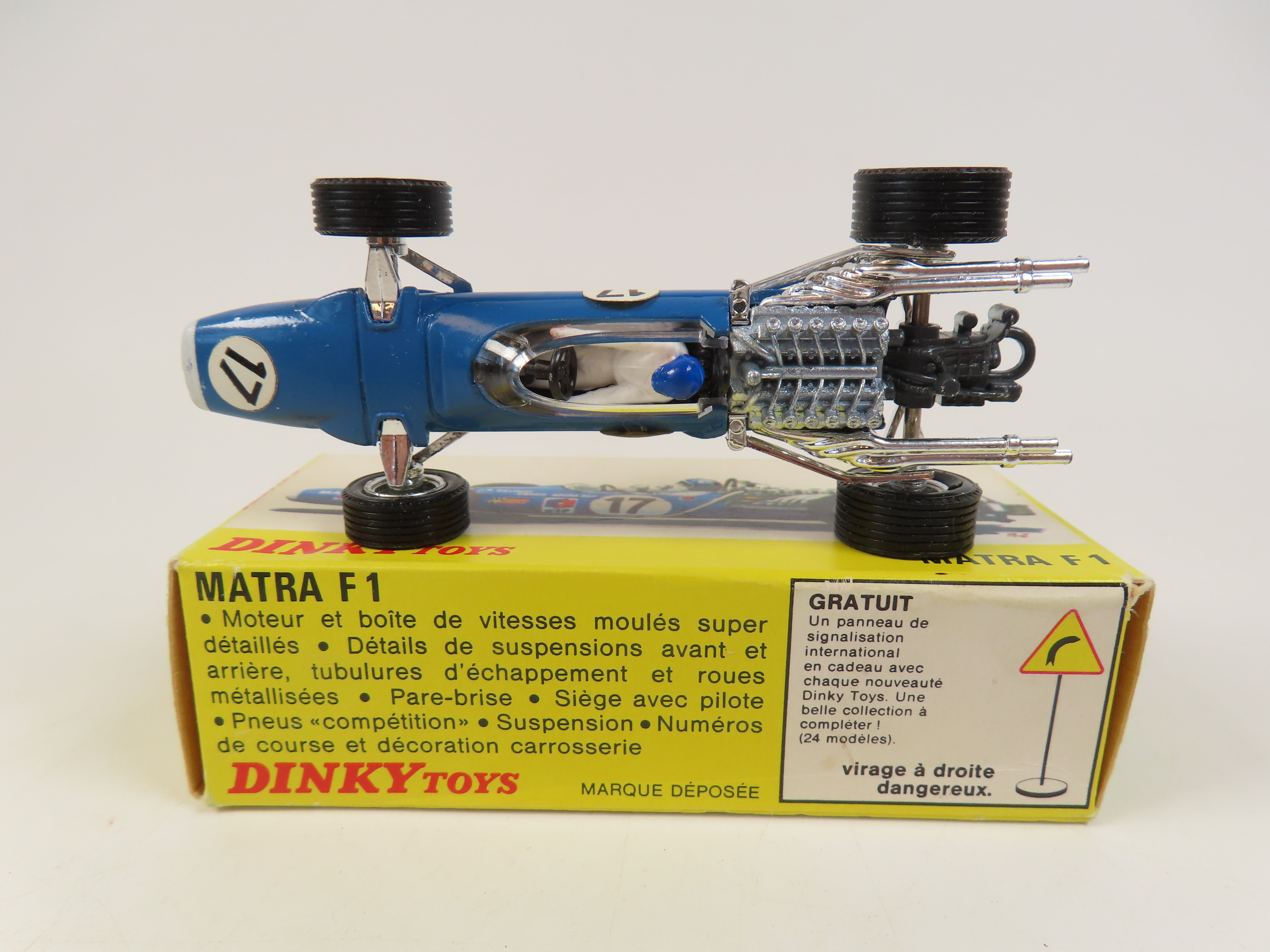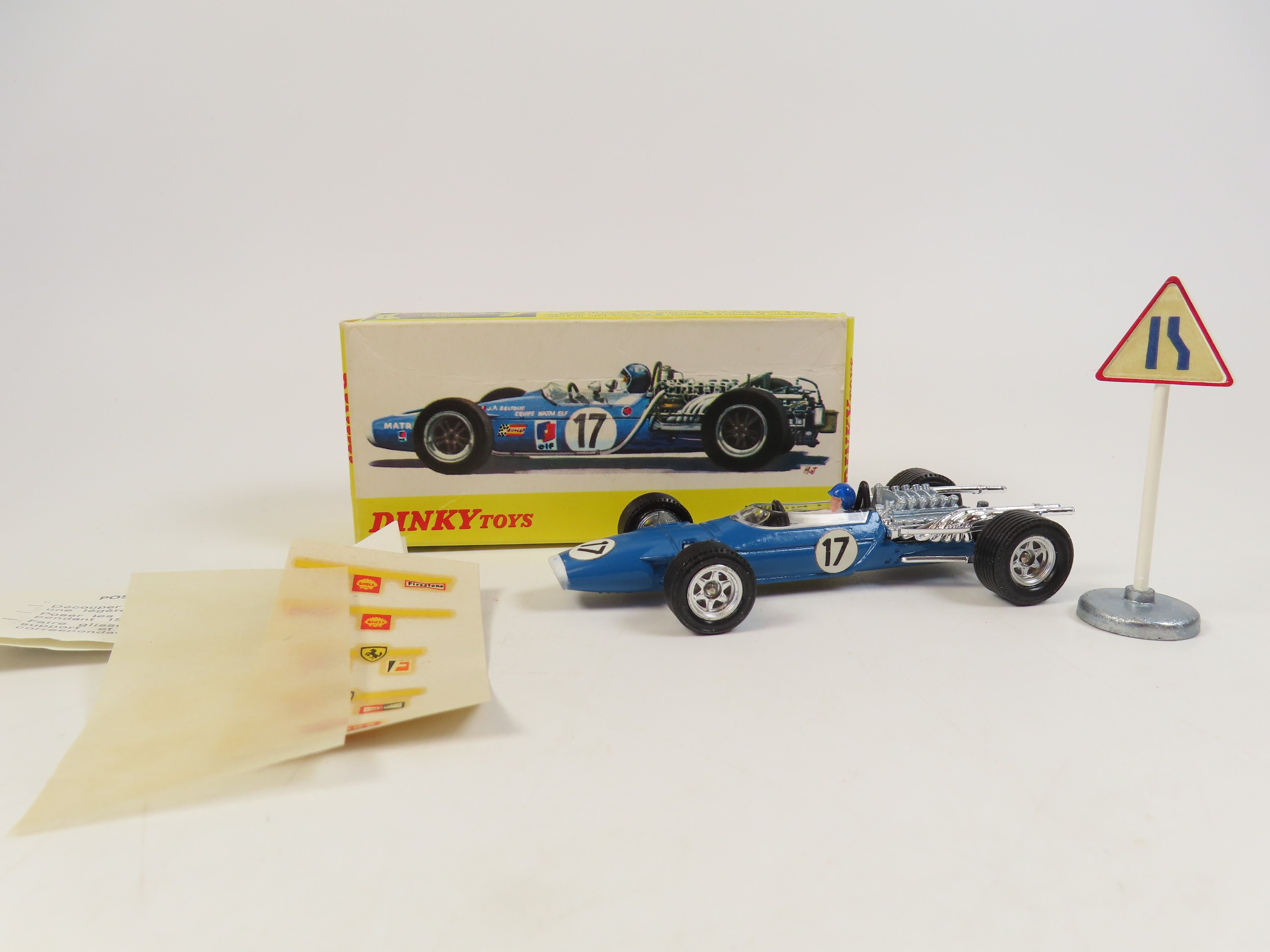 French Dinky 1417 Matra F1 in blue with white nose tip and '17' decals. Comes with a road sign accessory and set of unused transfers.