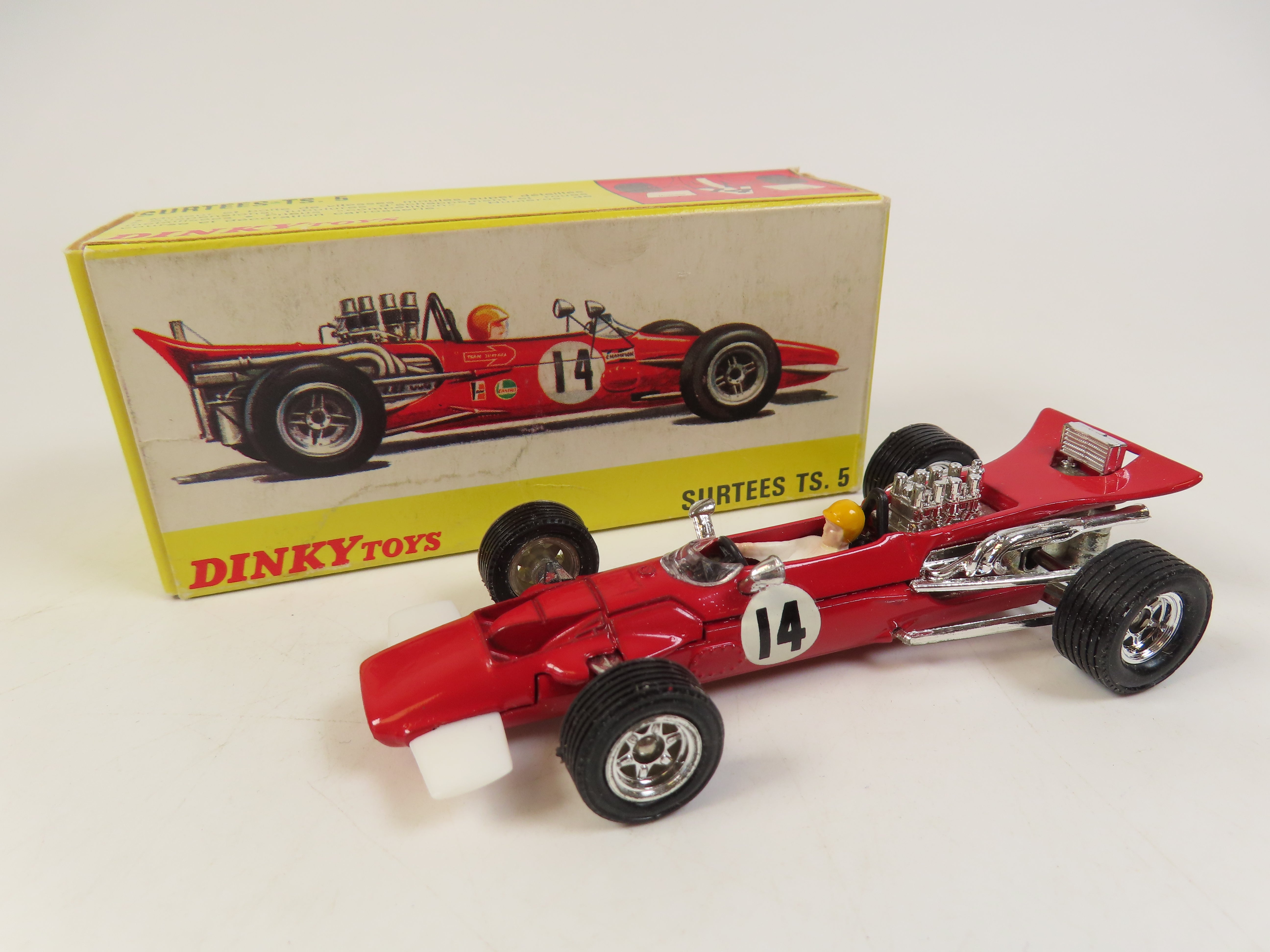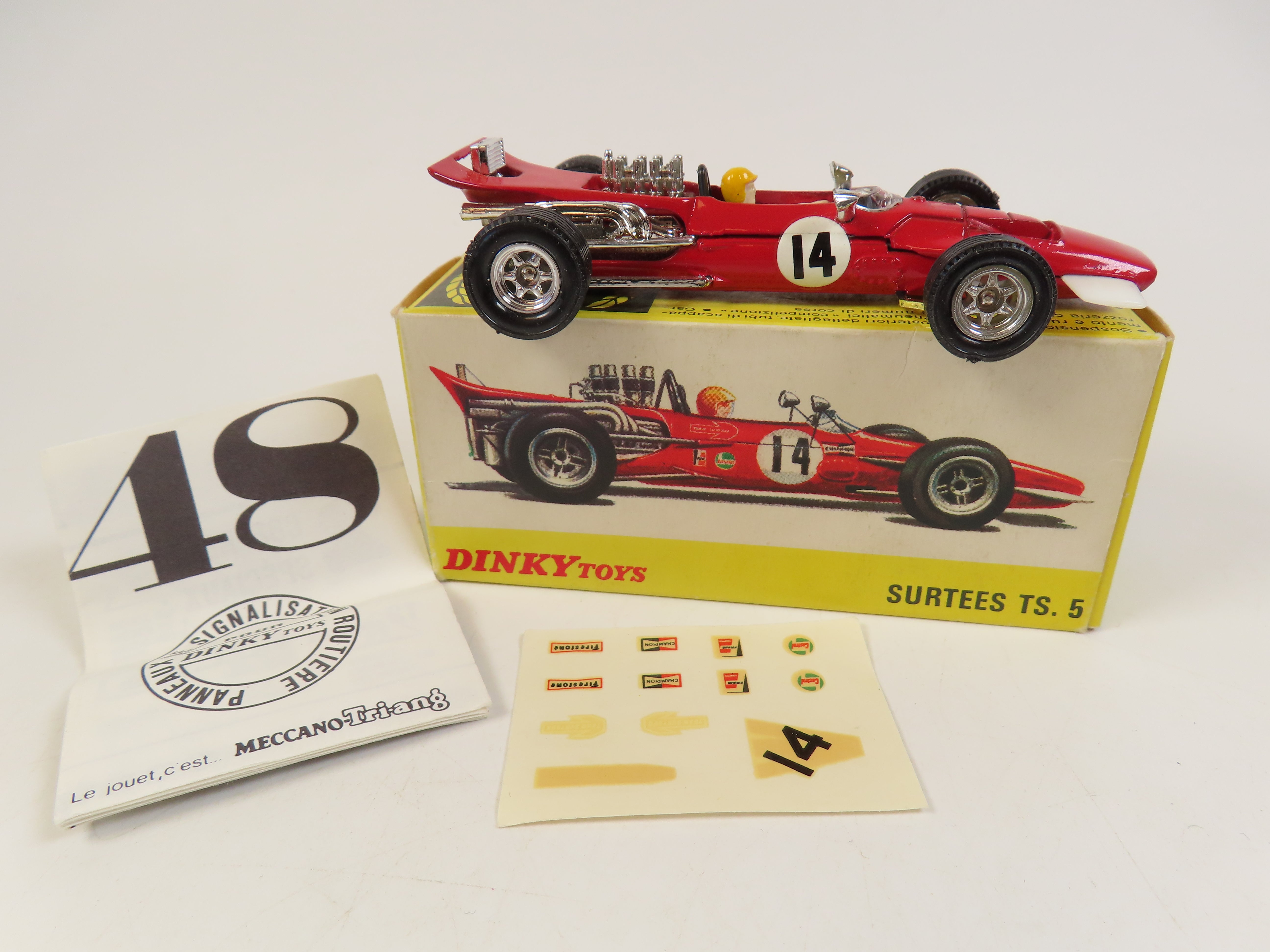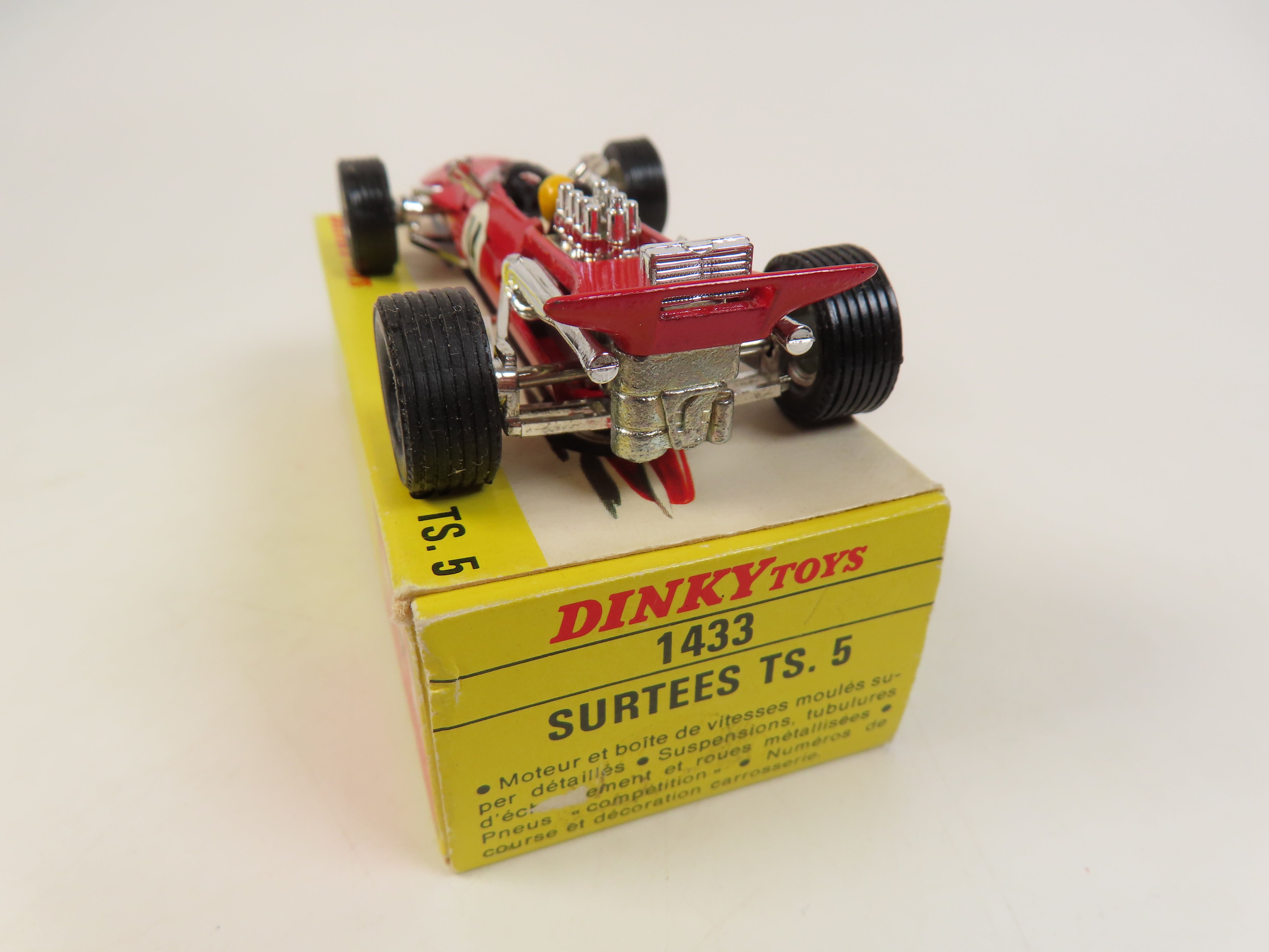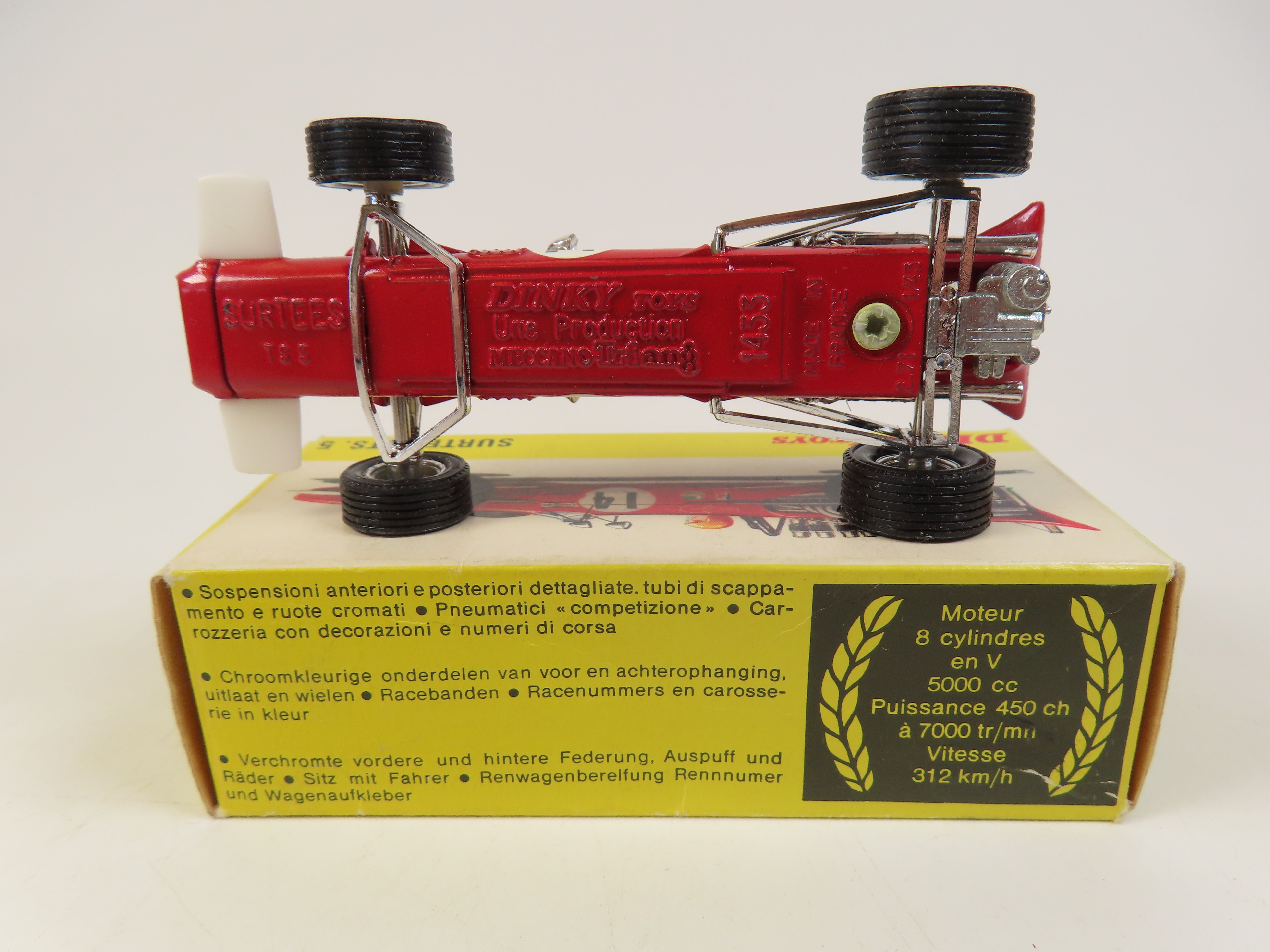 French Dinky 1433 Surtees TS.5 in red, with '1'4 decals and white plastic front wings. Comes with a sheet of unused transfers, and original Dinky information leaflet.