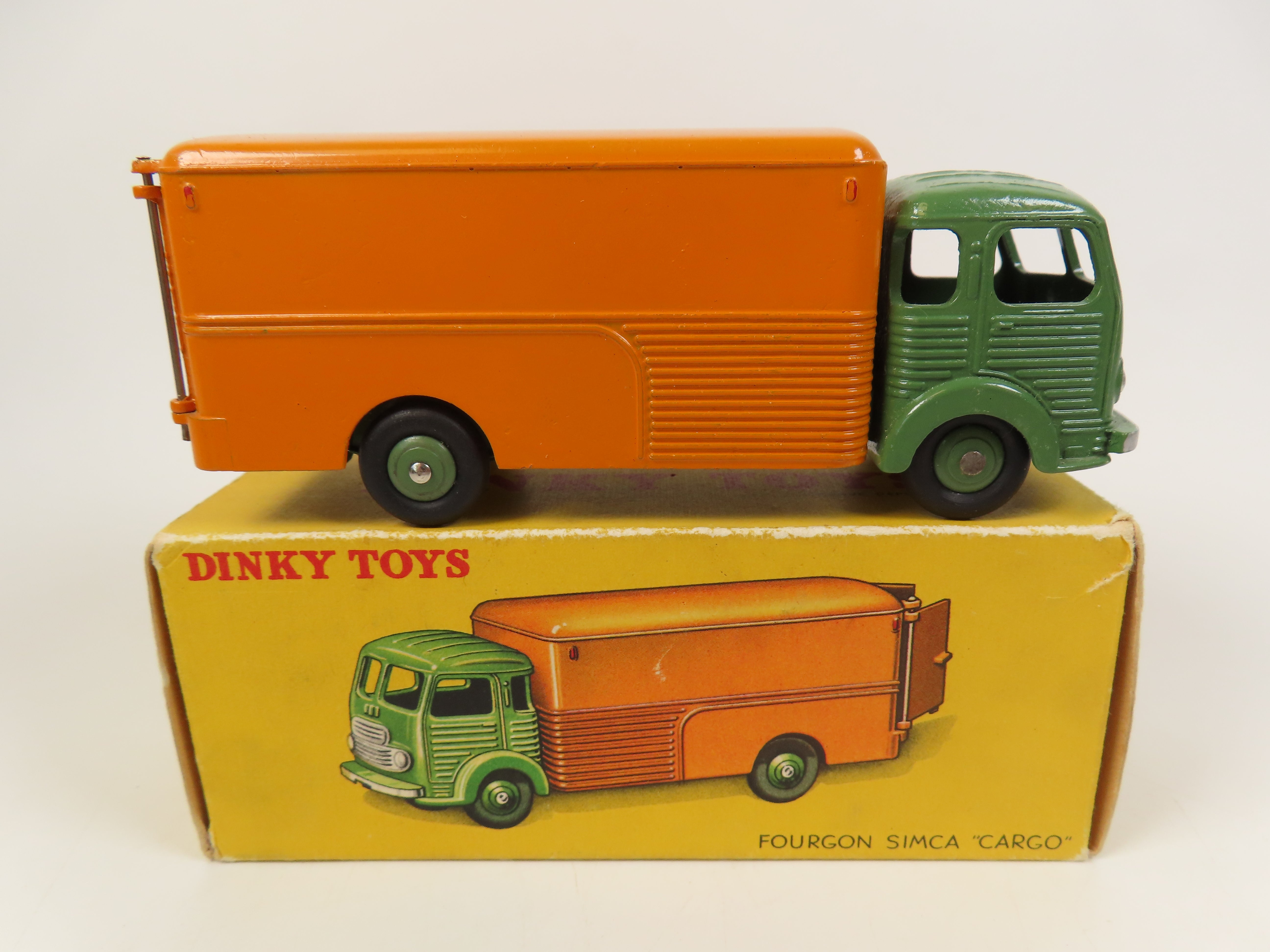 French Dinky 33A Fourgon Simca "Cargo" with a green cab and green painted hubs and orange rear.