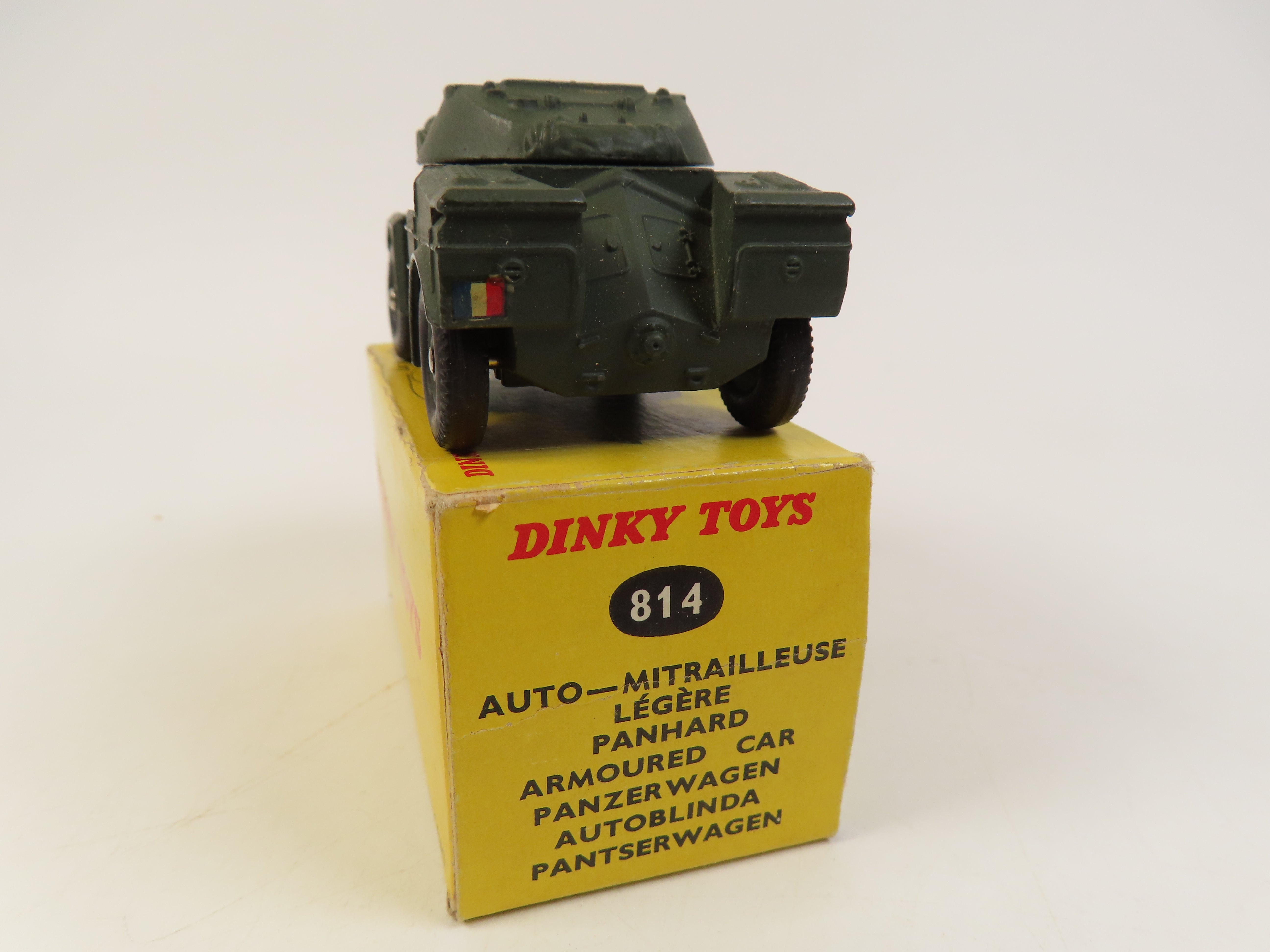 French Dinky 814 Armoured Car in olive green, with flag decals to the rear and with 2 unattached antennas.
