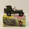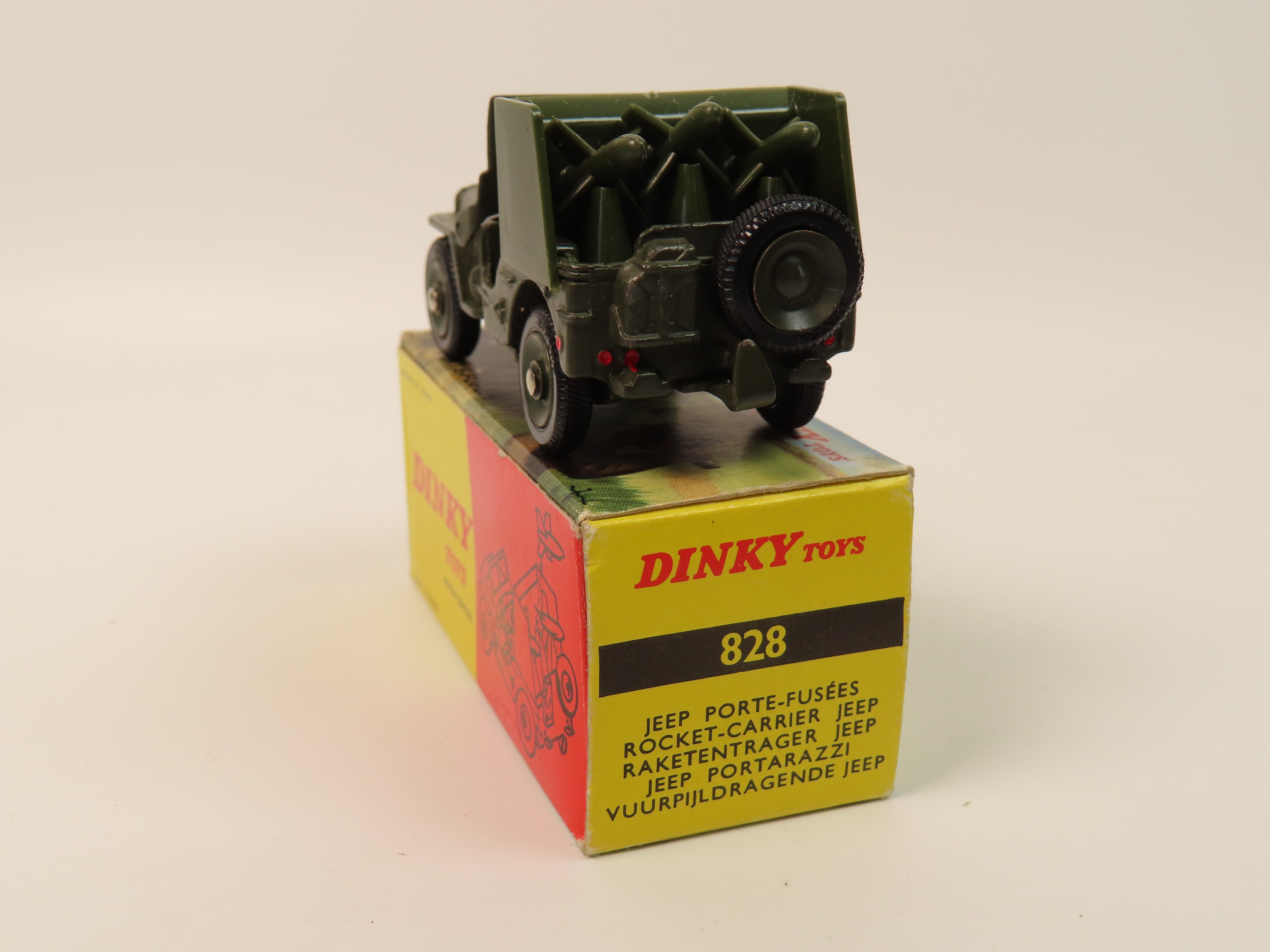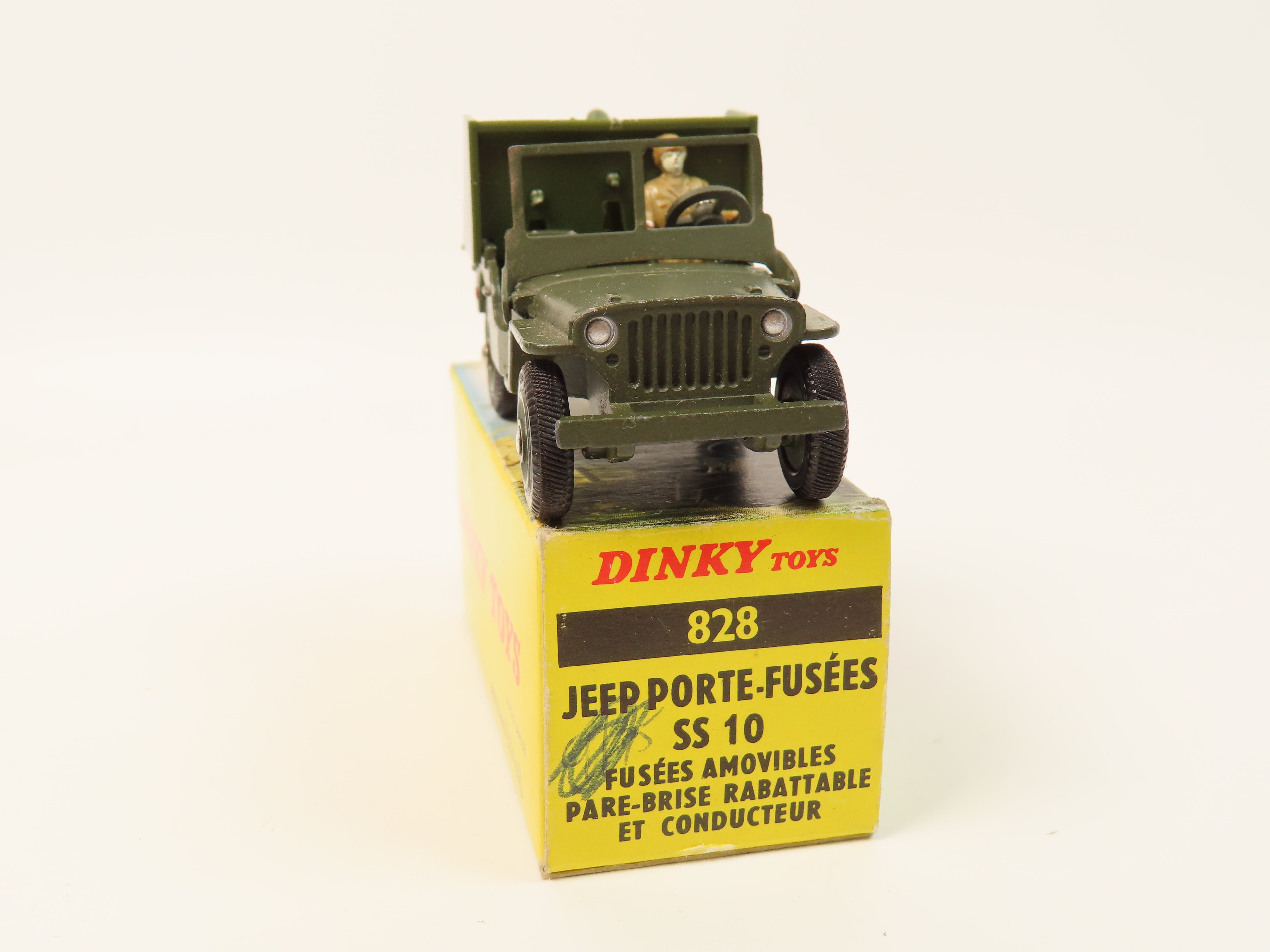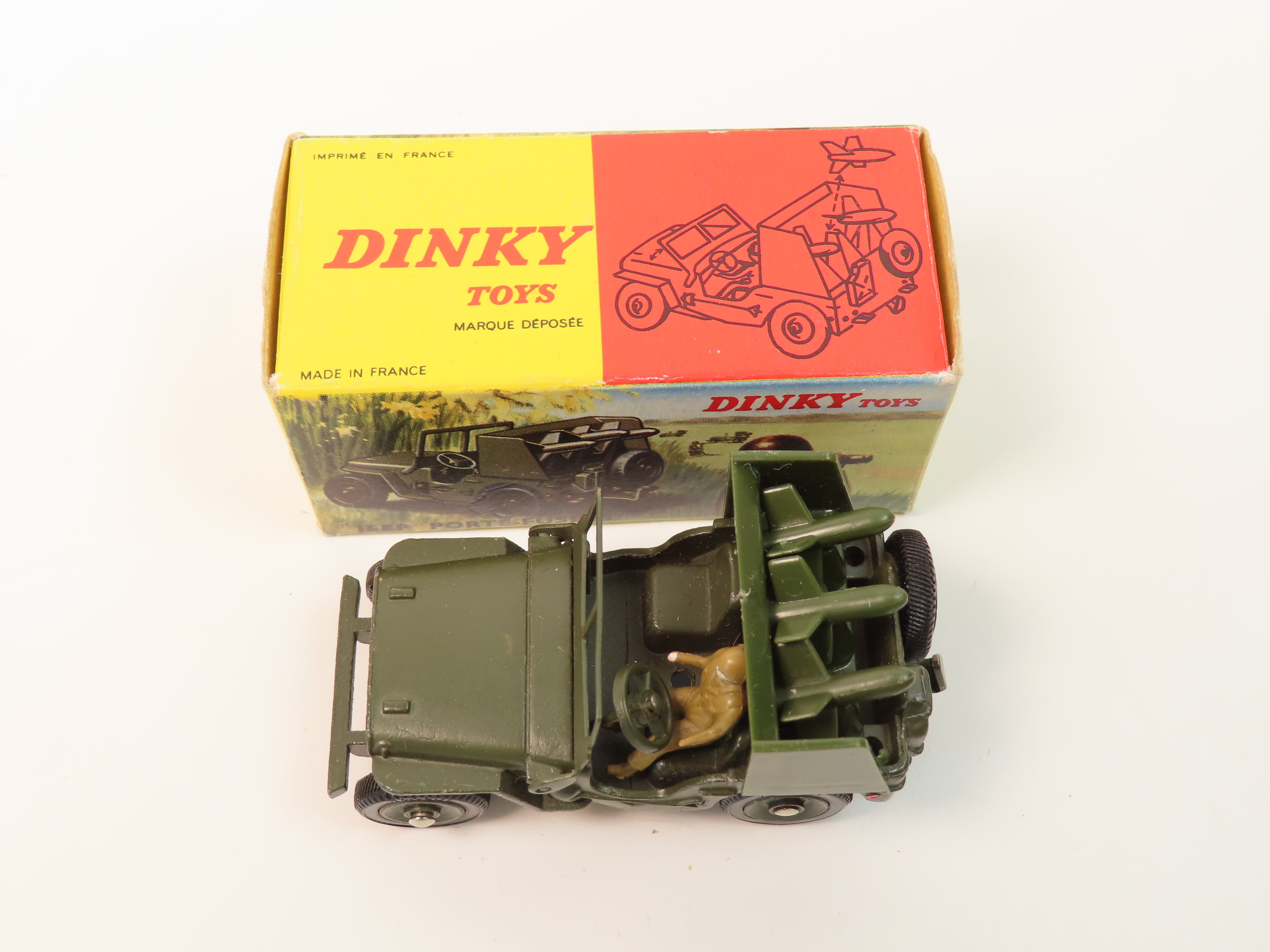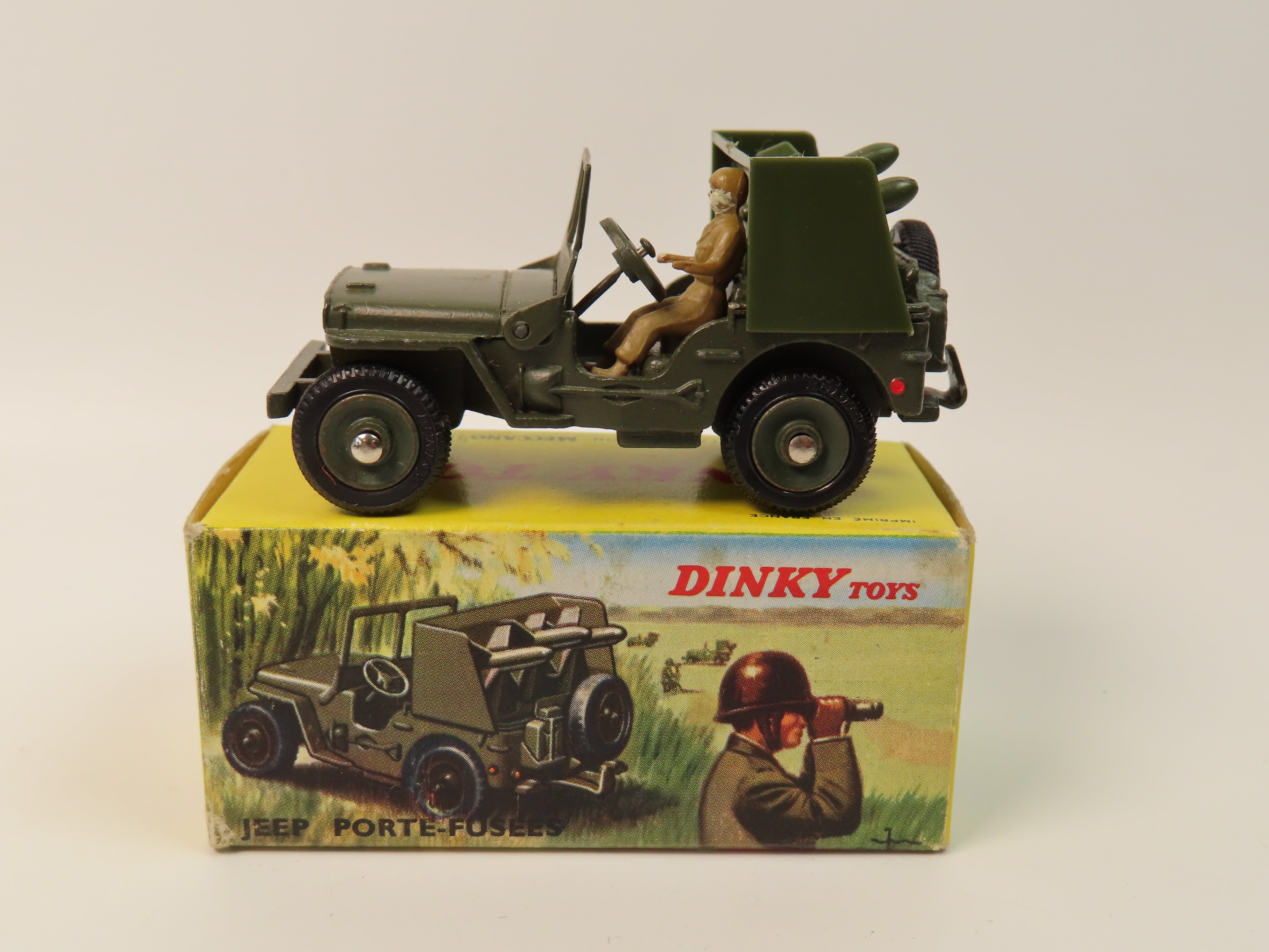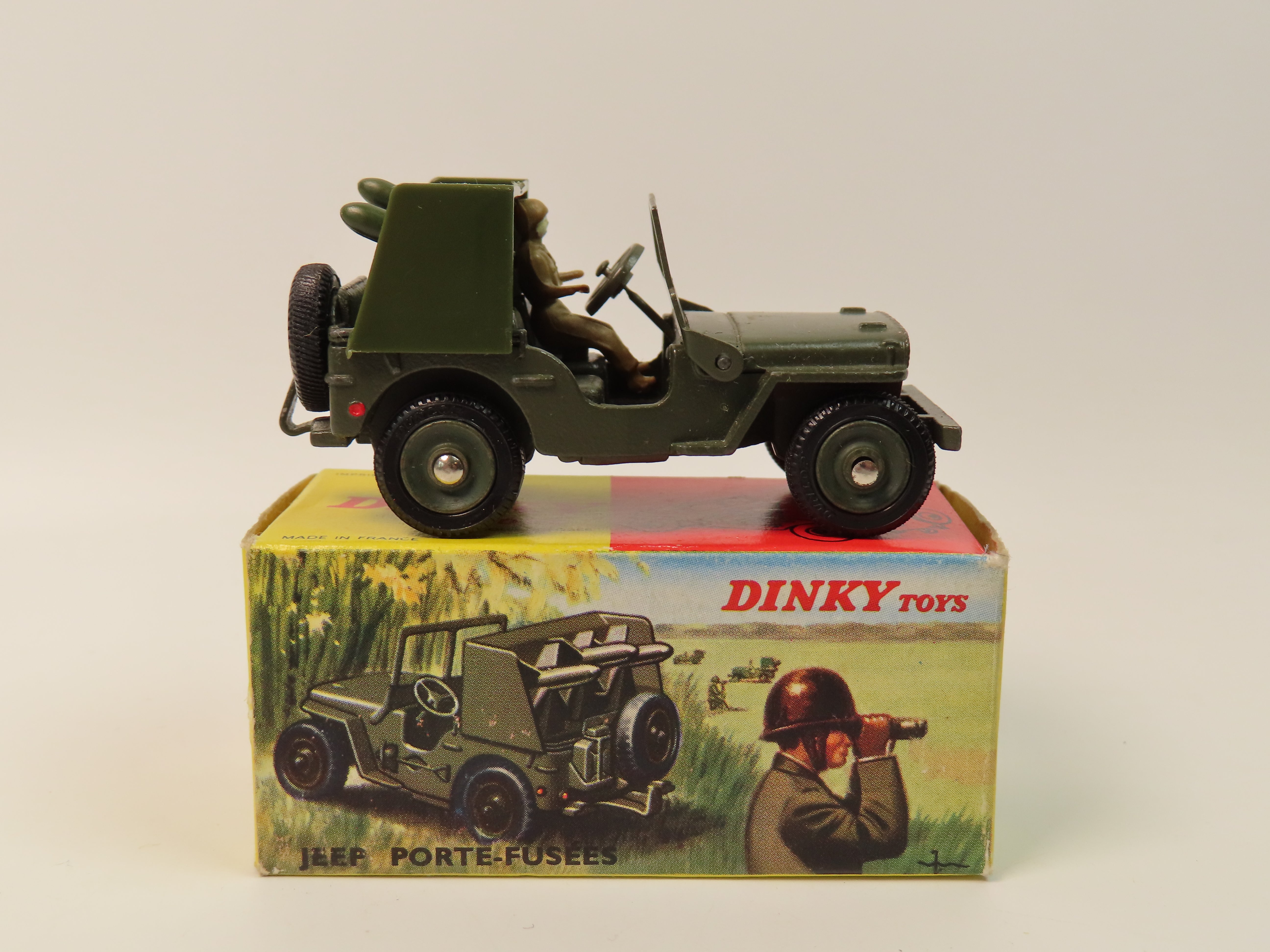 French Dinky 828 Jeep Porte-Fusees (Rocket-Carrier Jeep) SS 10 in olive green, complete with driver figure and set of plastic rockets to the rear.