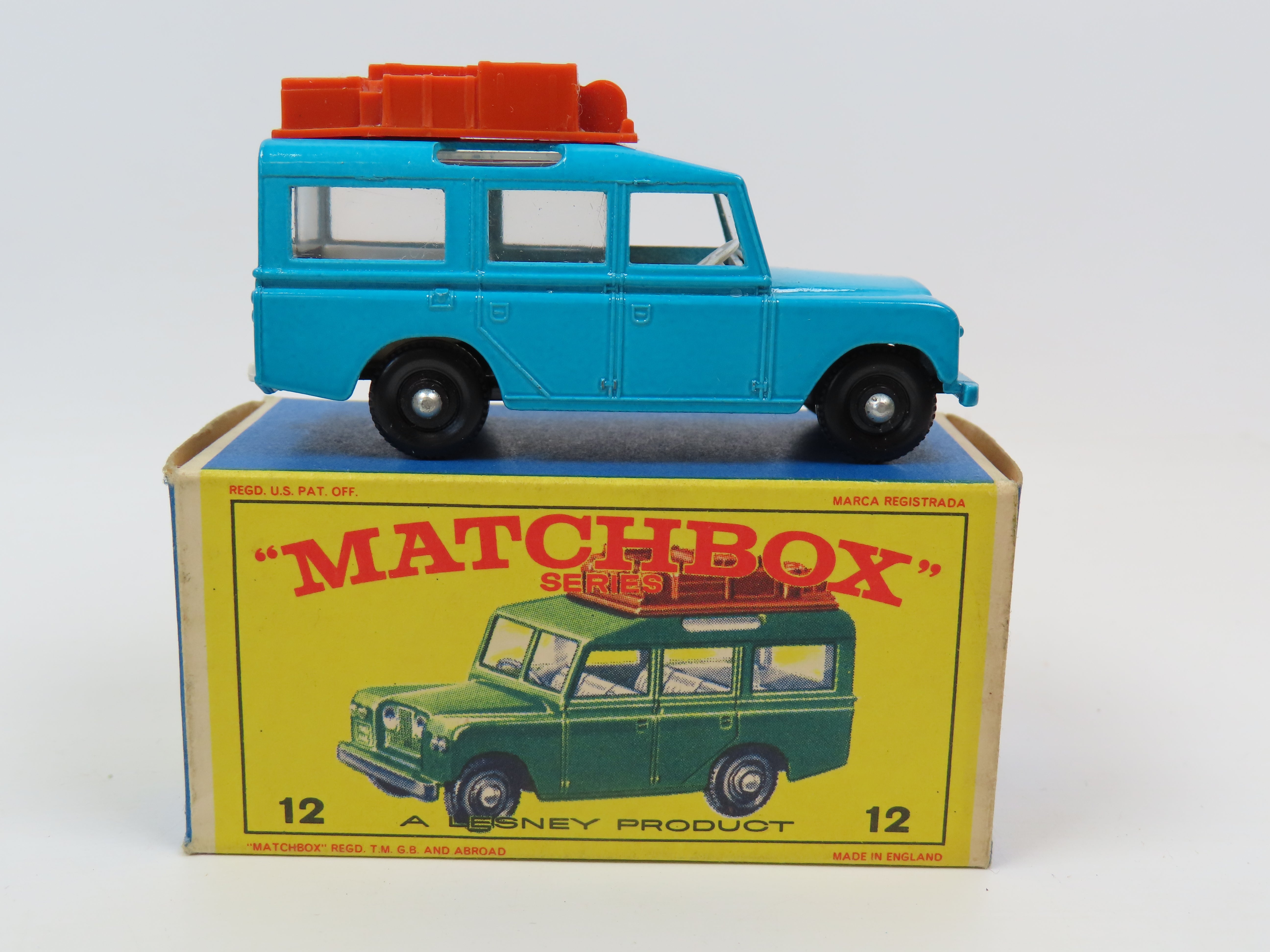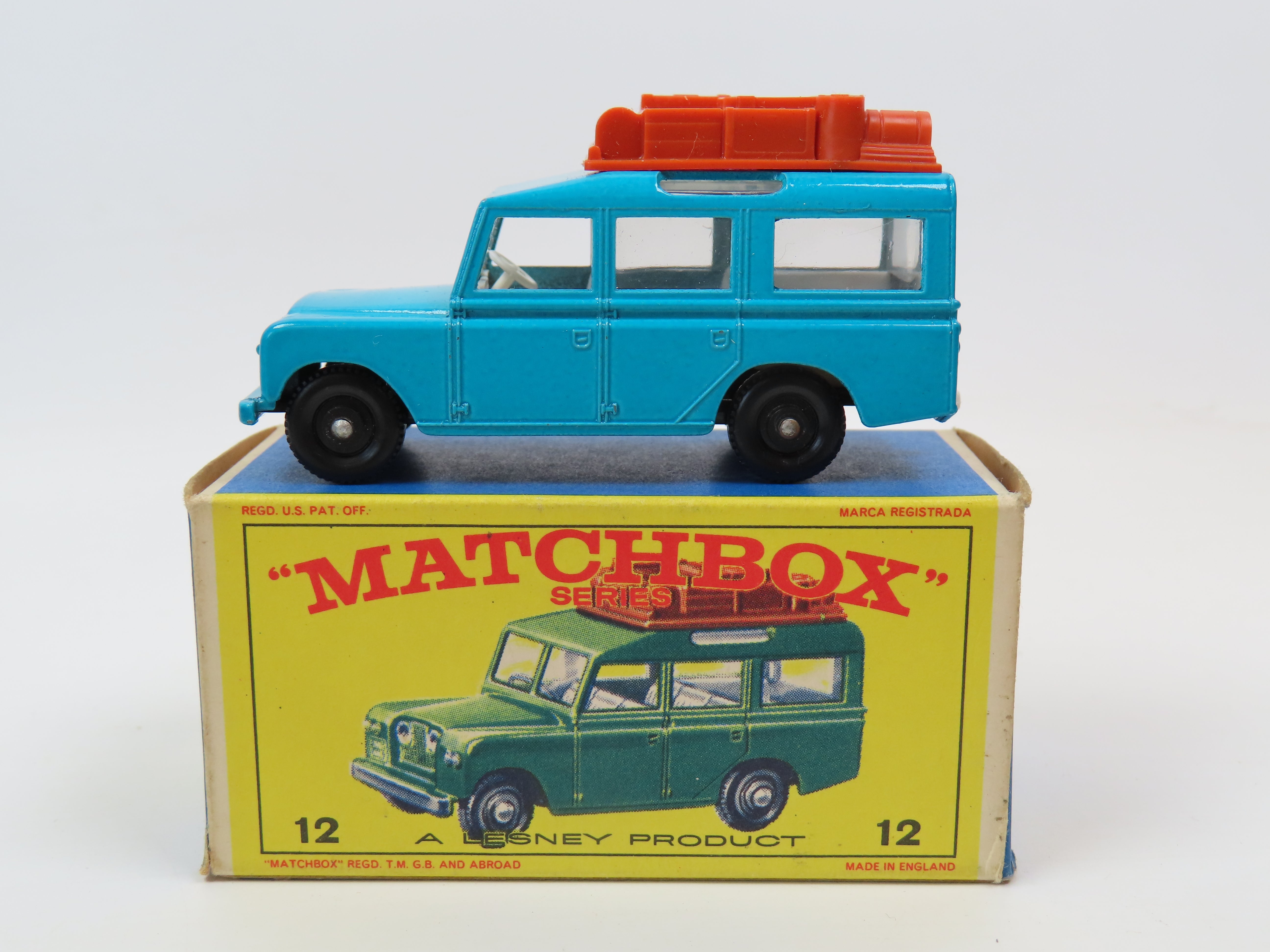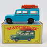 Matchbox 12 Safari Land Rover in blue with brown plastic luggage to the roof and white interior and tow hook.