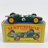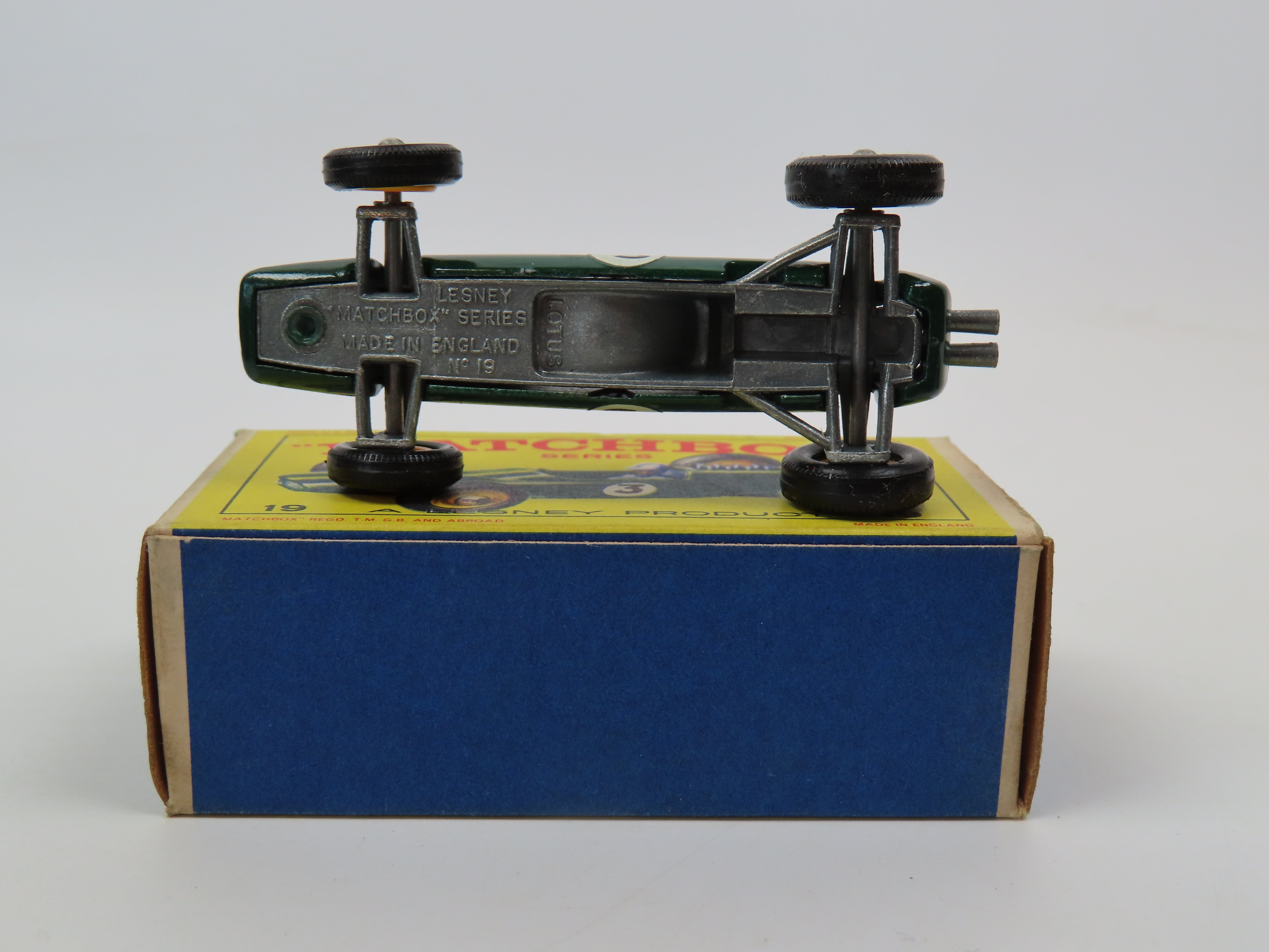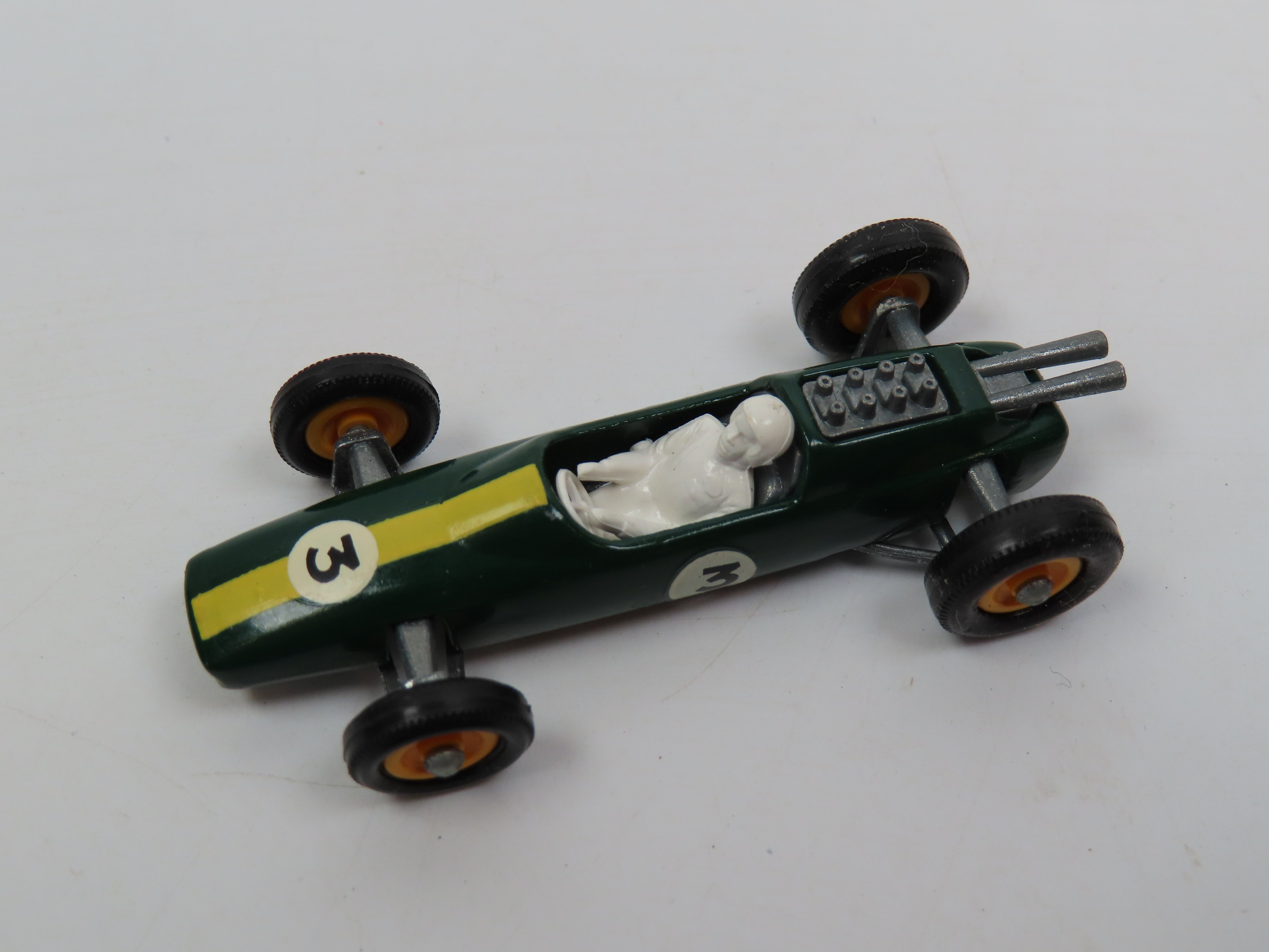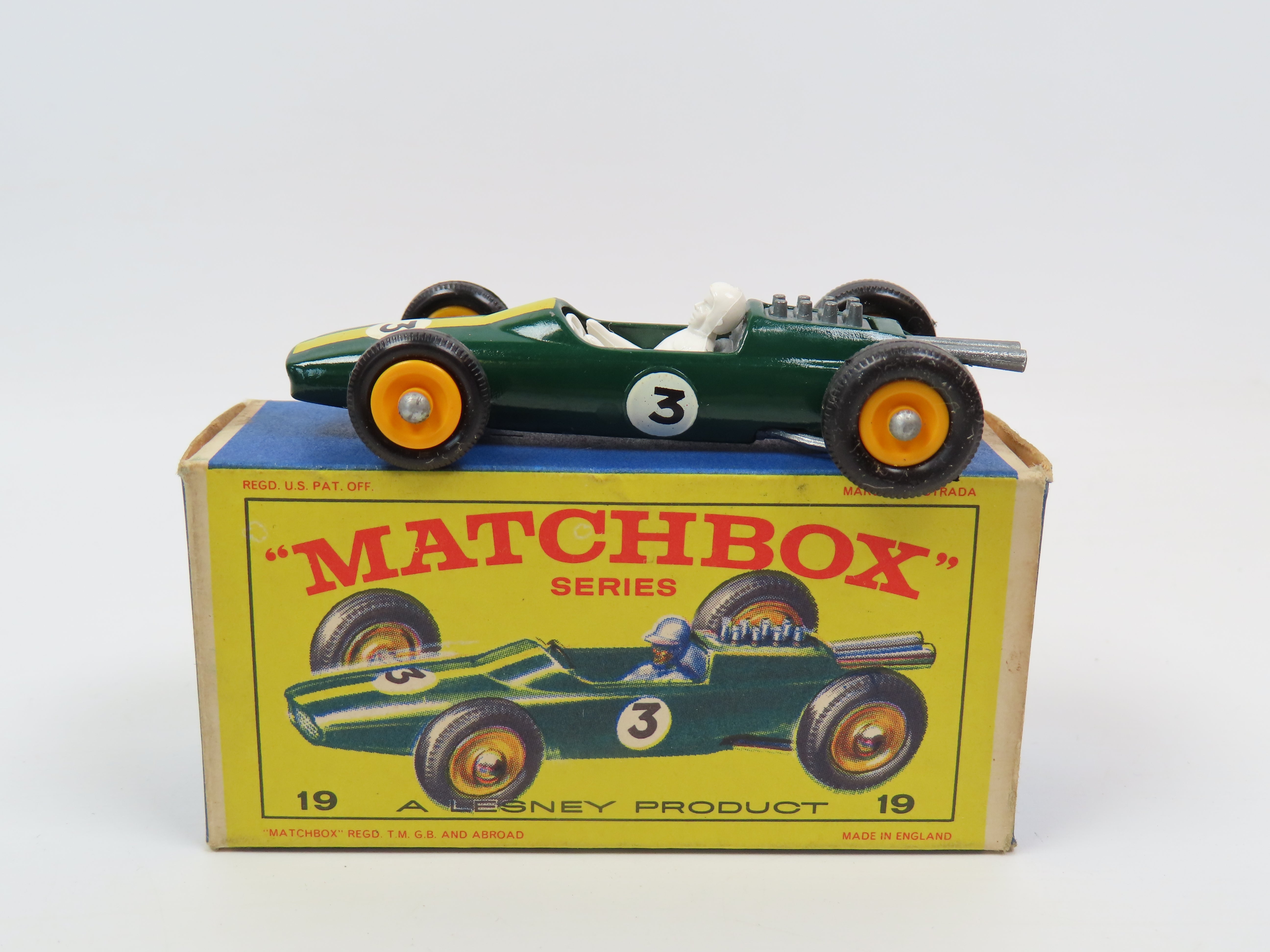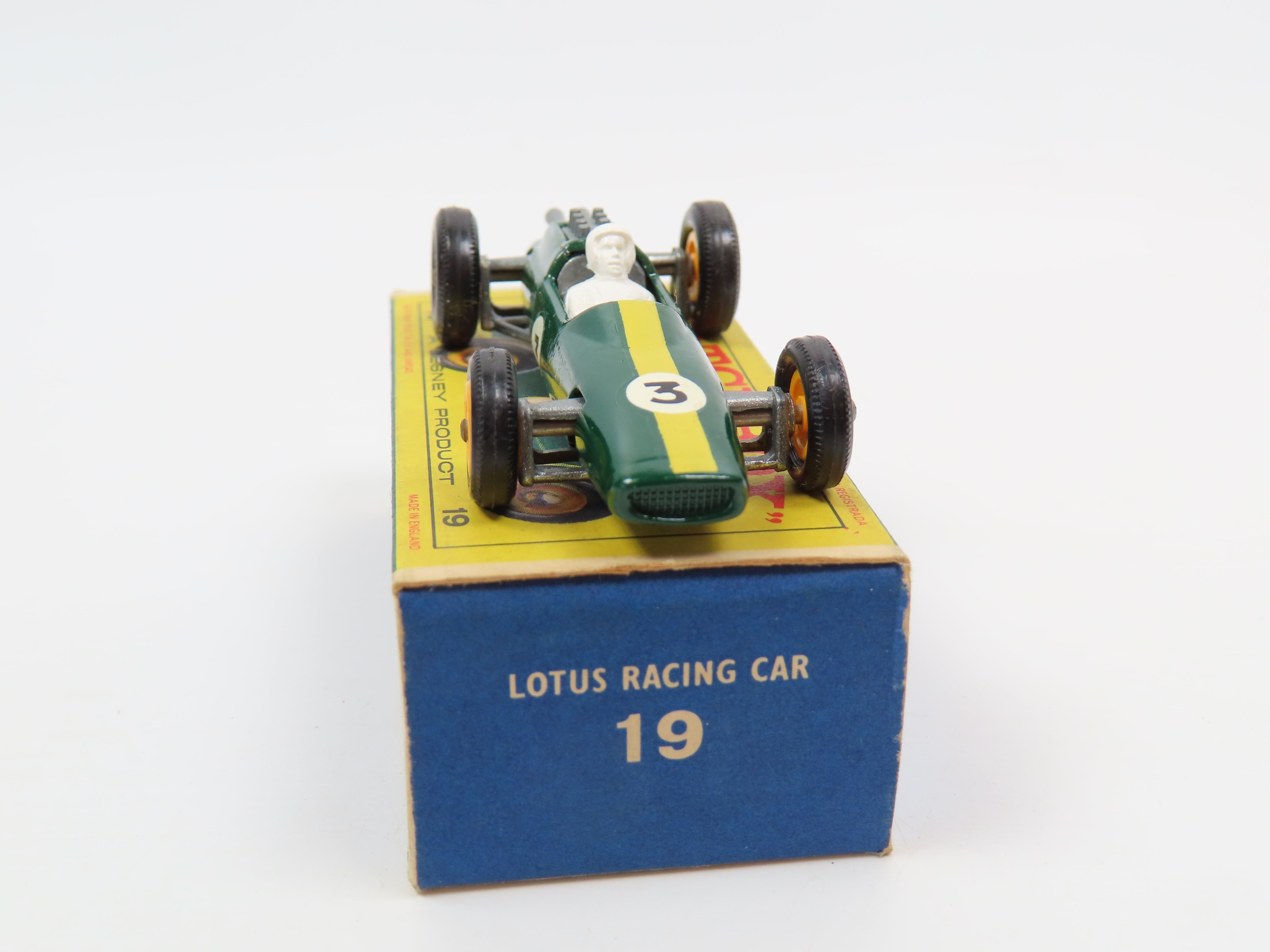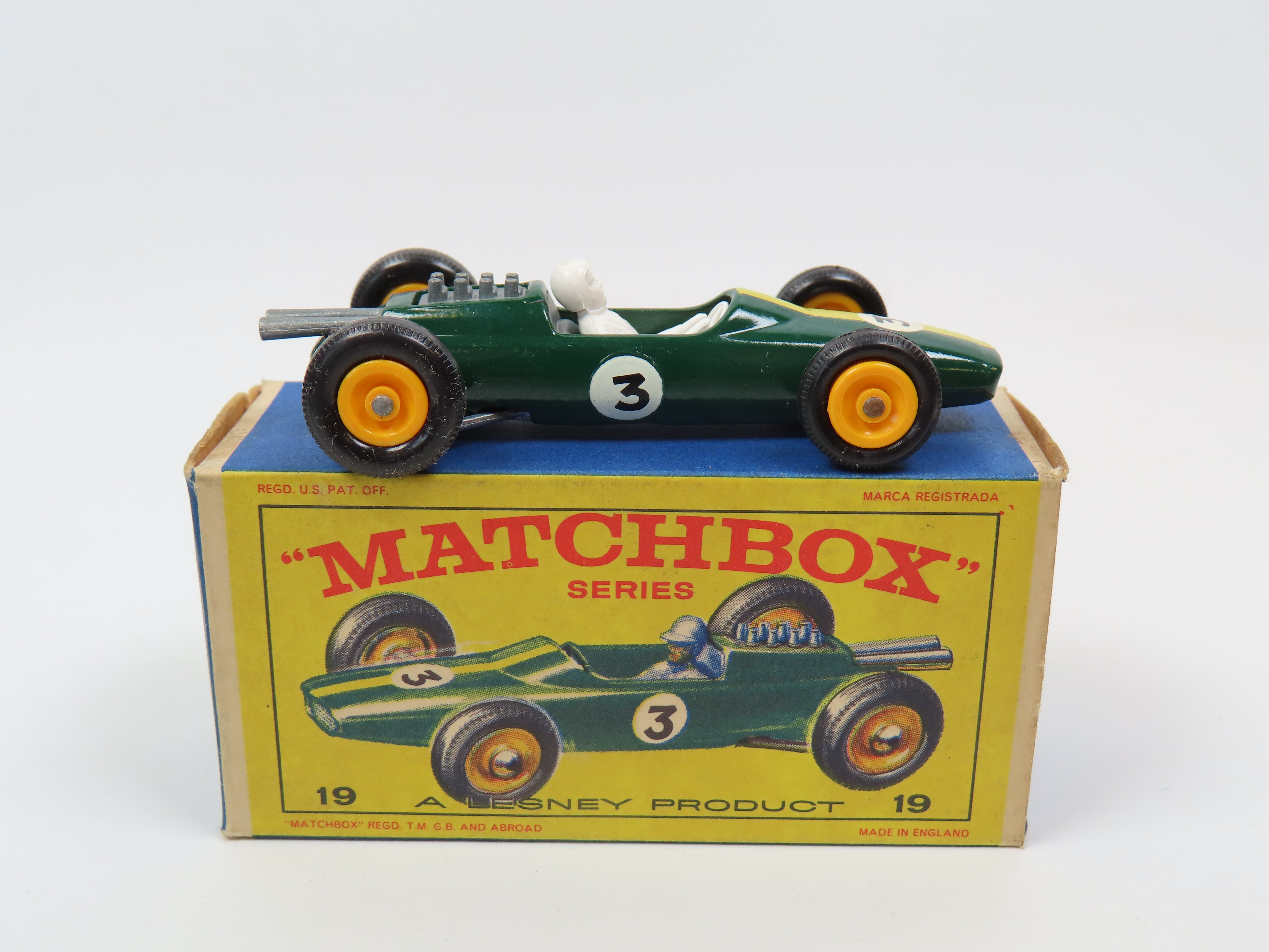 Matchbox 19 Lotus Racing Car in dark green, with stripe and '3' decals, yellow plastic hubs and white driver figure.