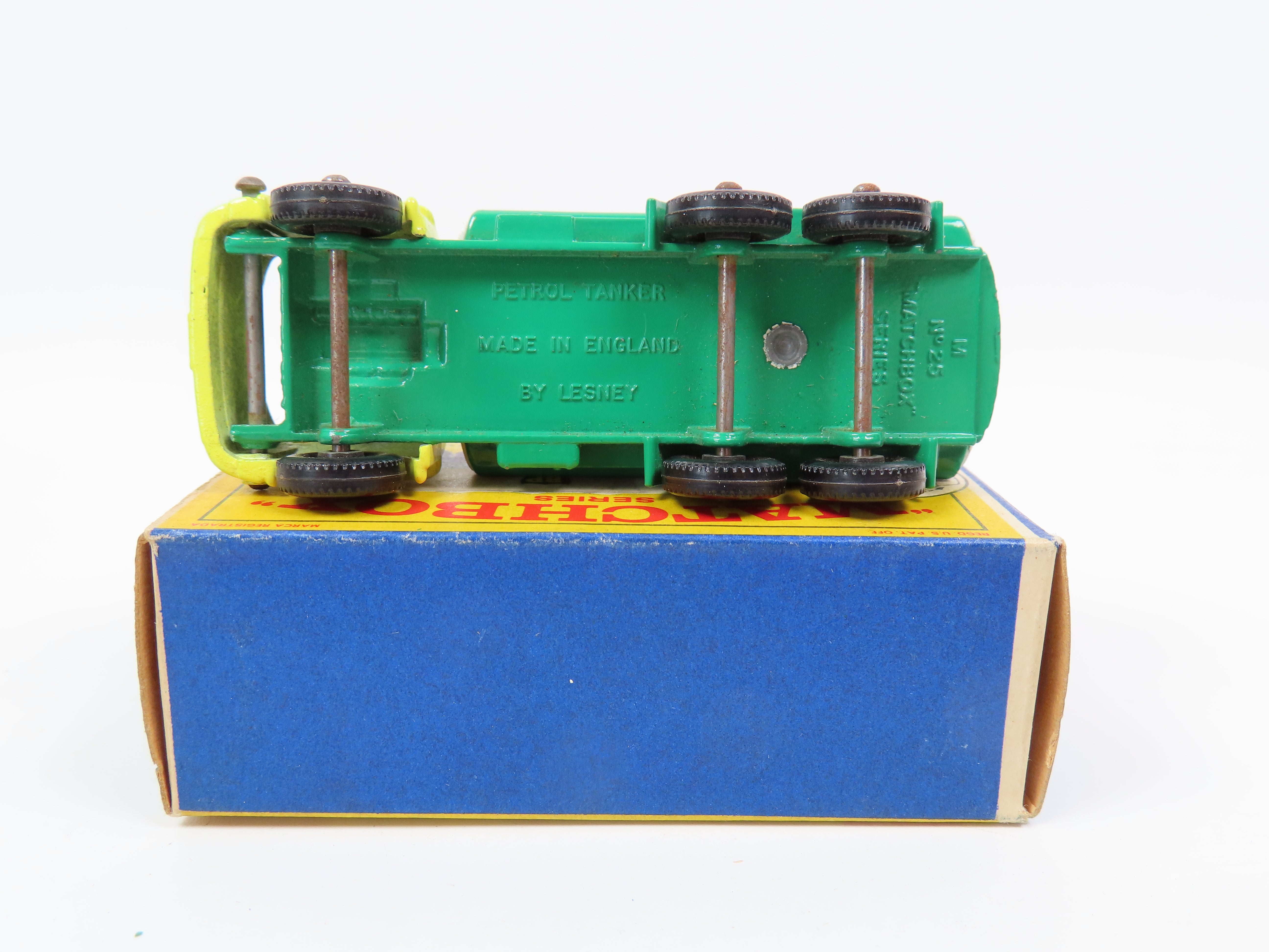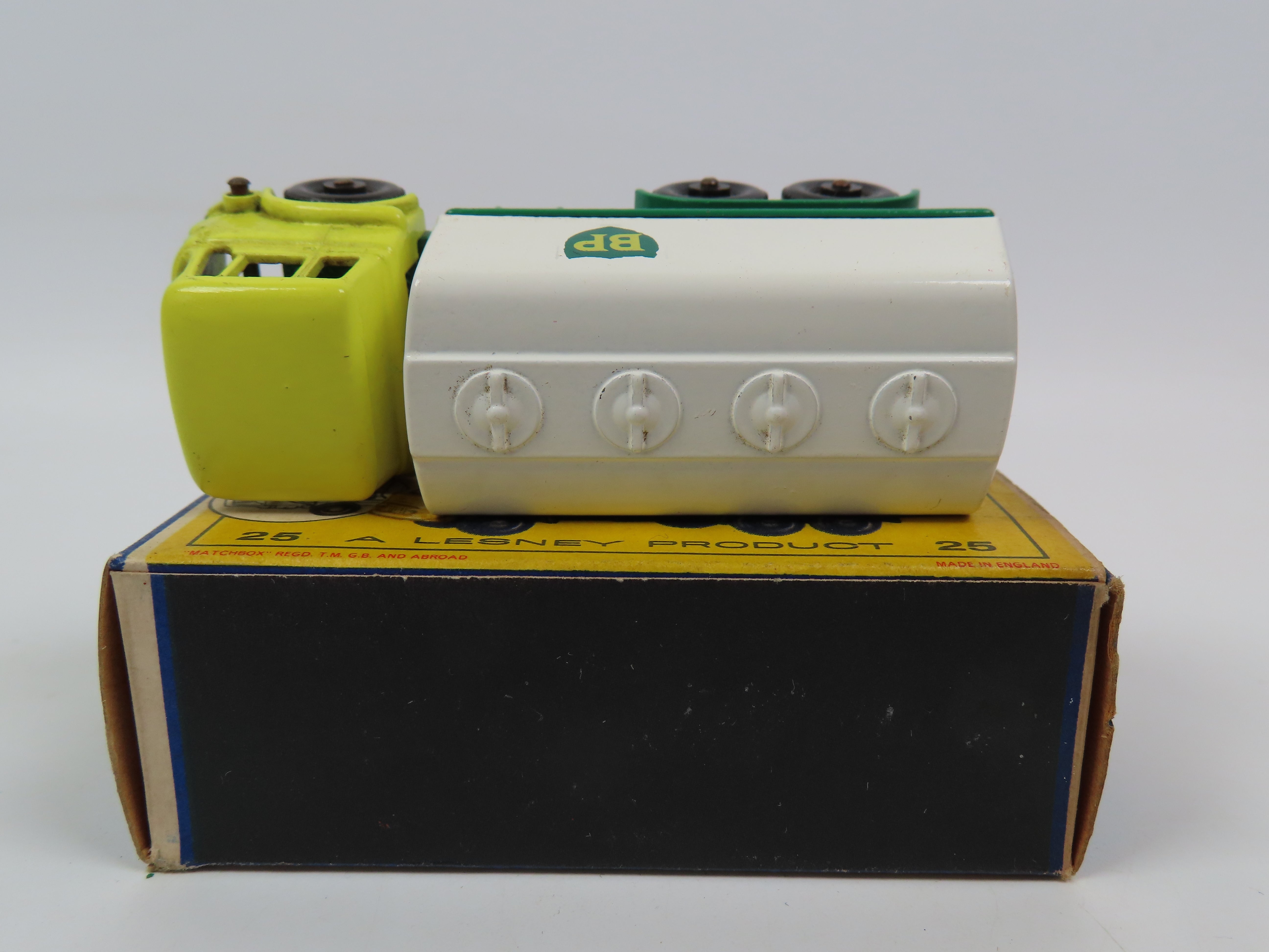 Matchbox 25 B.P. Tanker, with light yellow cab, green chassis with white tanker and 'BP' decals to each side.