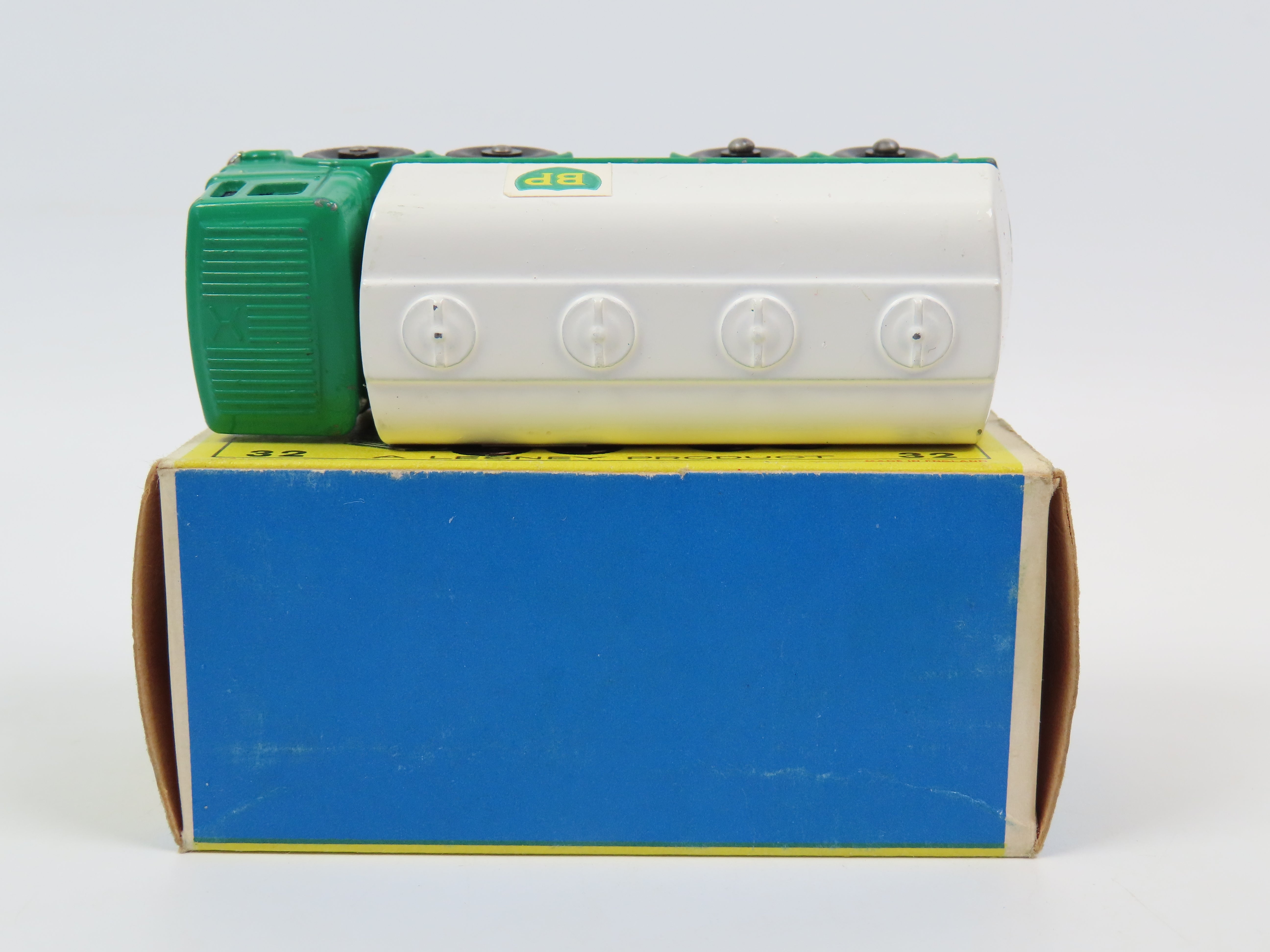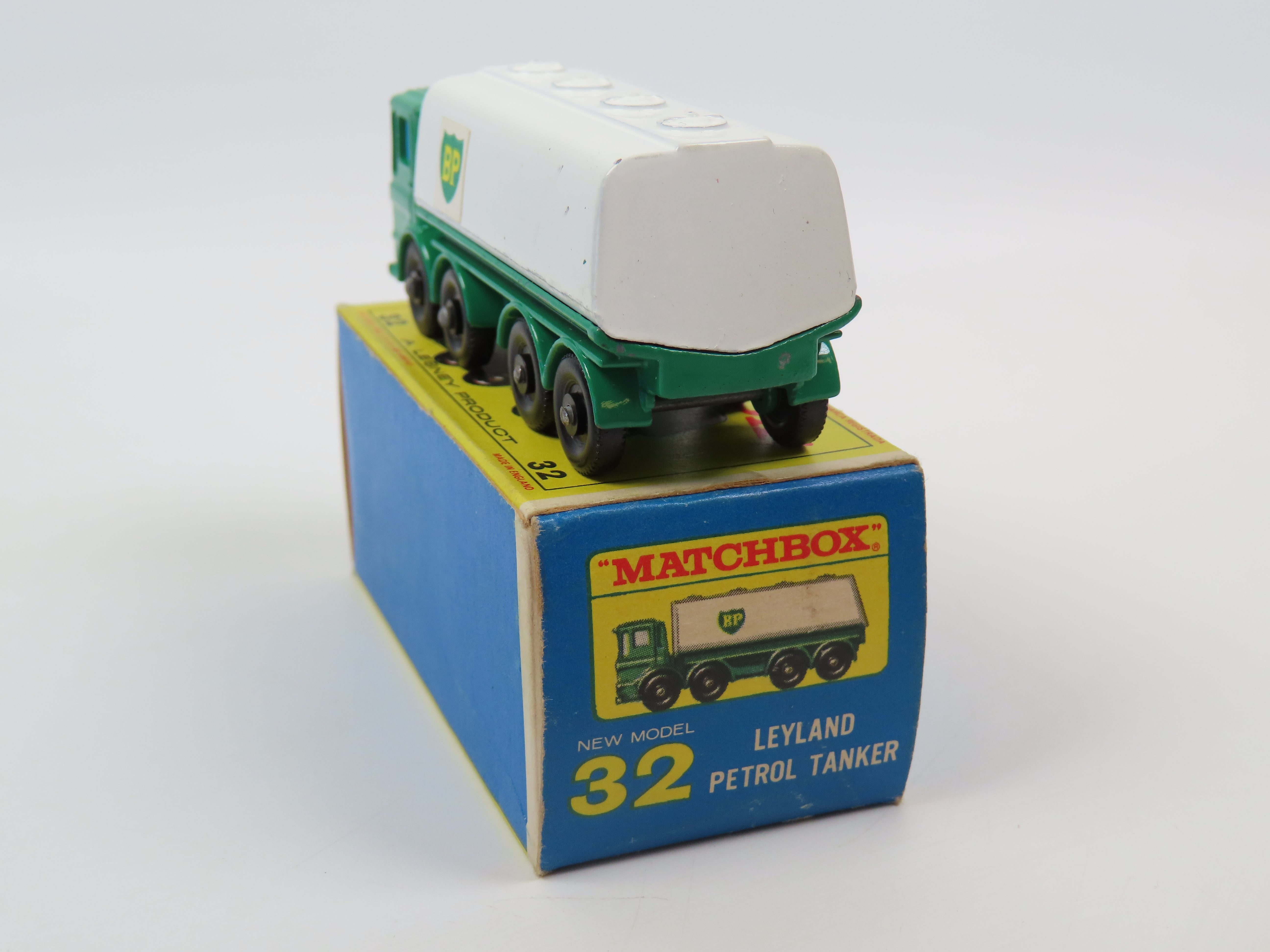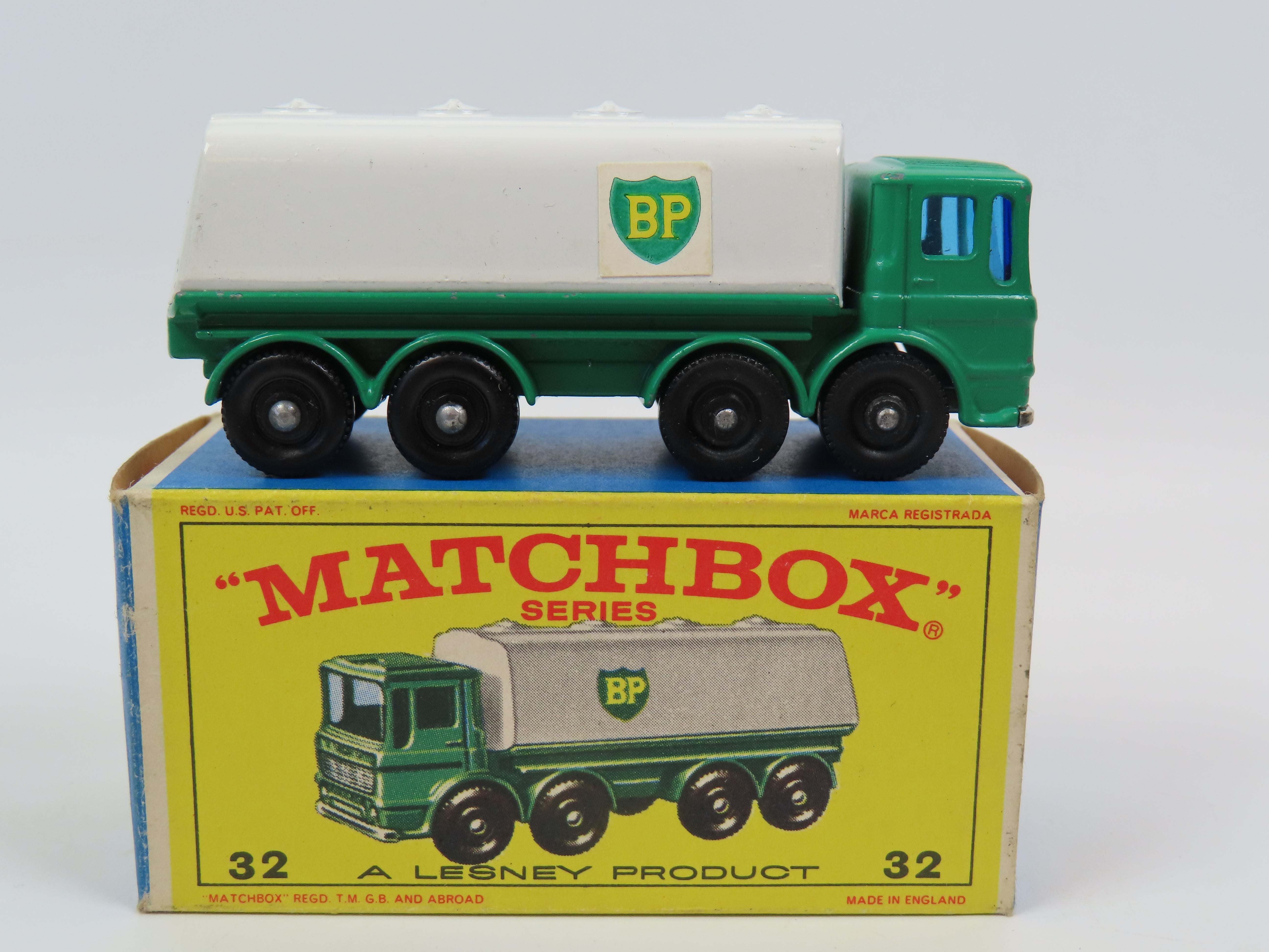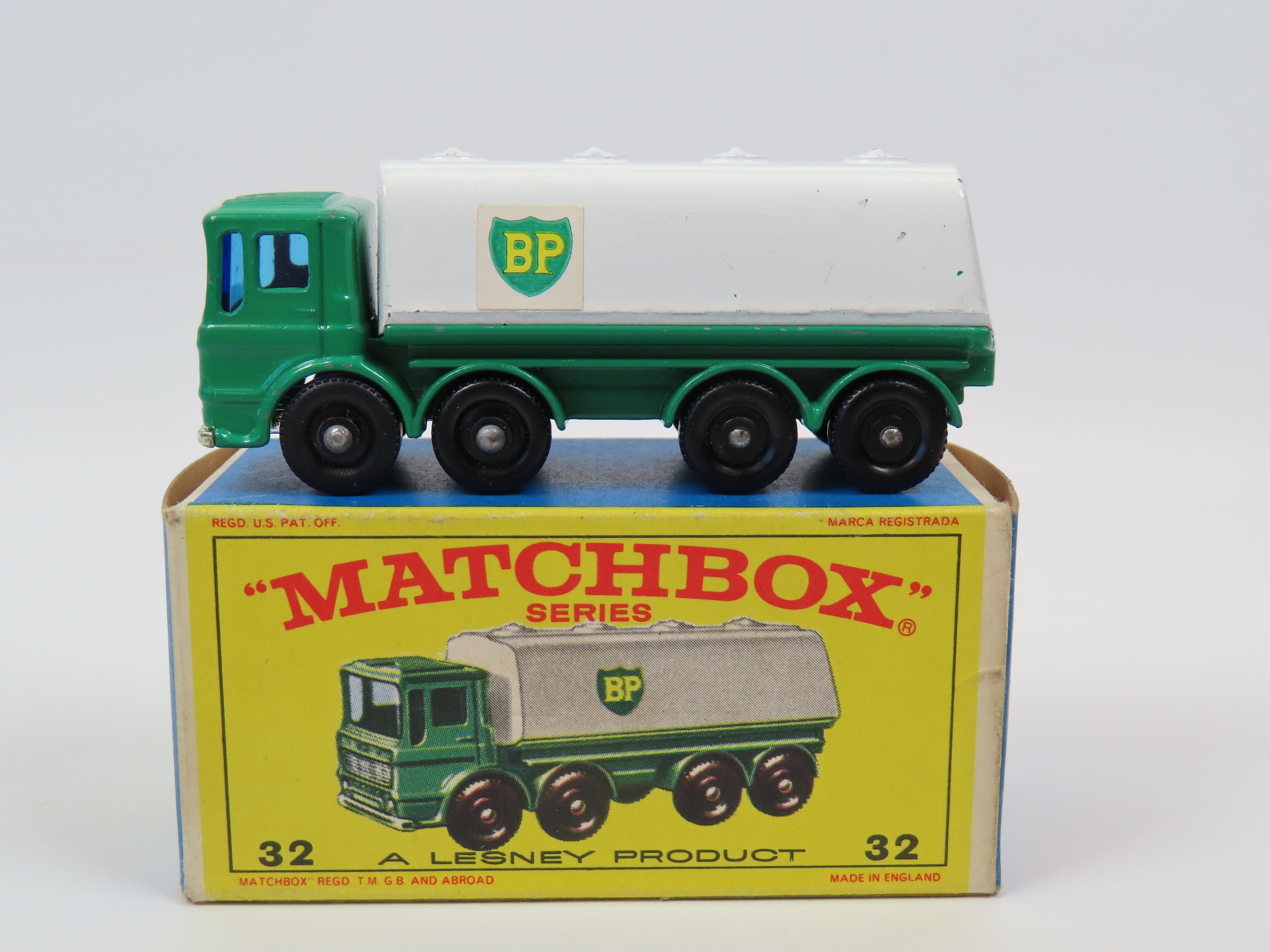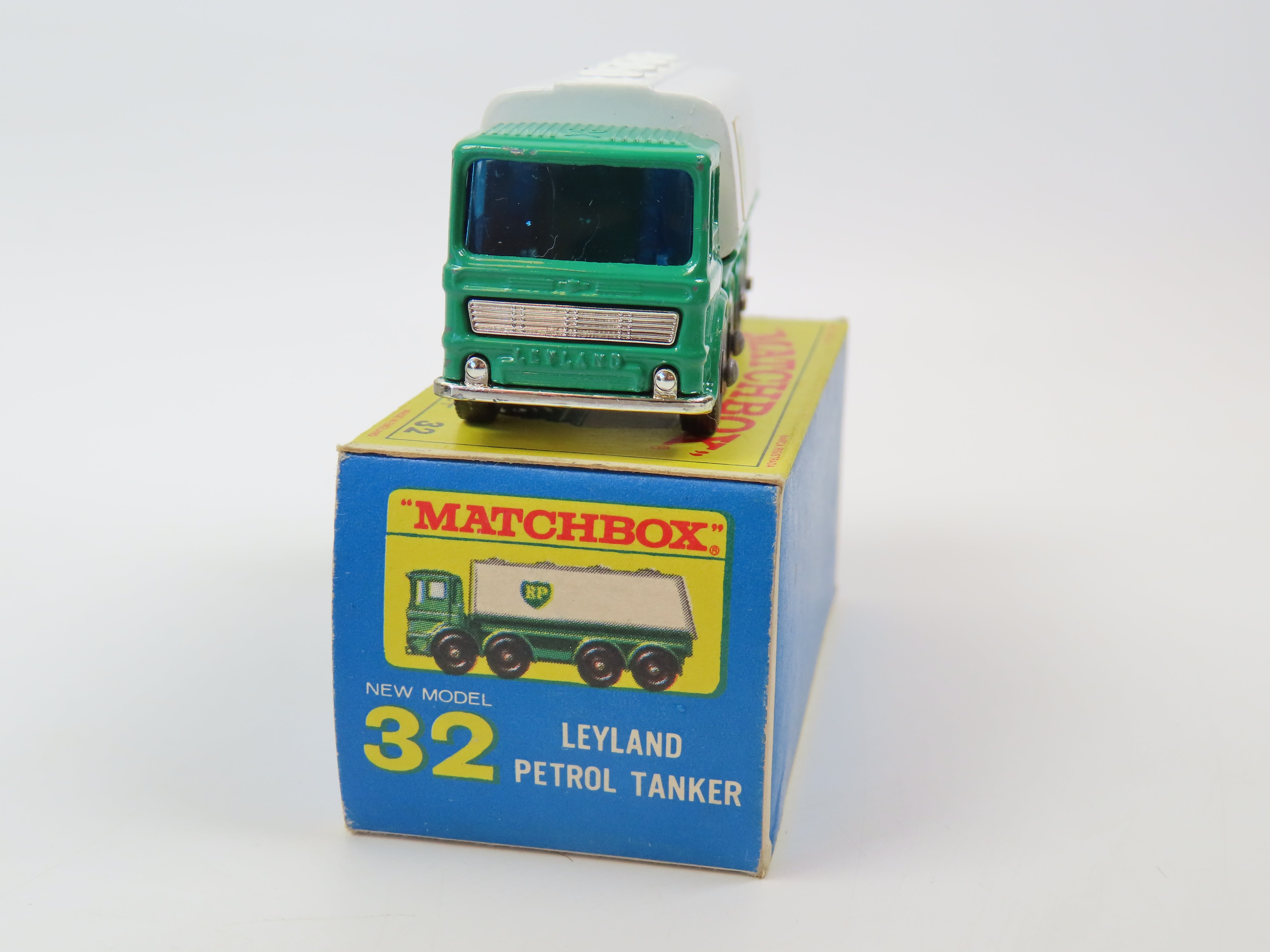 Matchbox 32 Leyland Petrol Tanker with a green cab and chassis, blue tinted windows, white tanker and 'BP' decals.