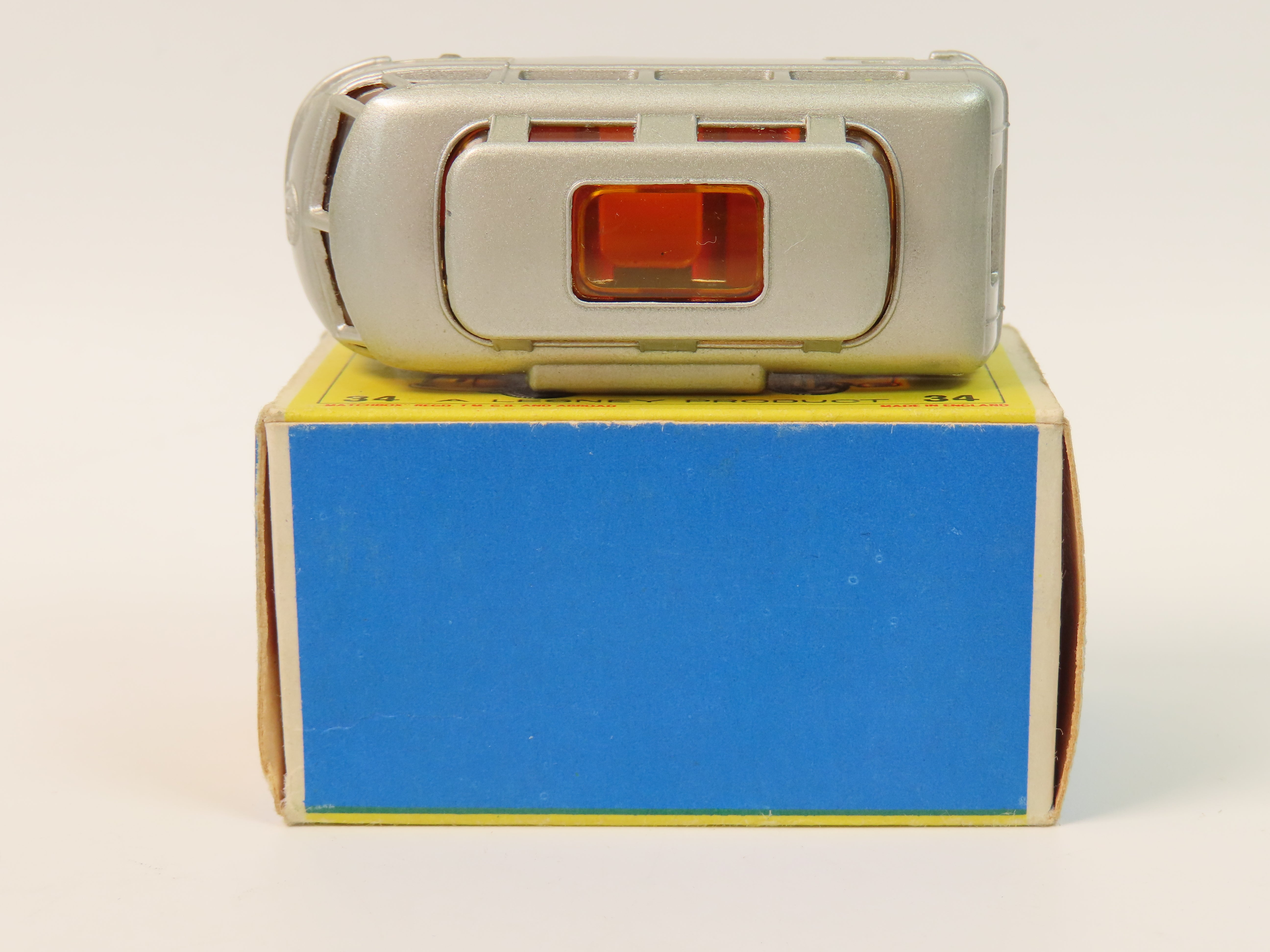 Matchbox Series No.34 Volkswagen Camper in silver with amber tinted windows and orange interior.