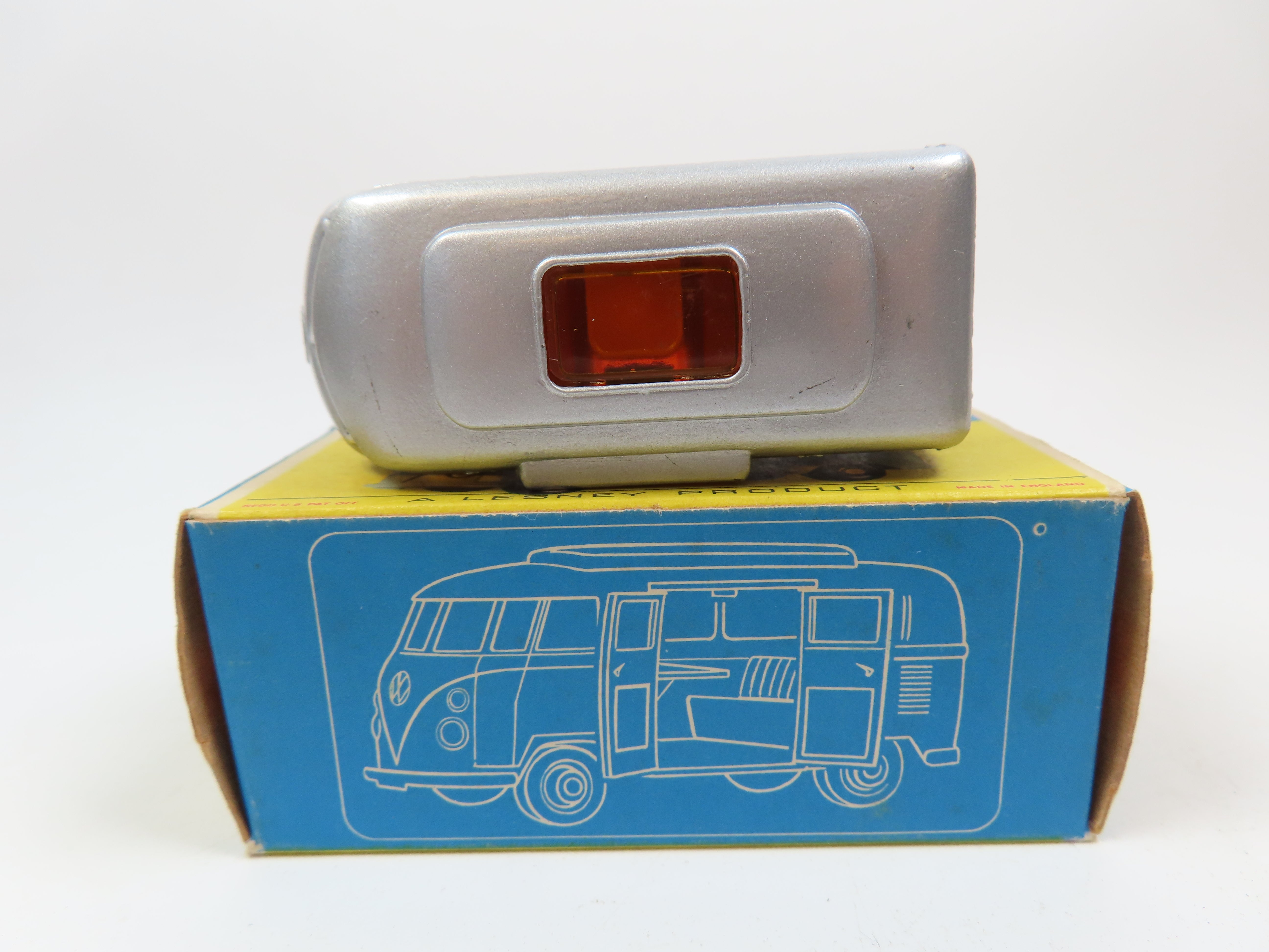 Matchbox 34 Volkswagen Camper in silver with orange tinted windows and black plastic wheels.