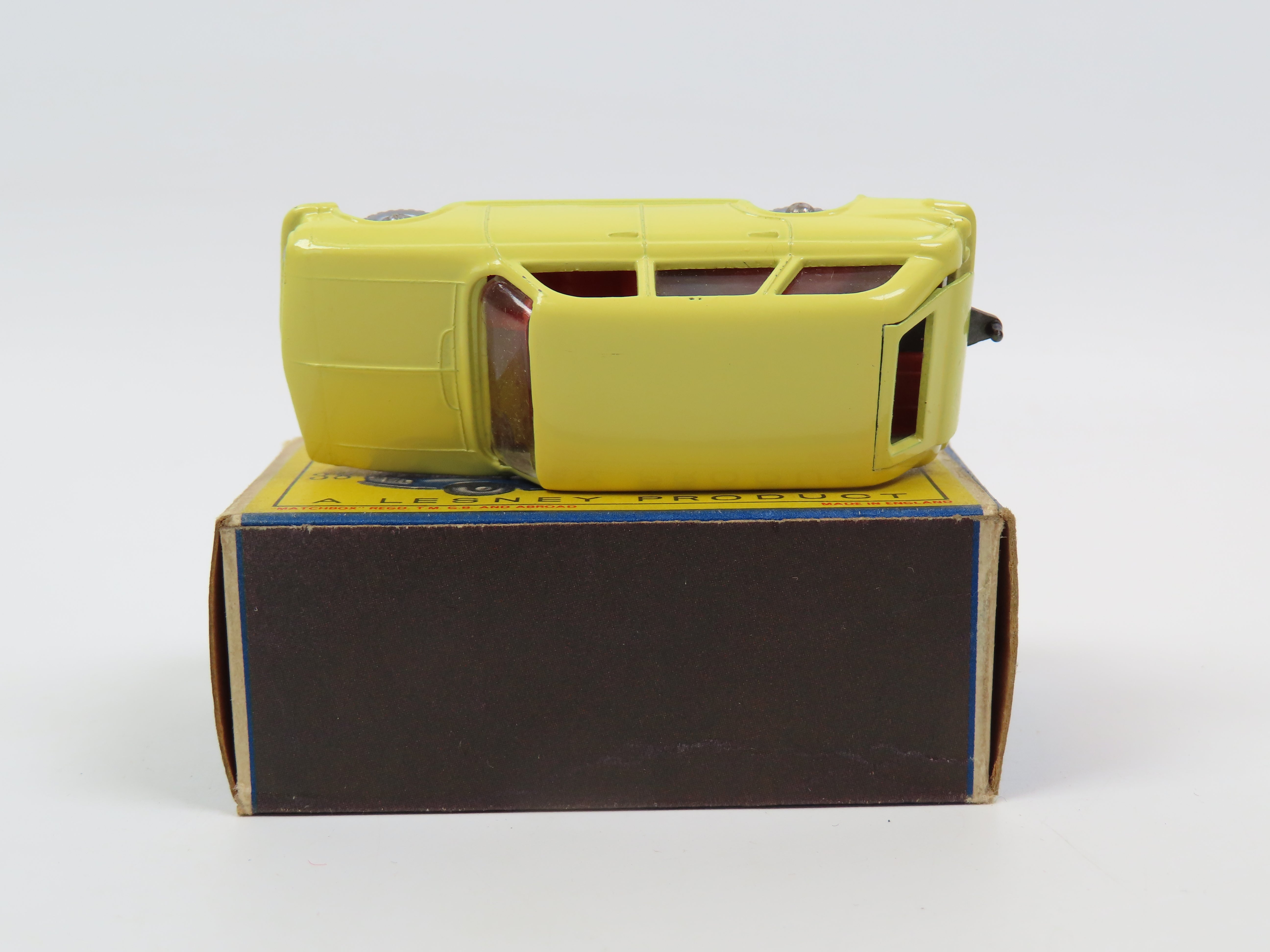 Matchbox 38 Vauxhall Victor Estate Car in light yellow, with red interior and black baseplate and tow hook. Silver plastic wheels.