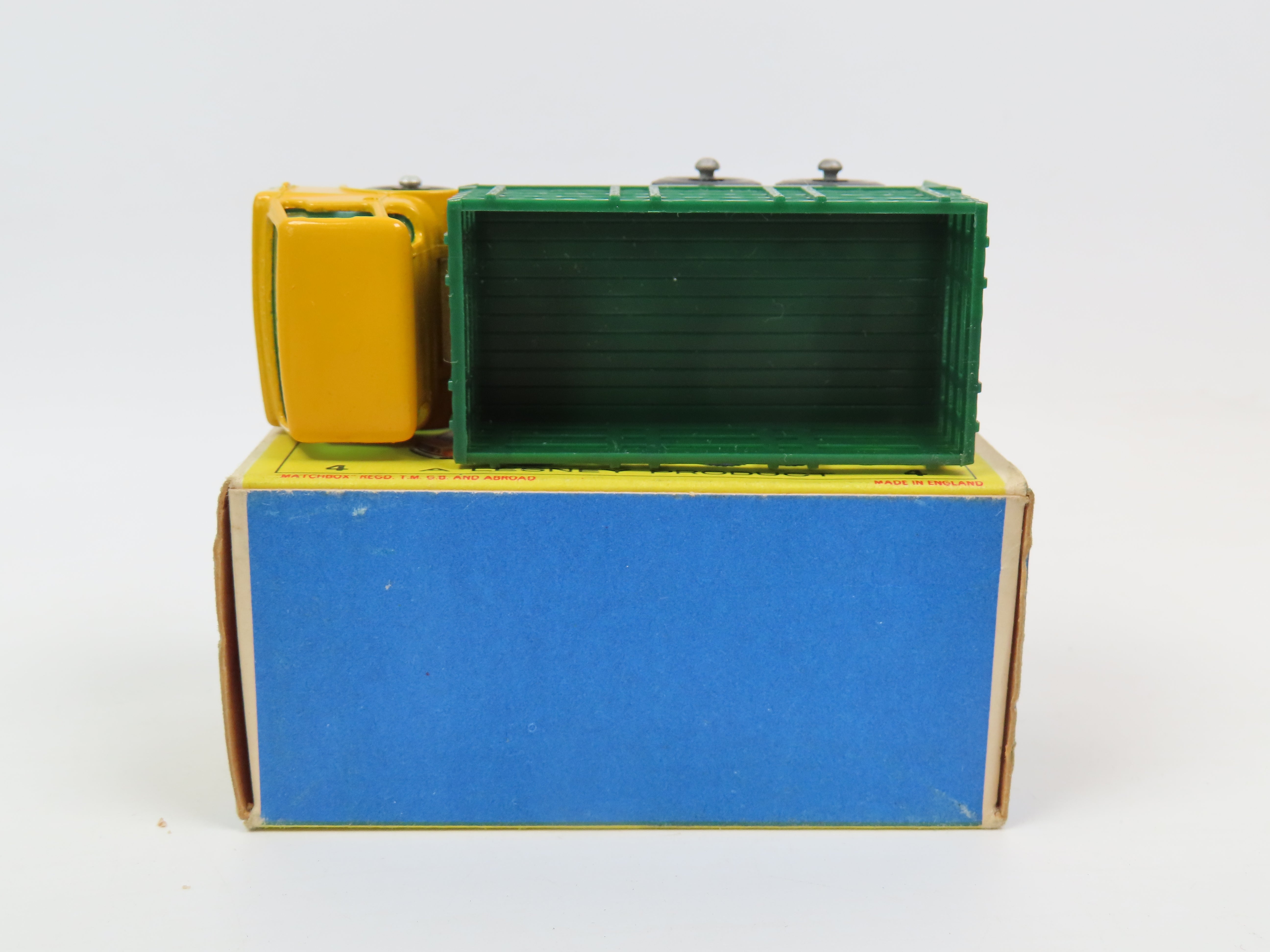 Matchbox 4 Stake Truck in yellow, with green plastic rear and green tinted windows.