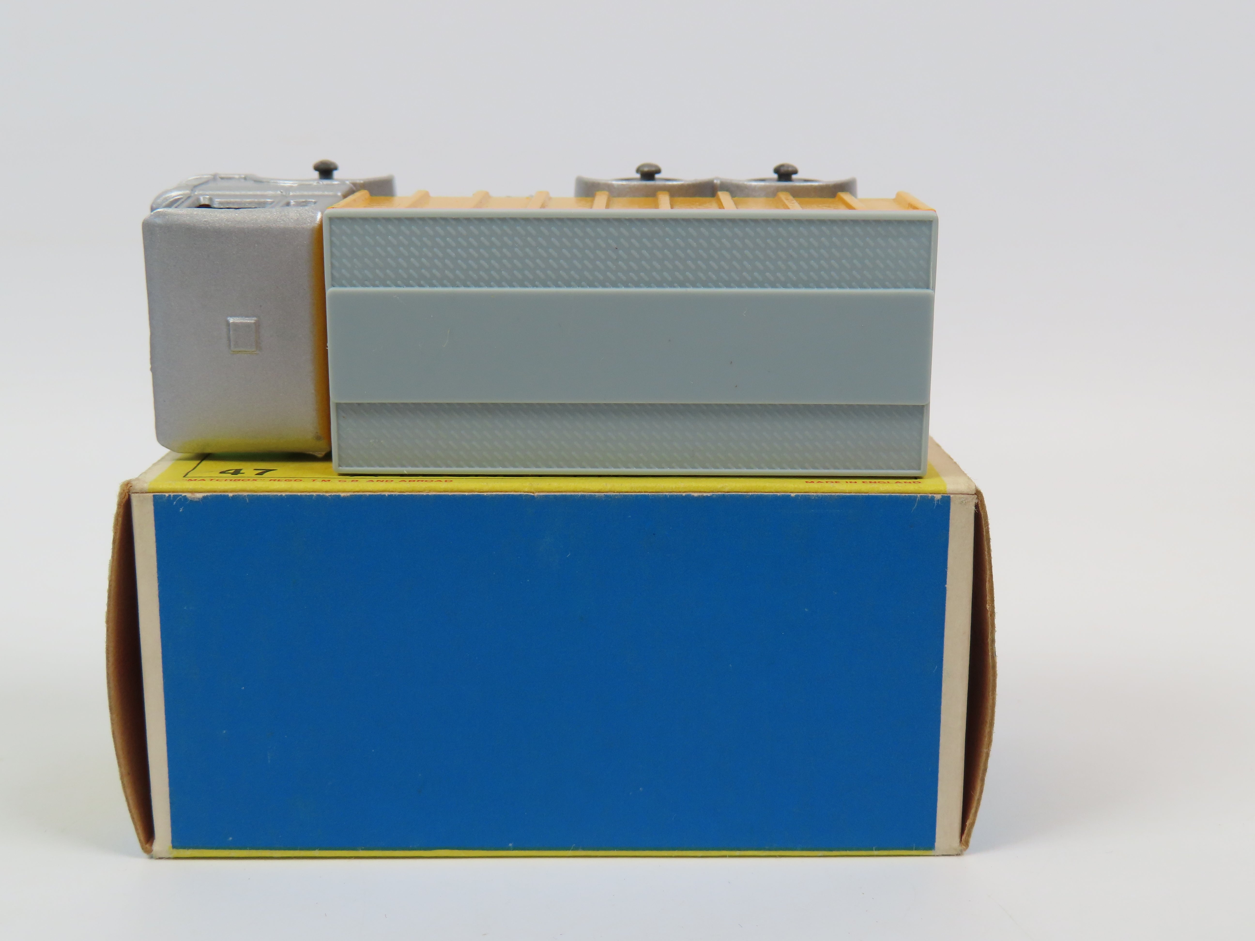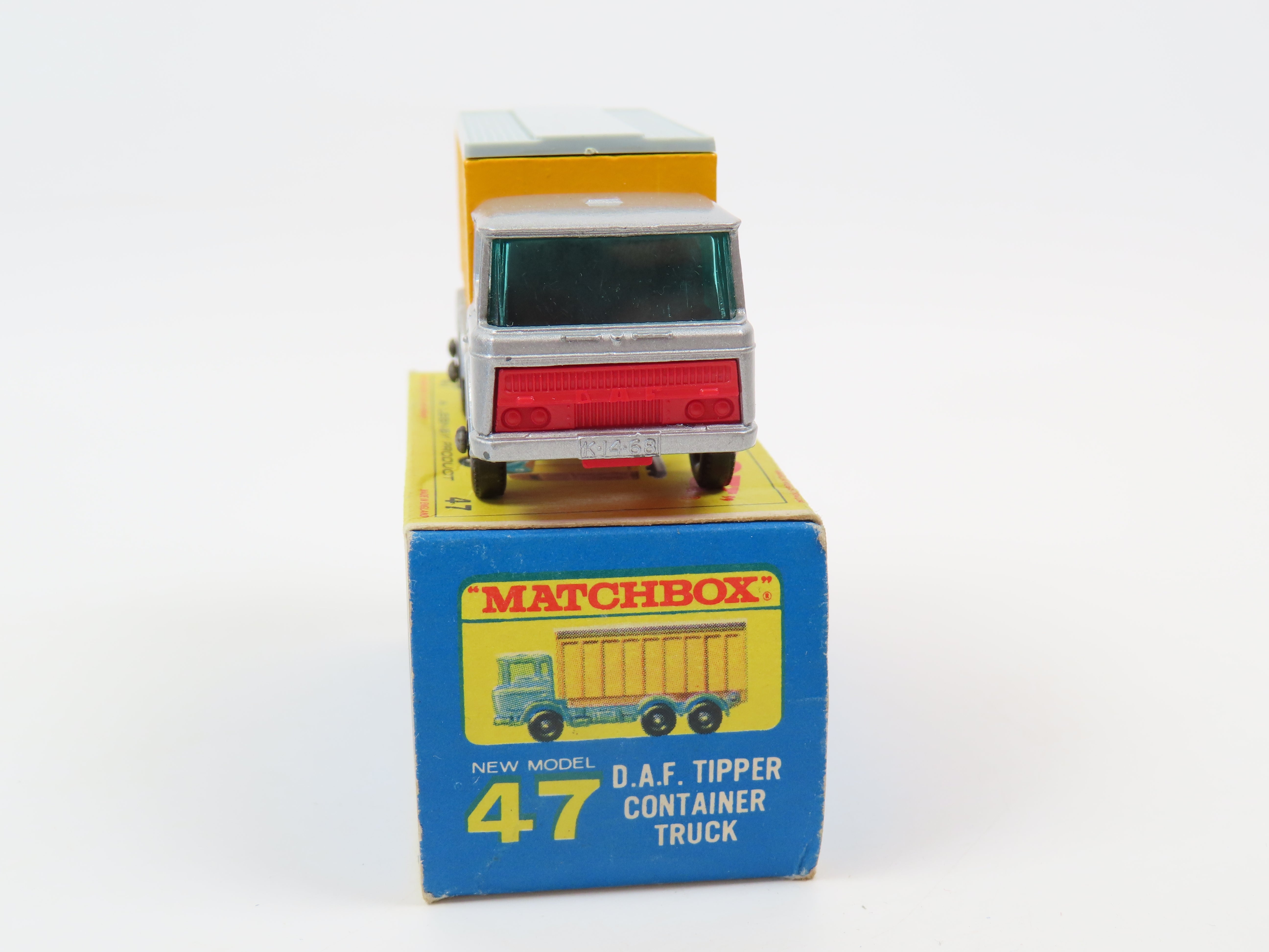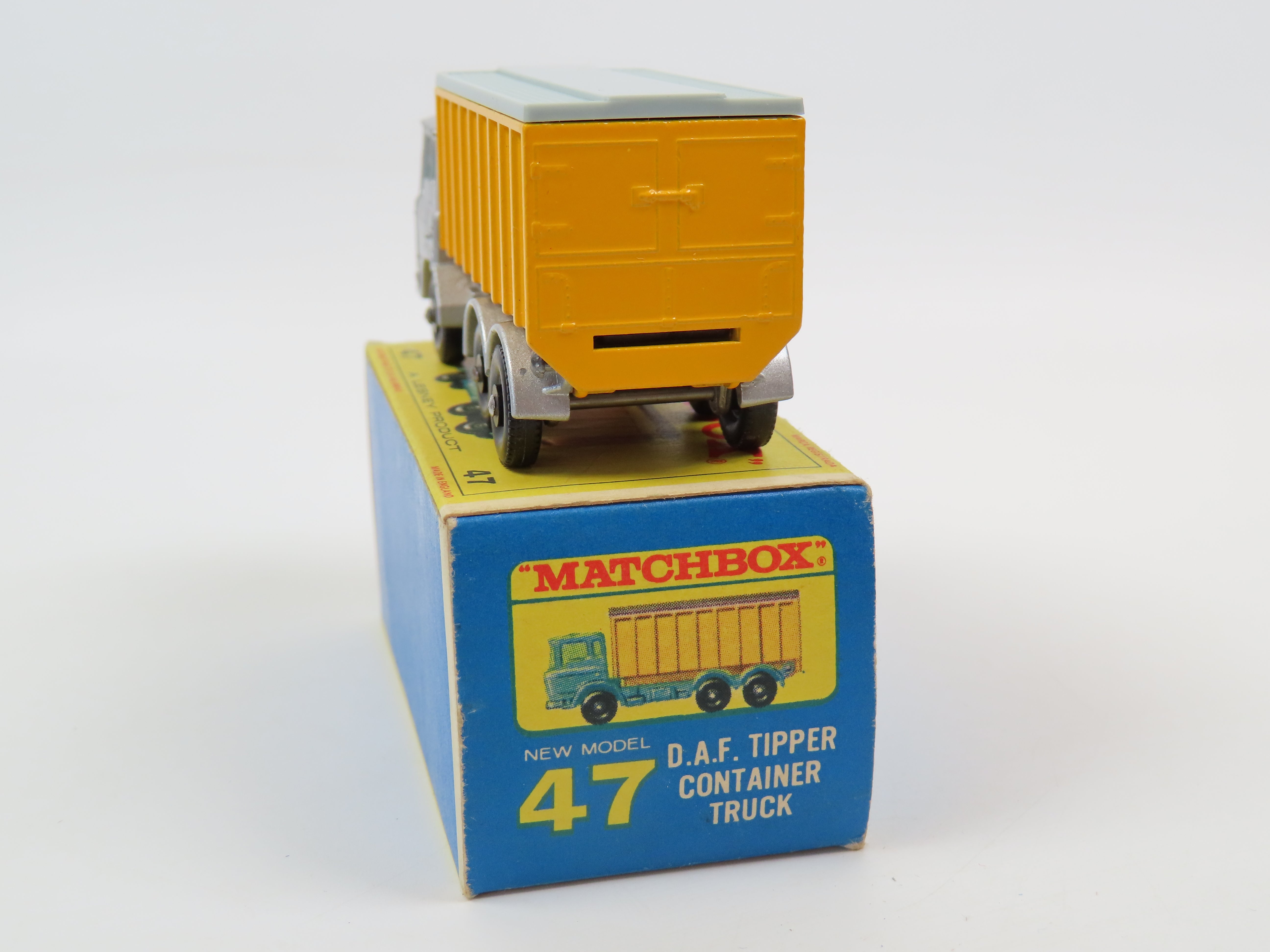 Matchbox 47 D.A.F. Tipper Container Truck in silver with blue tinted windows, red plastic grille to the front and yellow and grey plastic container to the rear.