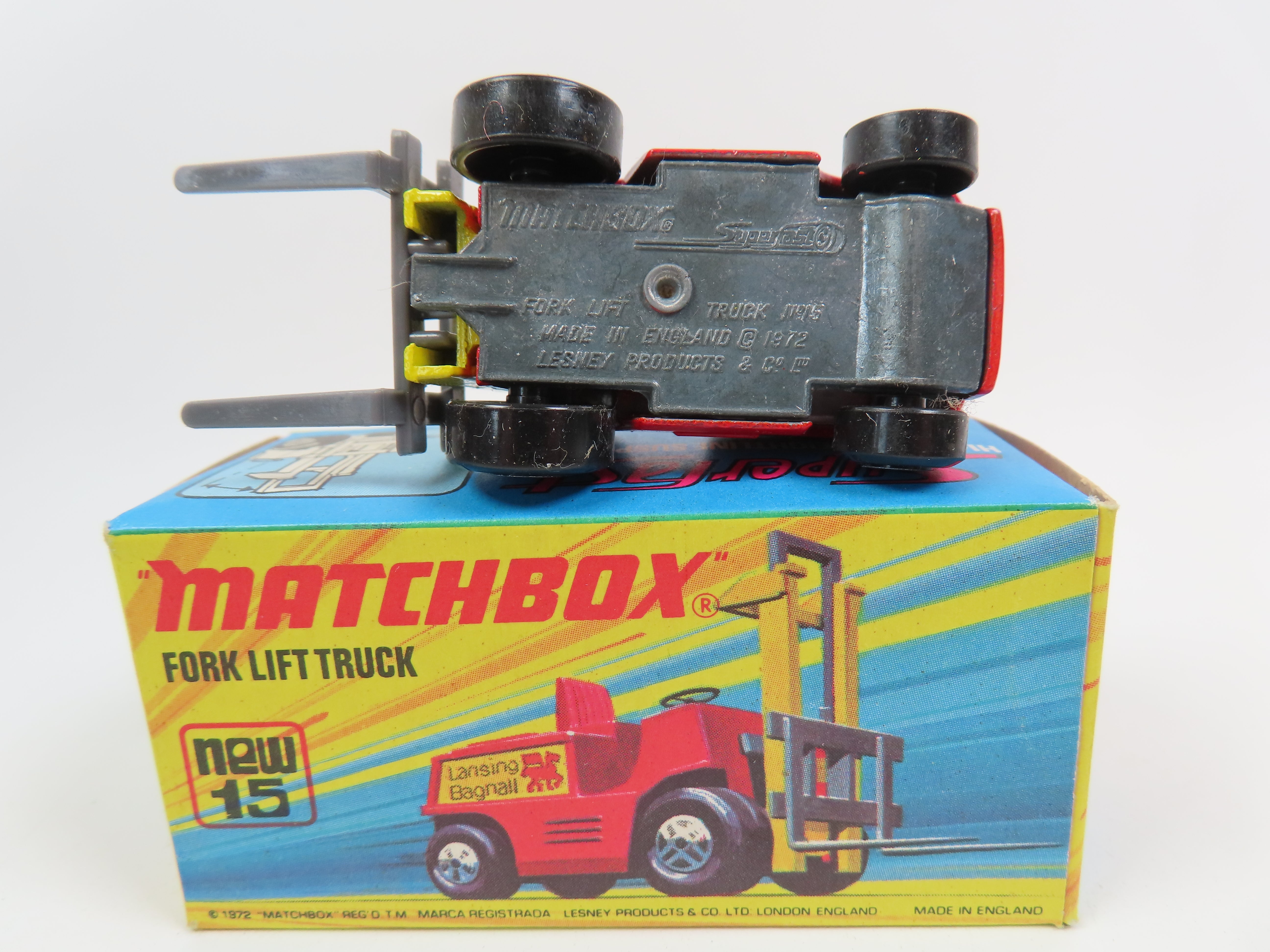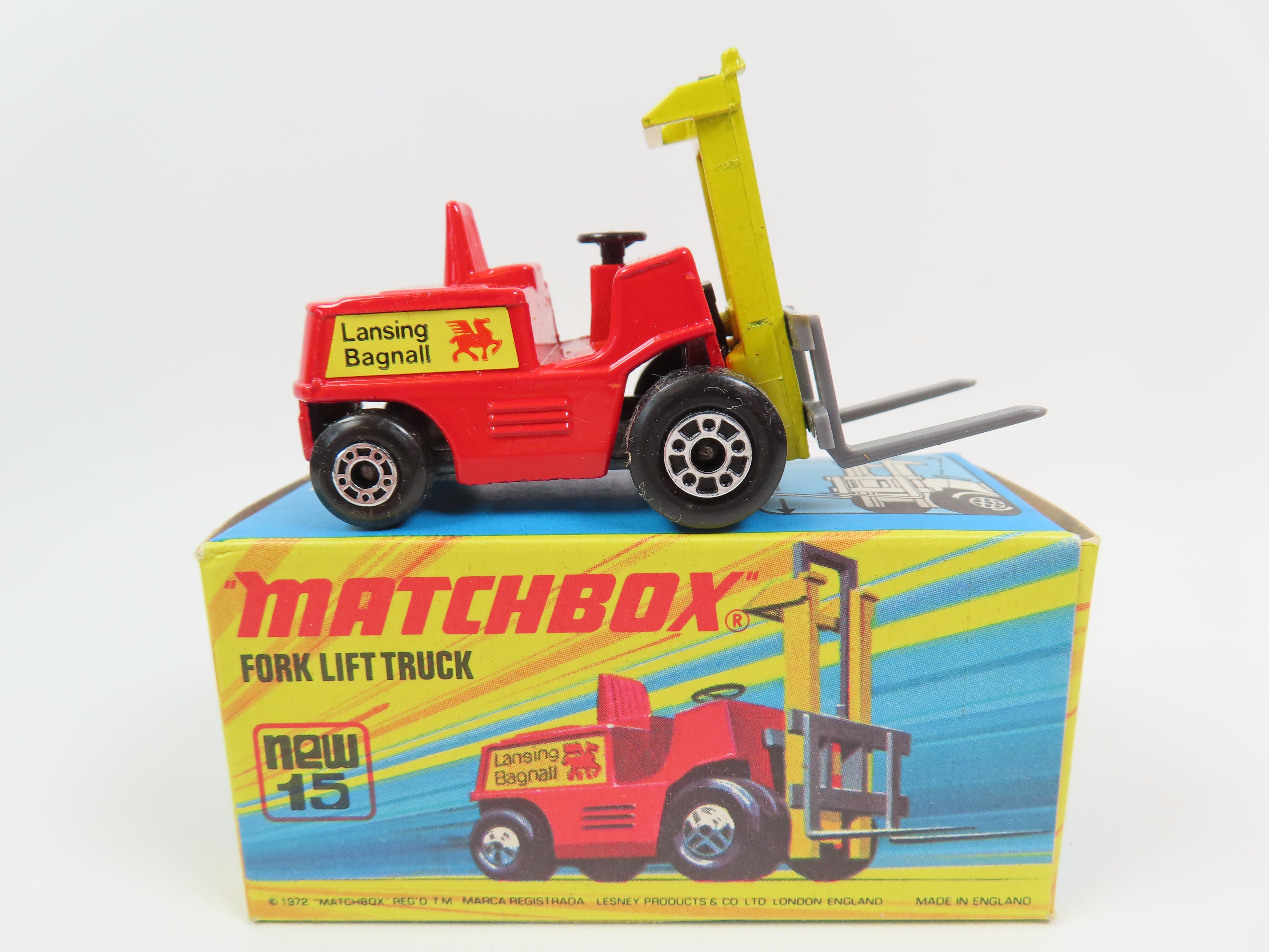 Matchbox 18 Fork Lift Truck with red body, yellow lift and grey plastic forks.