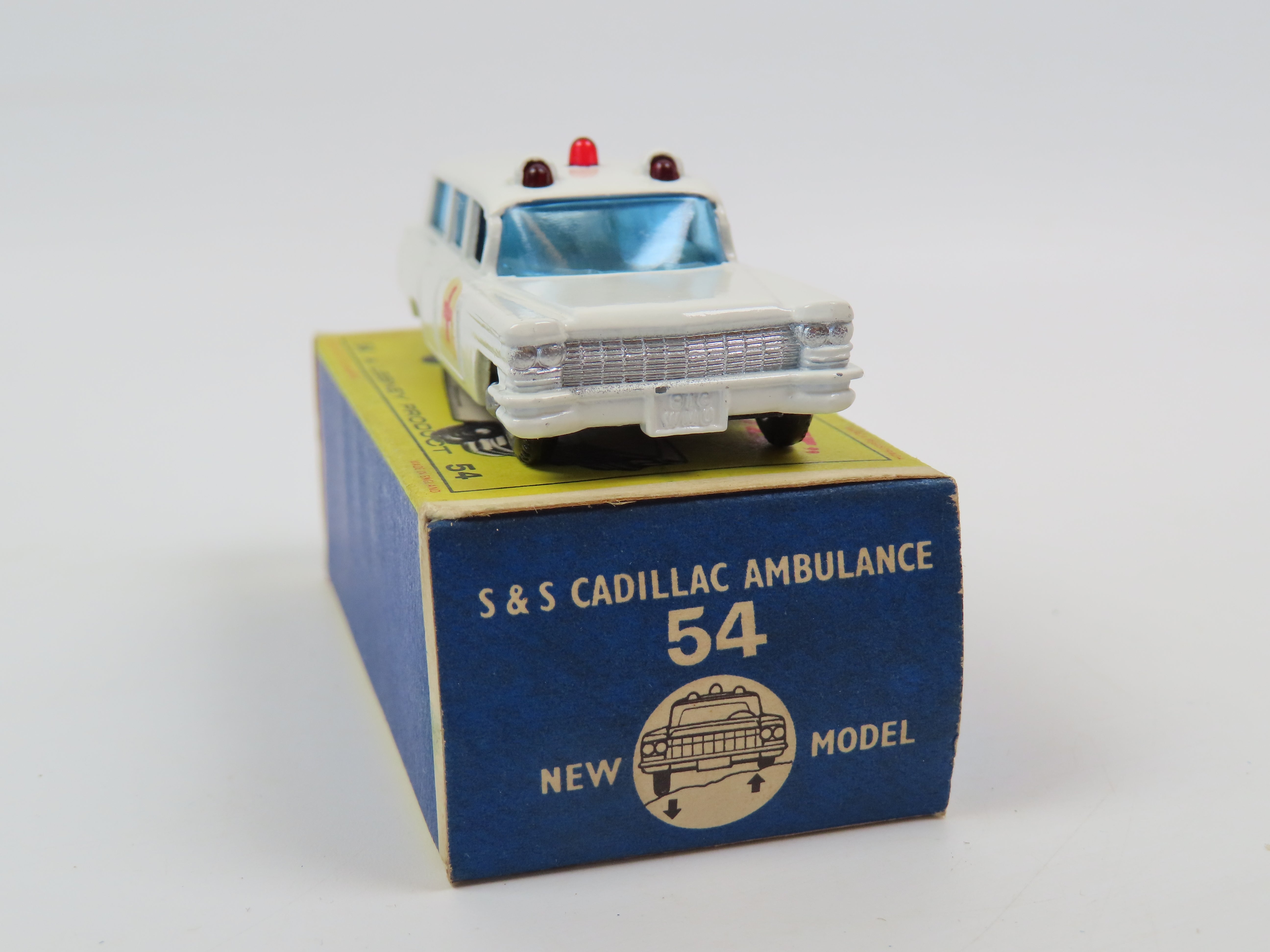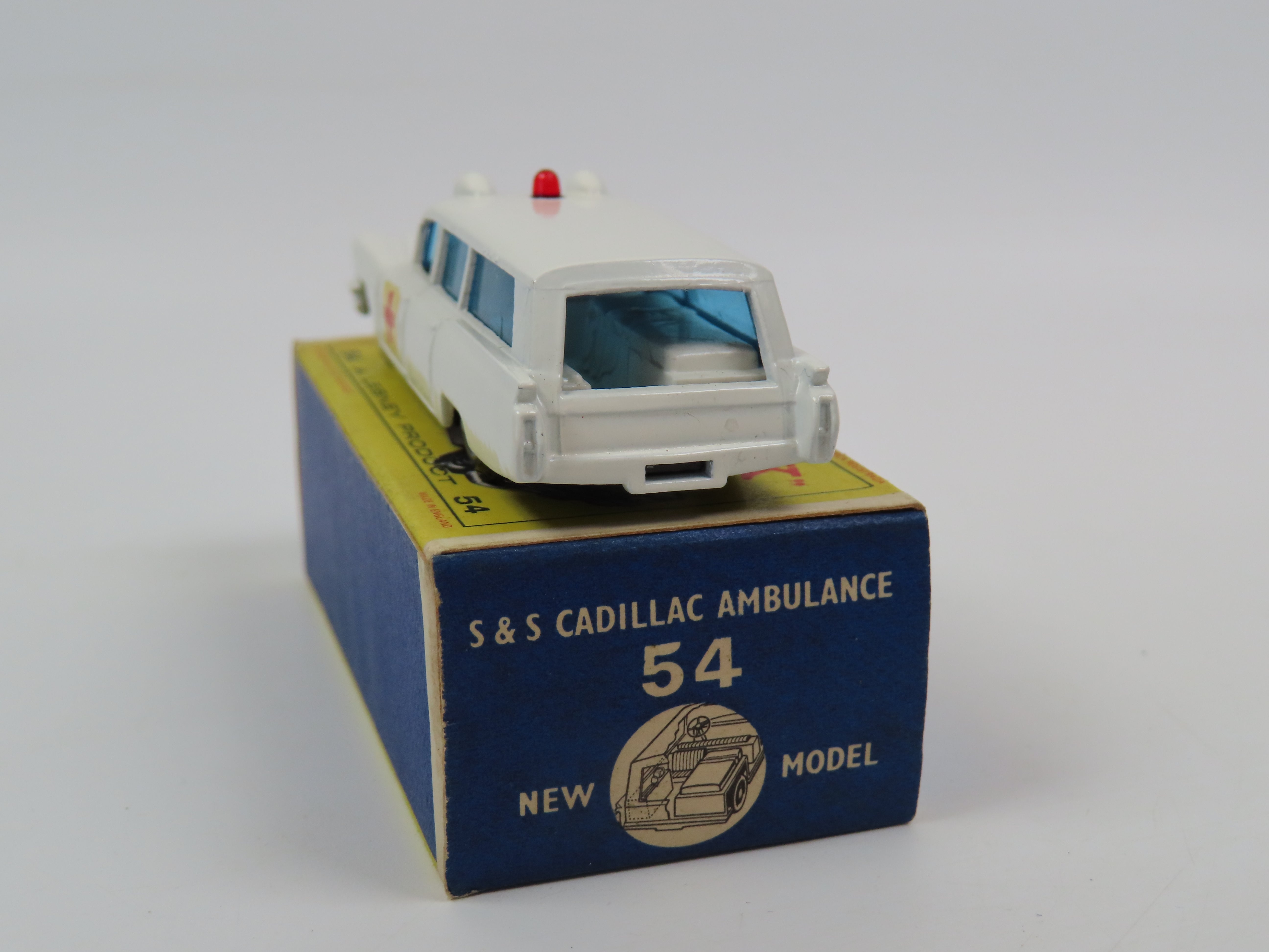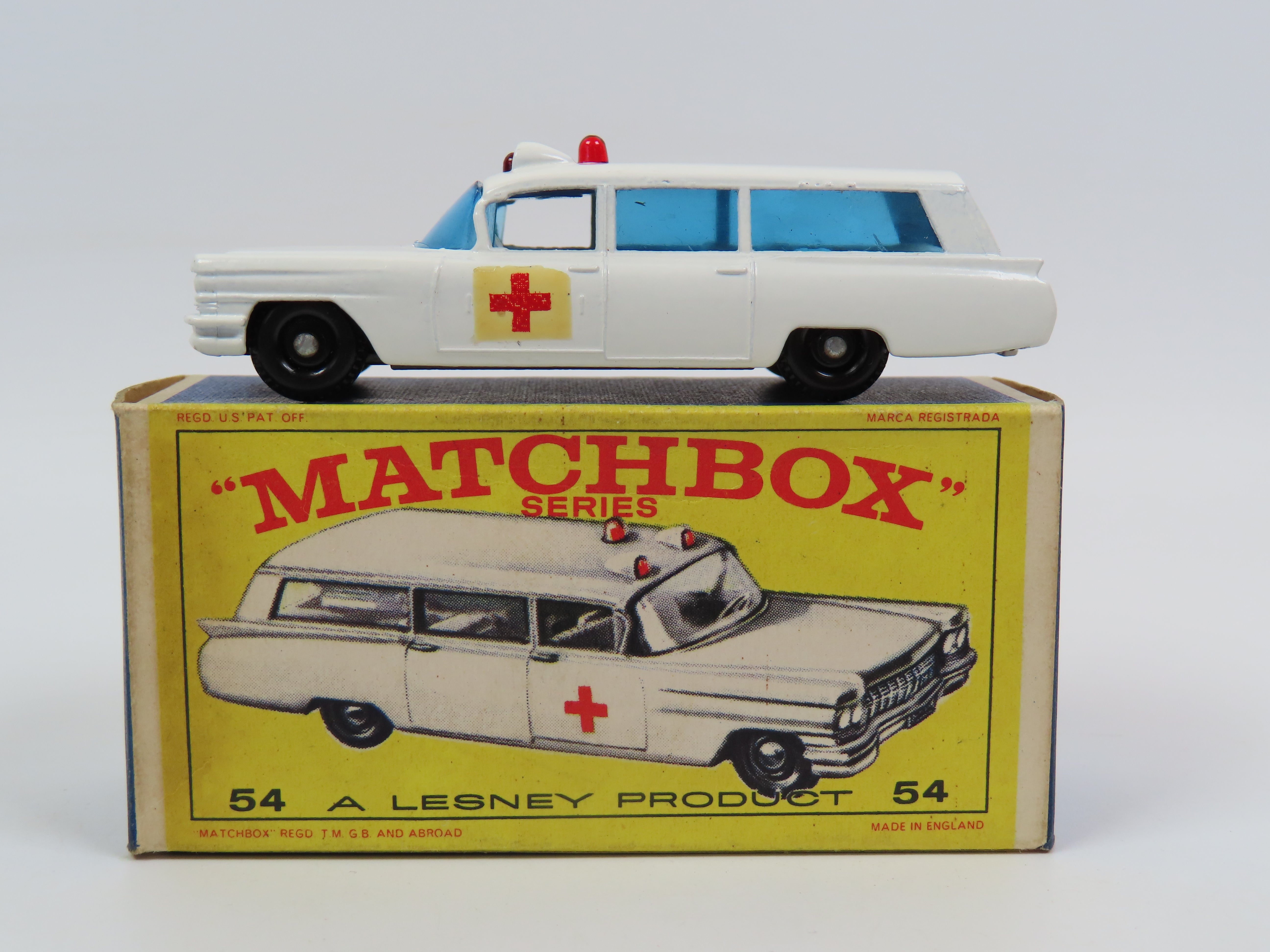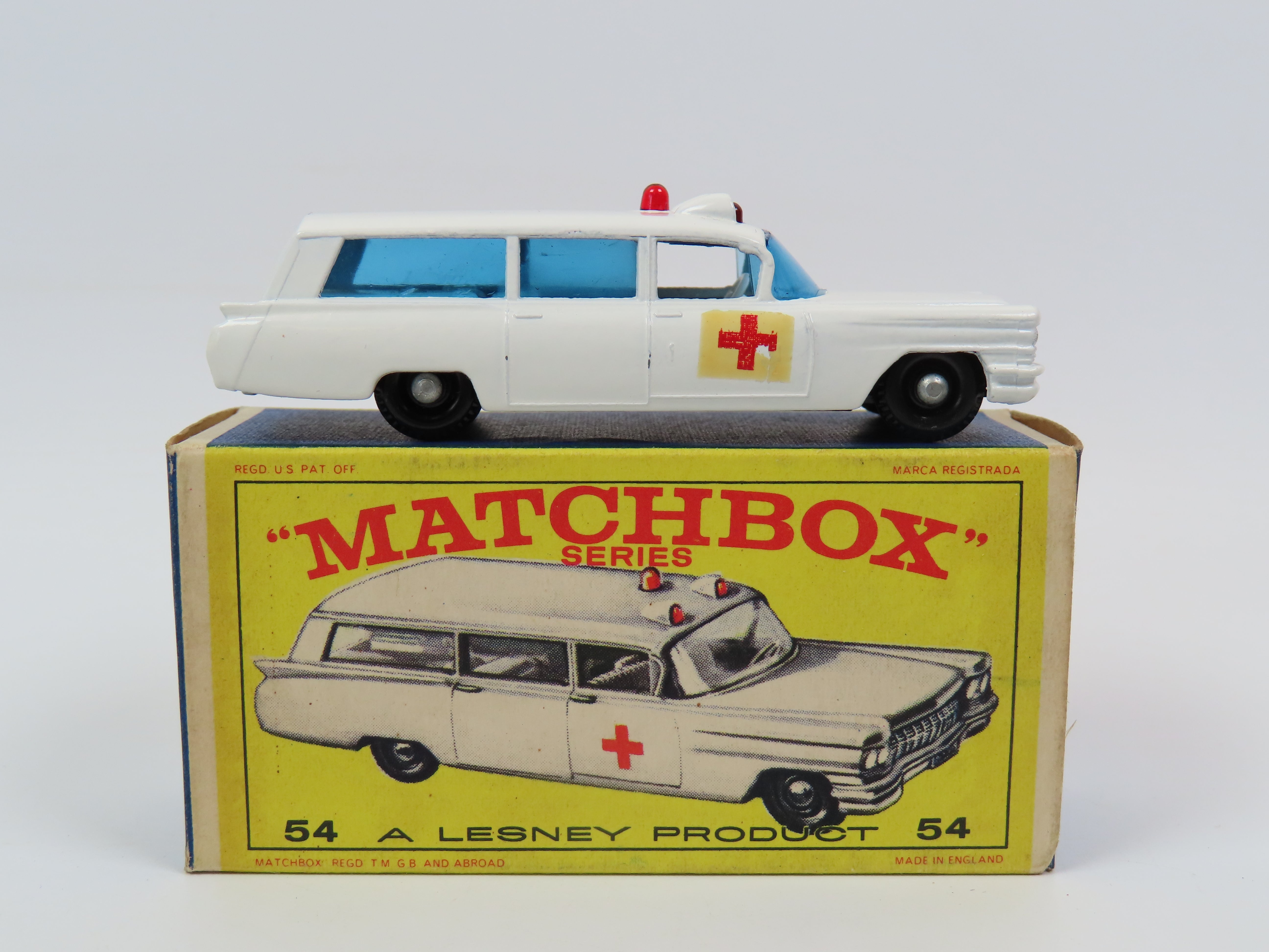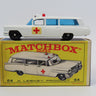 Matchbox 54 S & S Cadillac Ambulance in white with blue tinted windows, red dome light to the roof and red cross decals to each side.