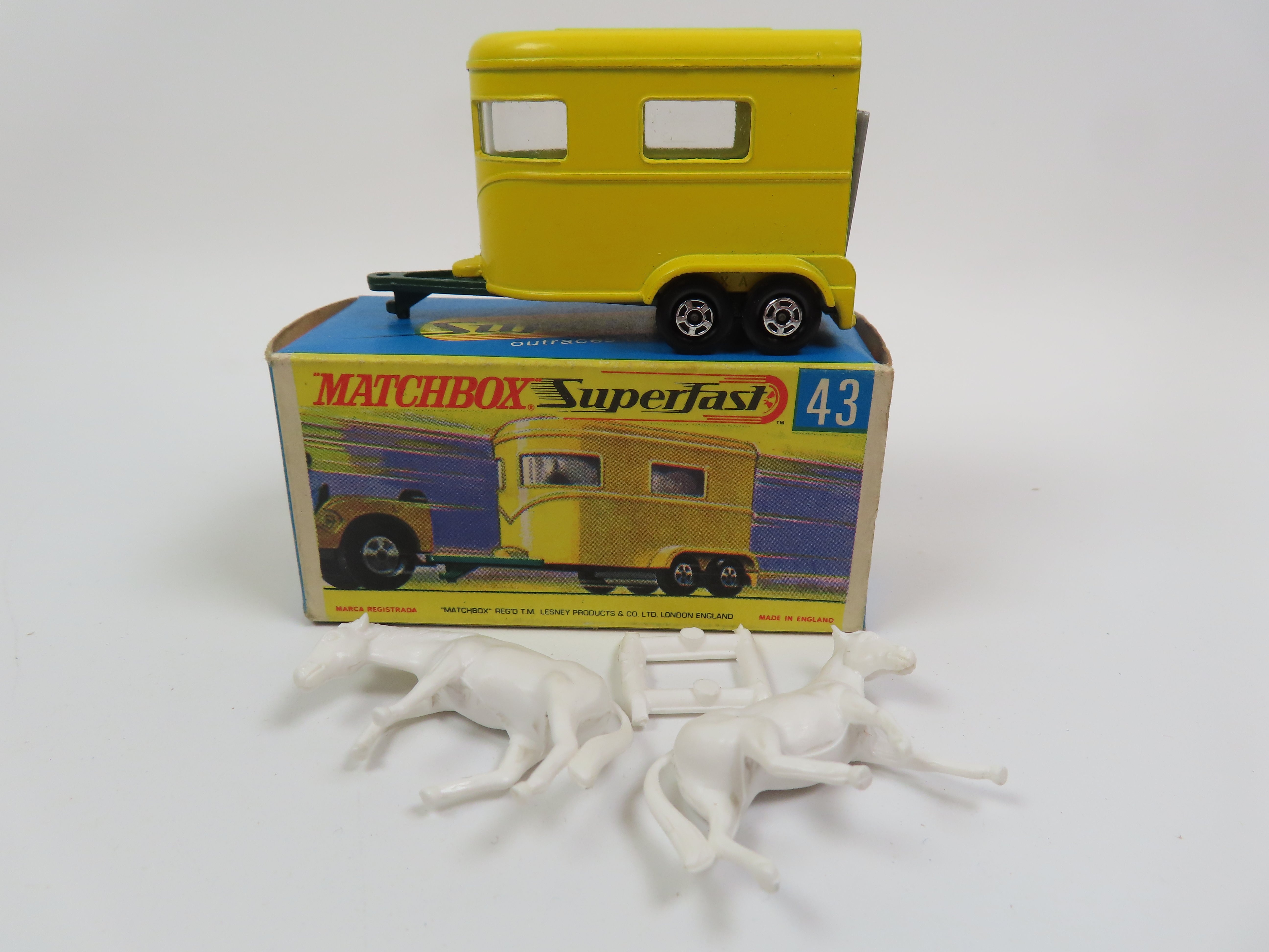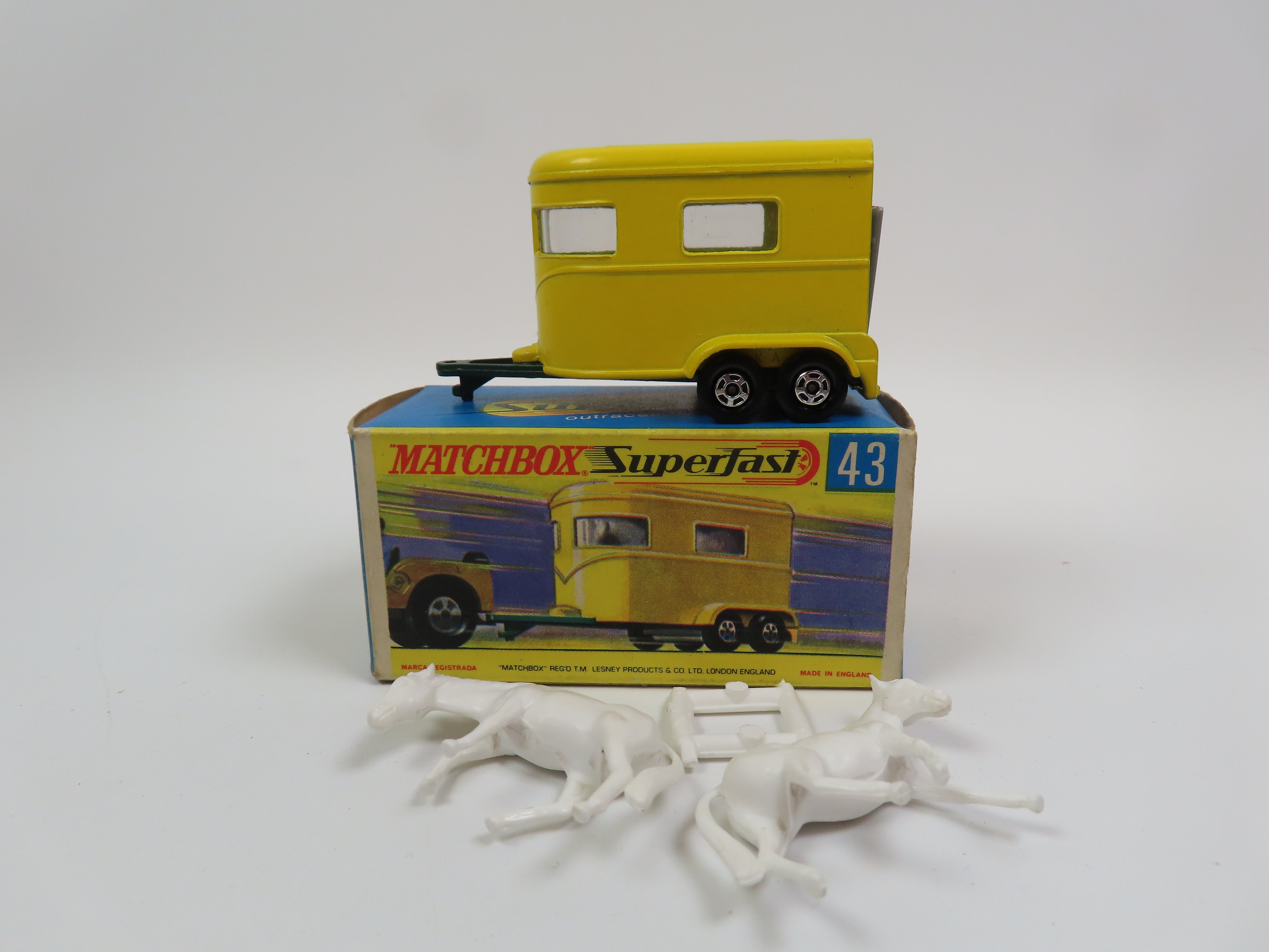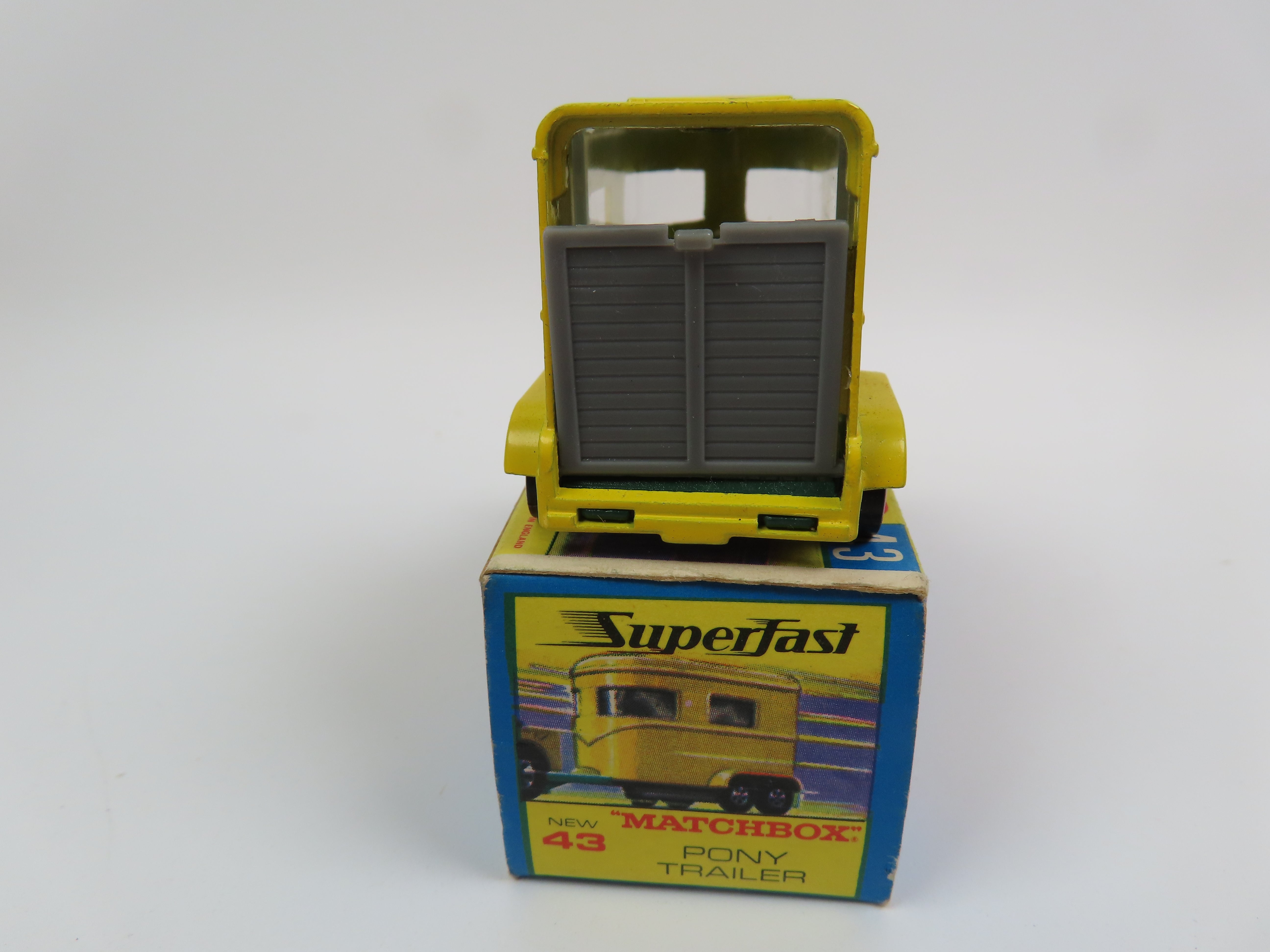 Matchbox Superfast 43 Pony Trailer in yellow with green hook/base and grey rear door, with 2 loose ponies and the sprue.