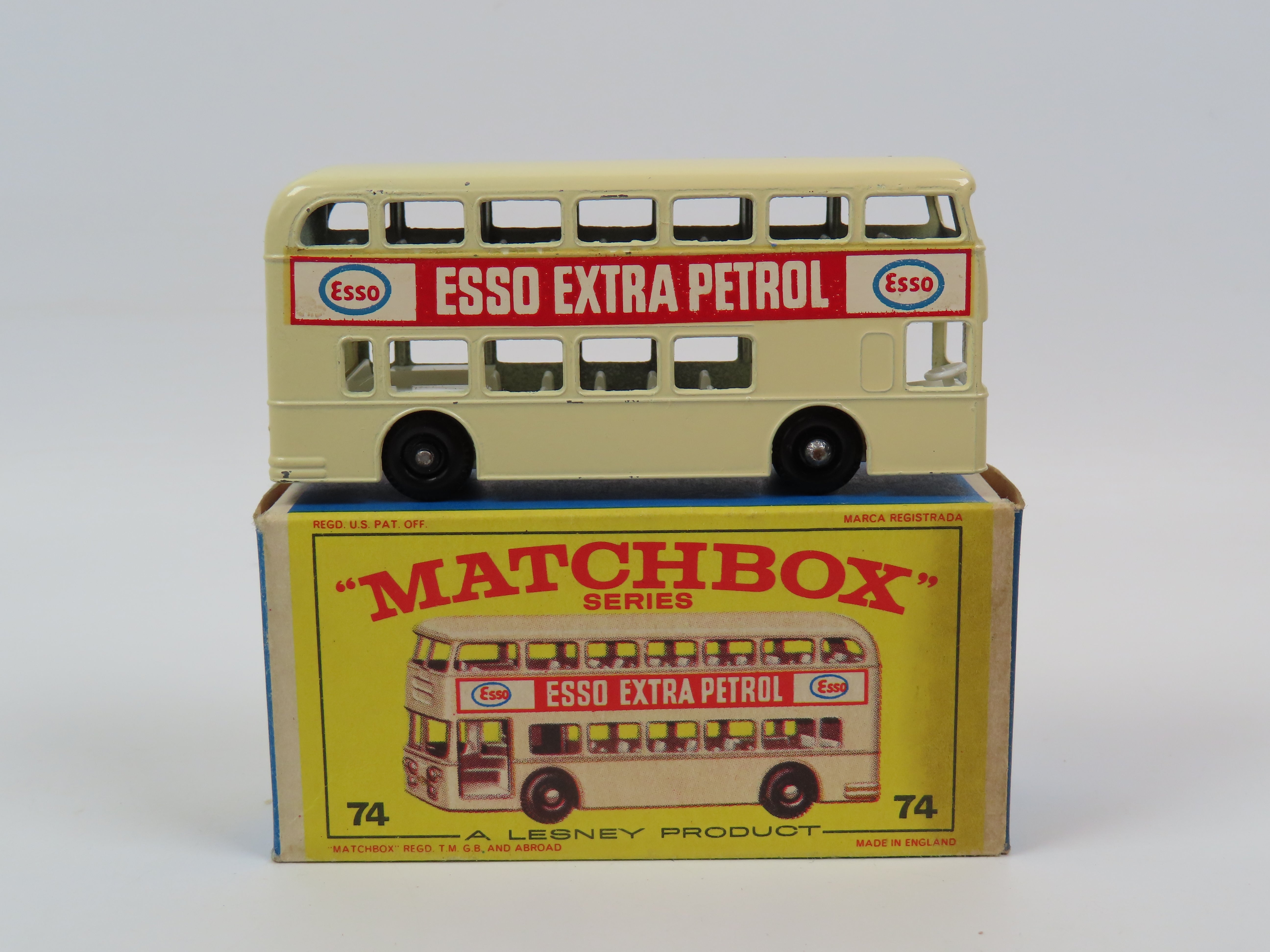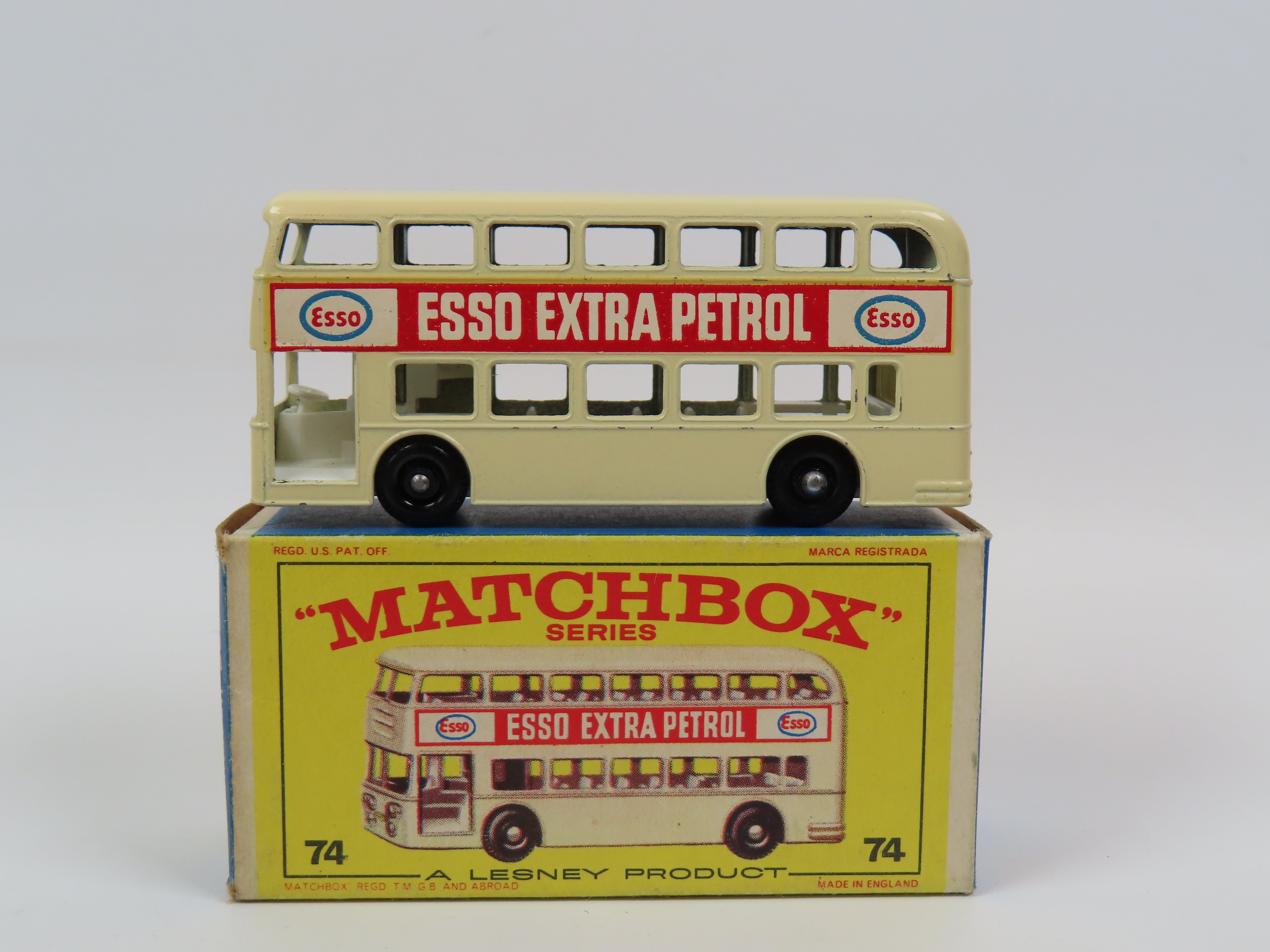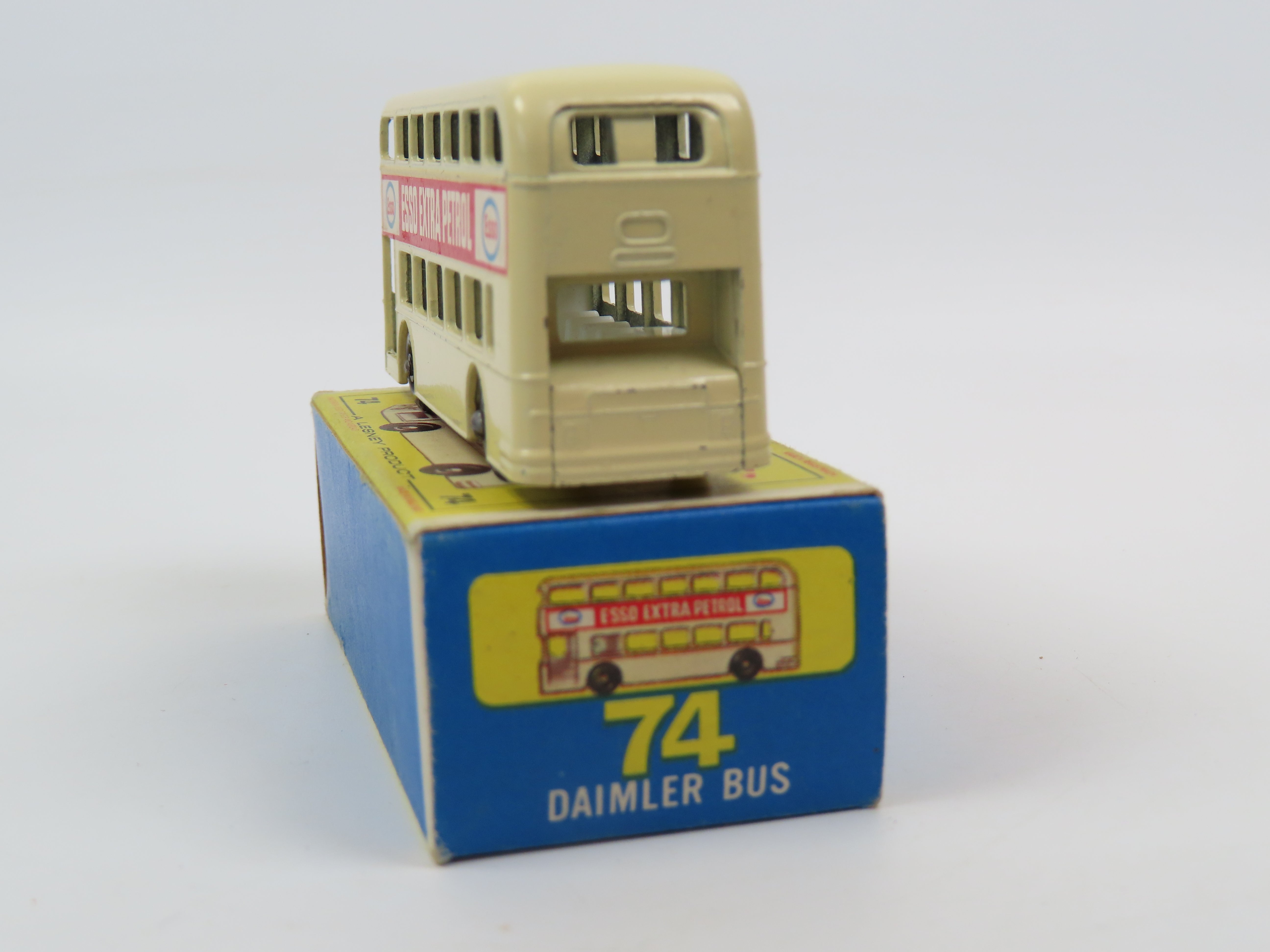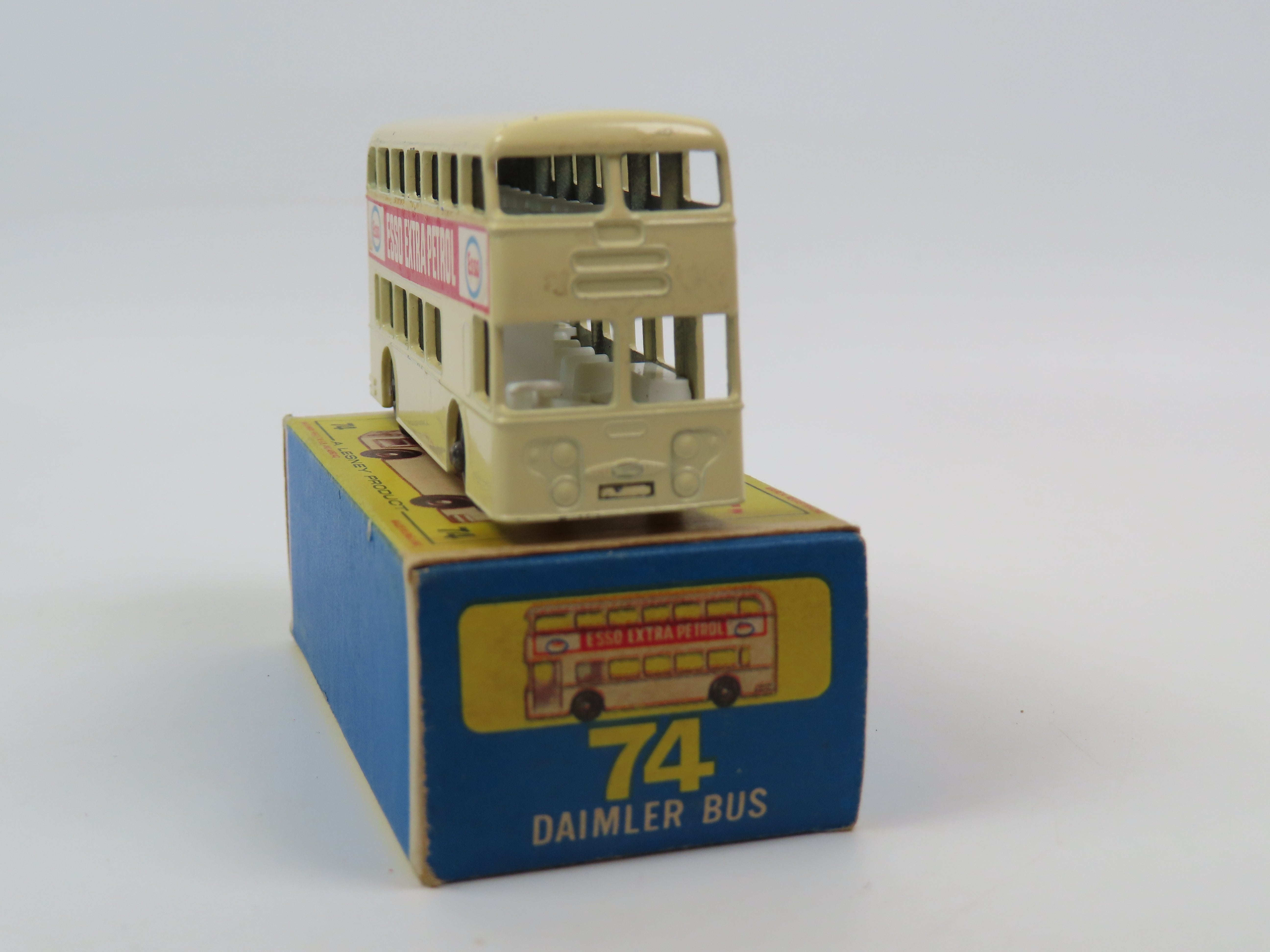 Matchbox 74 Daimler Bus in cream with 'Esso Extra Petrol' decals to each side.