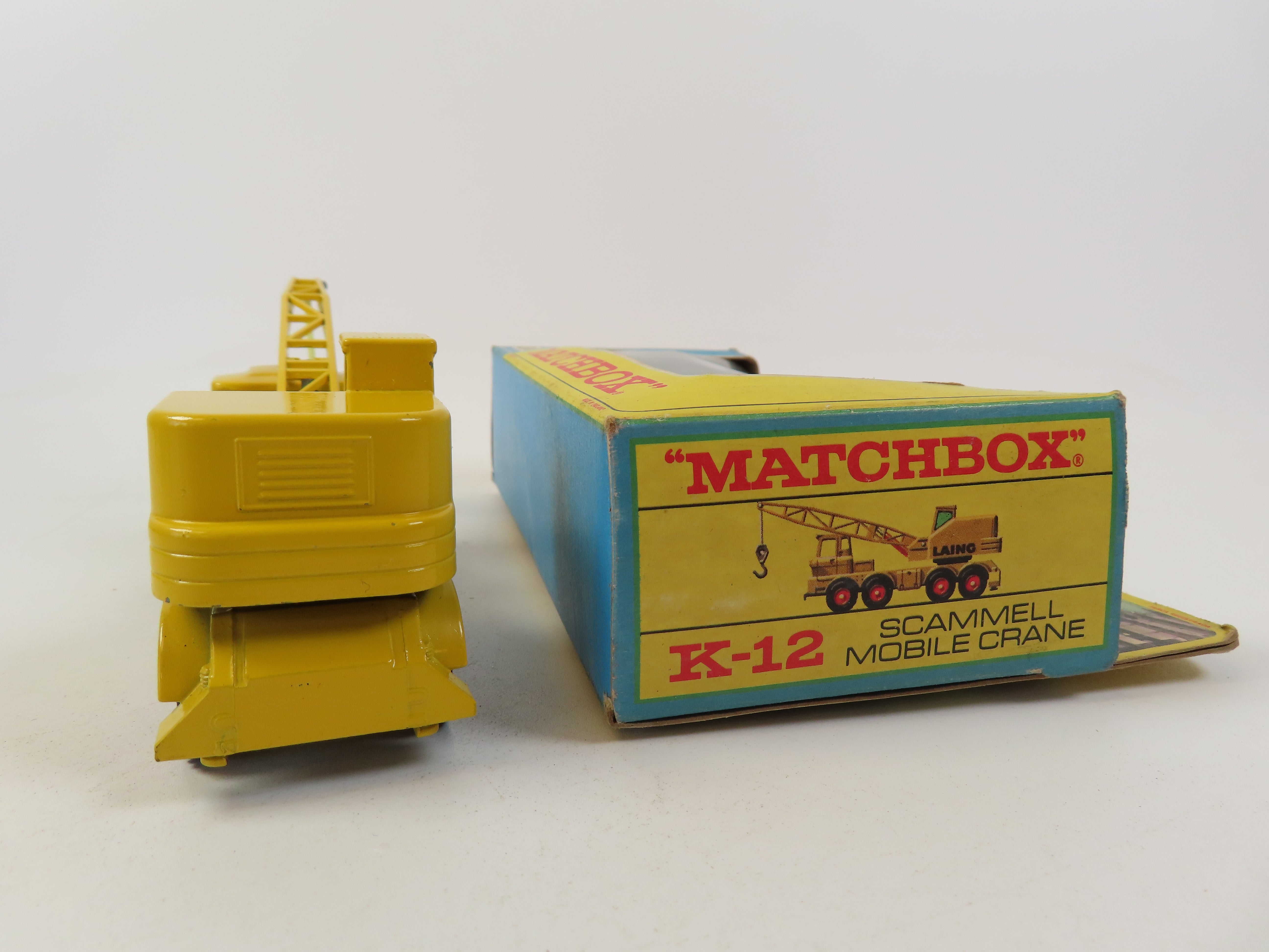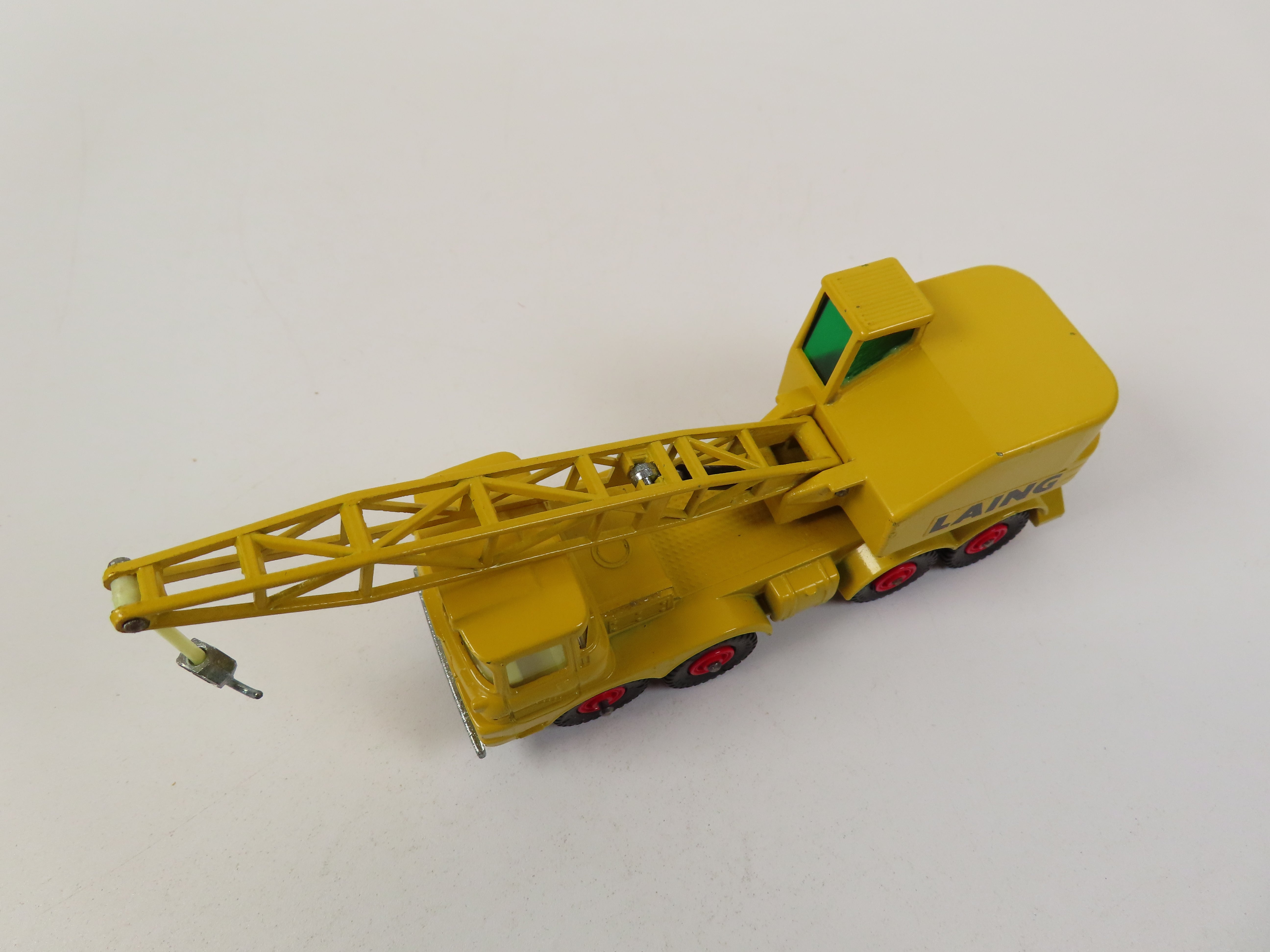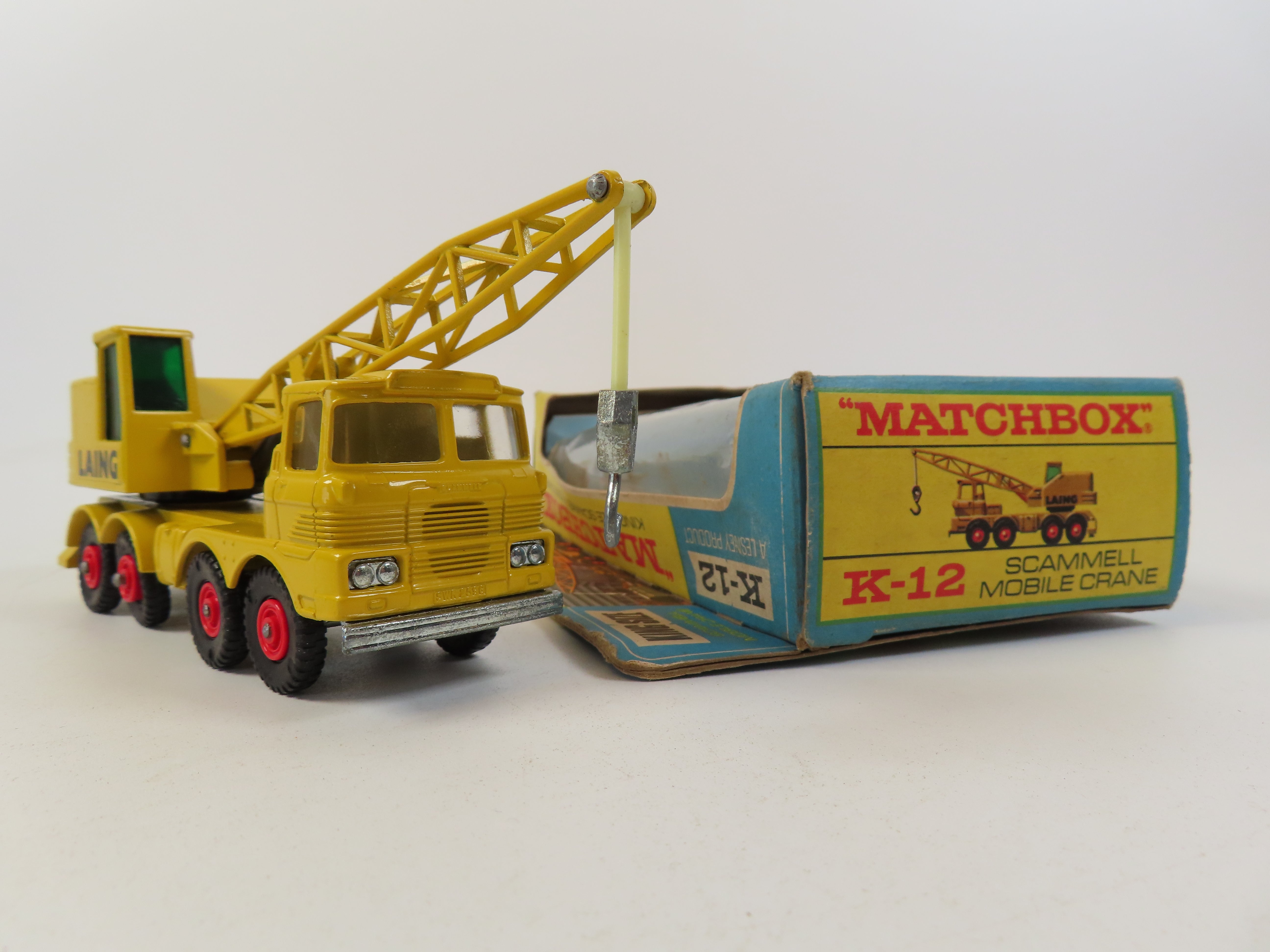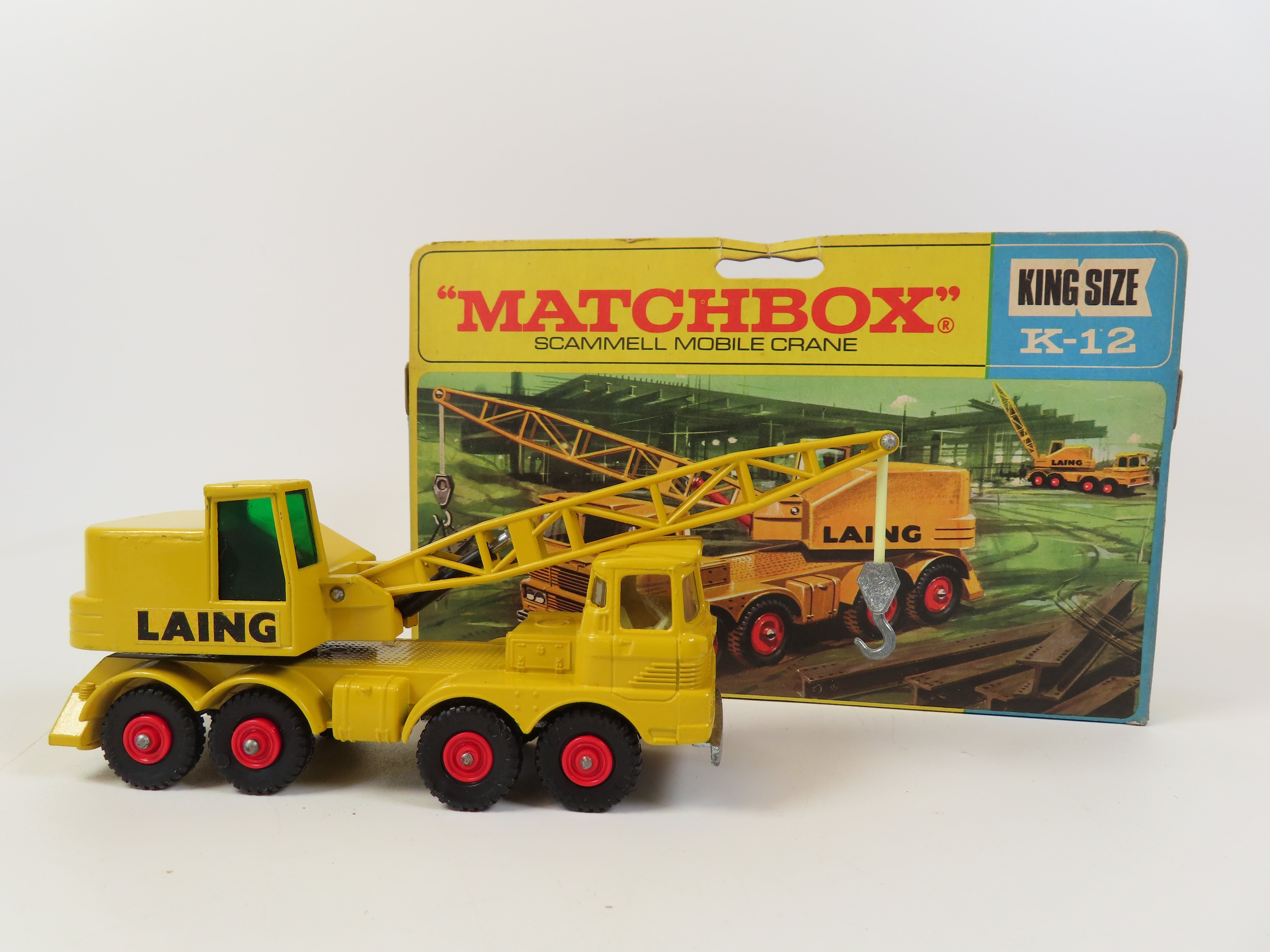 Matchbox King Size K-12 Scammell Mobile Crane in yellow, with black 'LAING' lettering to each side and green tinted windows to the cab.