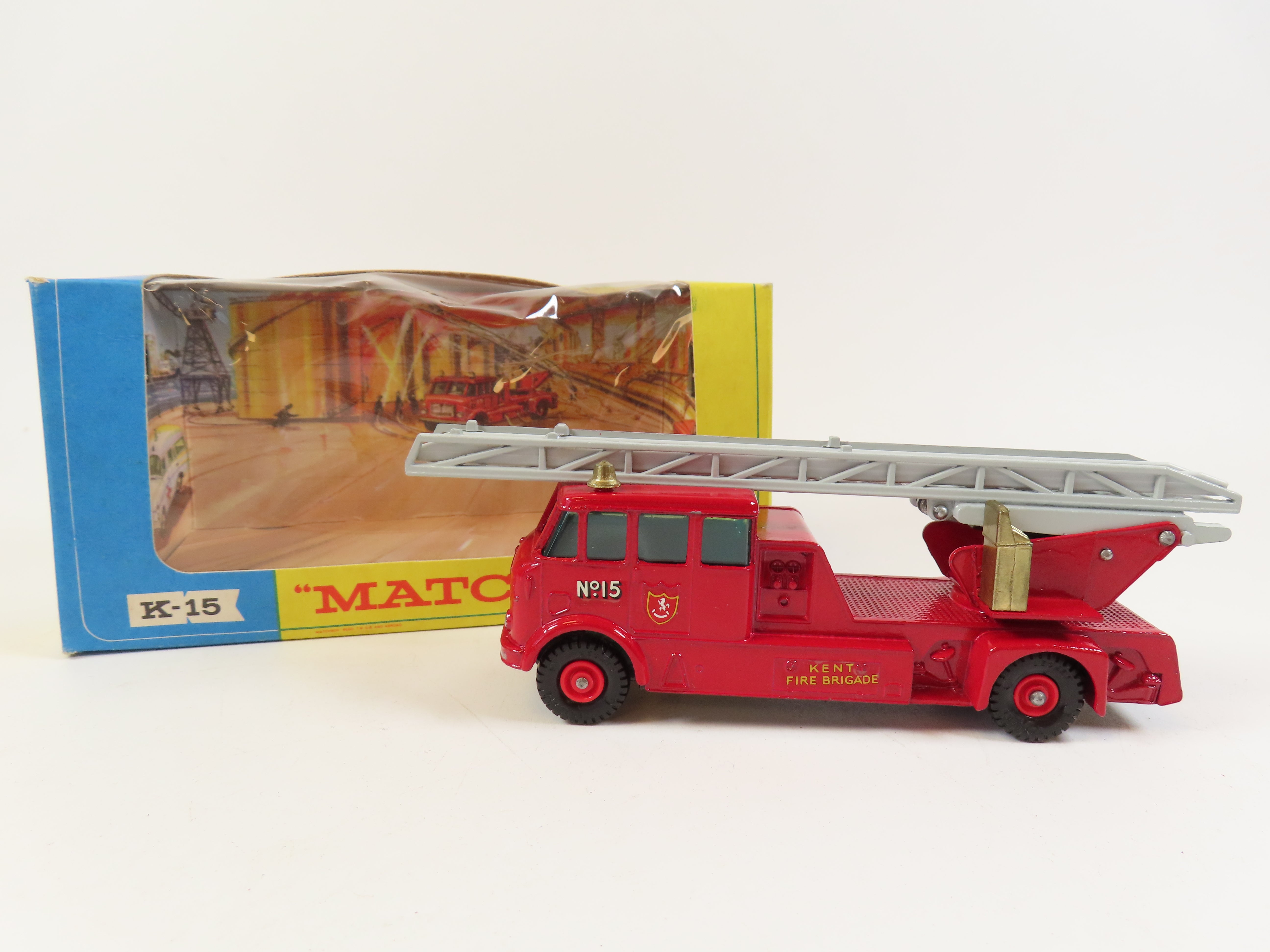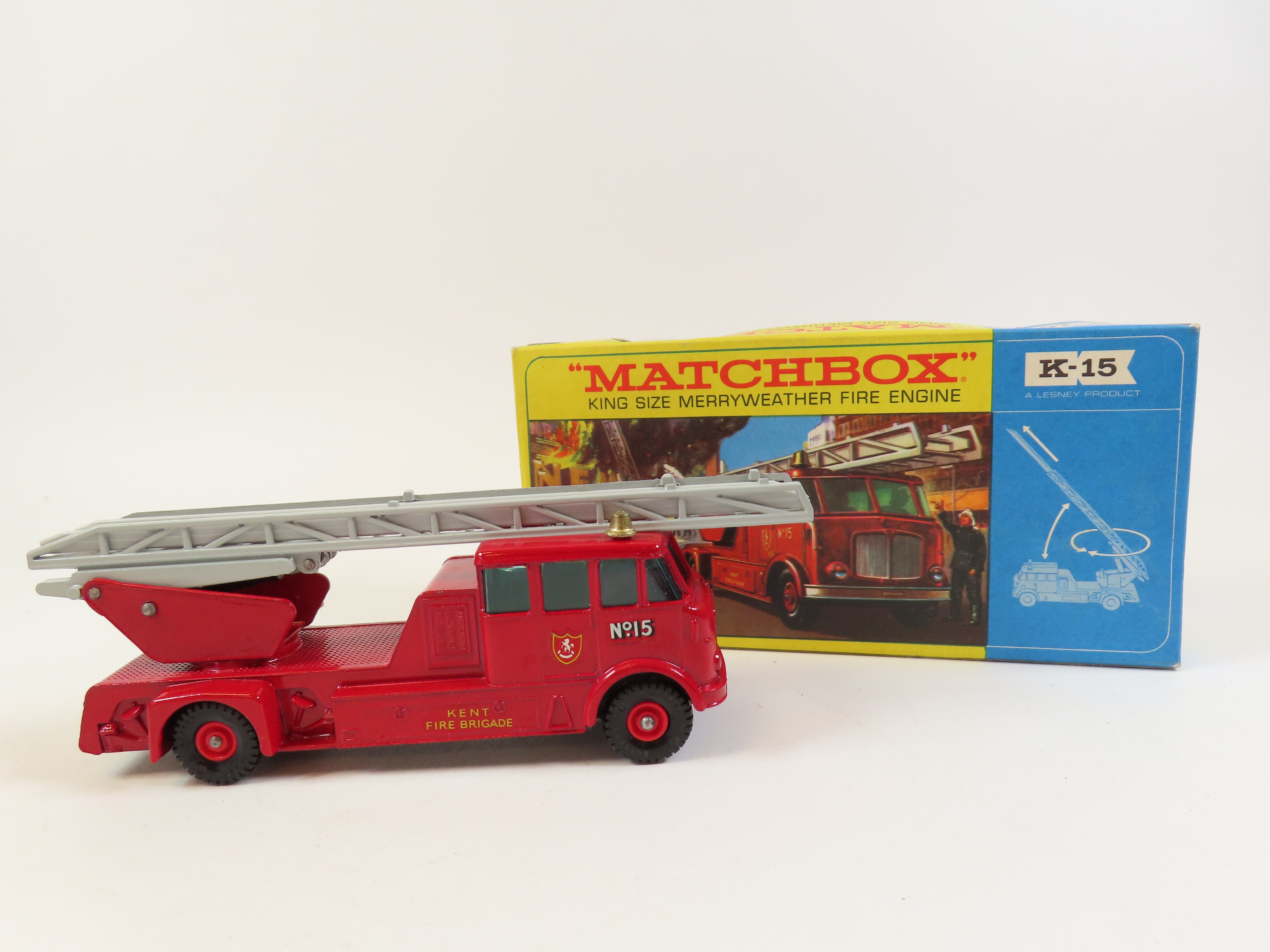 Matchbox King Size K-15 Merryweather Fire Engine in red,with blue tinted windows, gold detailing, grey ladder to the roof and 'Kent Fire Brigade' and No.15 decals to each side.