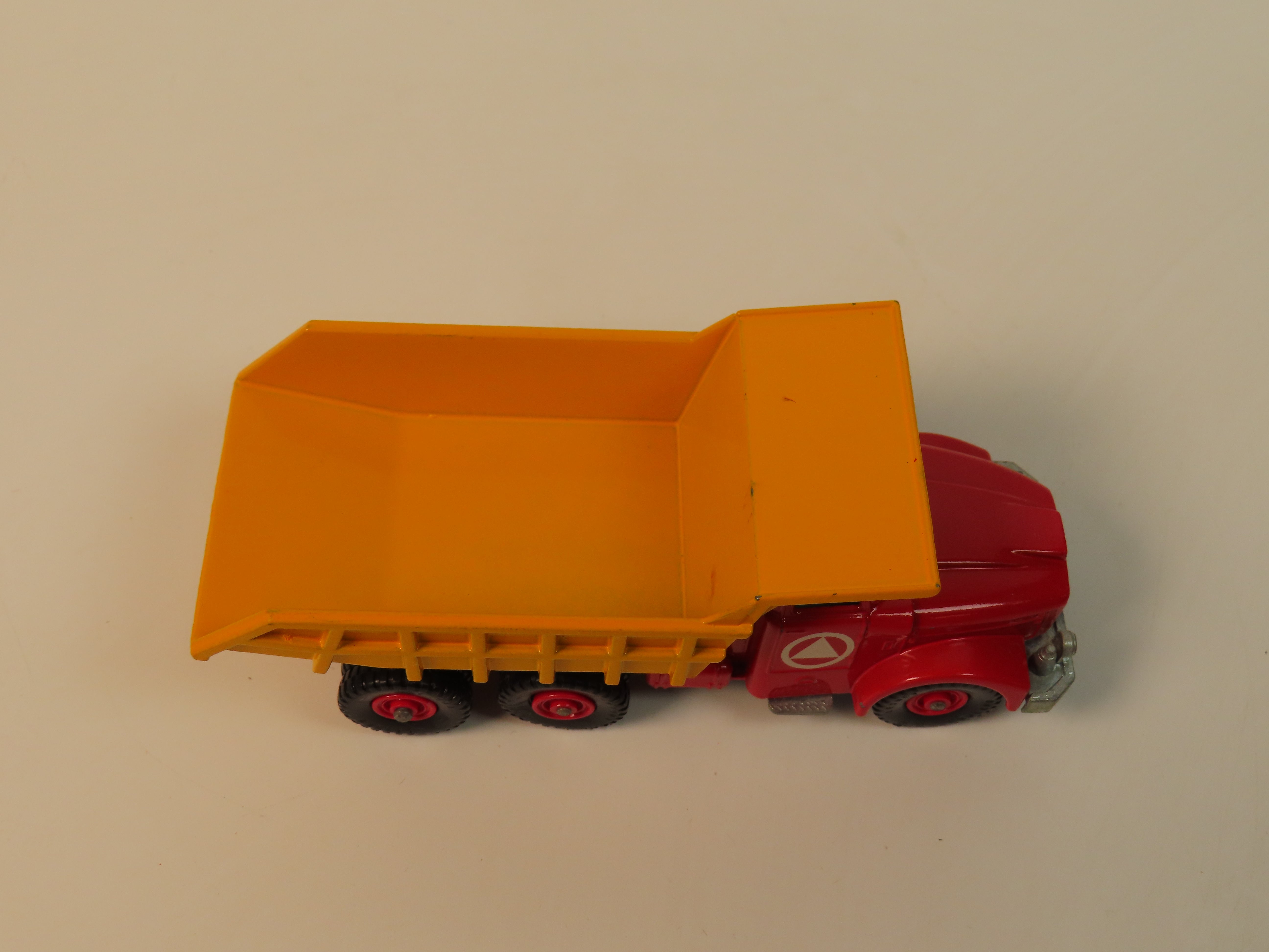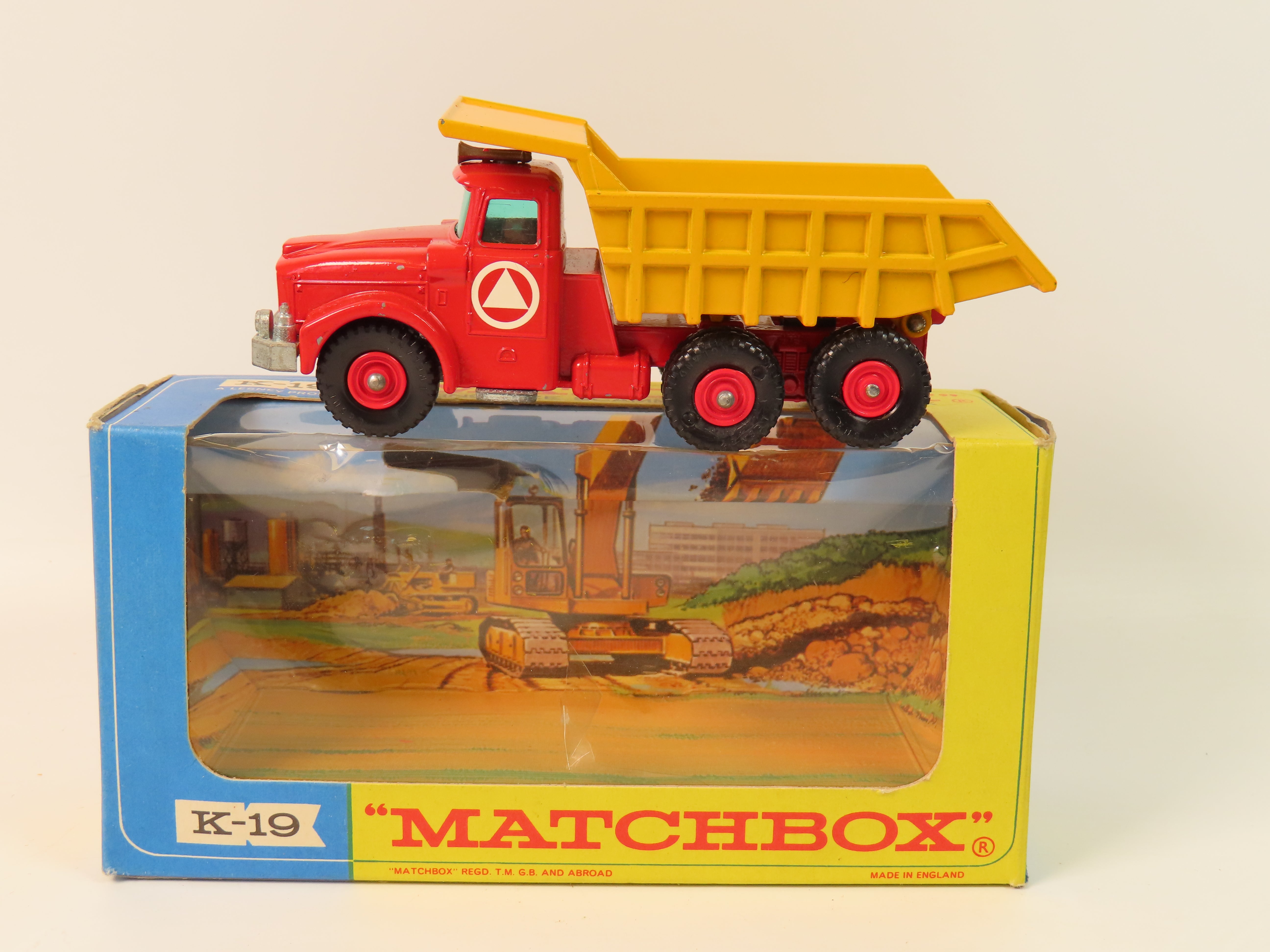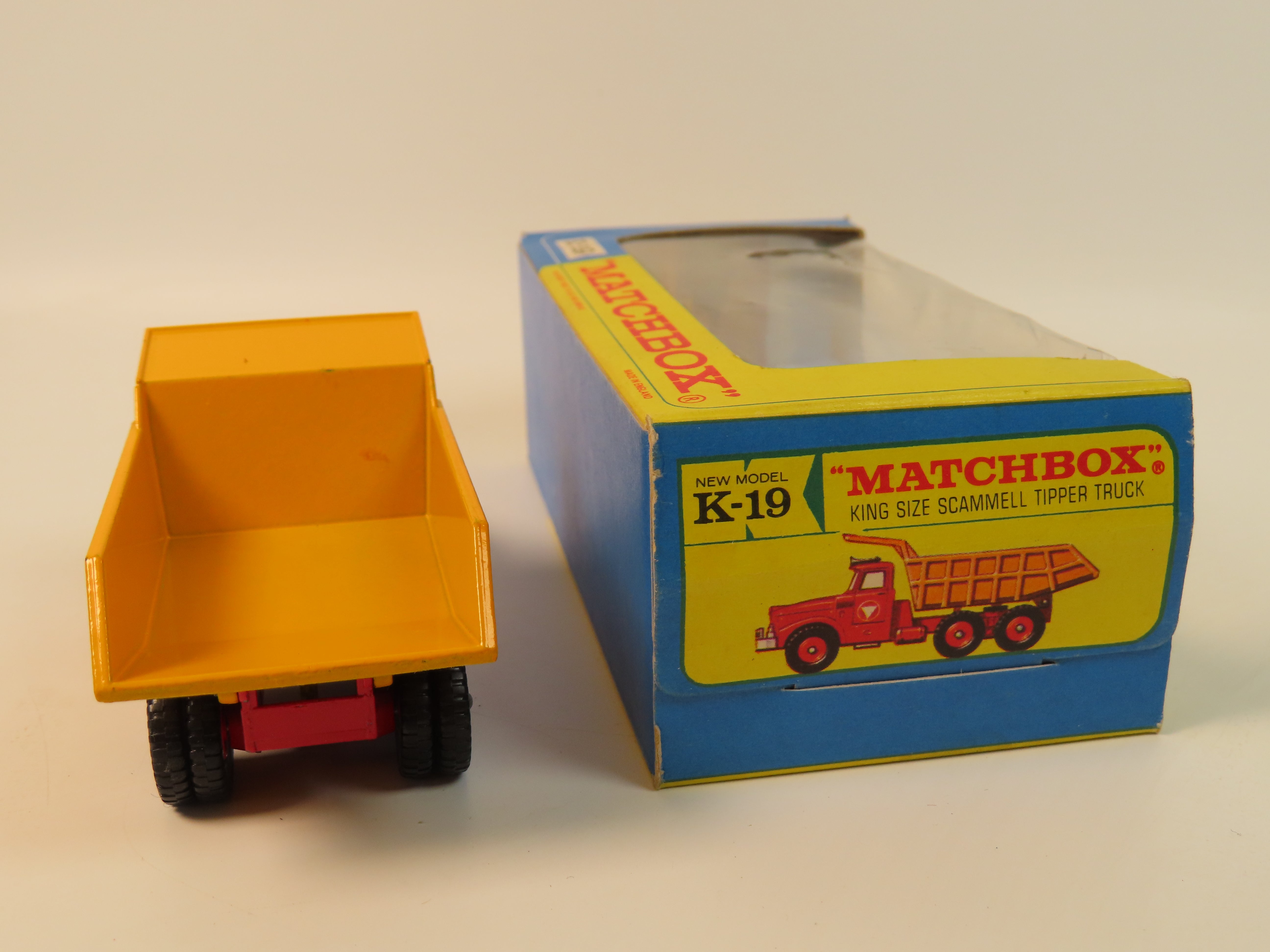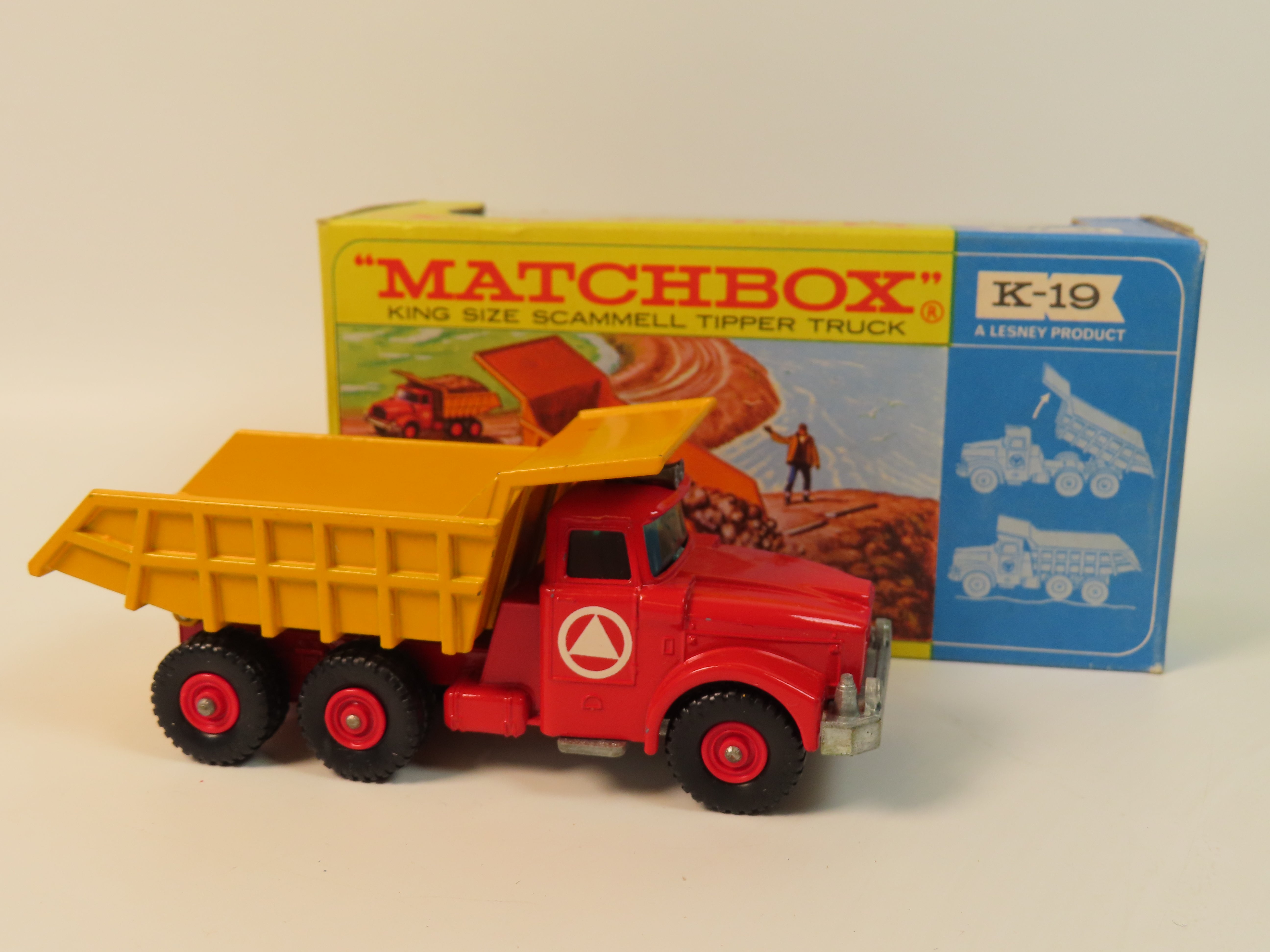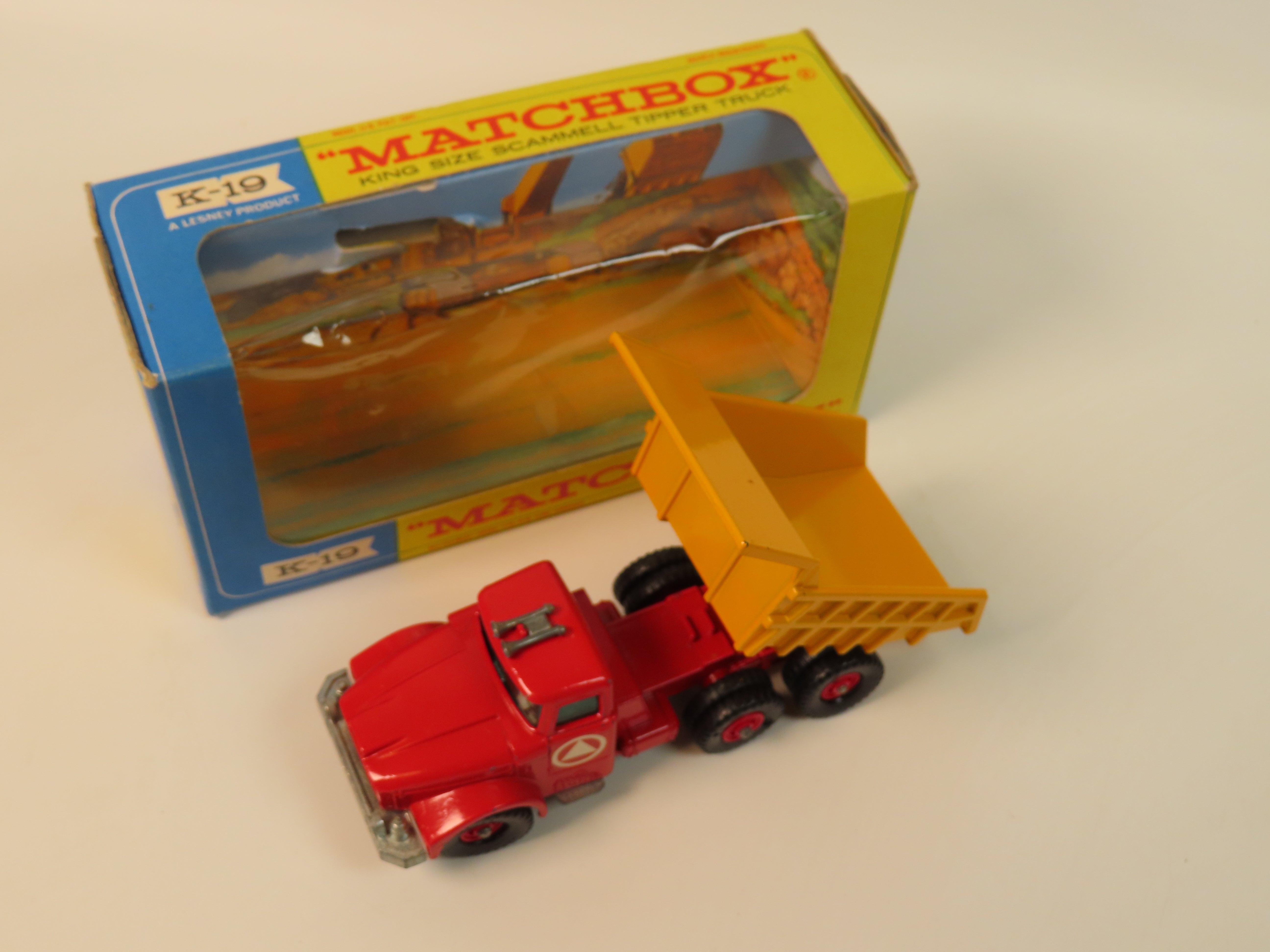 Matchbox King Size K-19 Scammell Tipper Truck with a red chassis, red plastic hubs, yellow tipper and blue tinted windows. Complete with decals to each side.