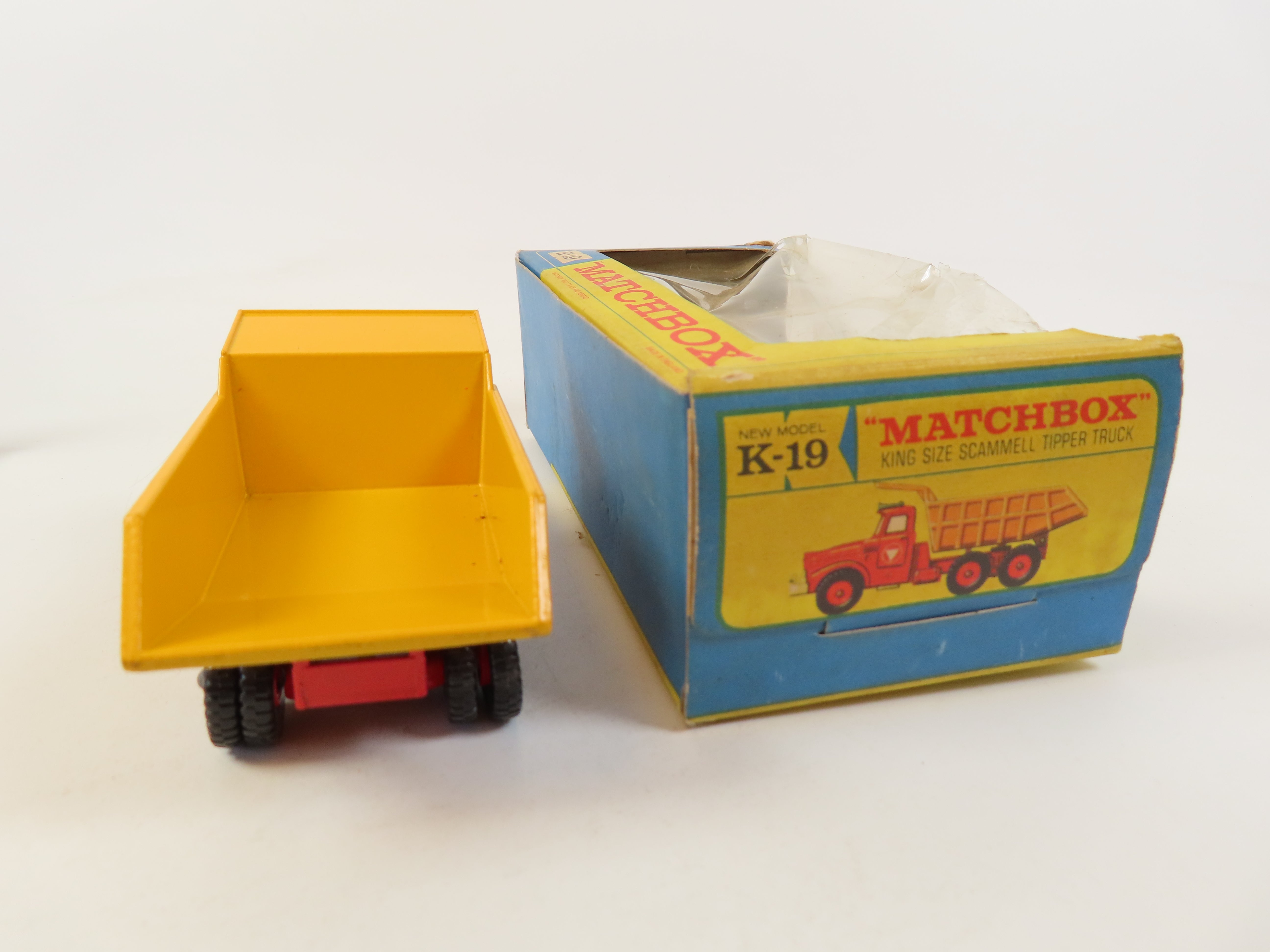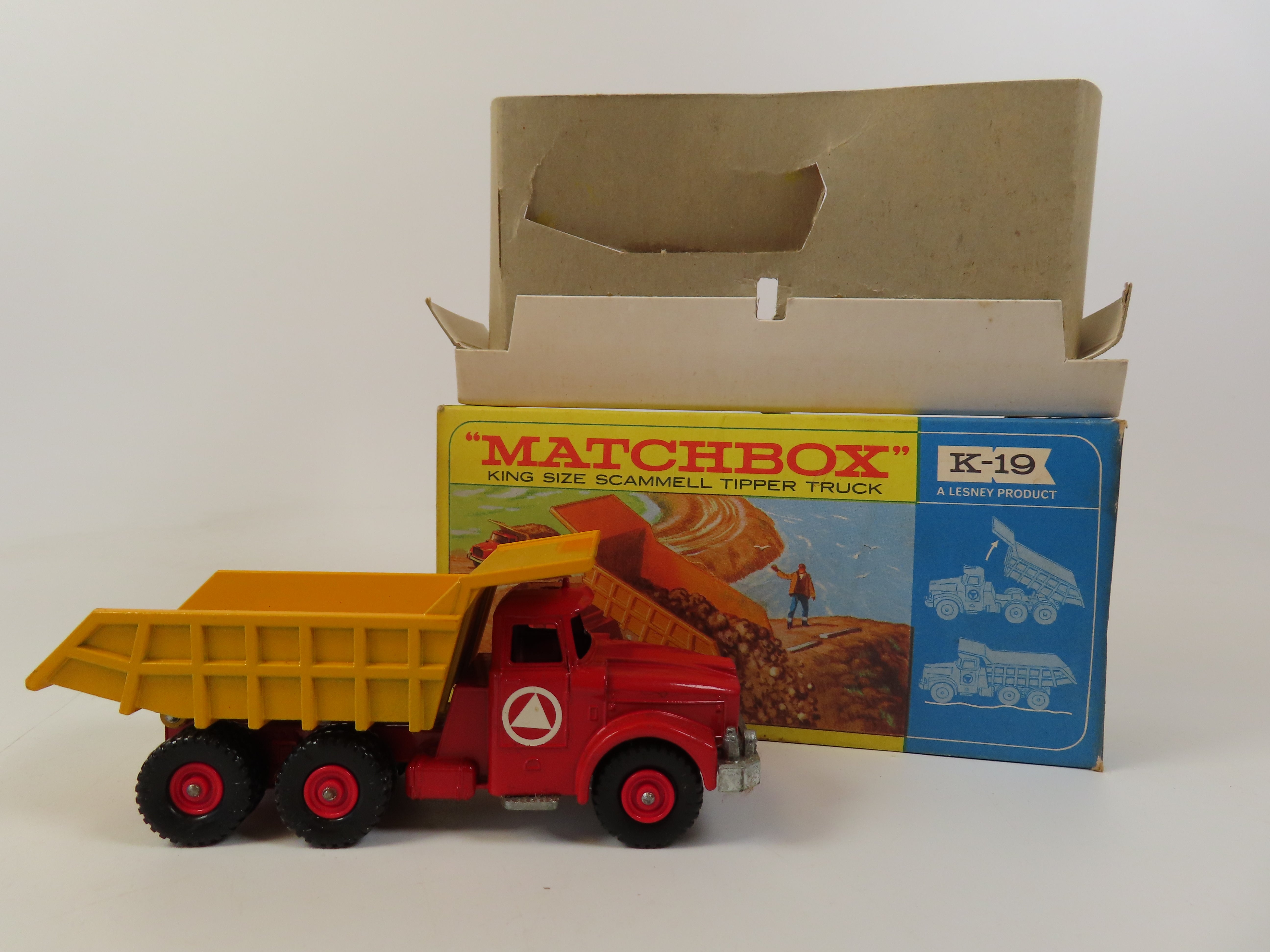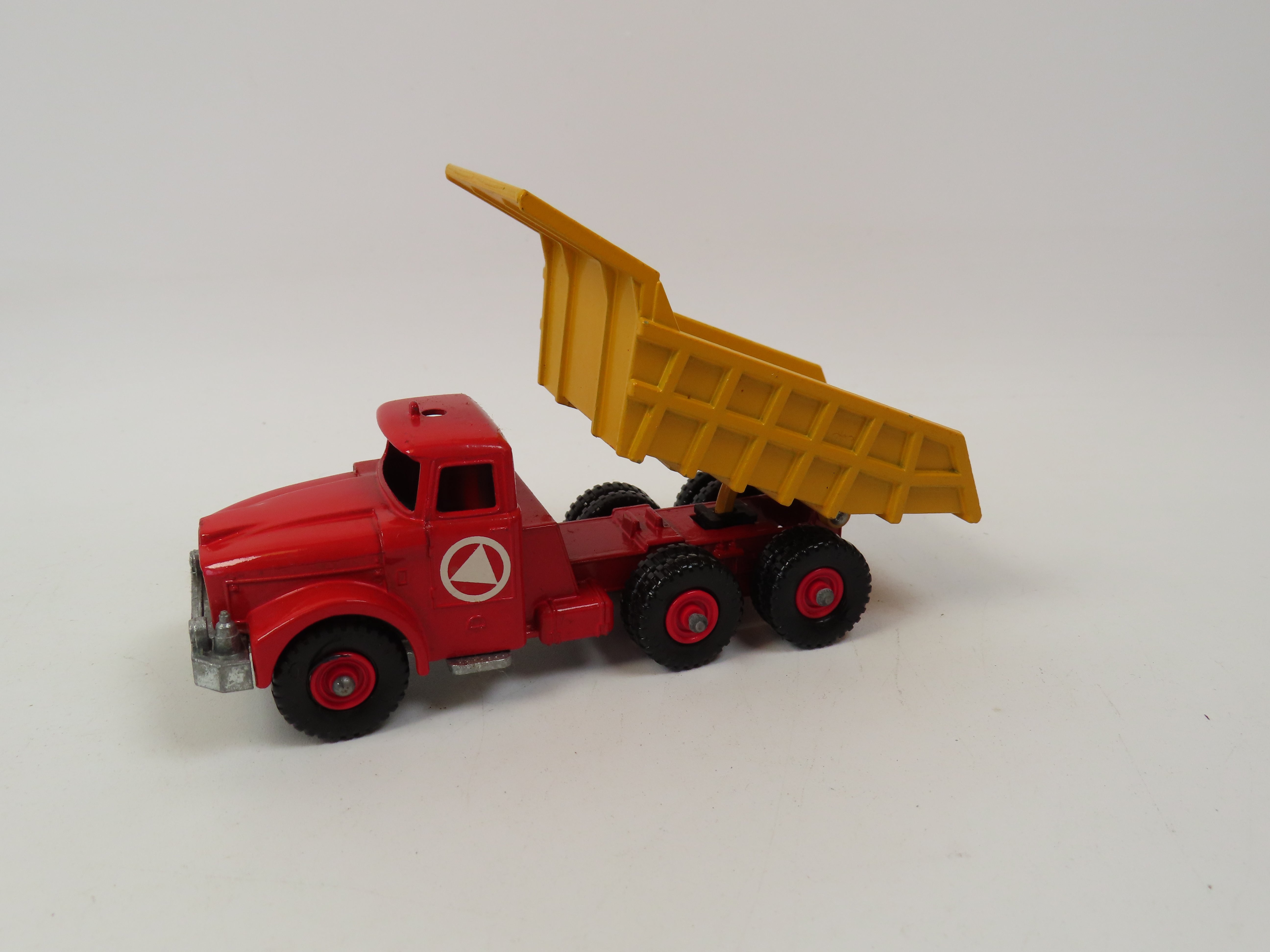Matchbox King Size K-19 Scammell Tipper Truck with red cab with decals to each side, red painted hubs and yellow tipper.
