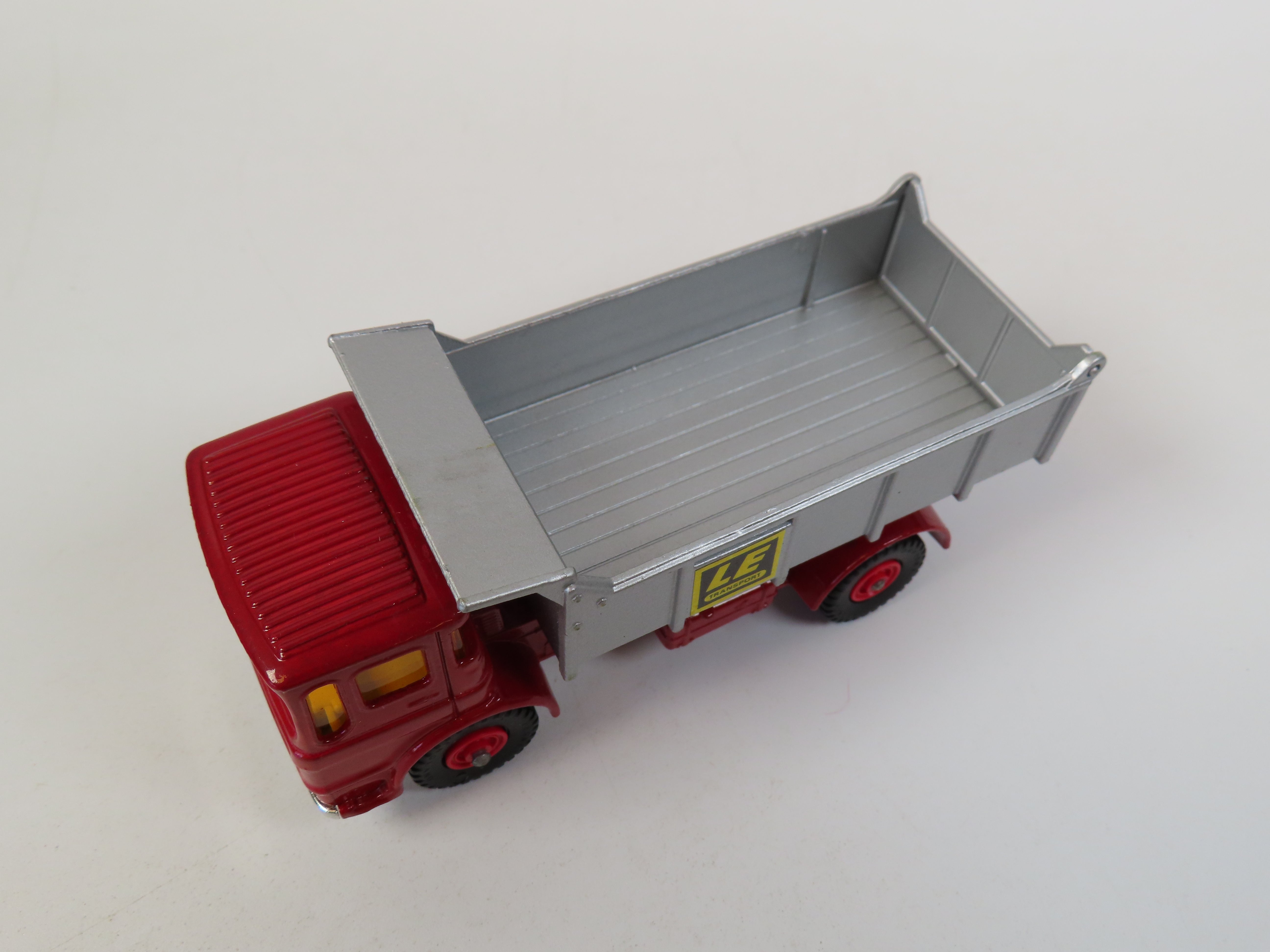 Matchbox King Size K-4 Leyland Tipper Truck, with a red cab and chassis, silver tipper with 'LE Transport' decals to the sides and amber tinted windows.