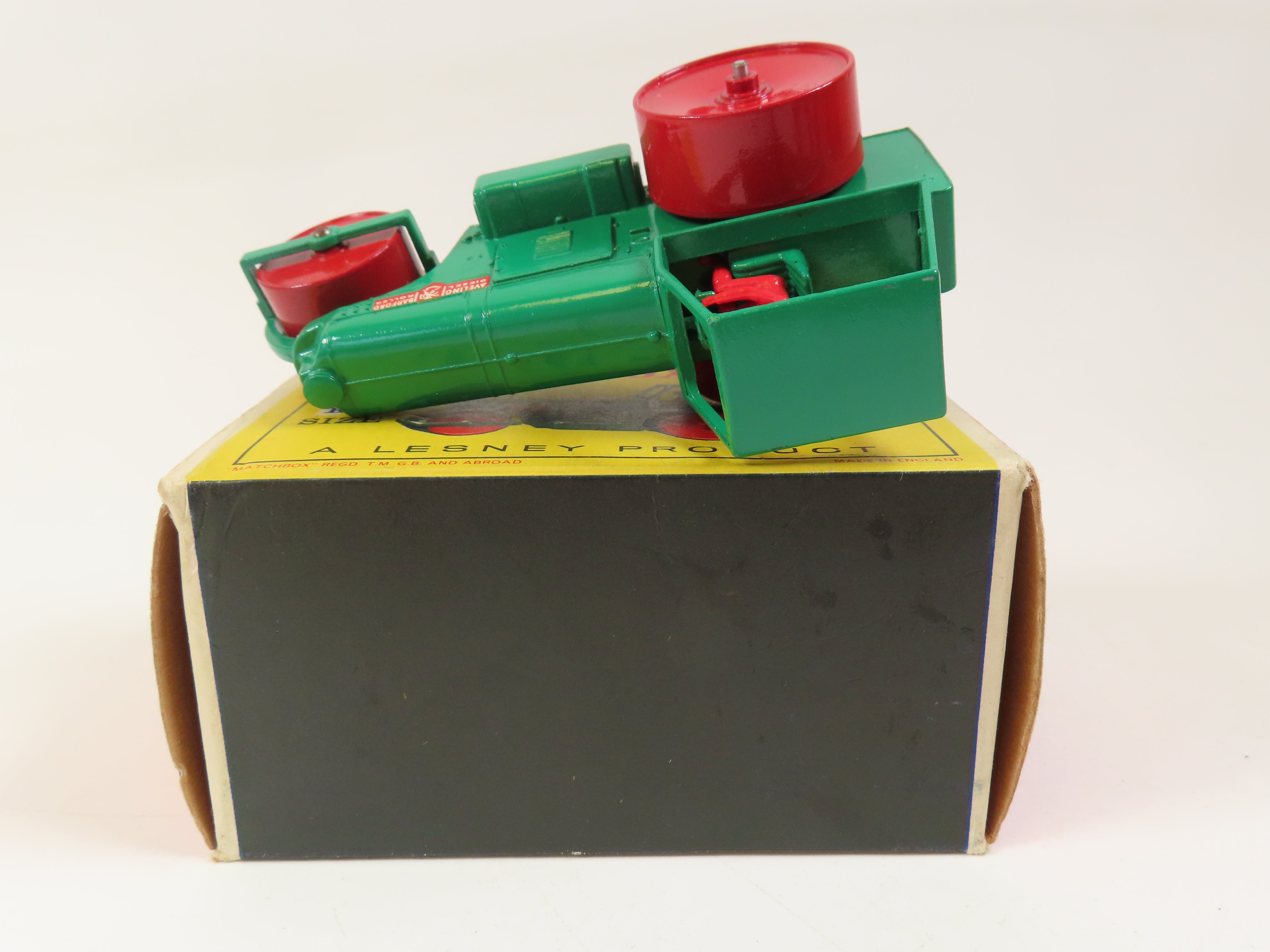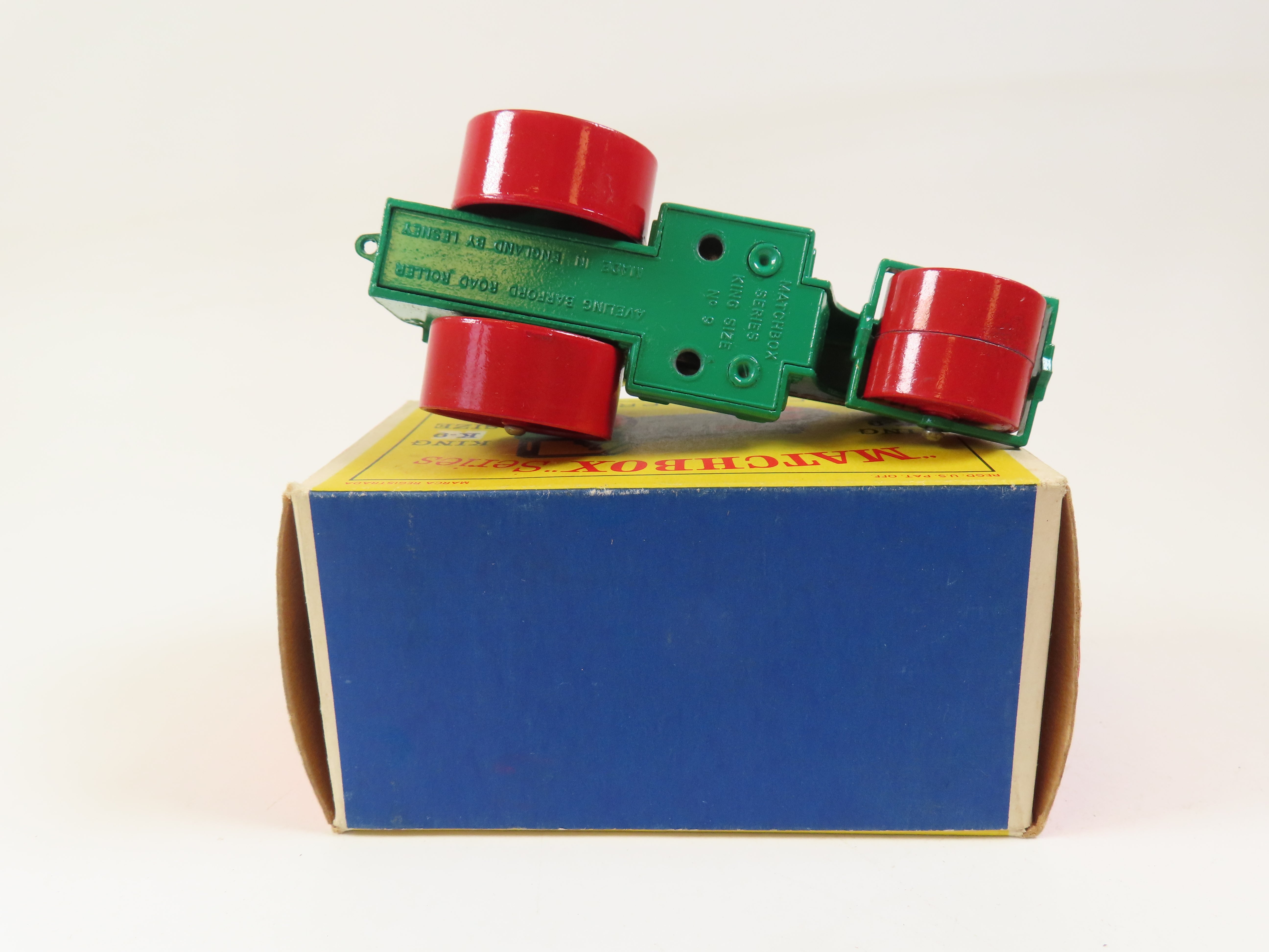 Matchbox King Size K-9 Aveling-Barford Road Roller in bright green, with red rollers & driver figure and 'Aveling-Barford' decals to each side.