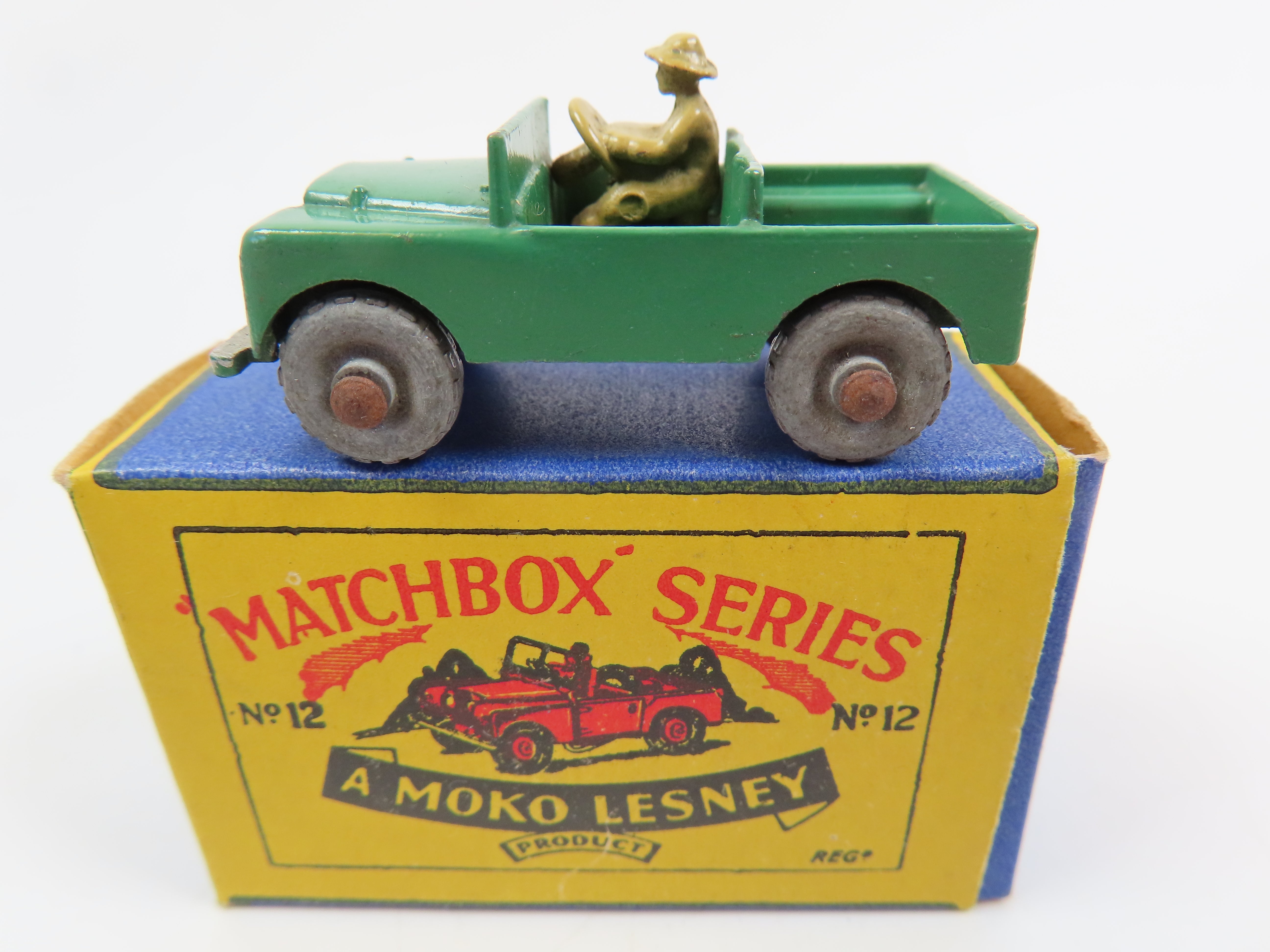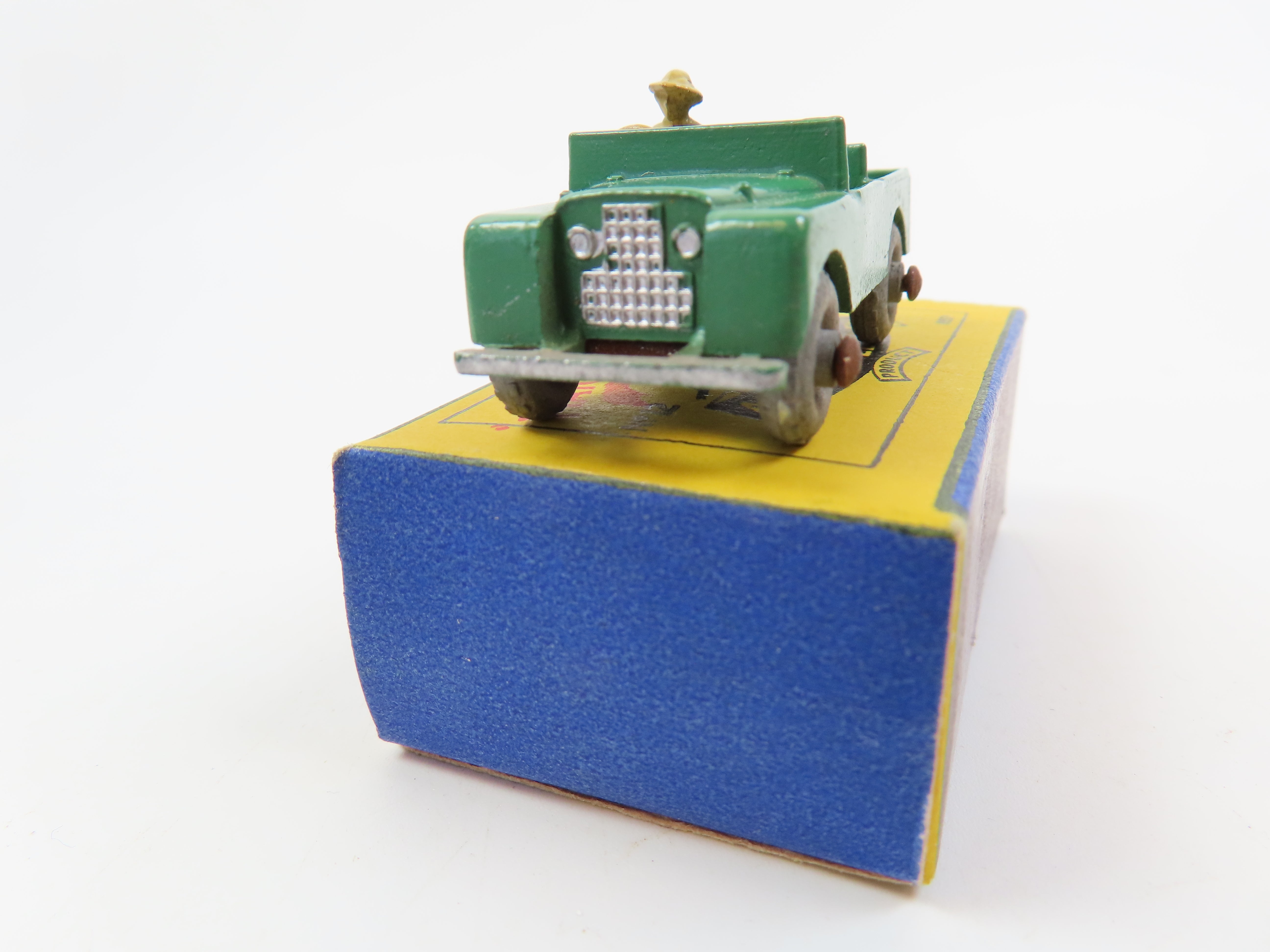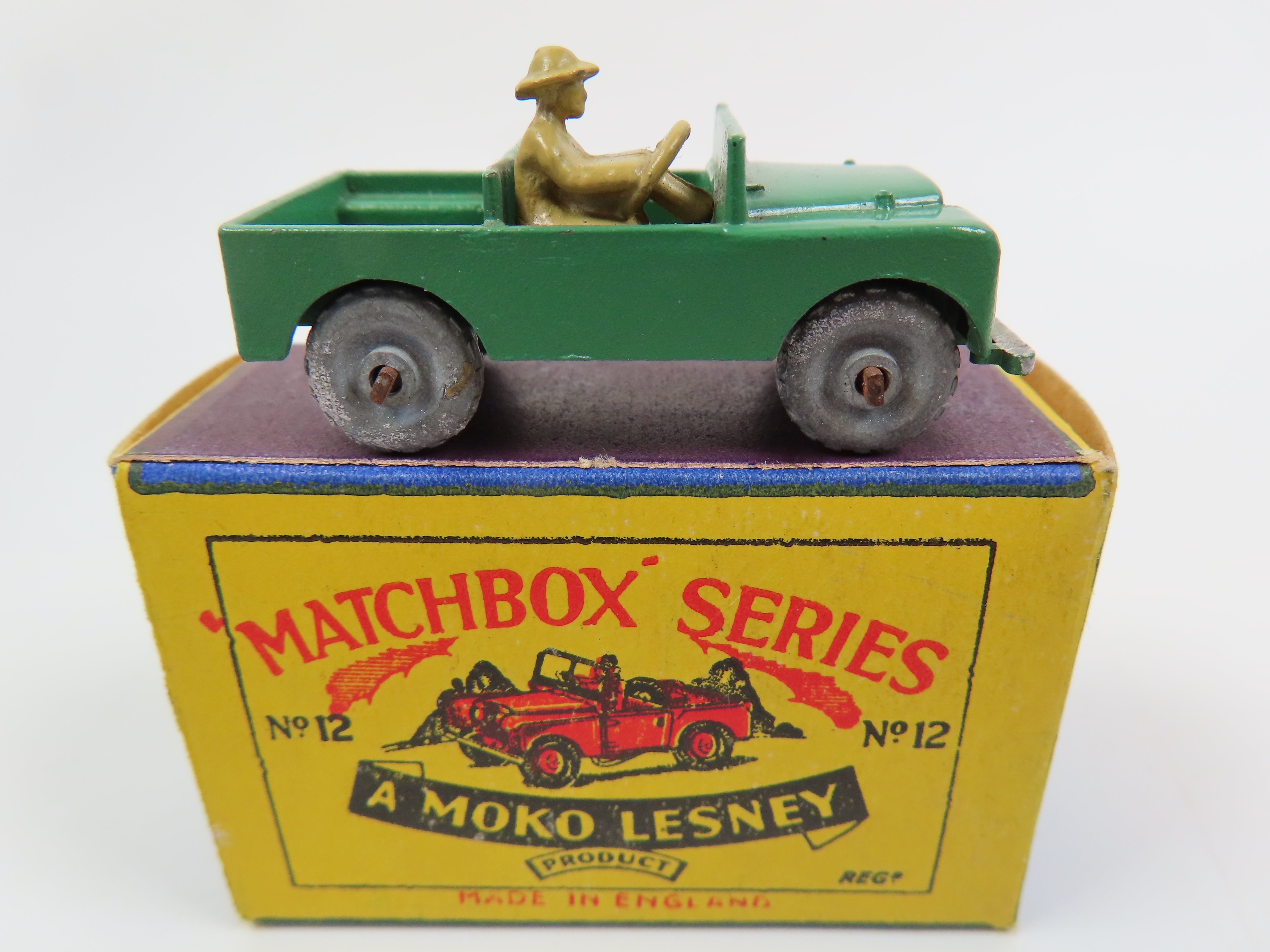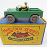 Matchbox Lesney 12 Land Rover in green with tan driver and silver grille.