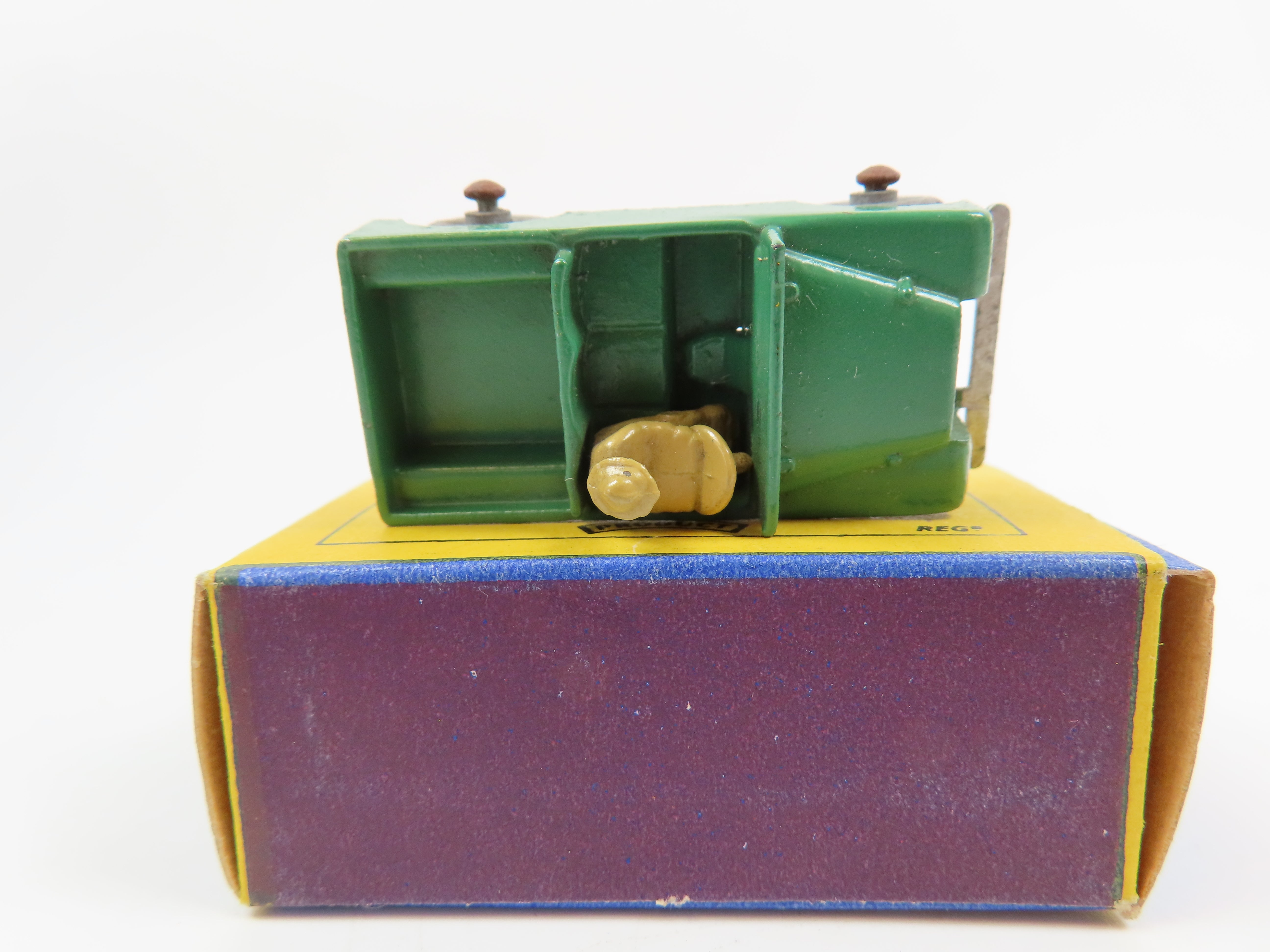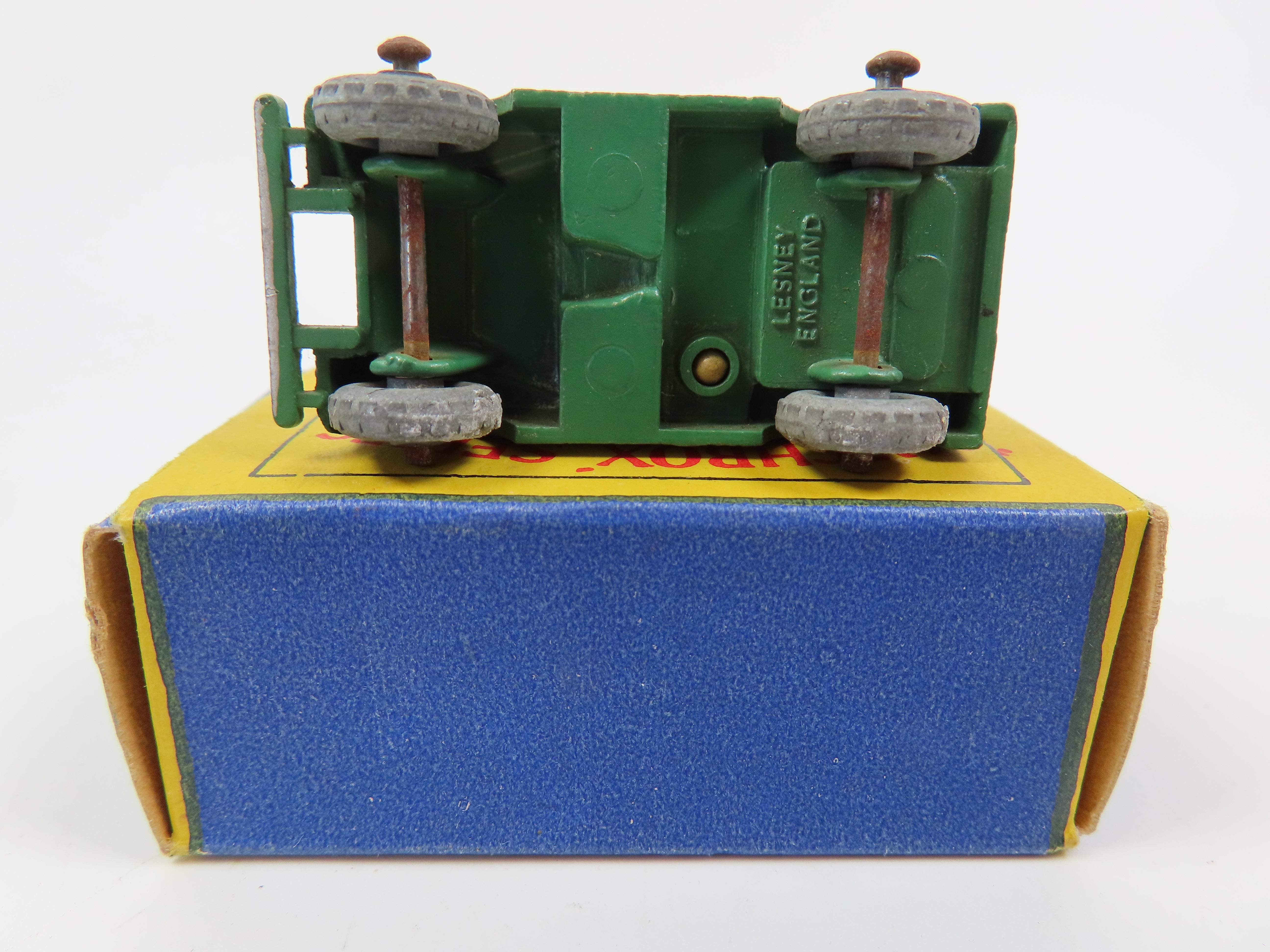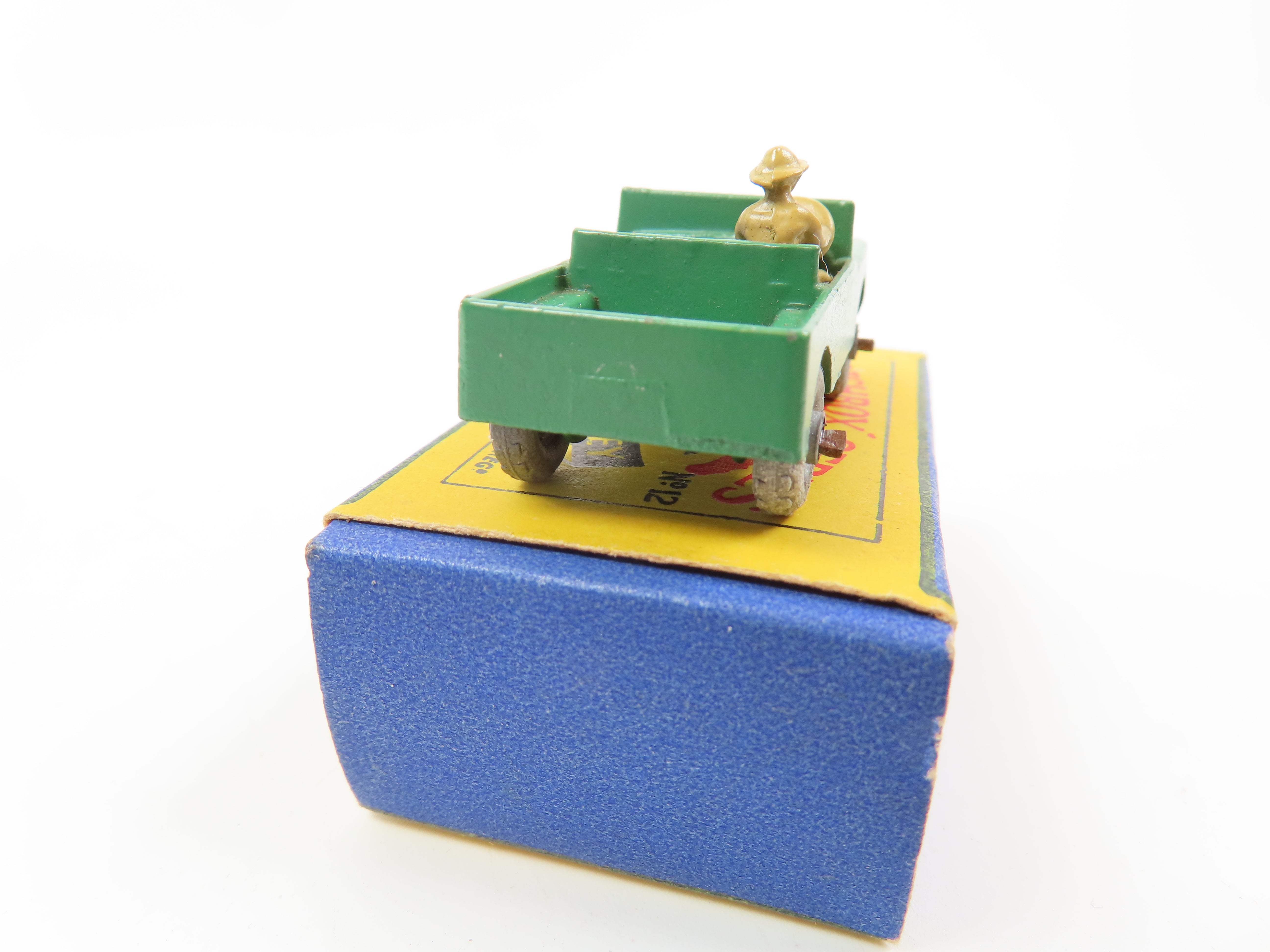Matchbox Lesney 12 Land Rover in green with tan driver and silver grille.