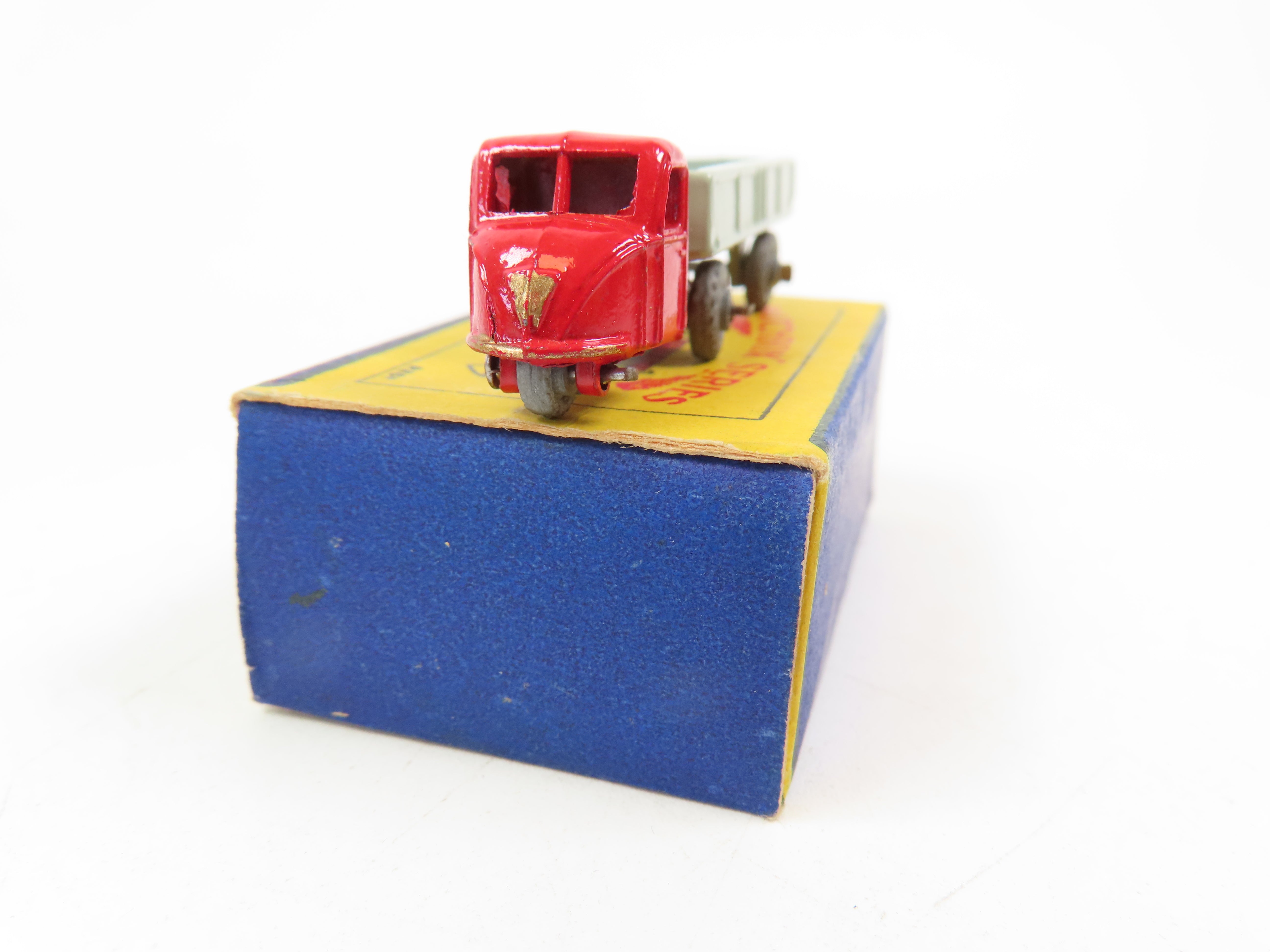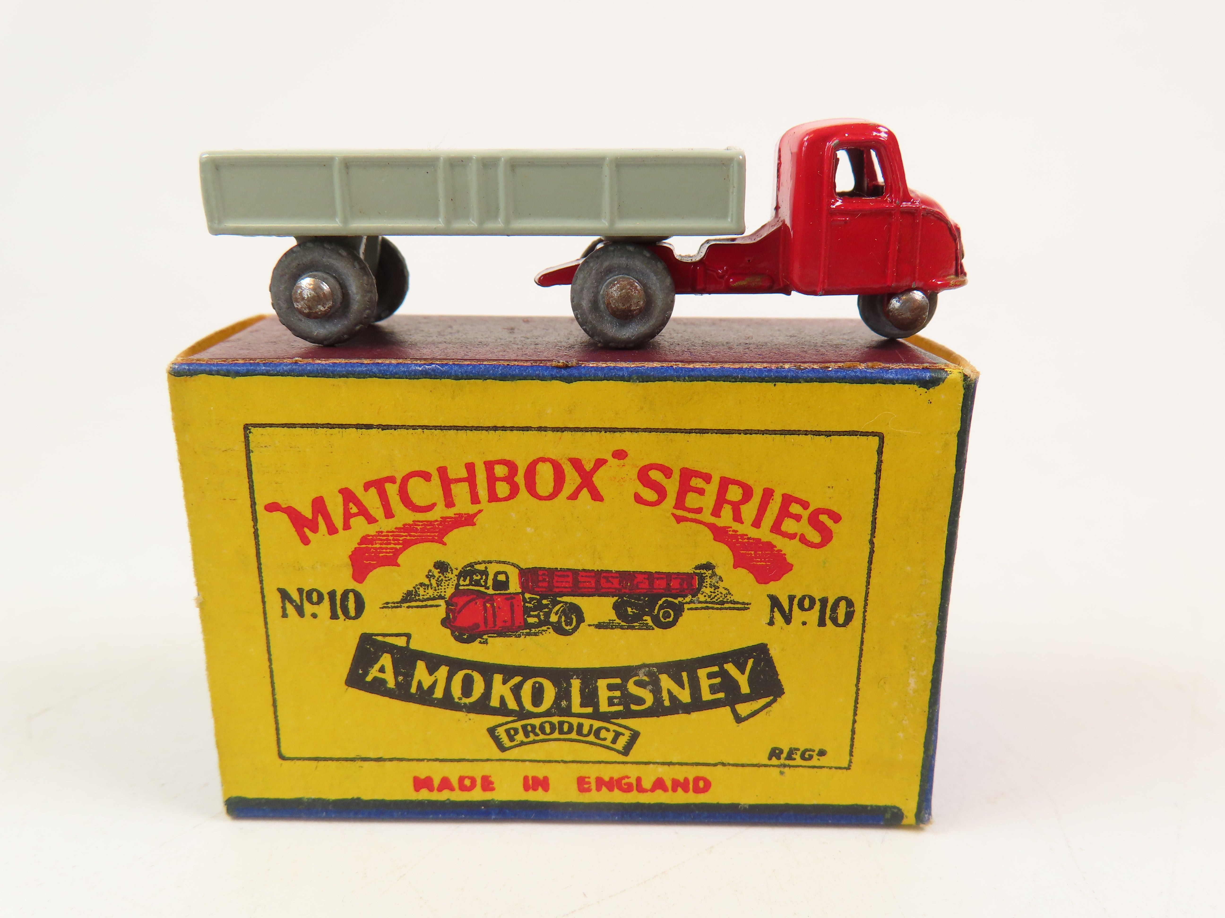 Matchbox No.10 Mechanical Horse & Trailer with a red cab, with gold painted detailing, grey trailer and metal wheels.