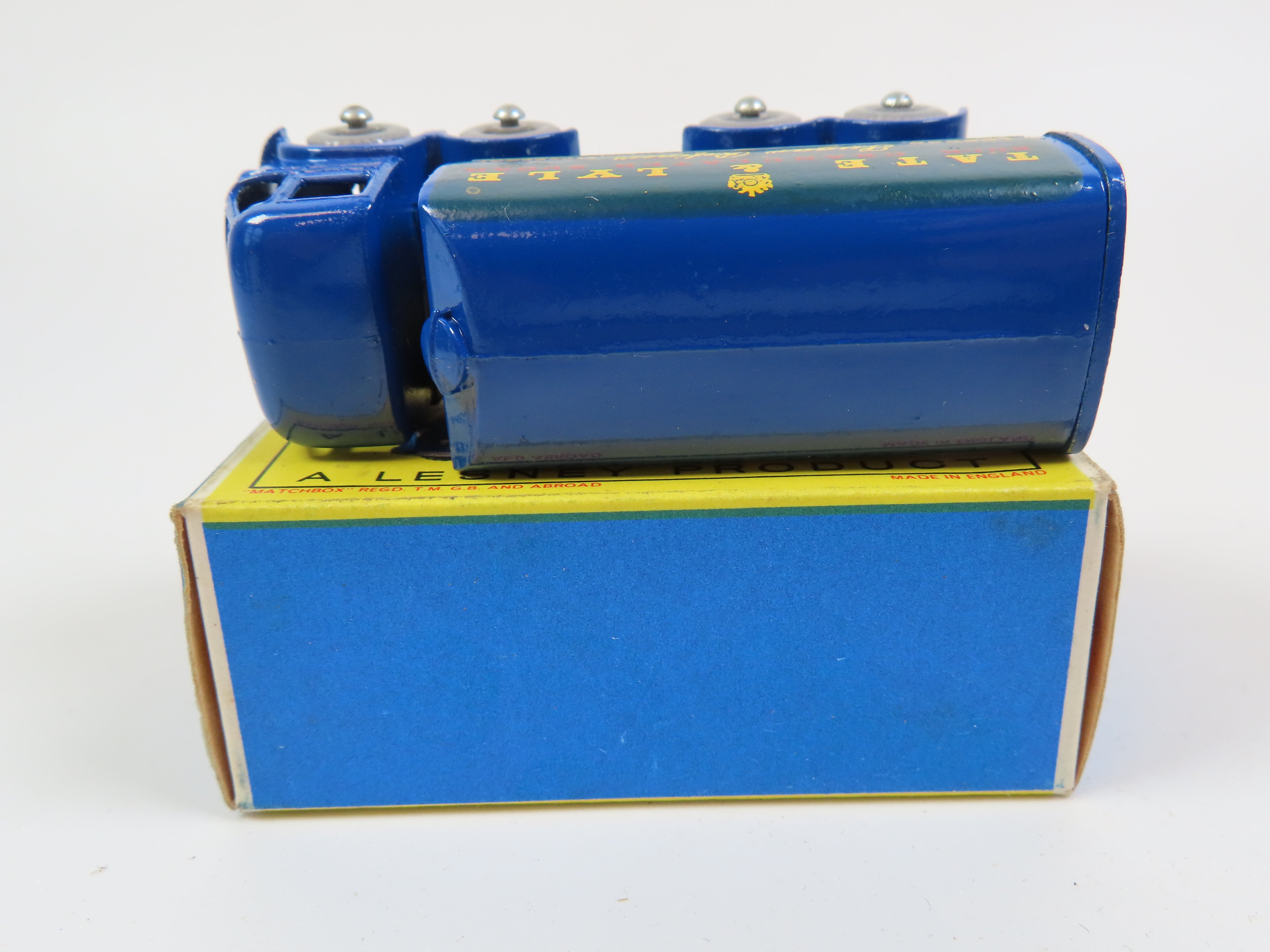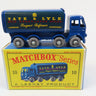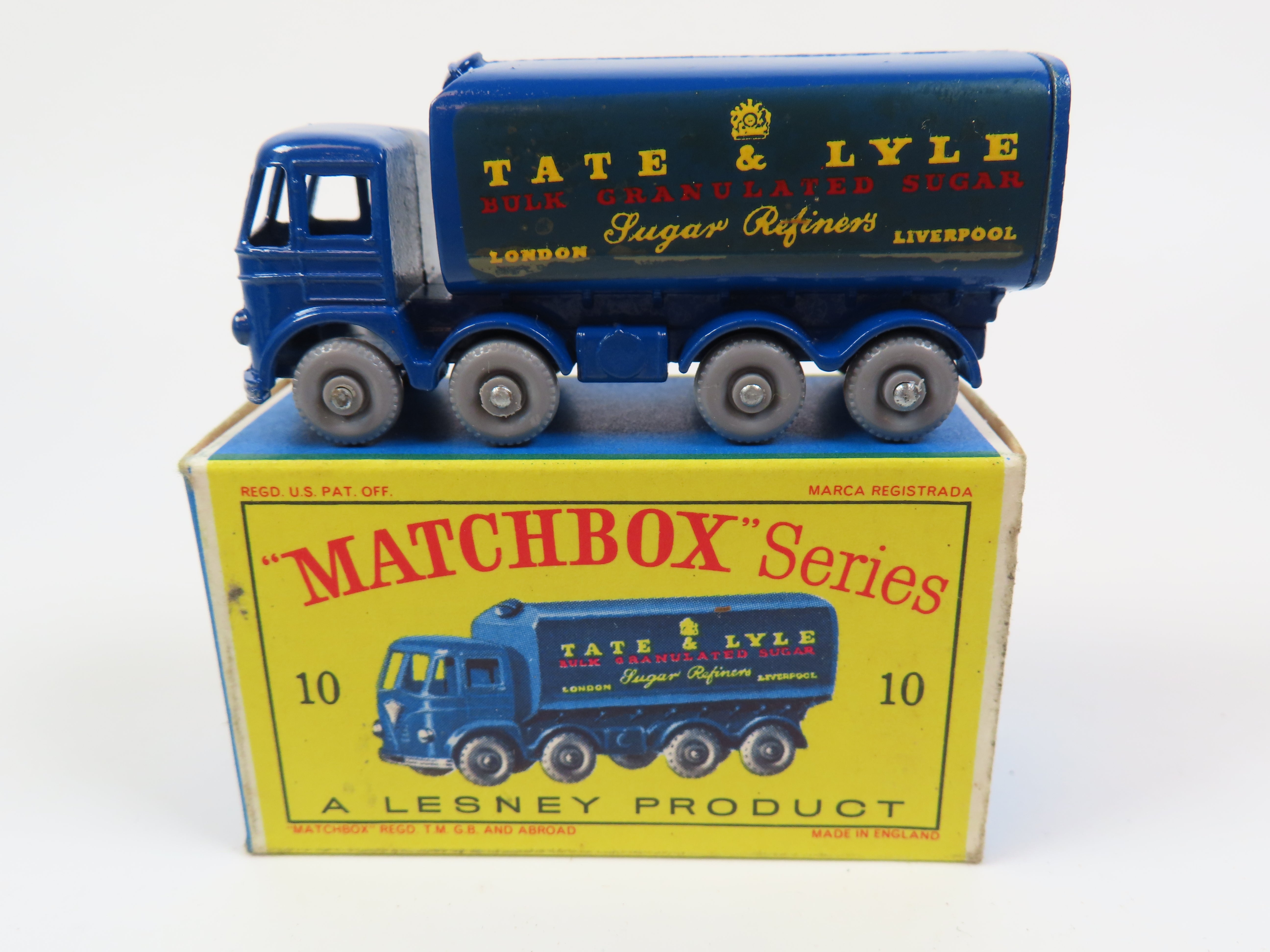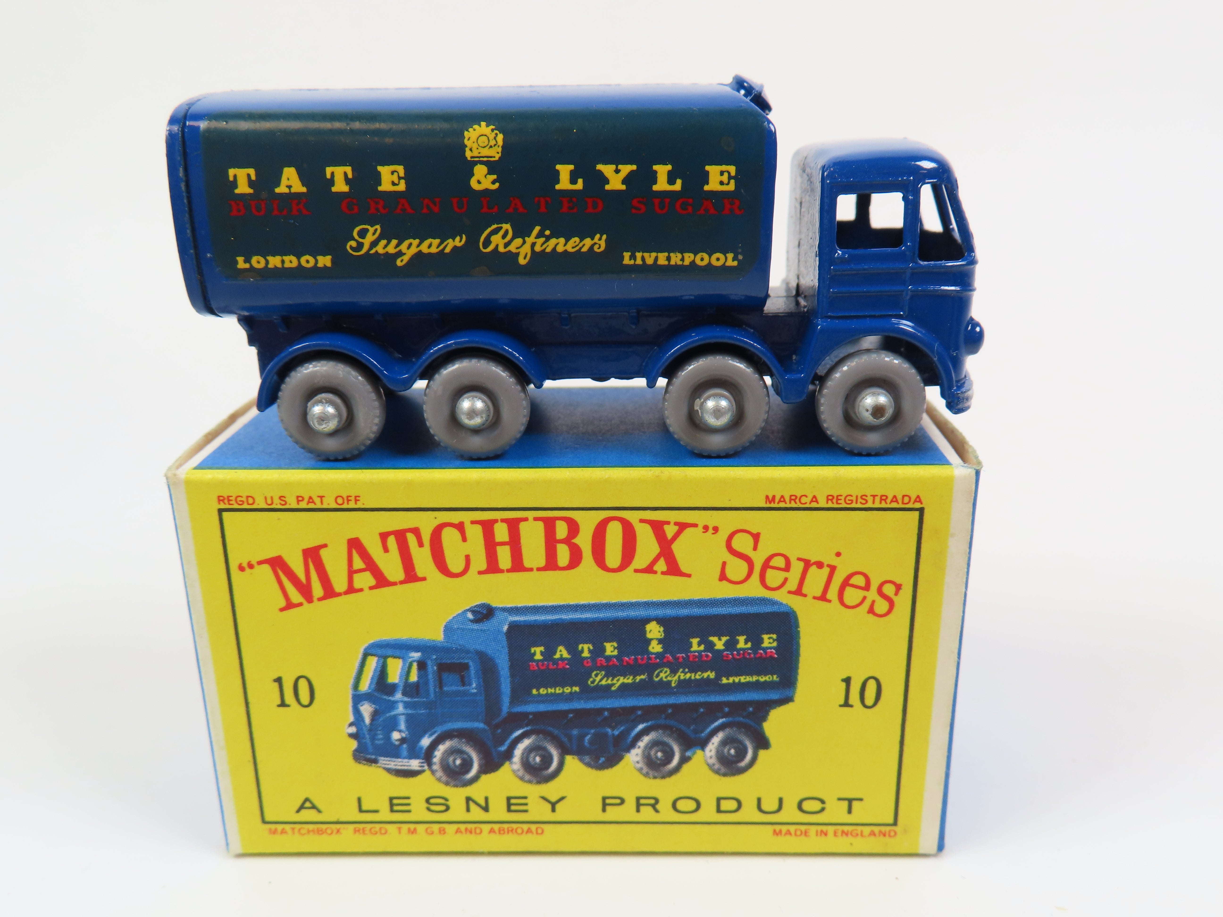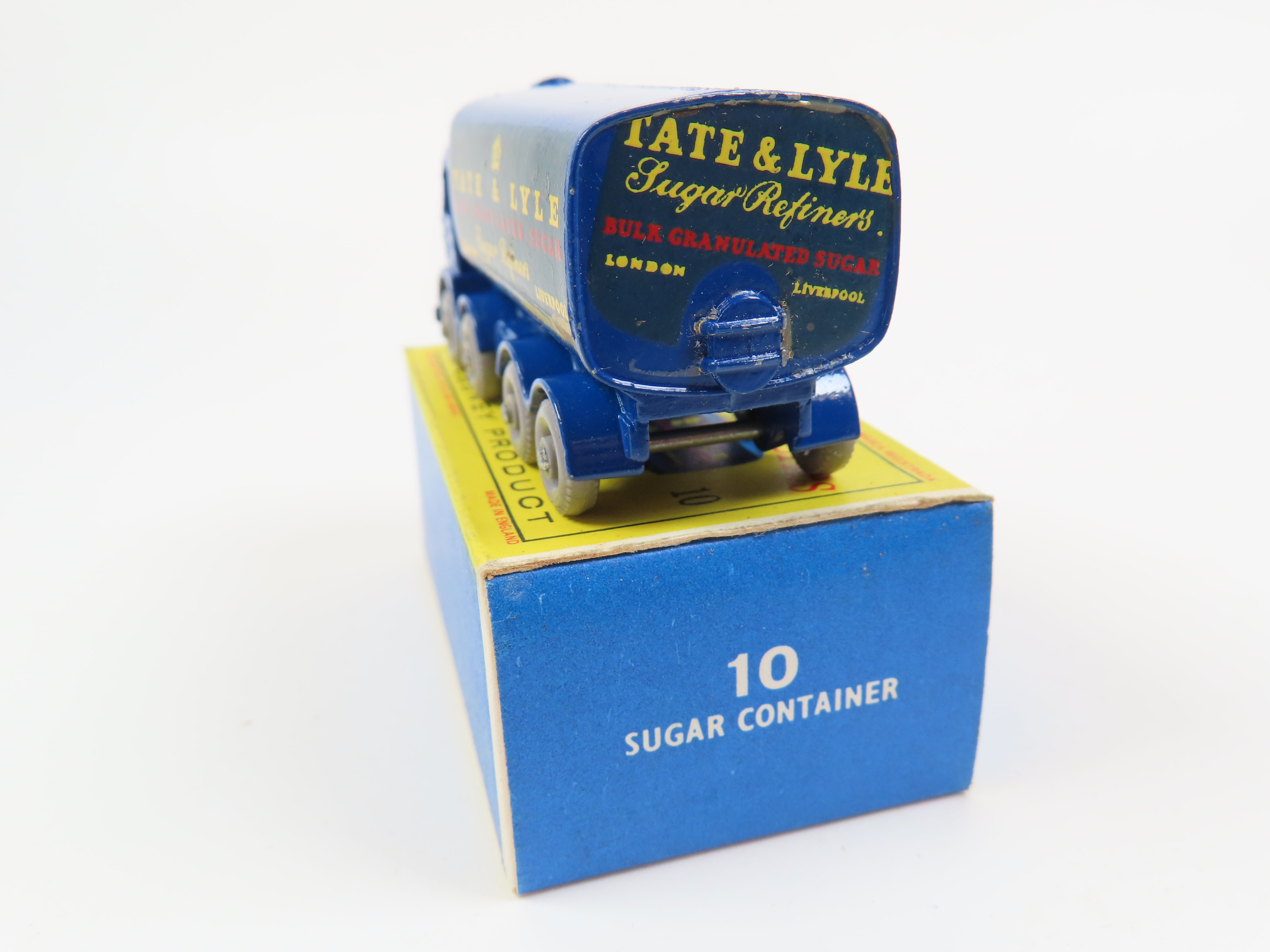 Matchbox No.10 Sugar Container Truck in blue with 'Tate & Lyle' decals to each side and the rear, and grey plastic wheels.