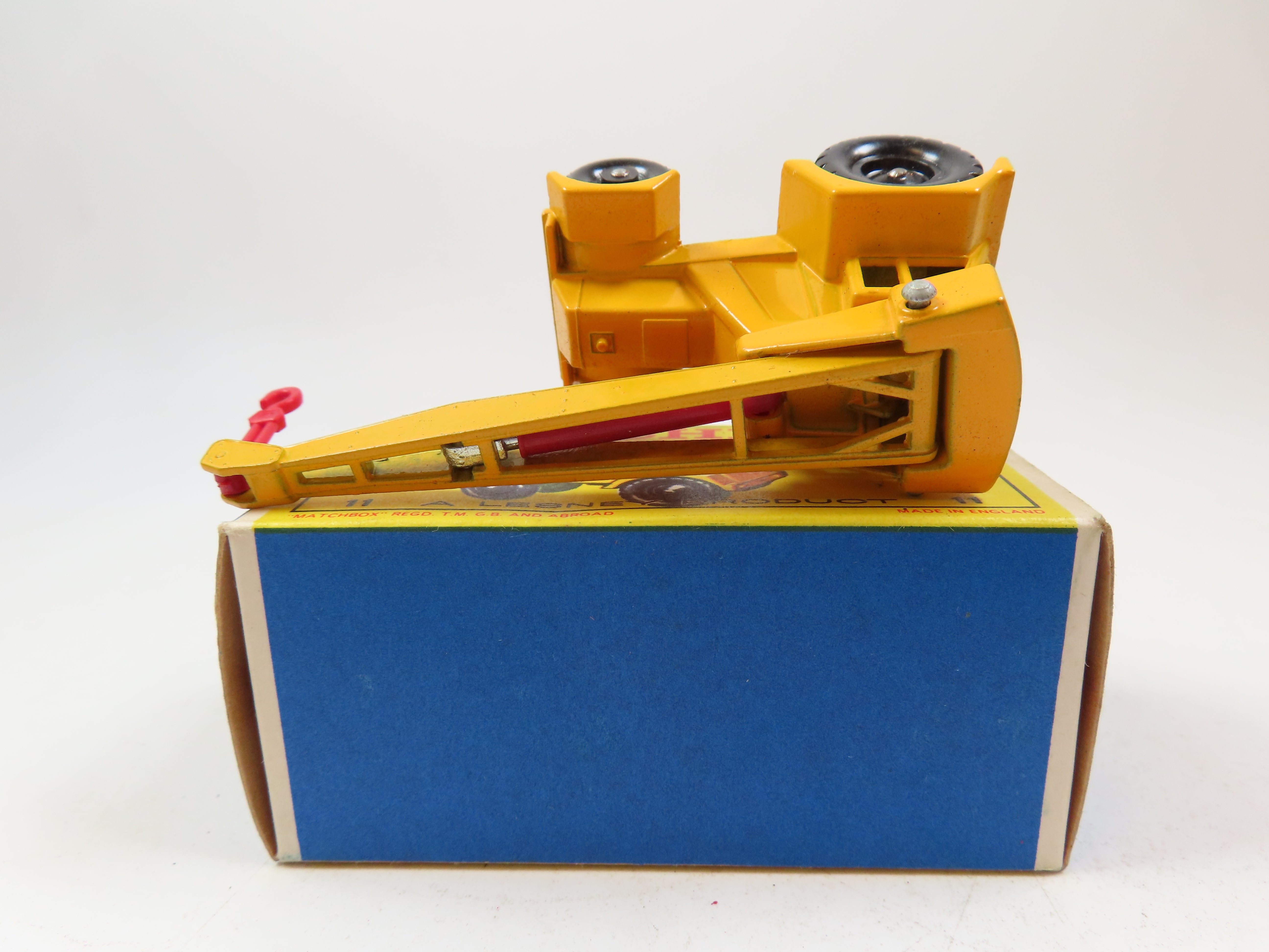 Matchbox No.11 Jumbo Crane in yellow, with red plastic hook and hydraulic lifter sleeve.