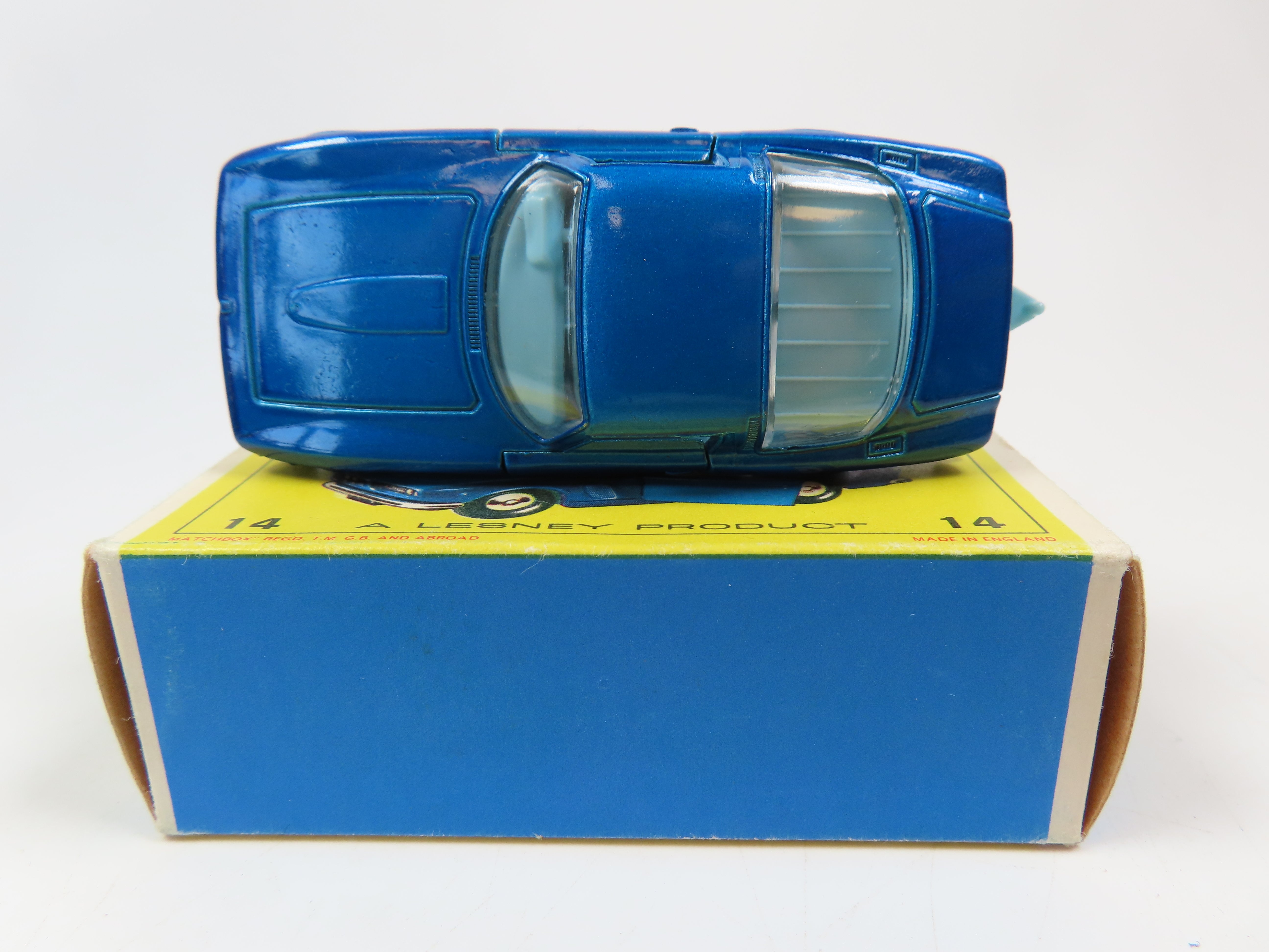Matchbox No.14 Iso Grifo in metallic blue, with light blue interior and plastic tow hook to the rear.