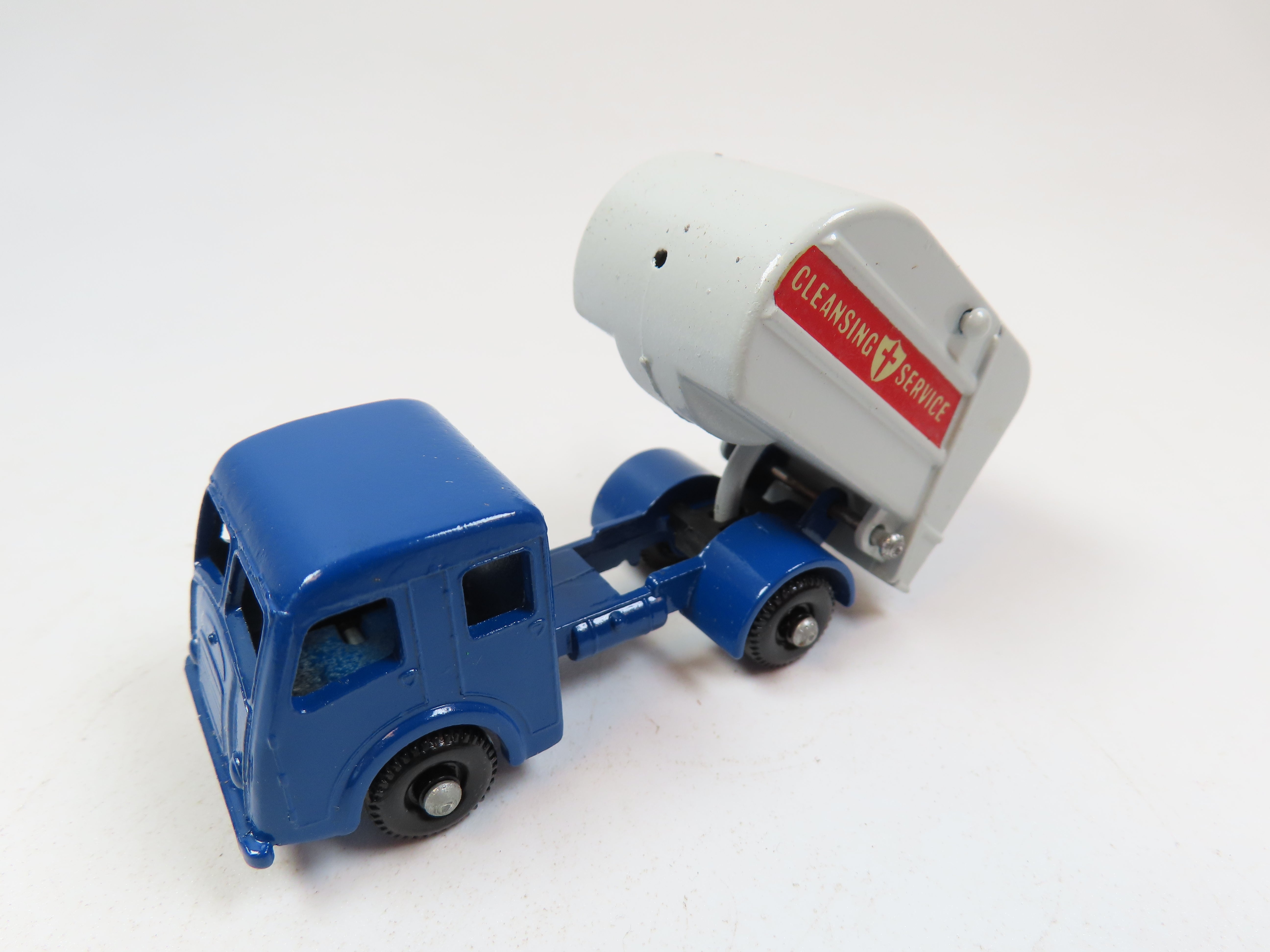 Matchbox No.15 Refuse Truck with a blue cab and chassis and grey tipper with 'Cleansing Service' decals to each side.