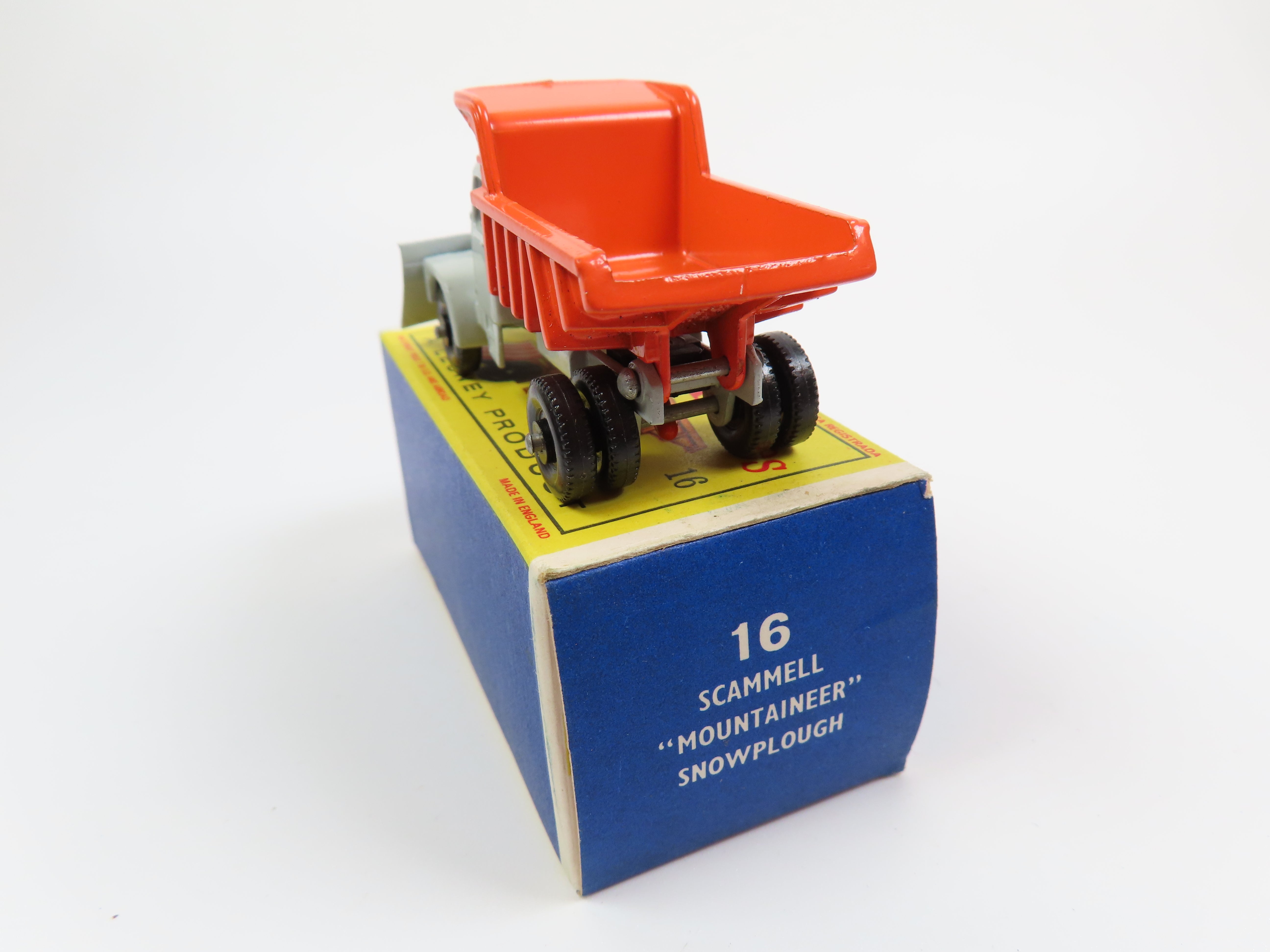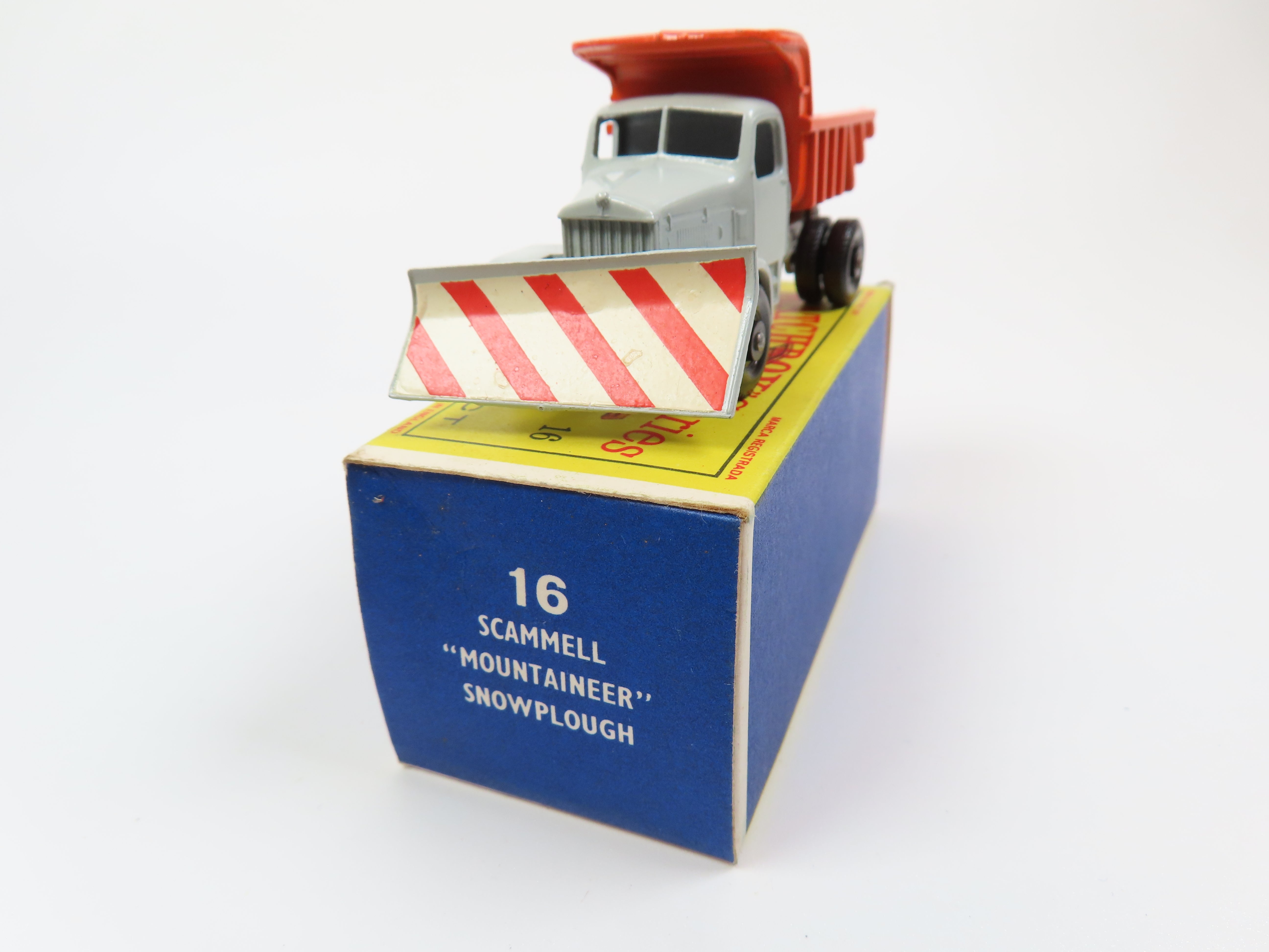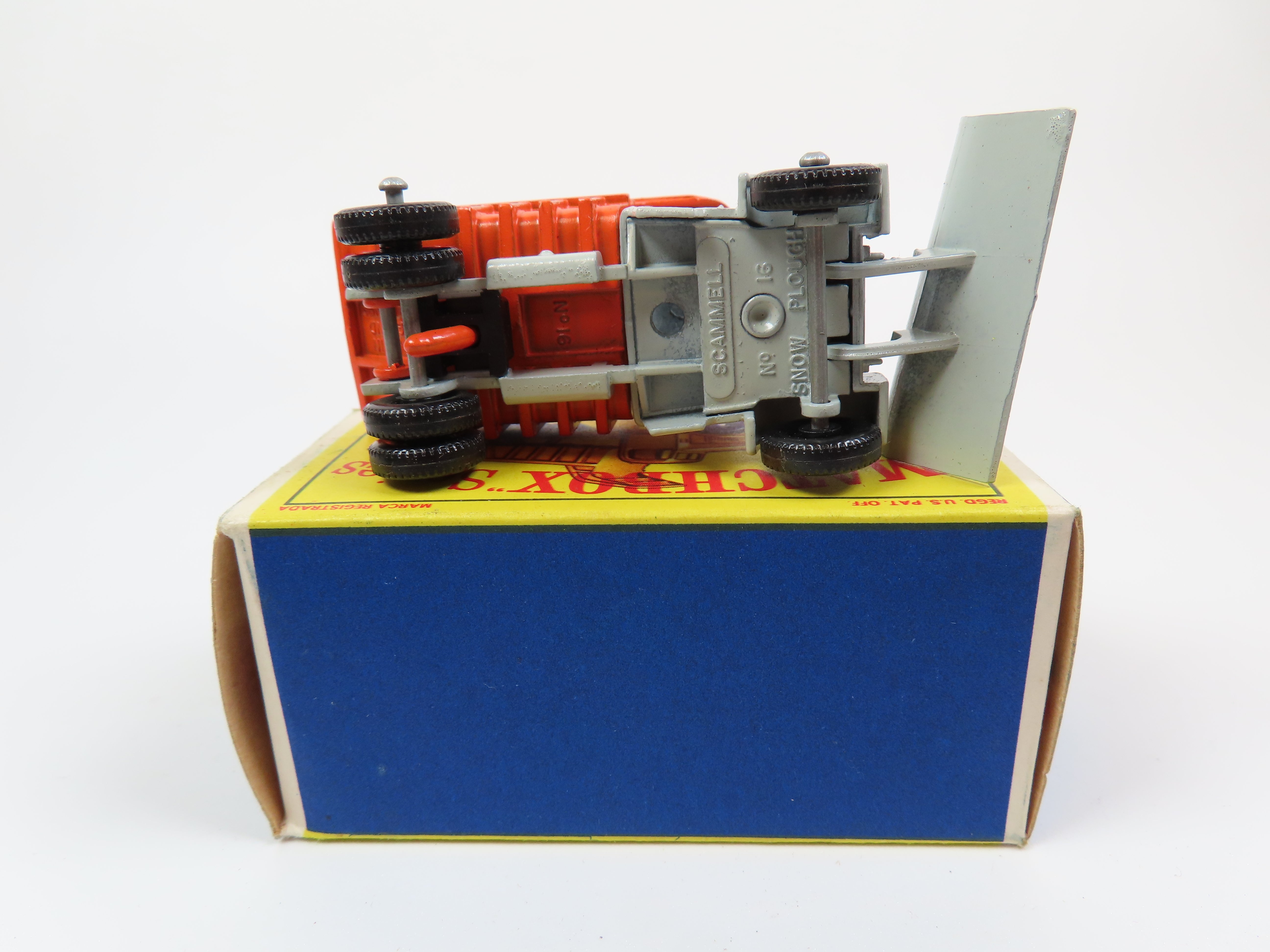 Matchbox No.16 Scammell "Mountaineer" Snowplough, with a grey cab, orange tipper, black plastic wheels and stripe decal to the plough blade.