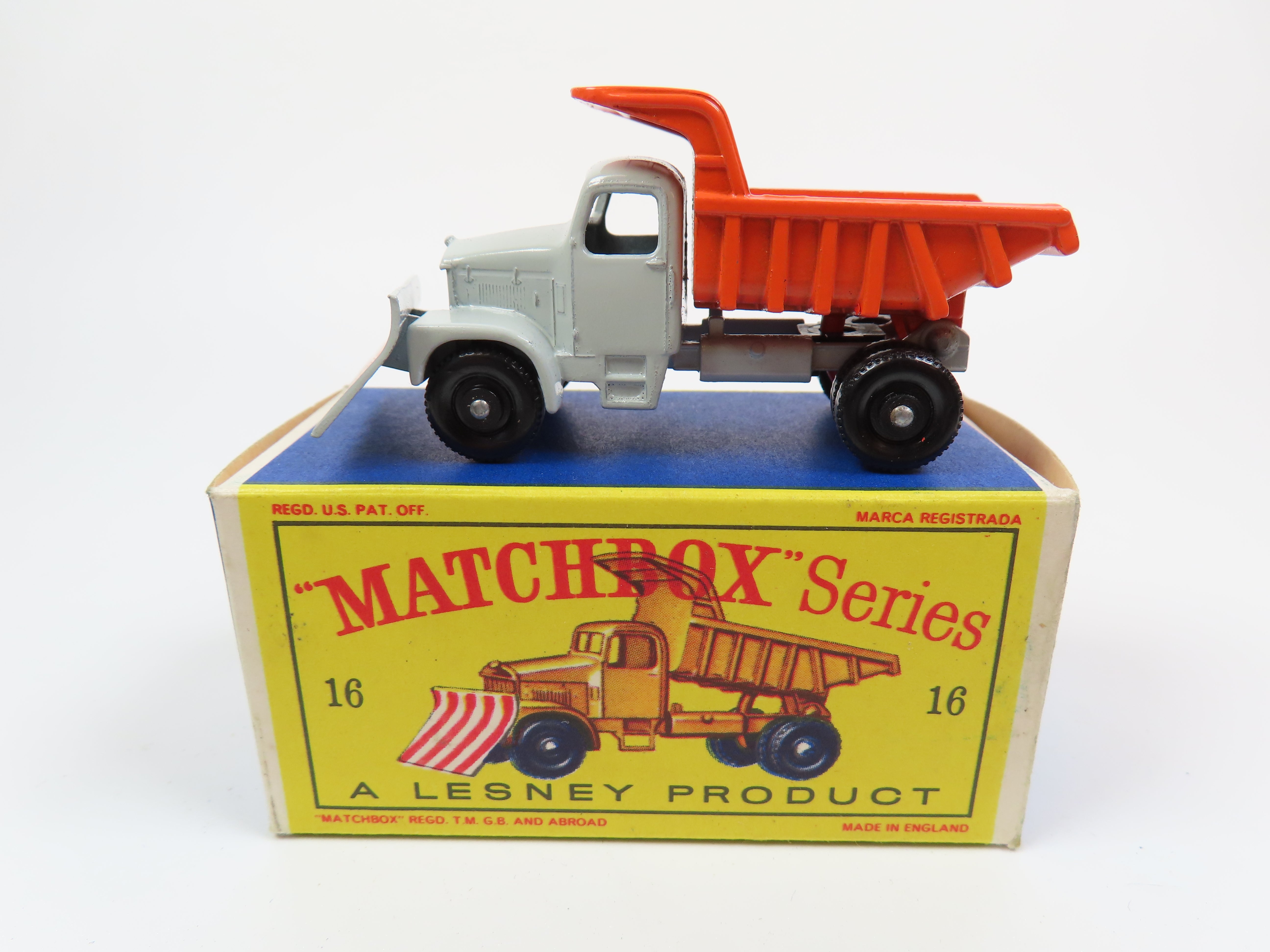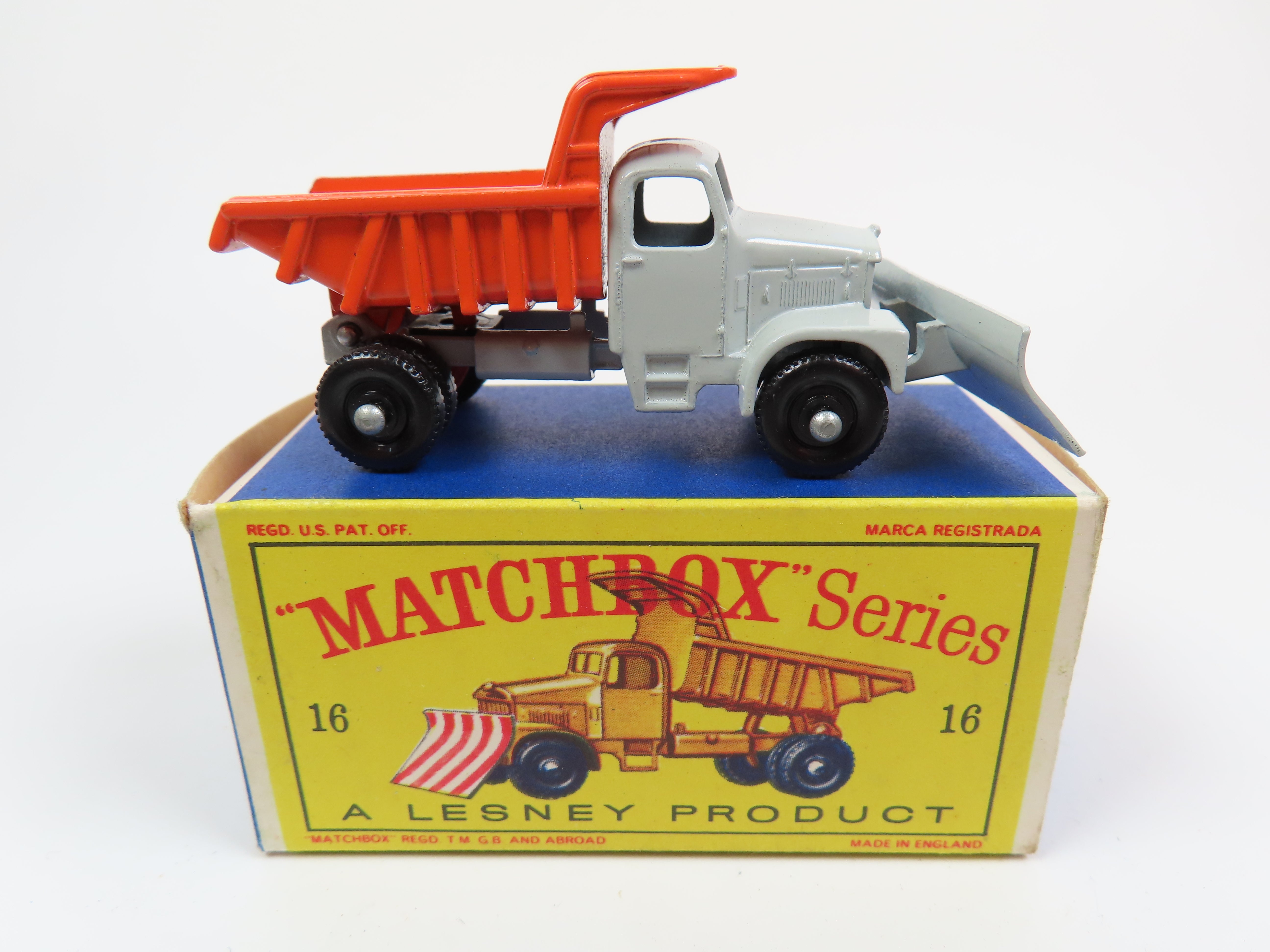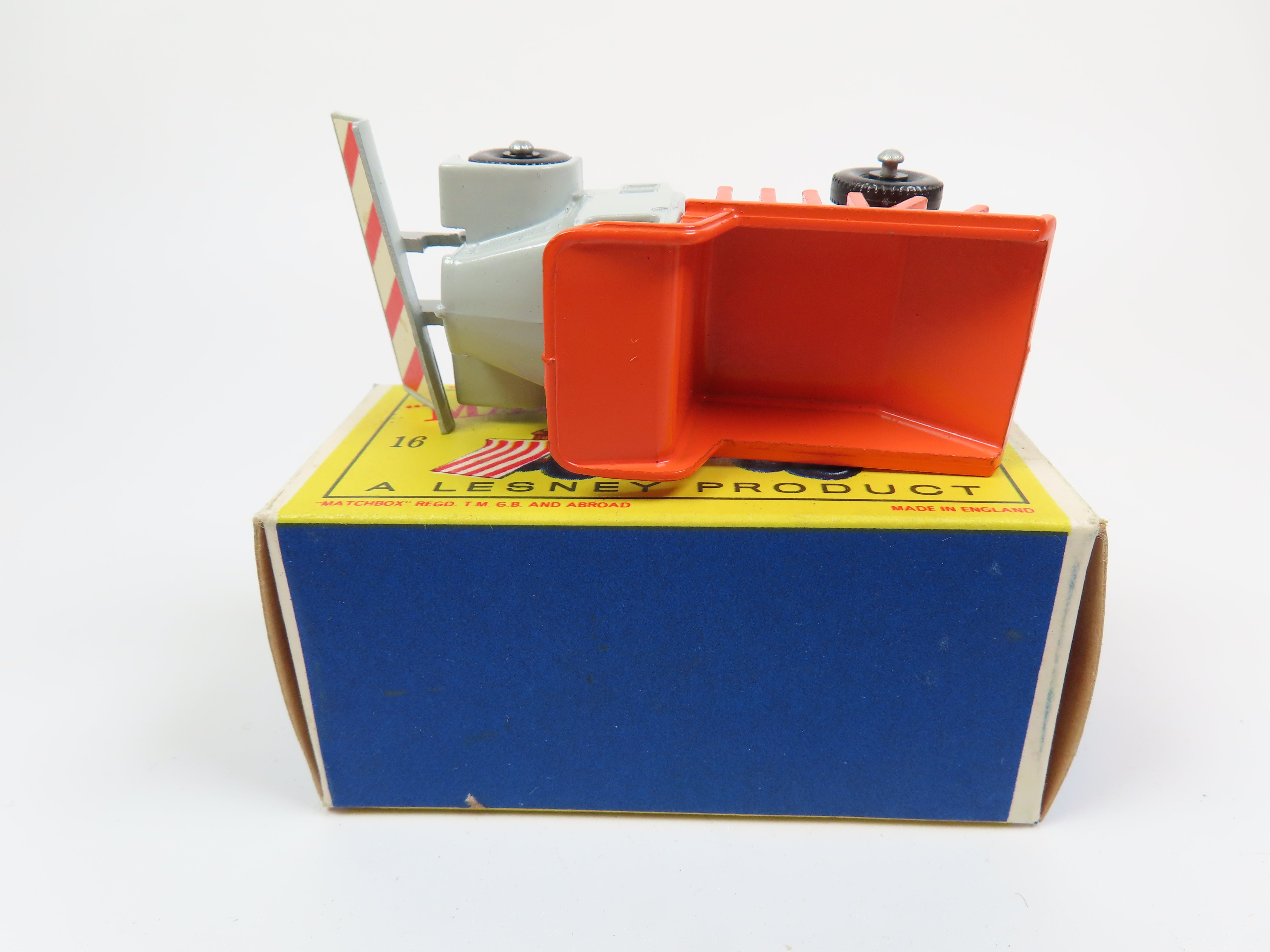 Matchbox No.16 Scammell "Mountaineer" Snowplough, with a grey cab, orange tipper, black plastic wheels and stripe decal to the plough blade.