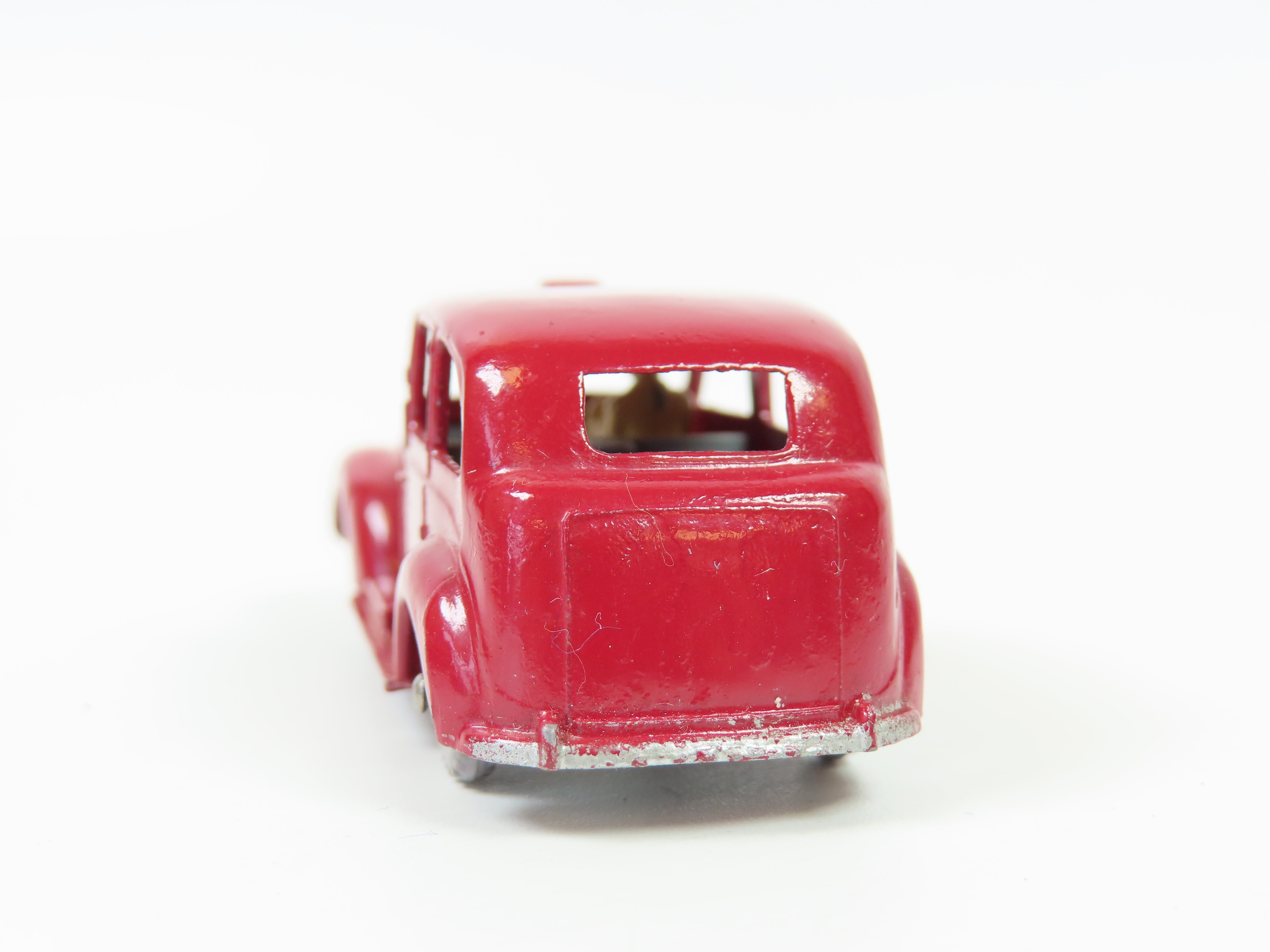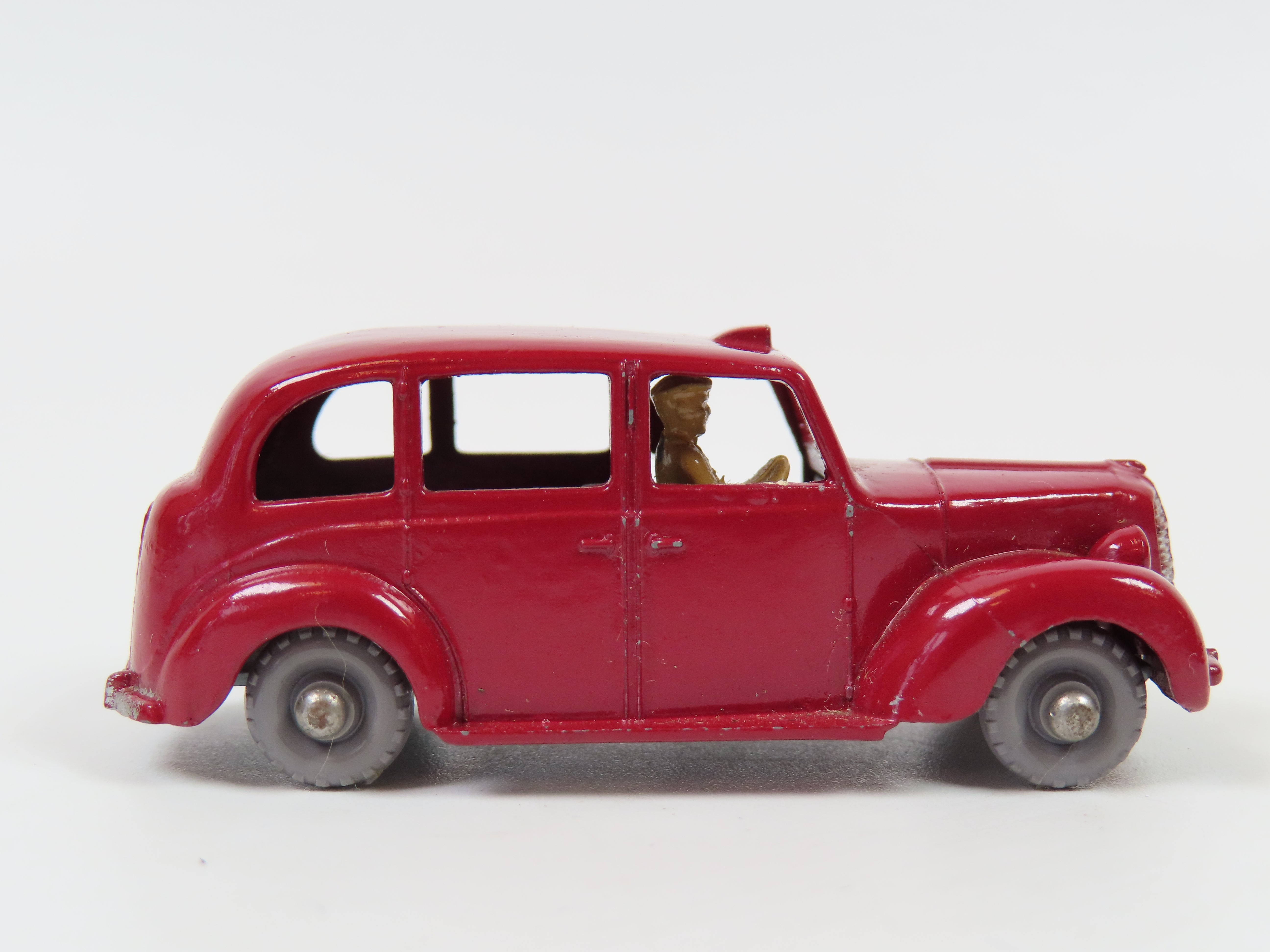 Matchbox No.17 Austin Metropolitan Taxi in maroon, with driver figure and grey plastic wheels.