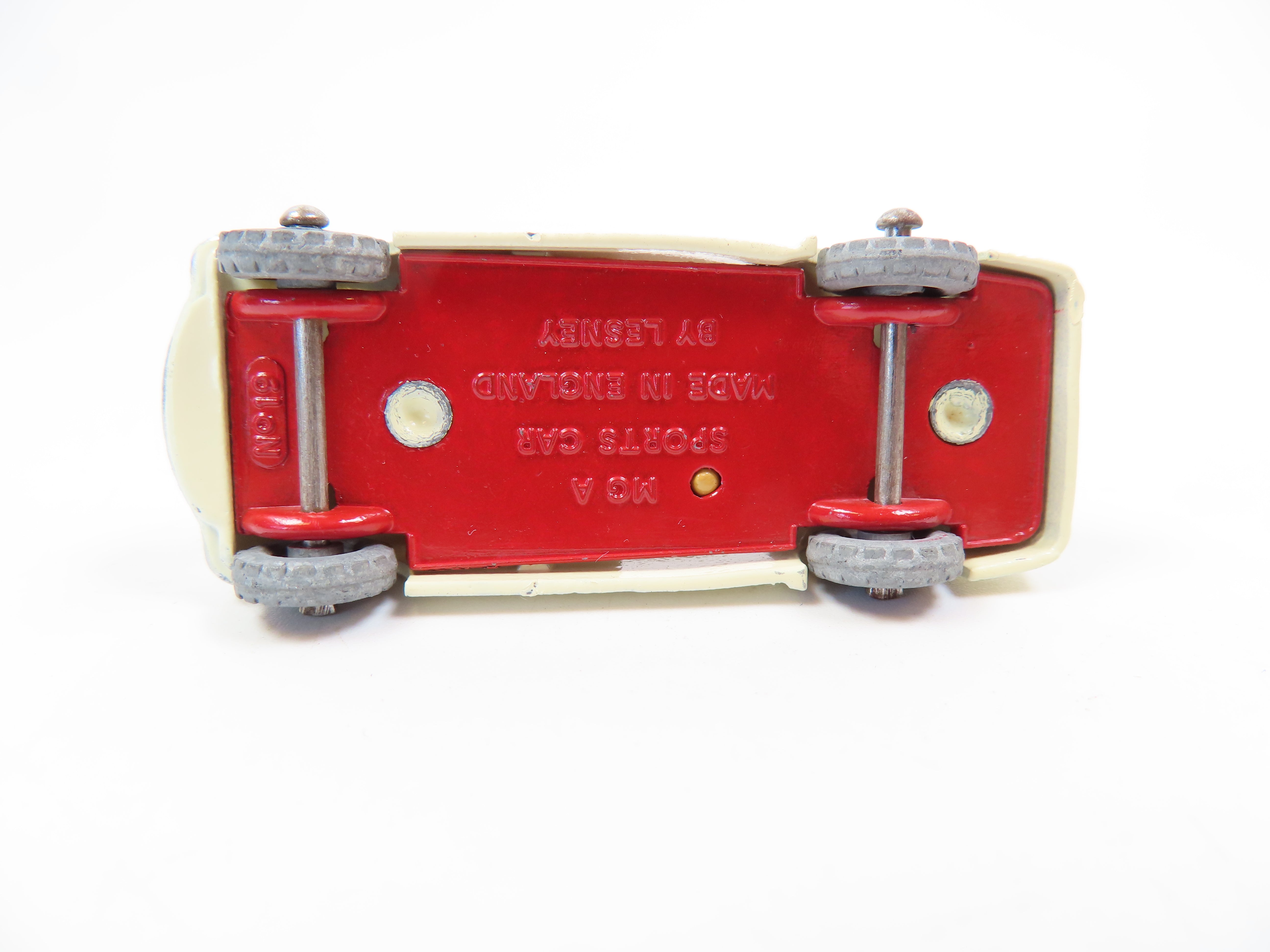 Matchbox No.19 MGA Sports Car in cream with red interior and base, a tan driver and metal wheels.