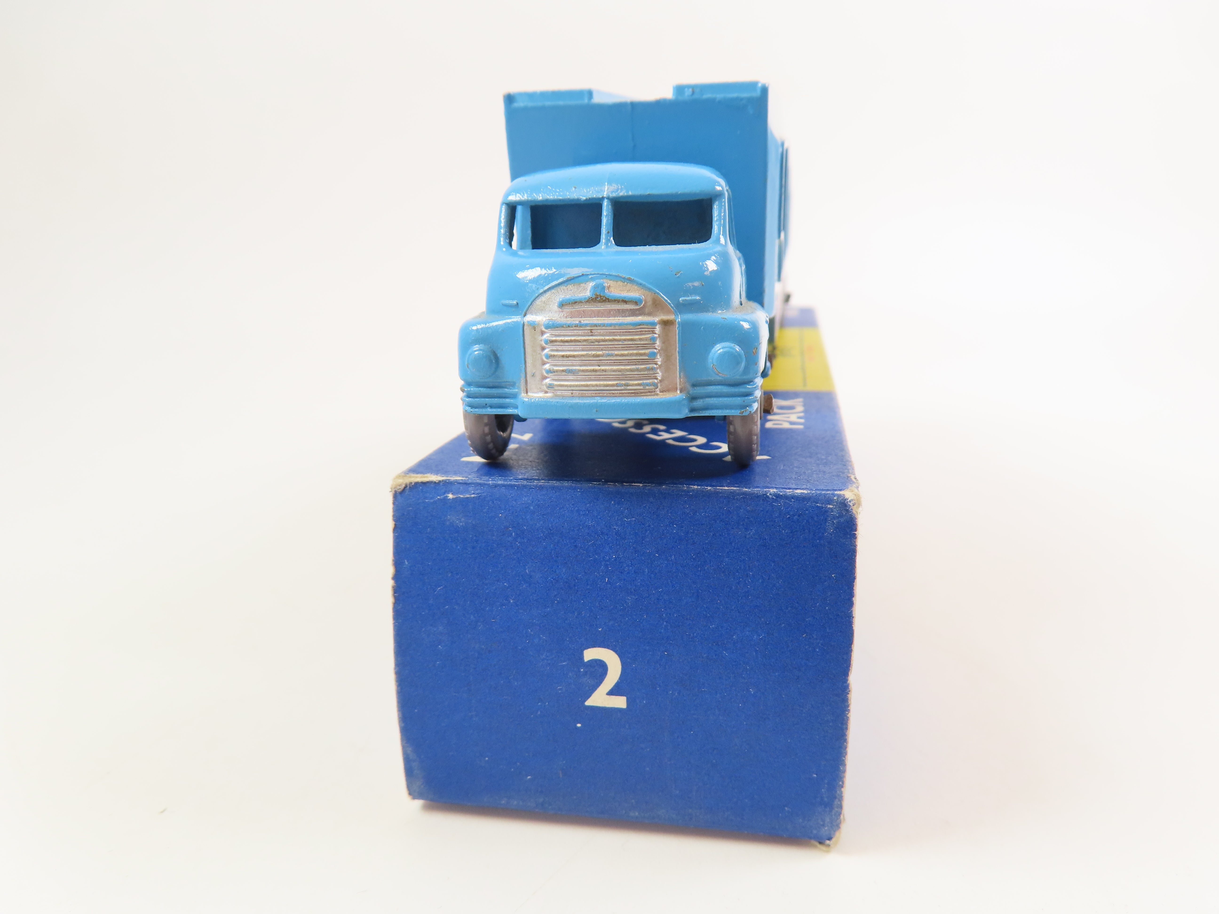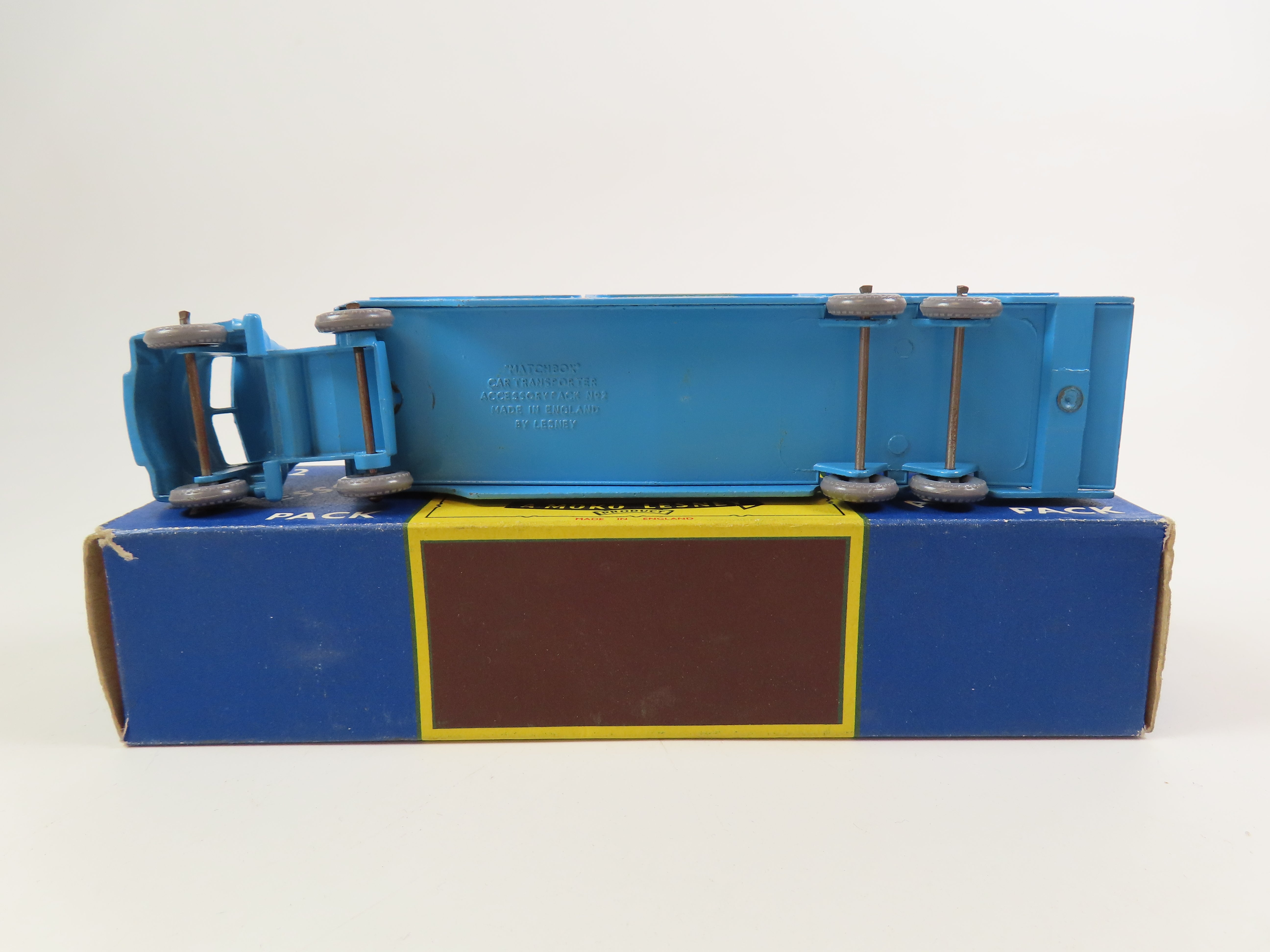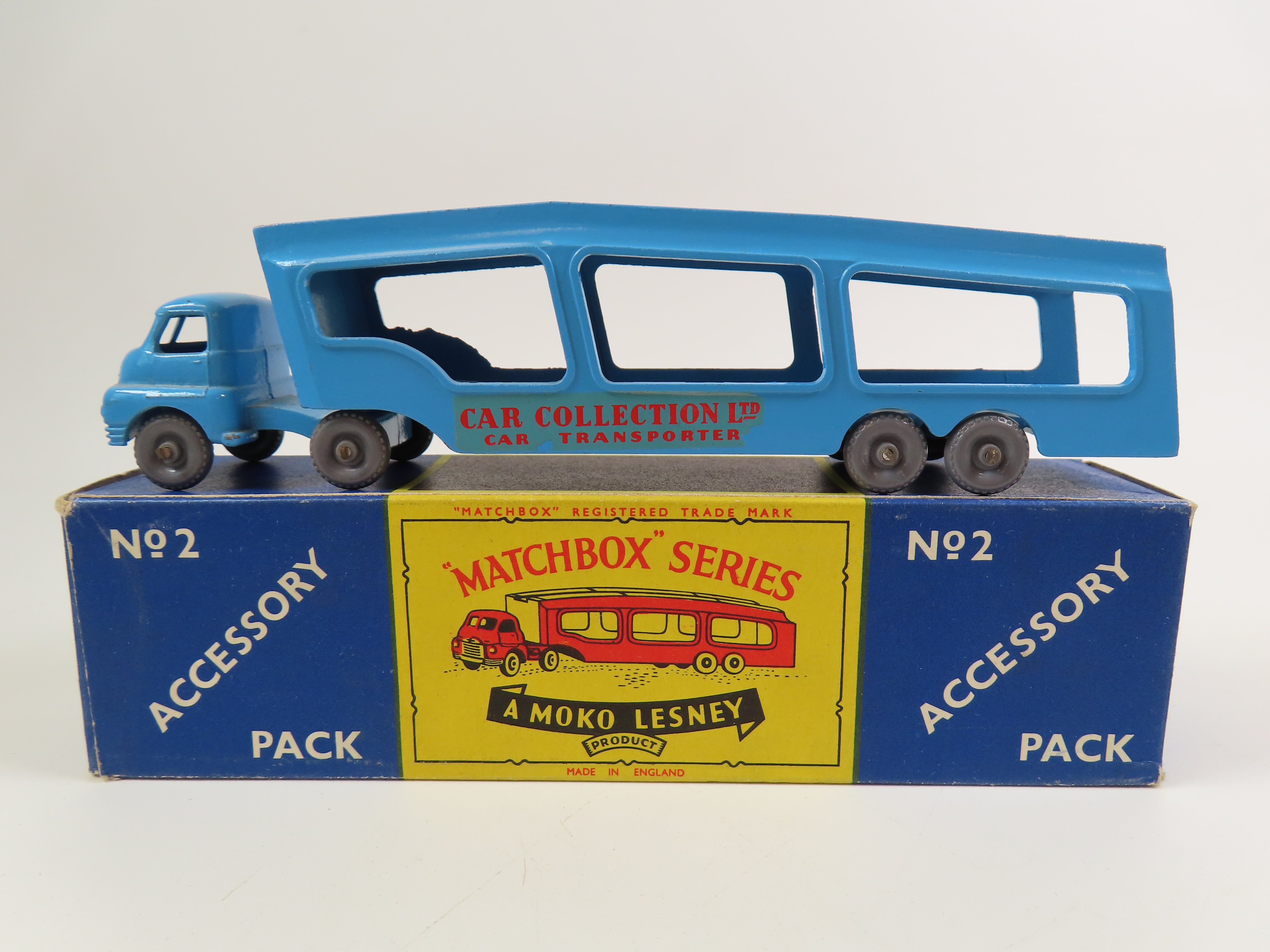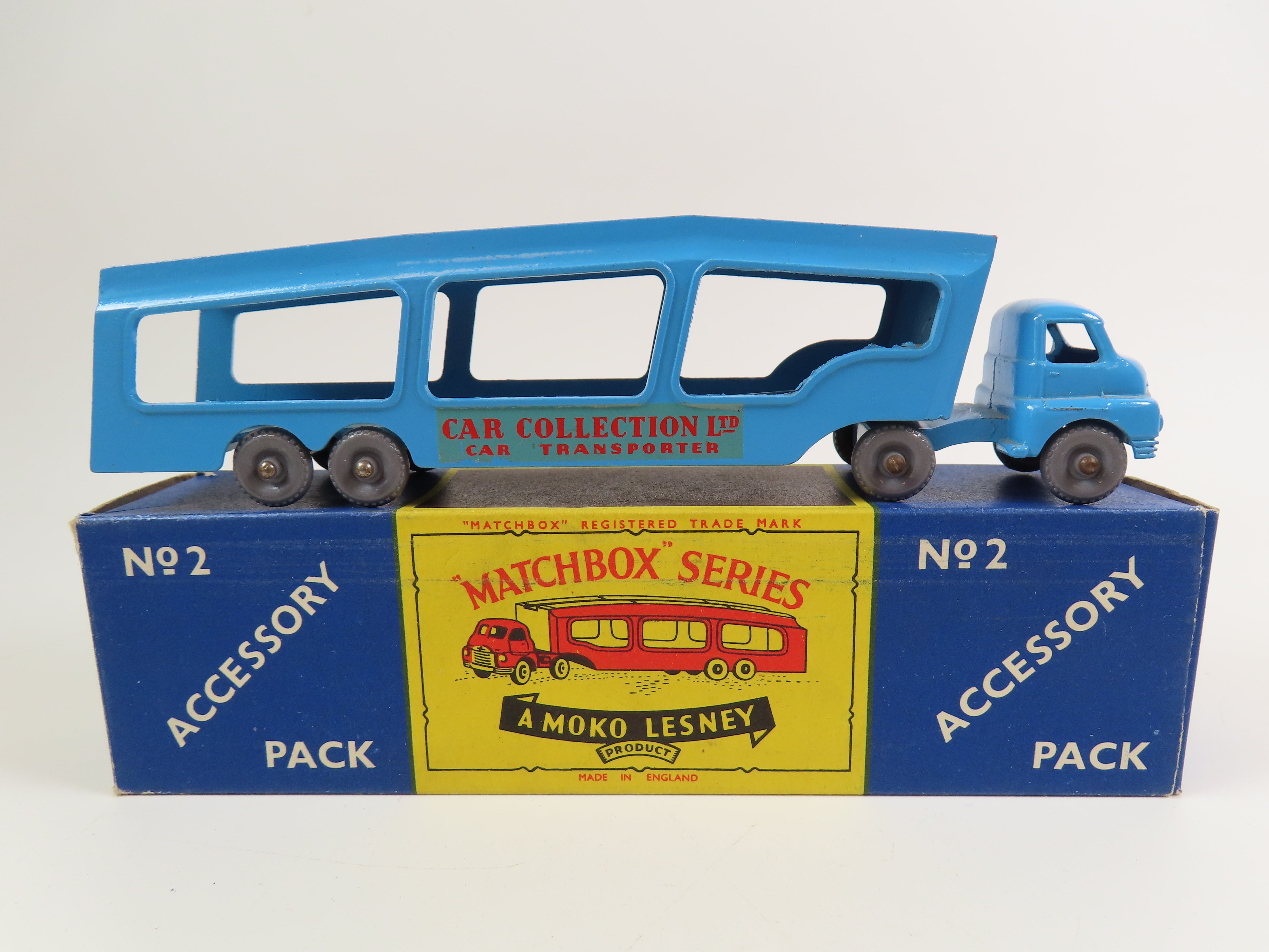 Matchbox No.2 Accessory Pack, "Matchbox" Car Transporter in light blue with red 'Car Collection Ltd Car Transporter' decal to each side and grey plastic wheels.