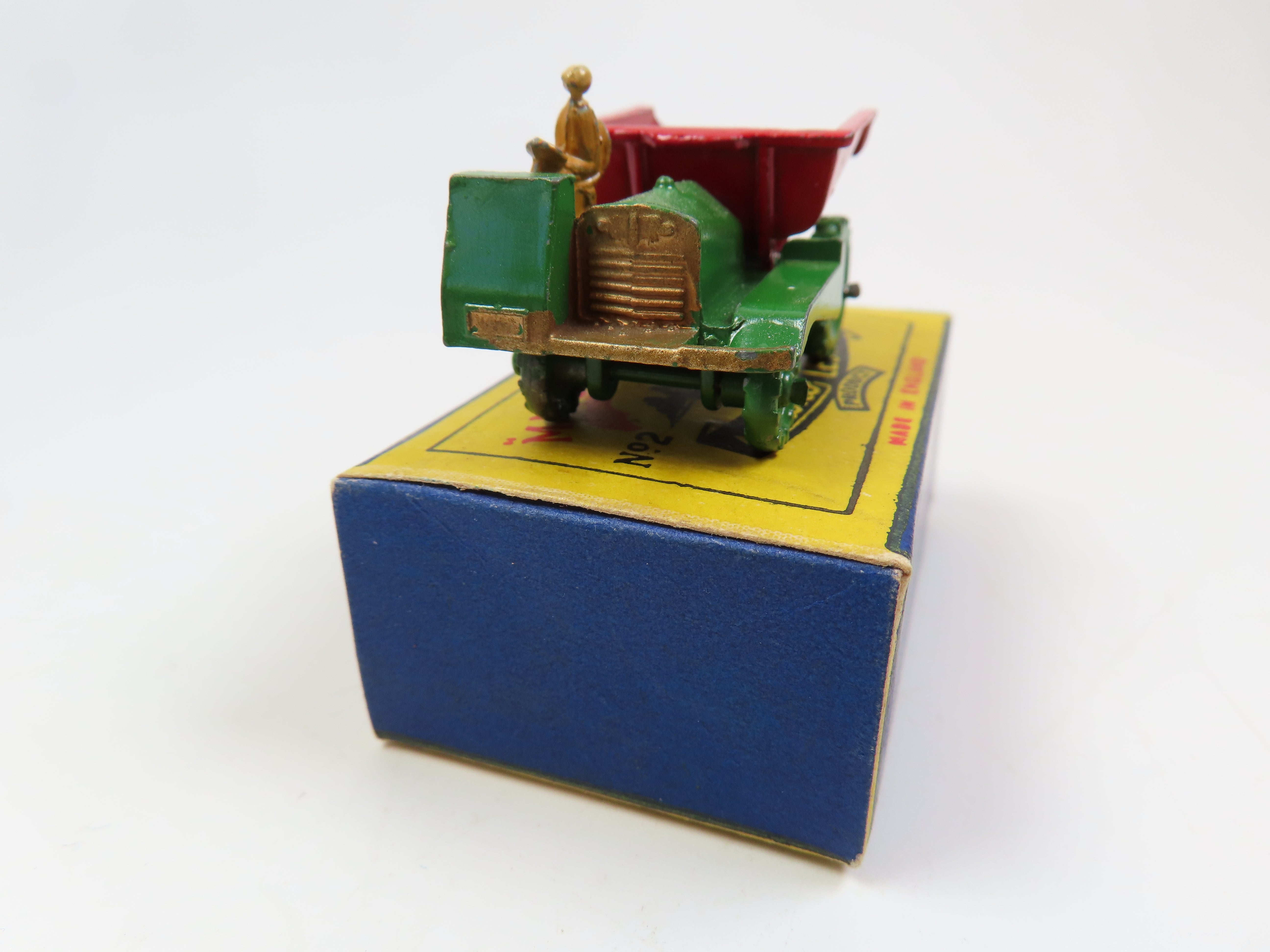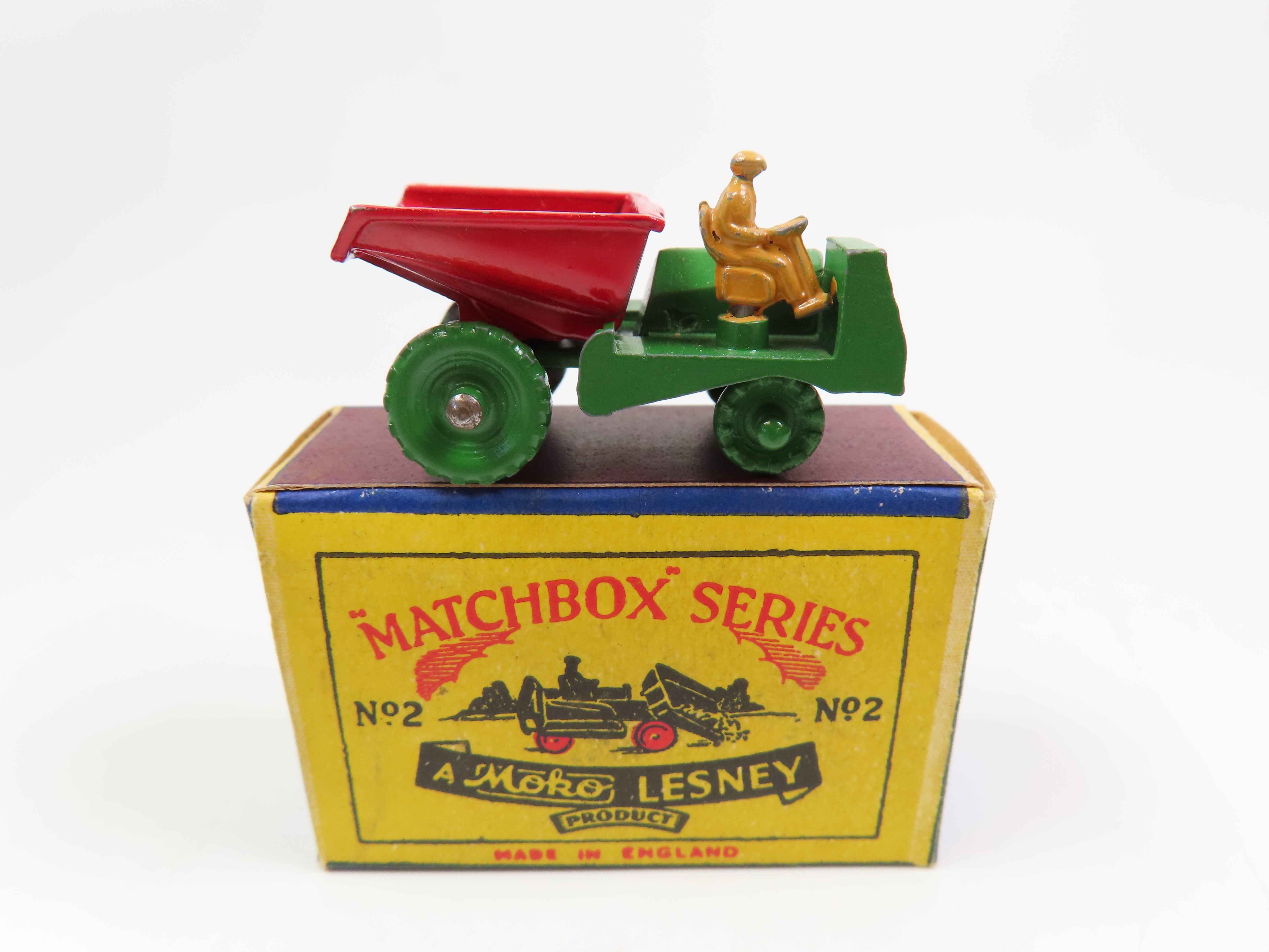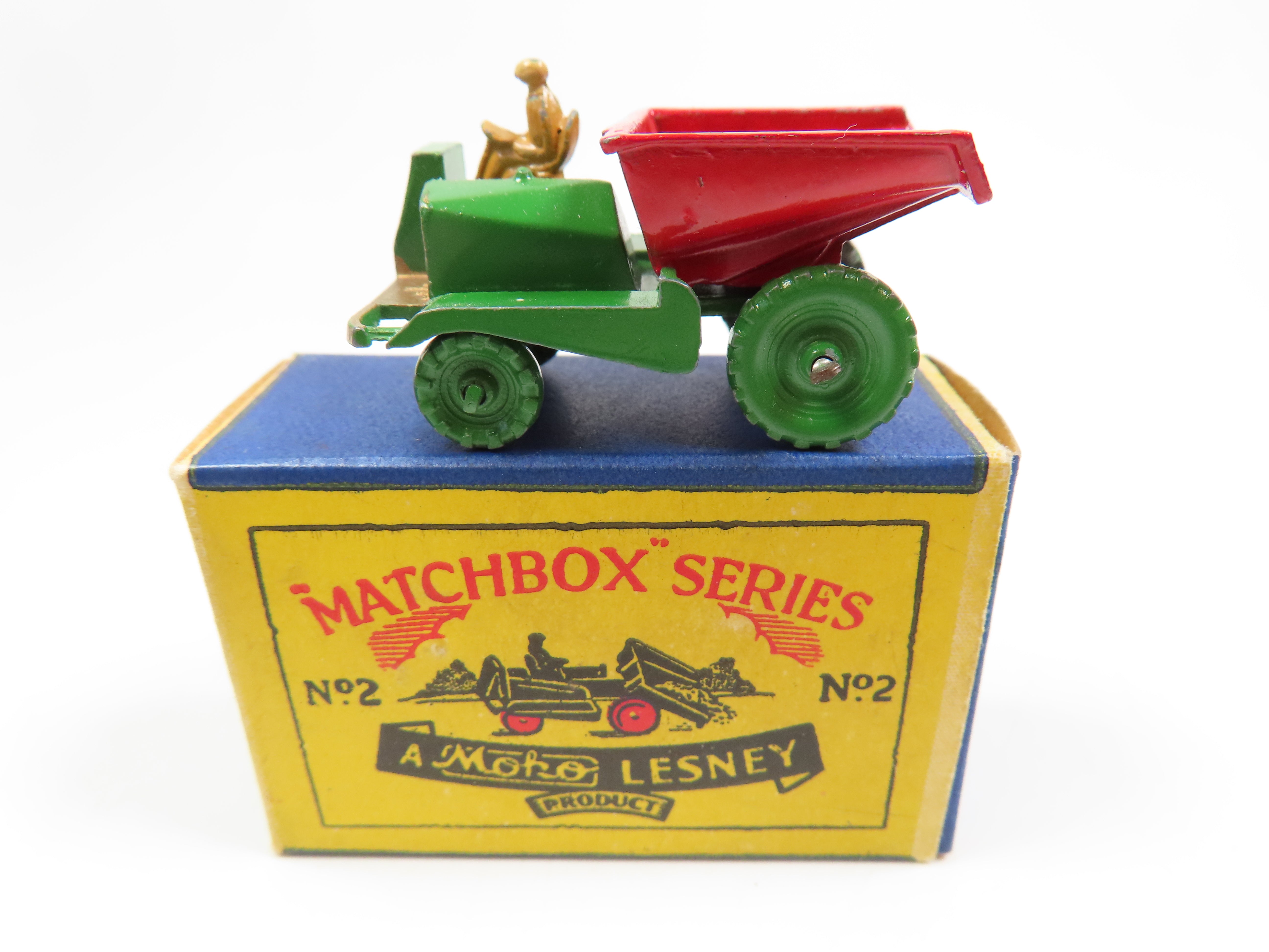 Matchbox No.2 Dumper in green with red tipper to the rear, gold painted grille and a tan driver figure.