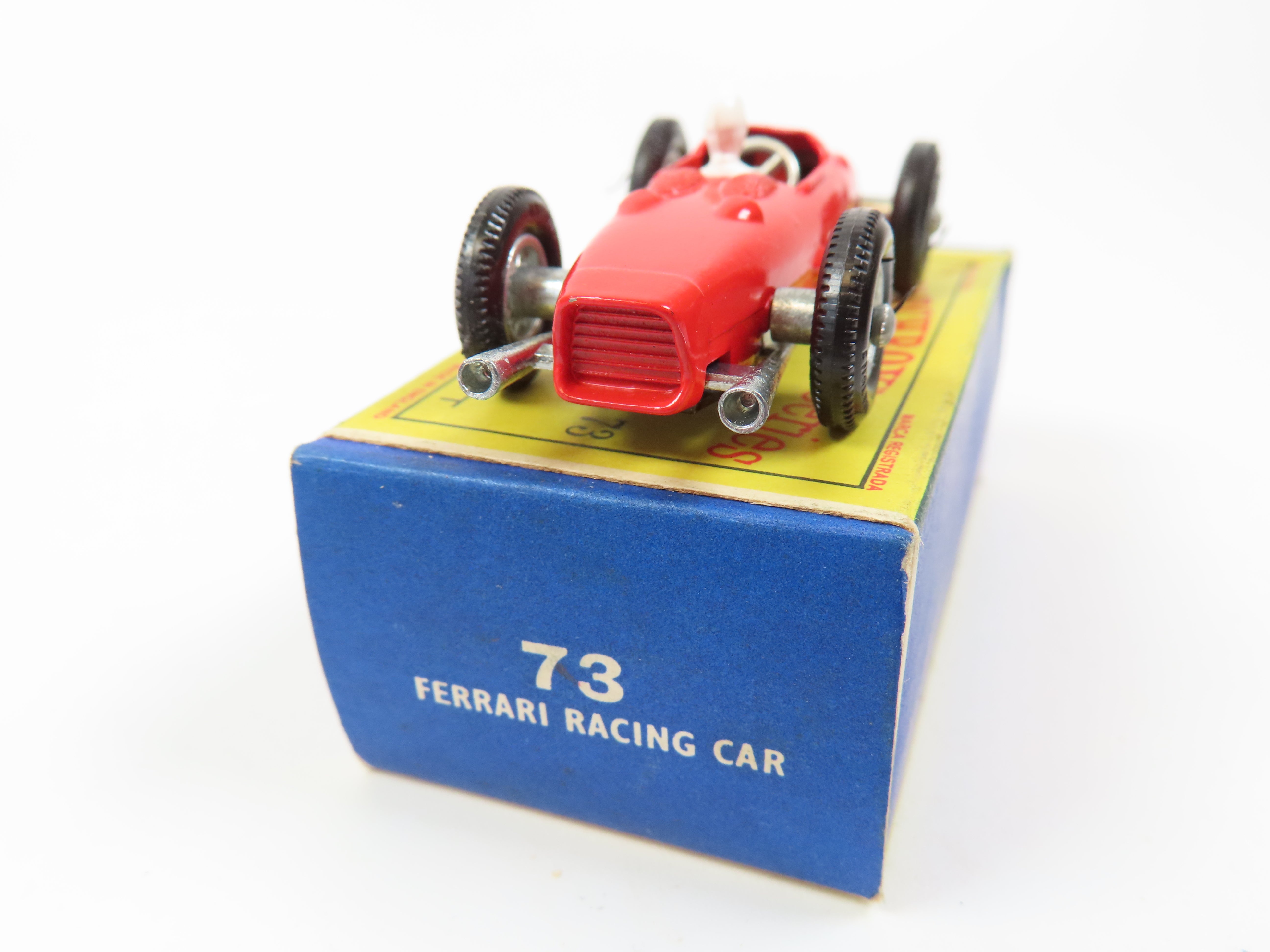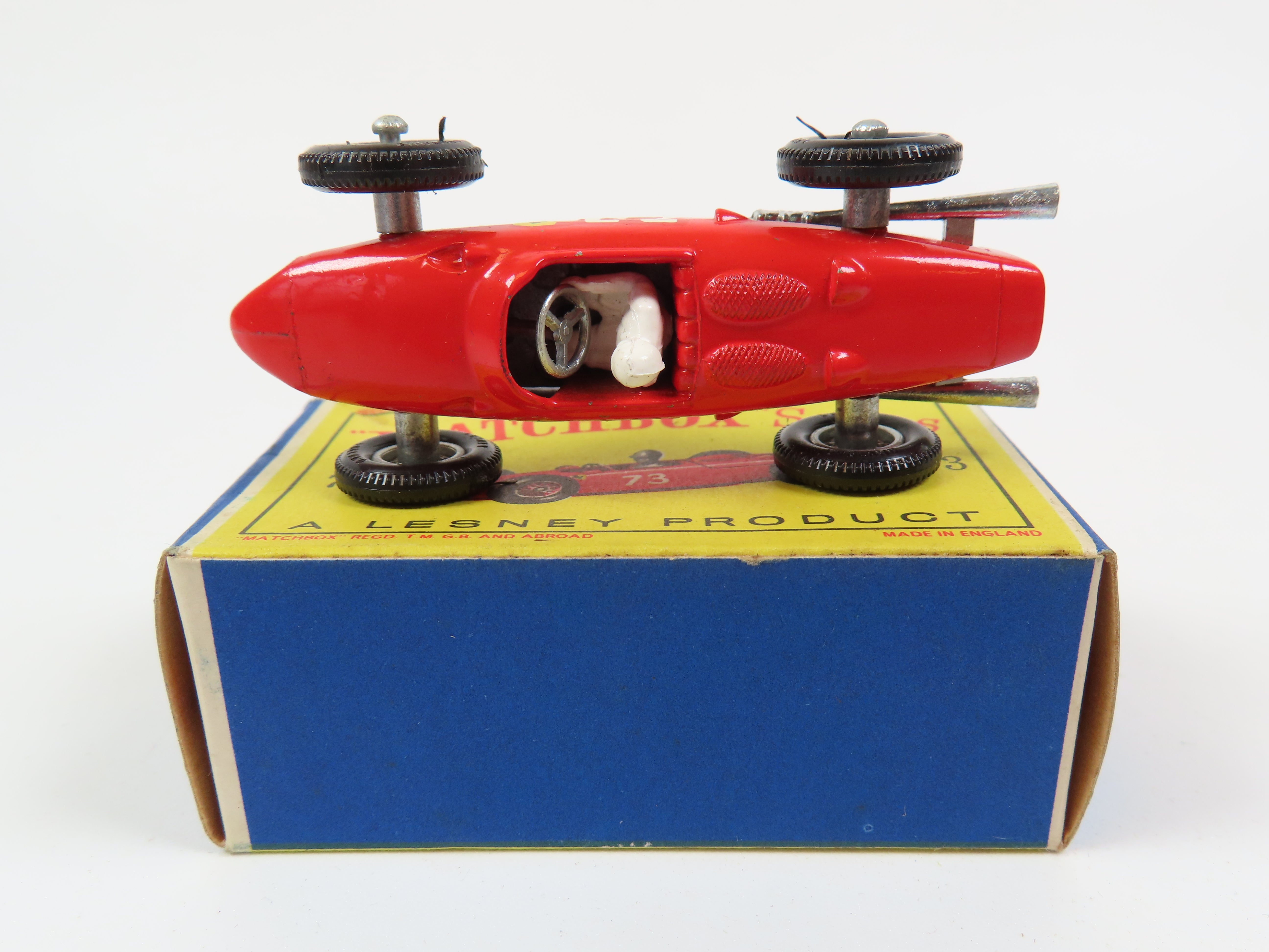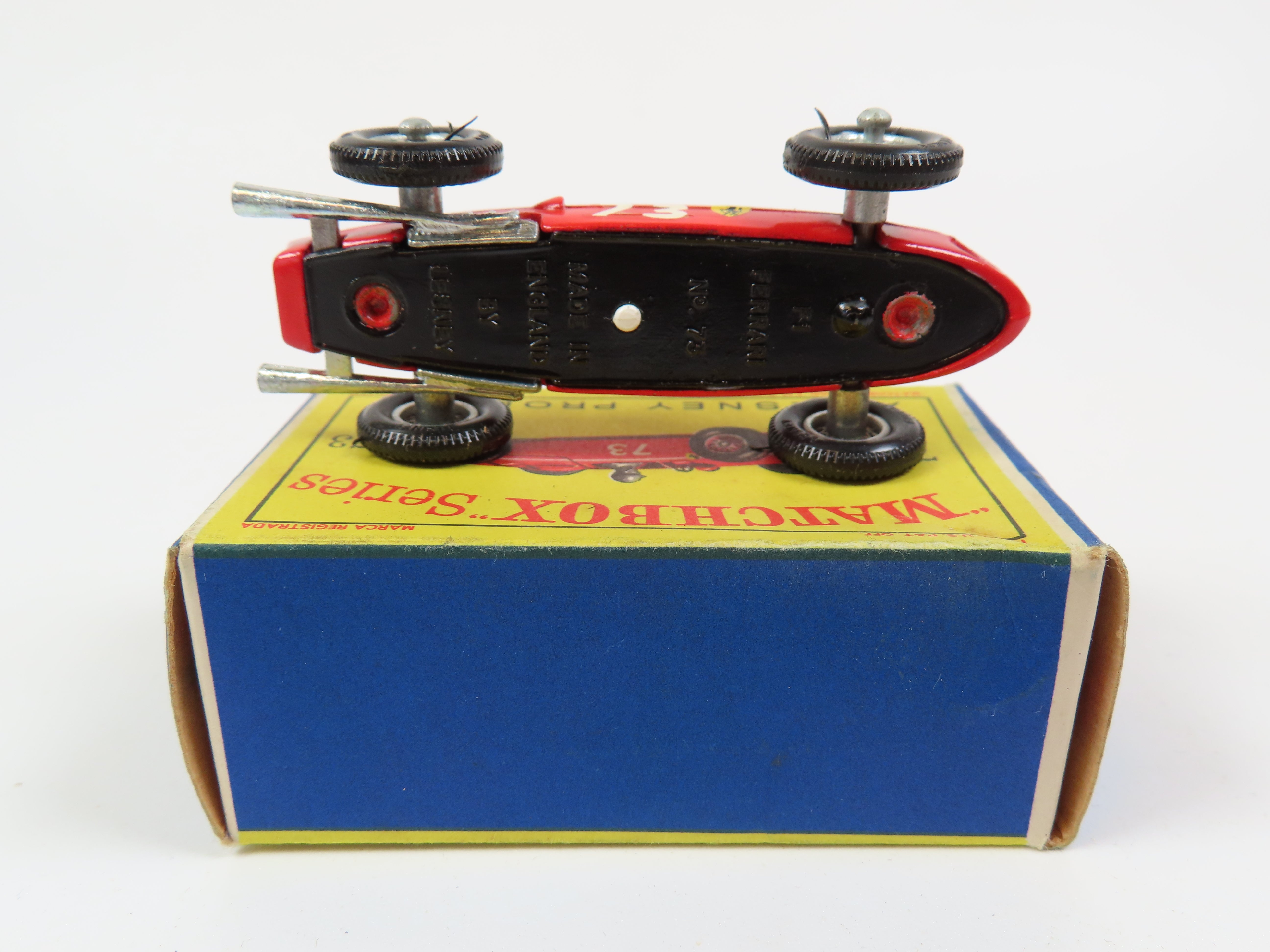 Matchbox No.73 Ferrari Racing Car in bright red with white driver figure and '73' and emblem decals to each side.