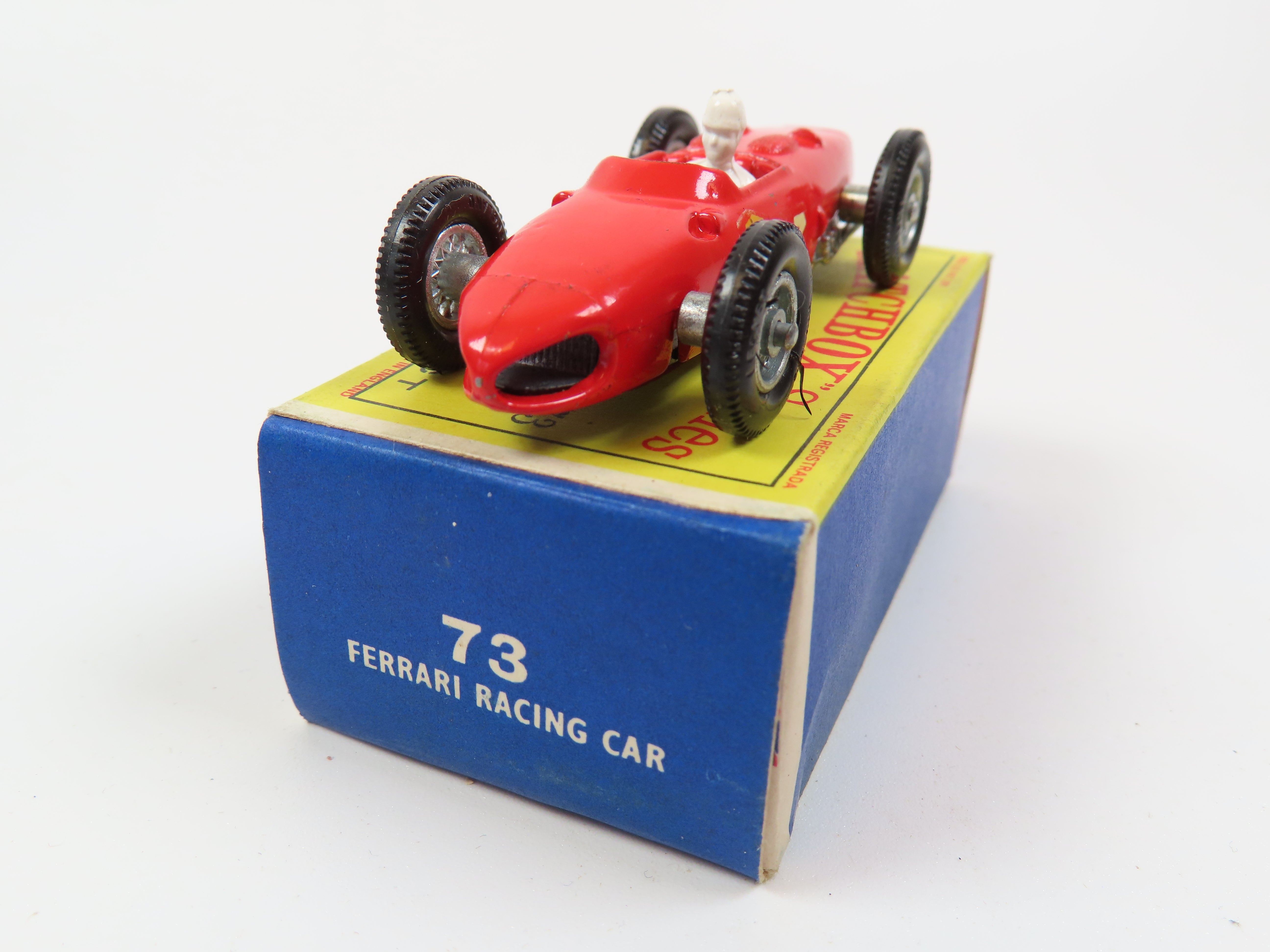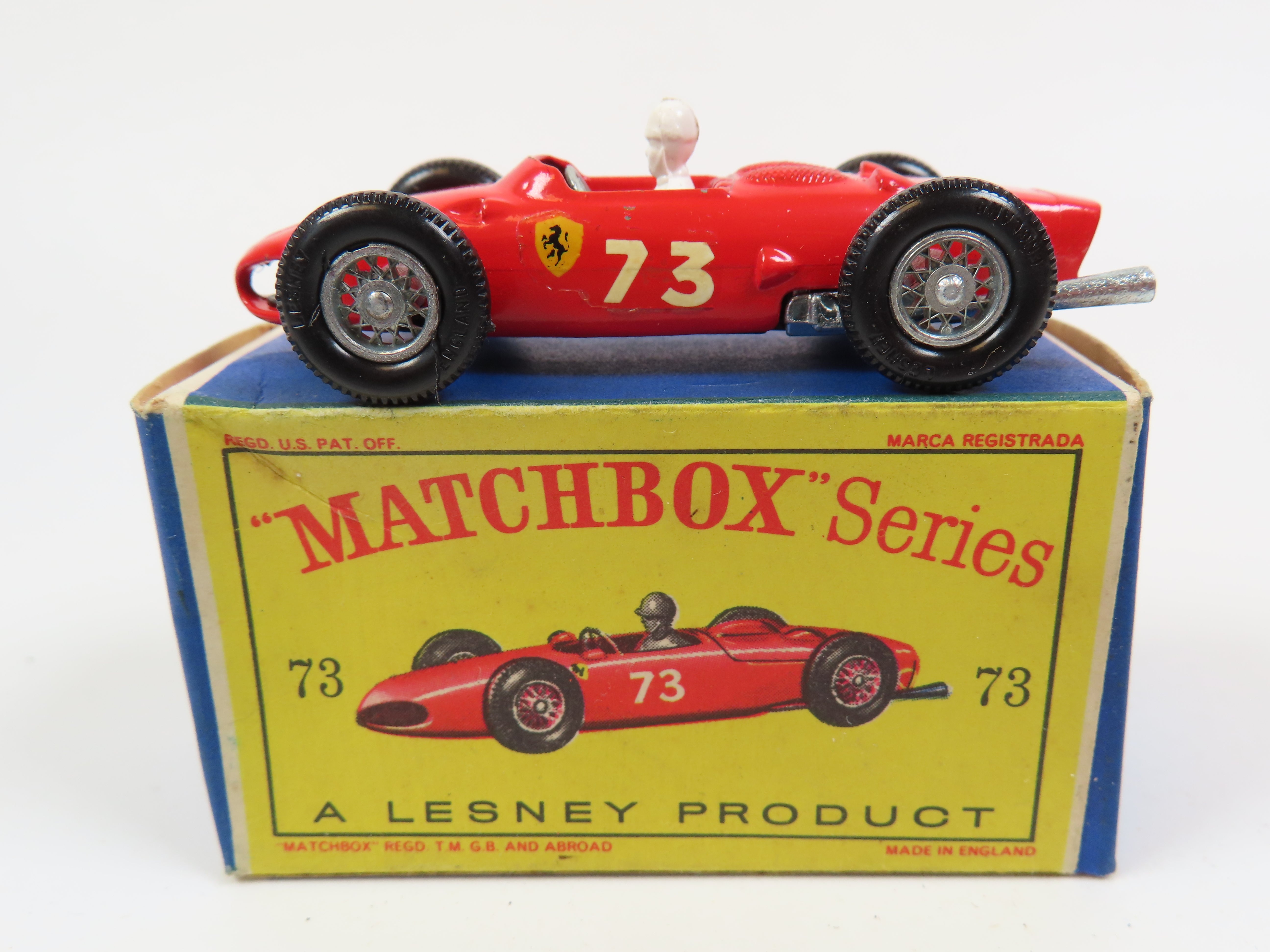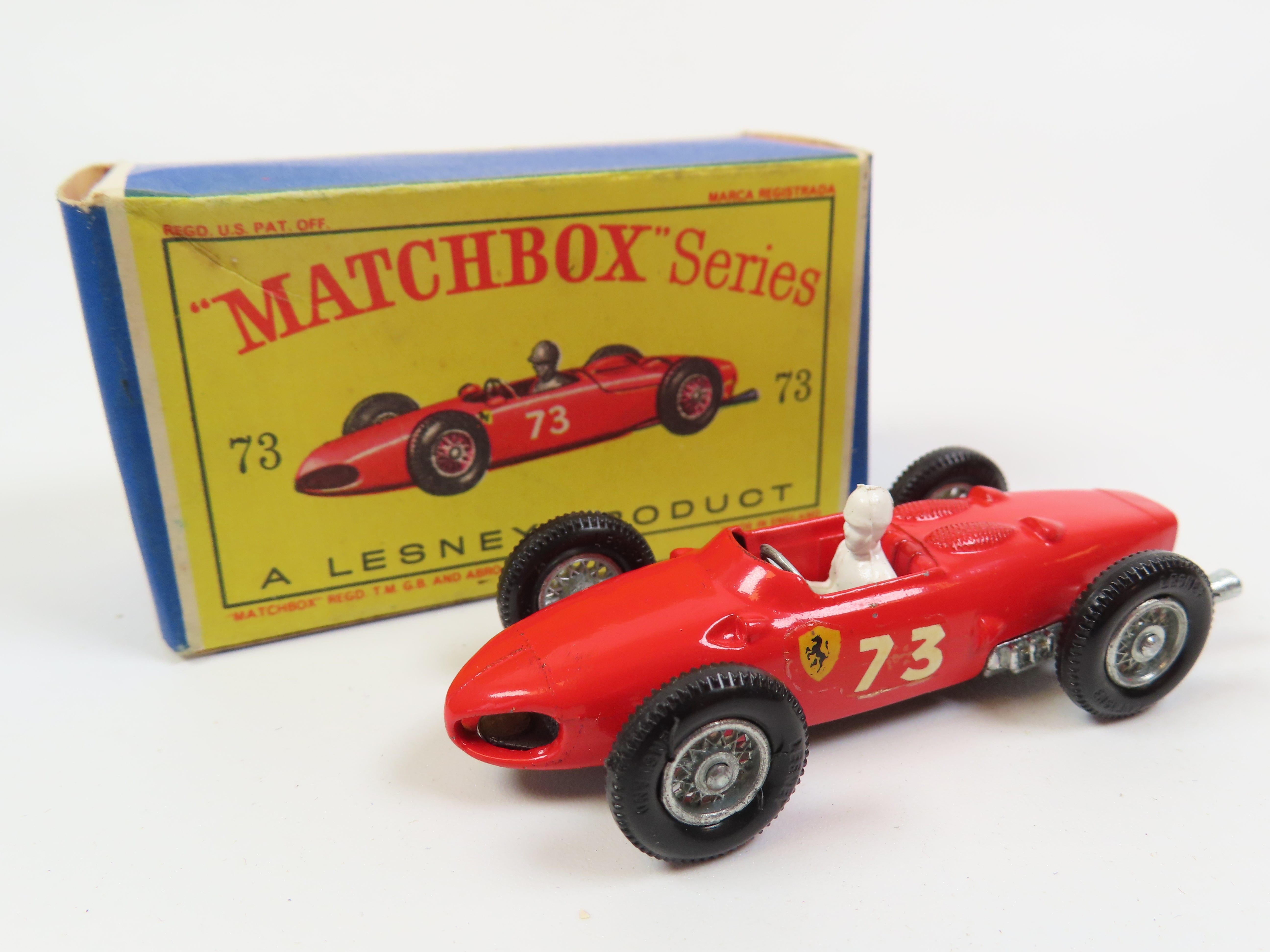 Matchbox No.73 Ferrari Racing Car in bright red with white driver figure and '73' and emblem decals to each side.