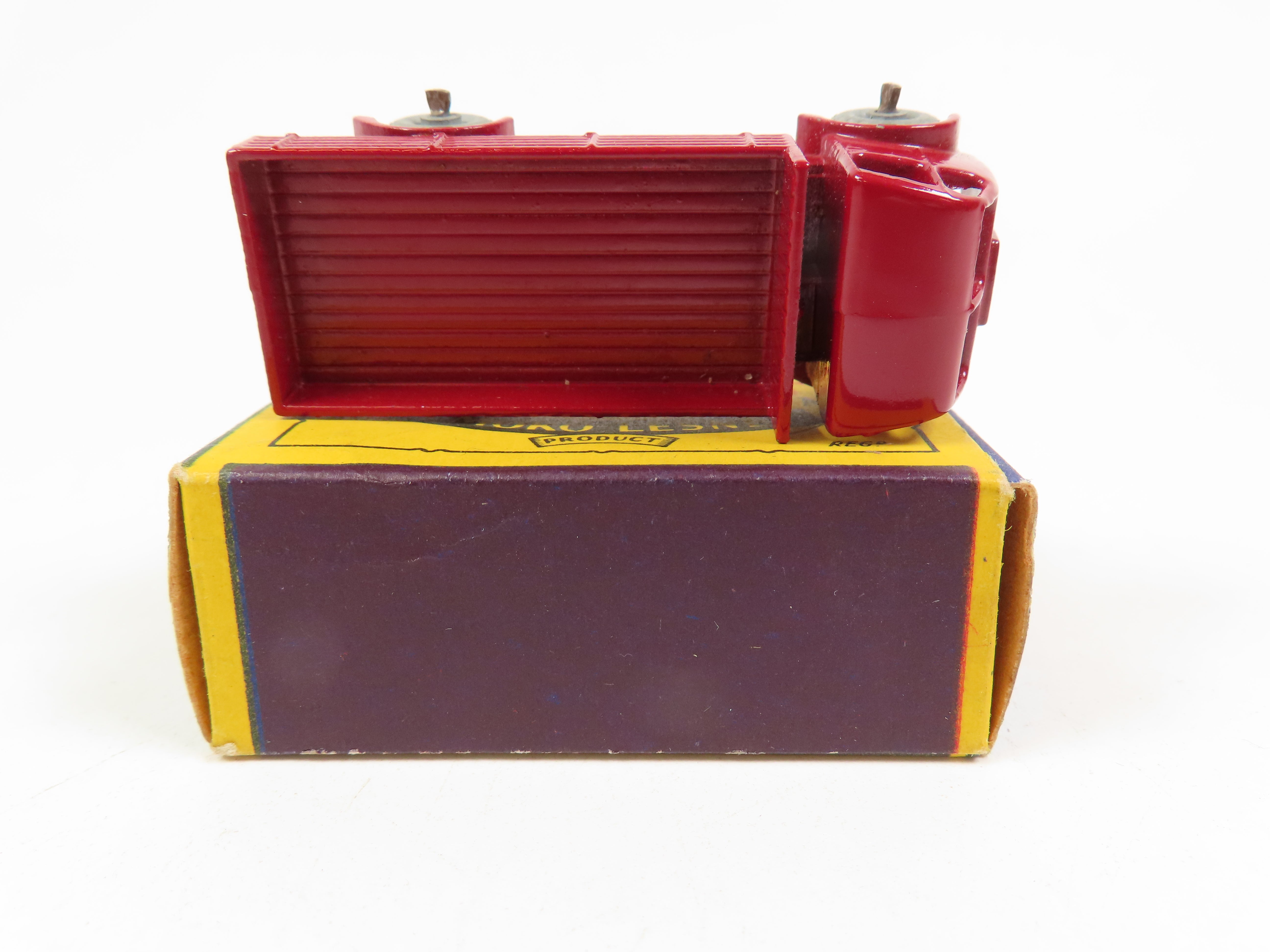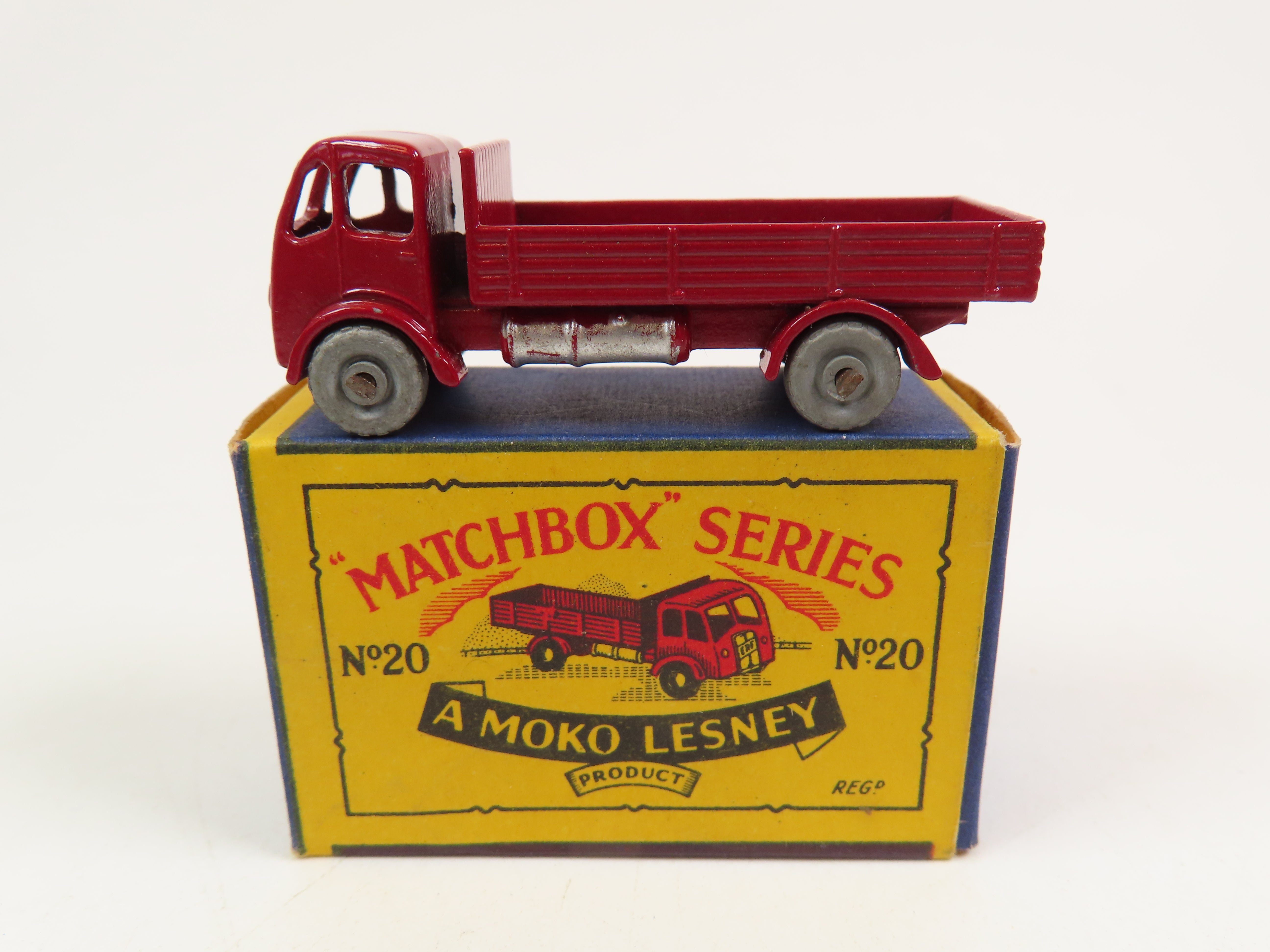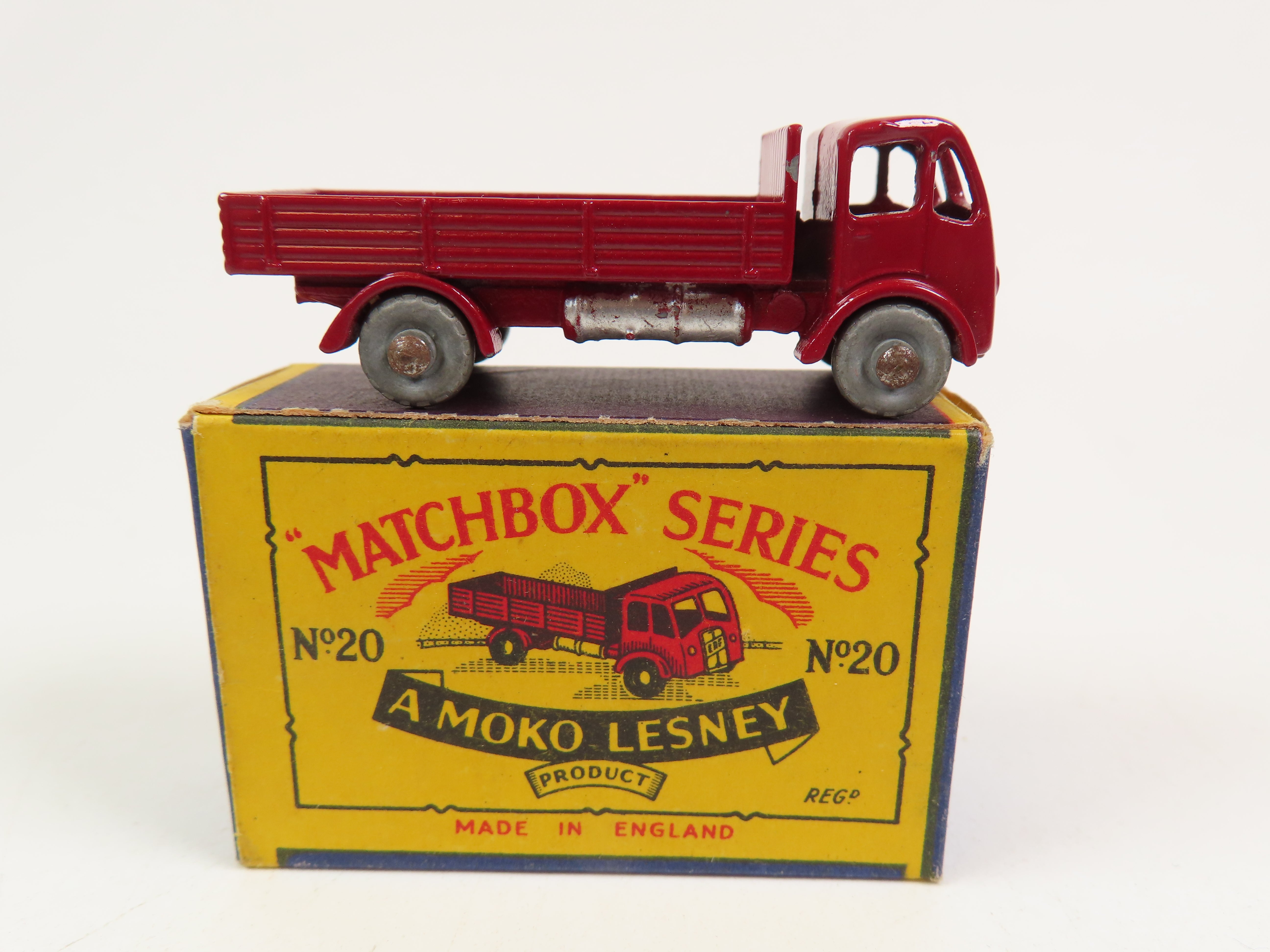 Matchbox No.20 ERF Stake Truck in maroon, with silver detailing and metal wheels.