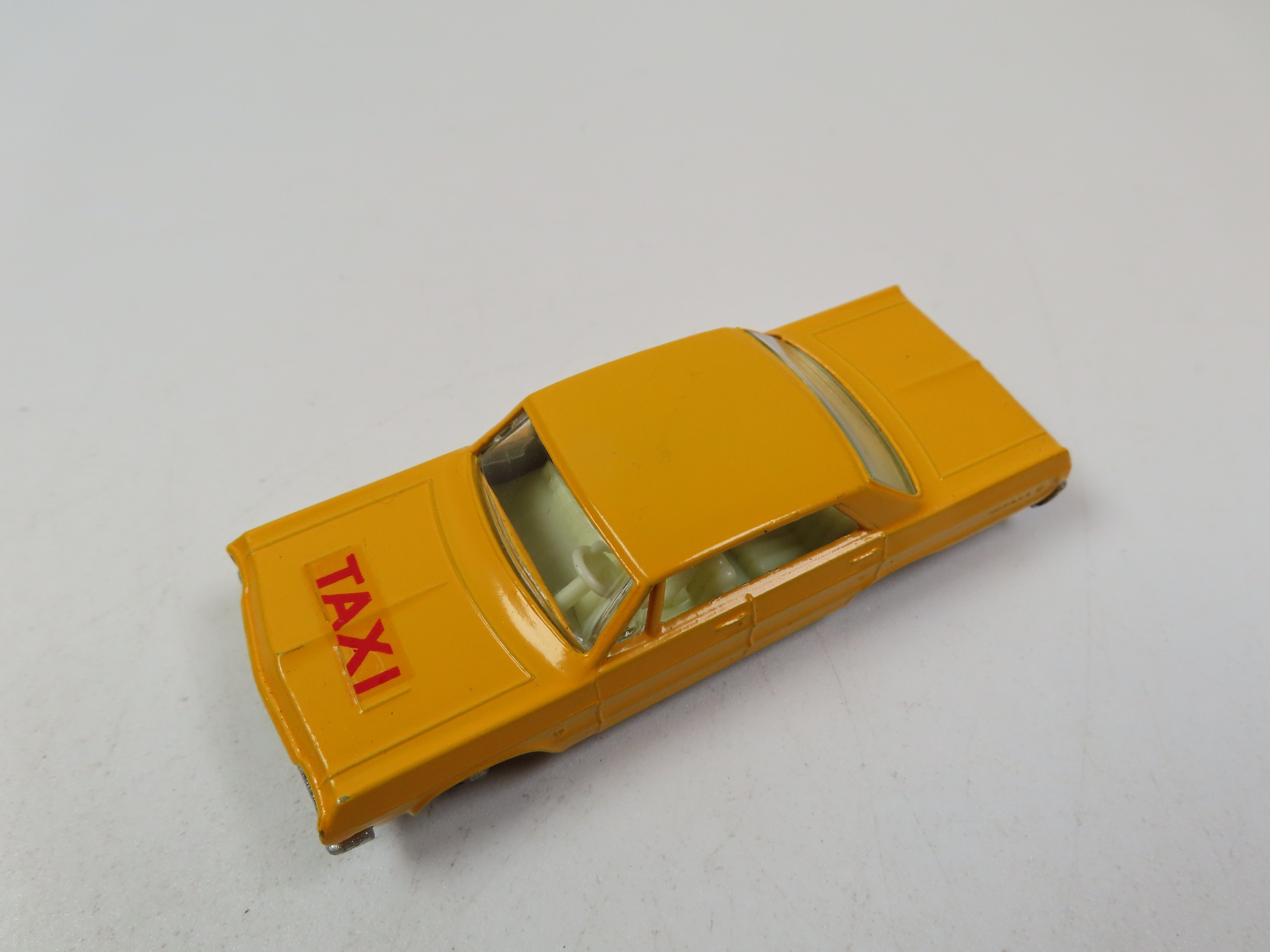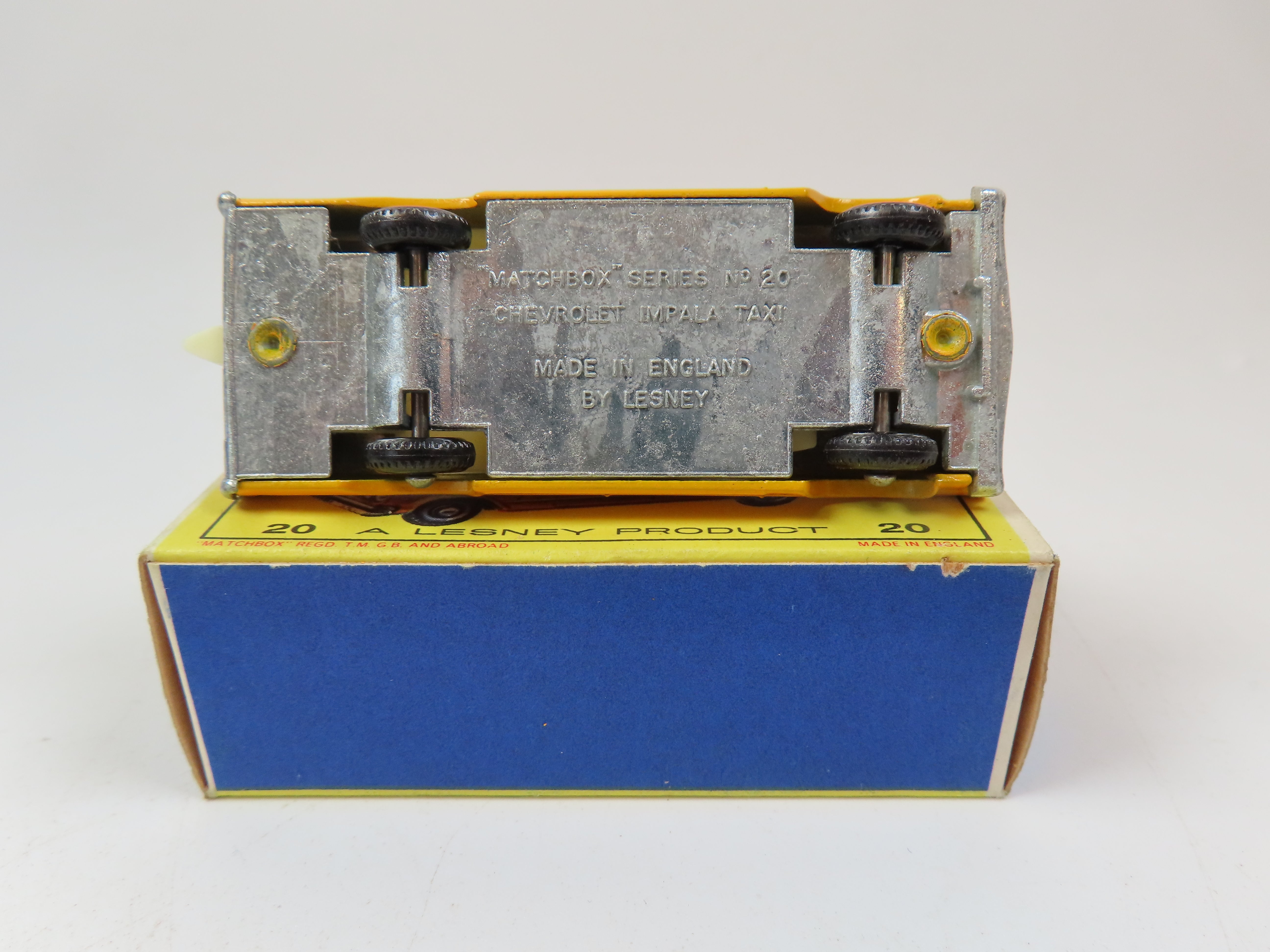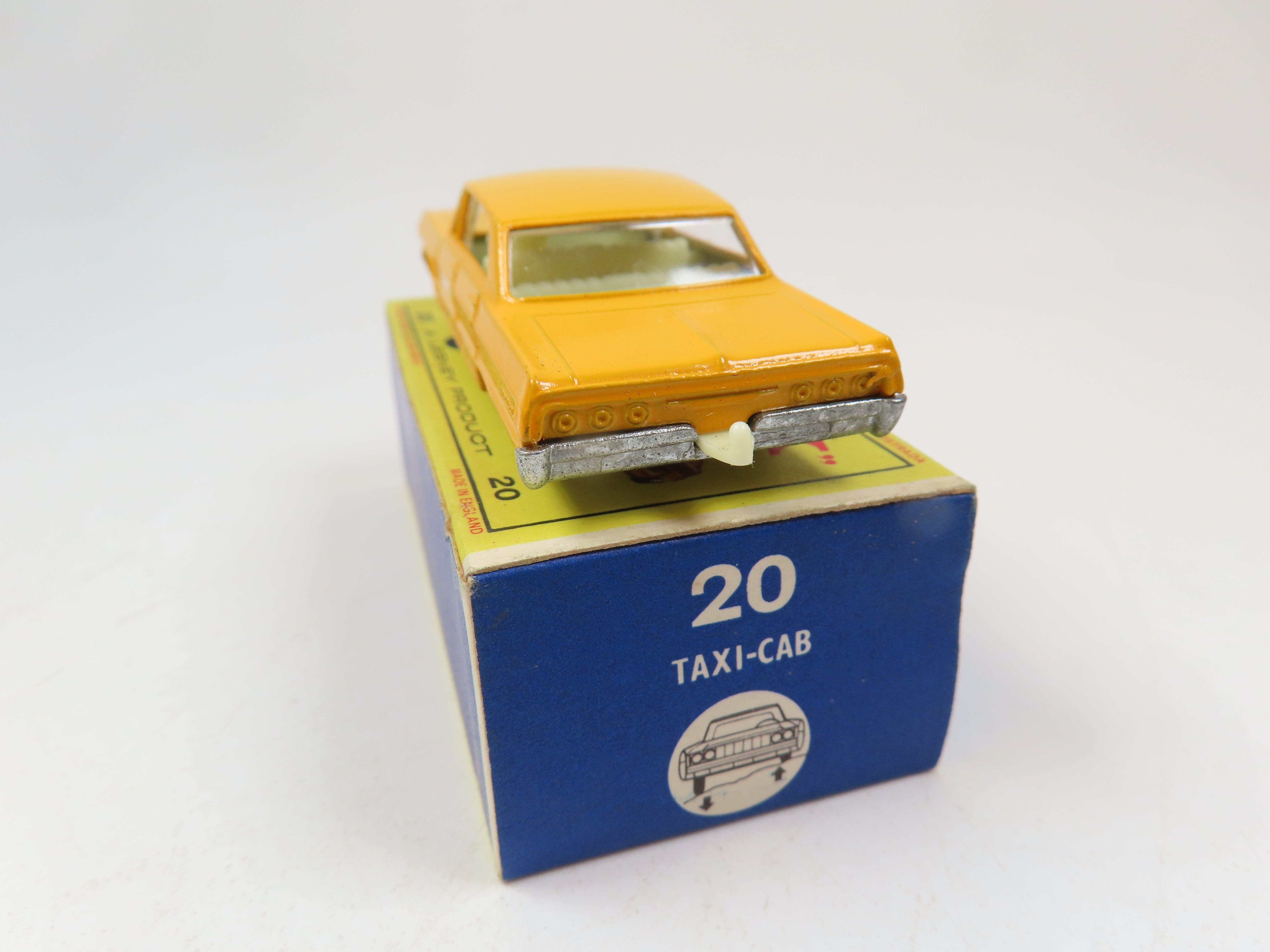 Matchbox No.20 Chevrolet Impala Taxi-Cab in a lovely yellow/orange with red 'TAXI' decal to the front, unpainted baseplate and black plastic wheels.