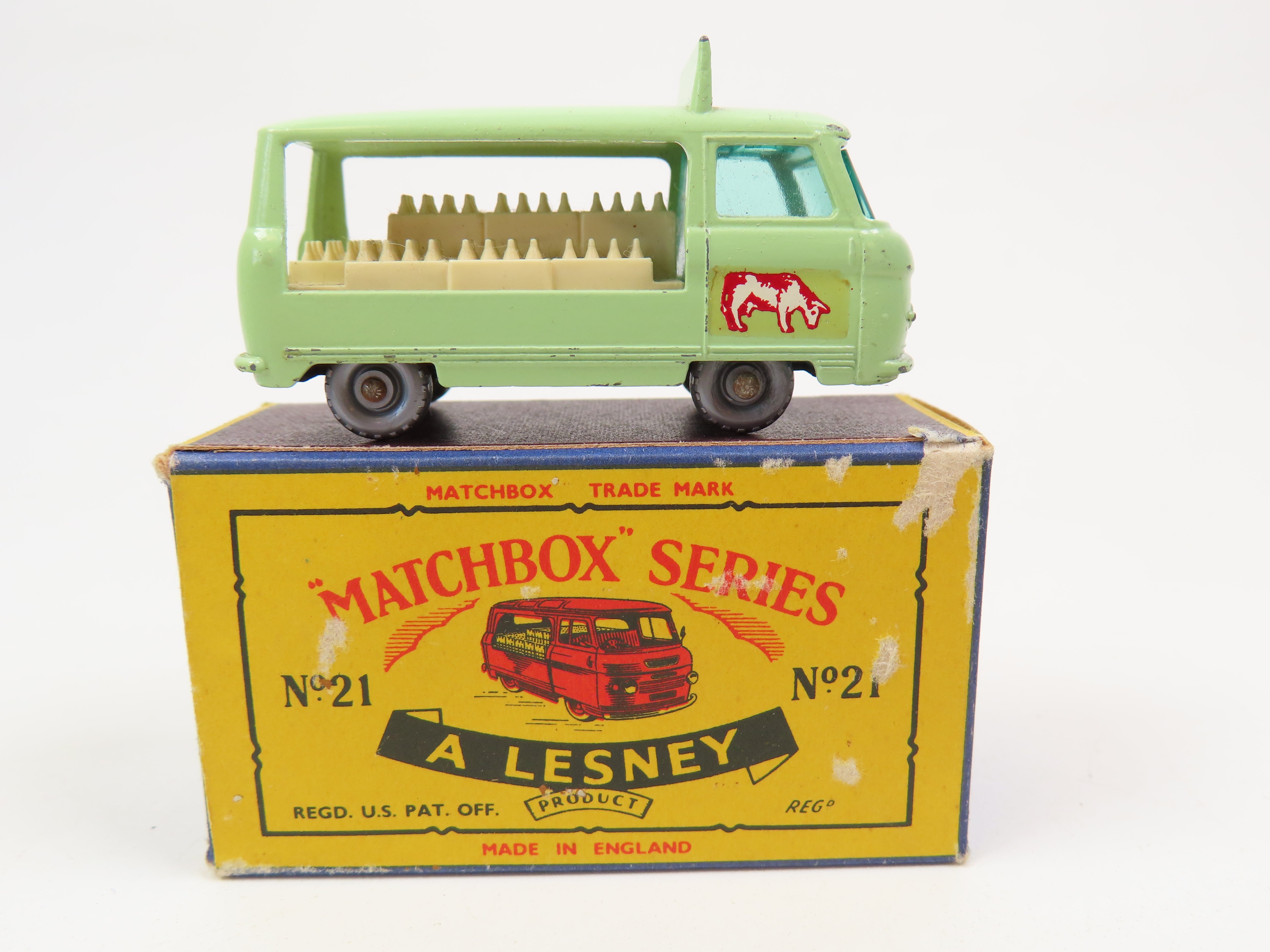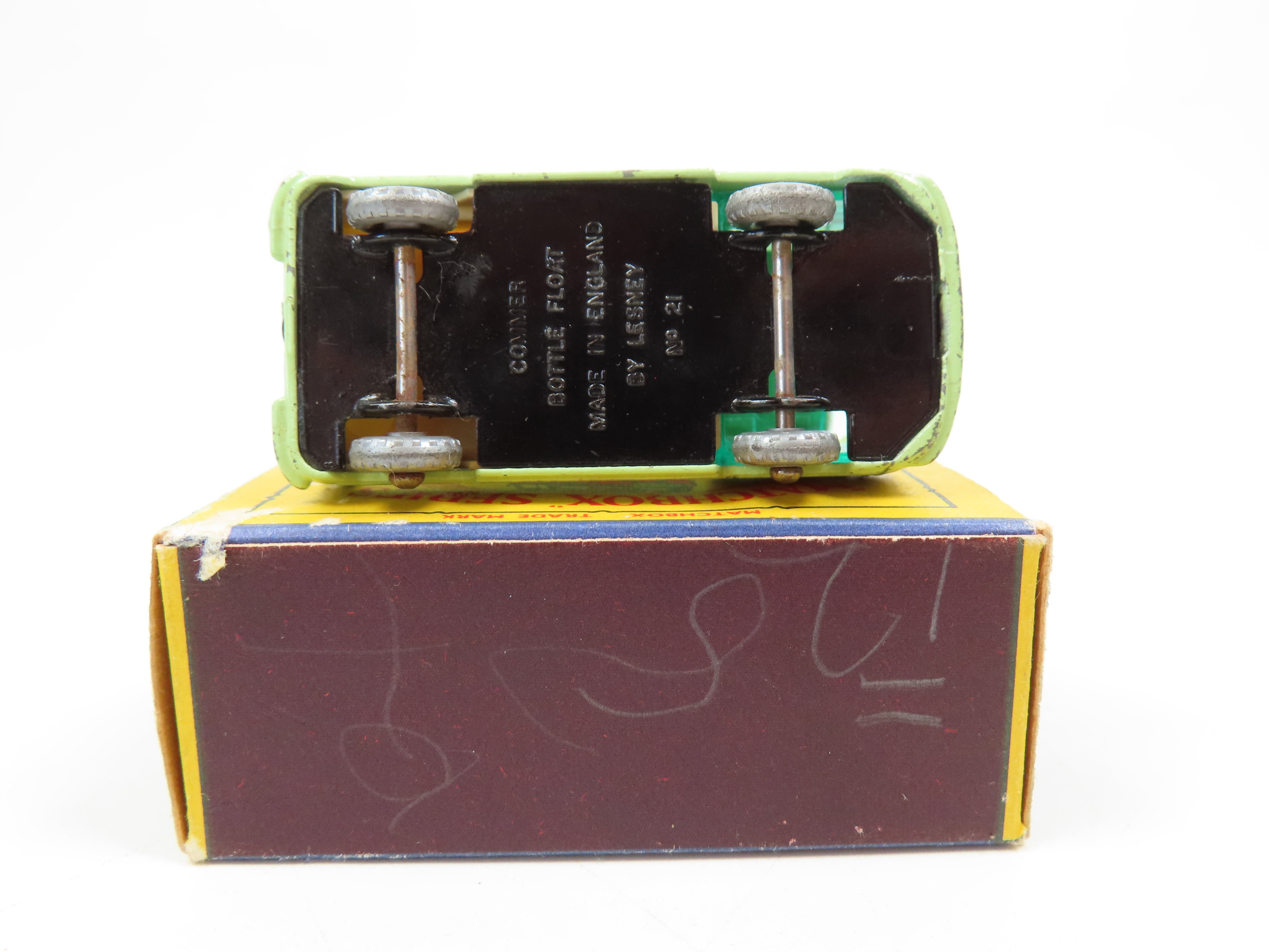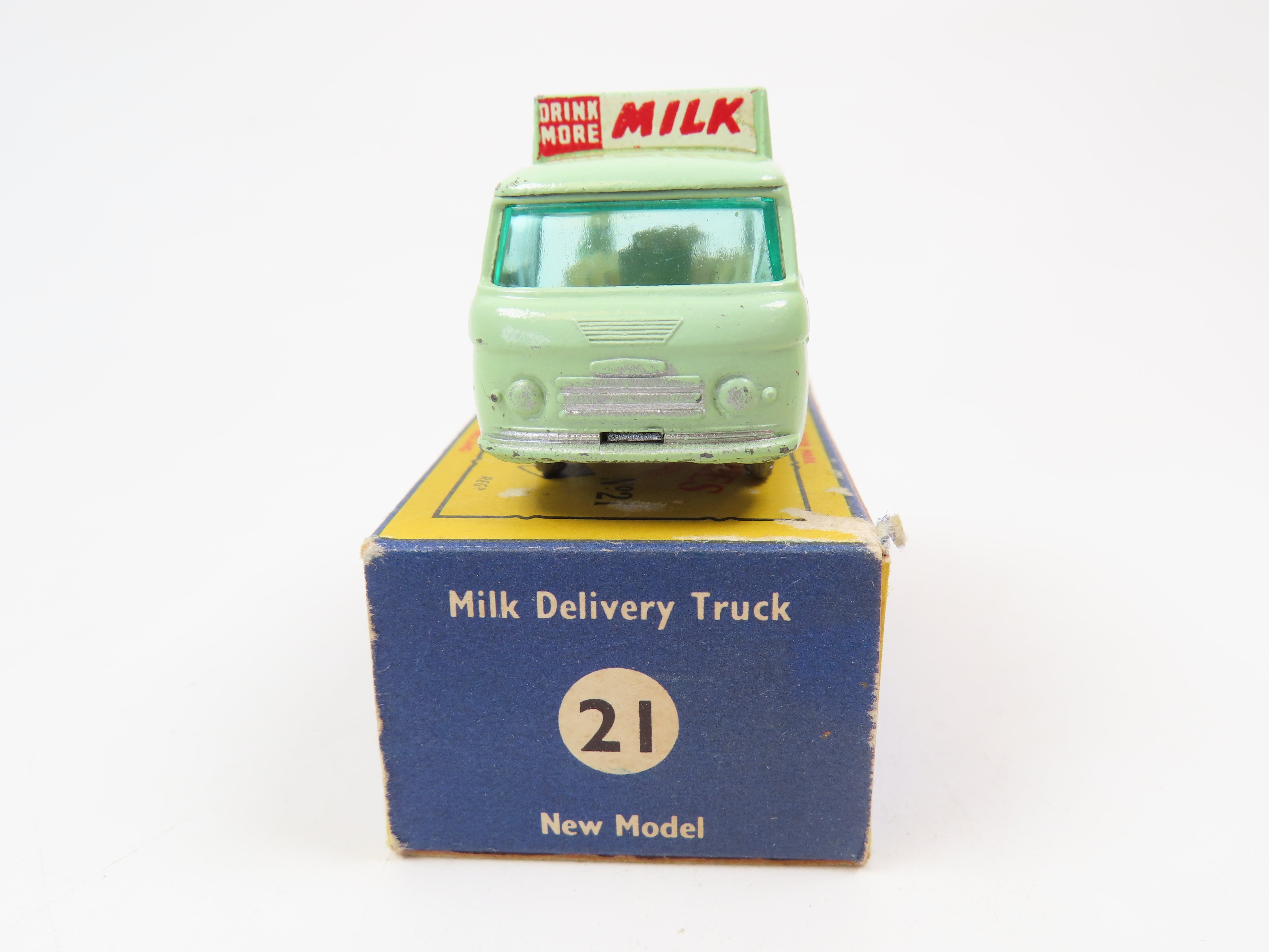Matchbox No.21 Milk Delivery Truck in light green with green tinted windows 'Drink More Milk' and cow decals.