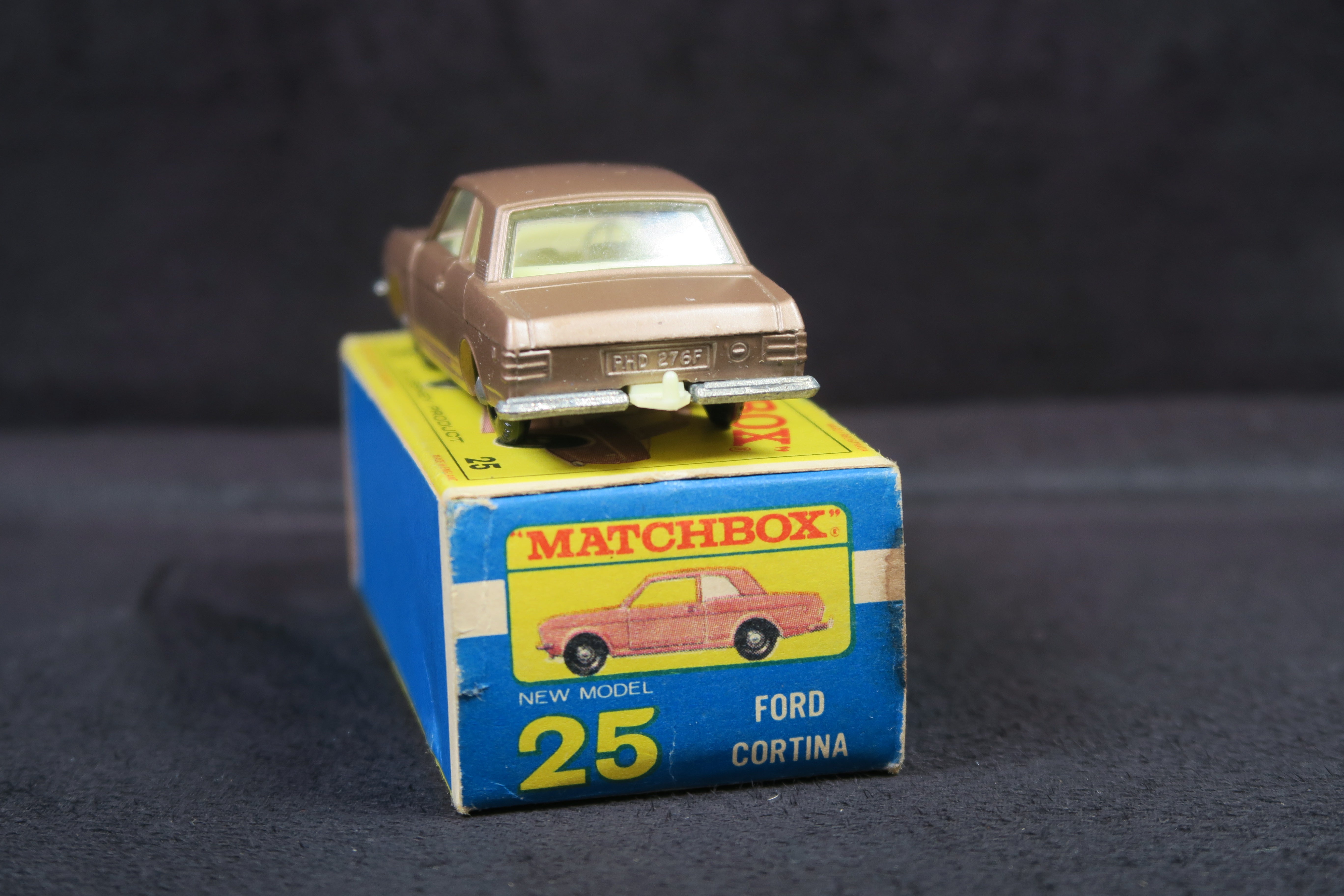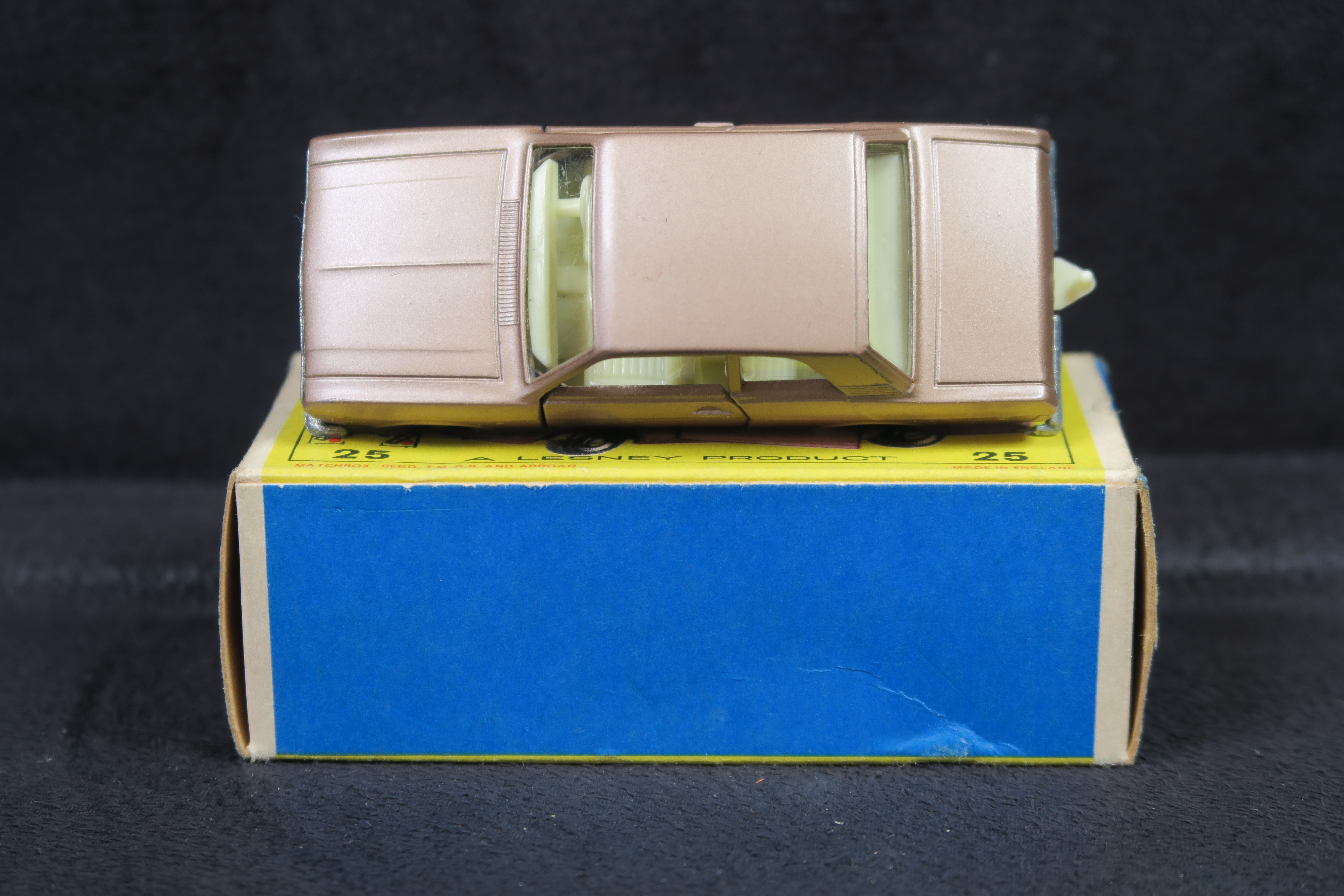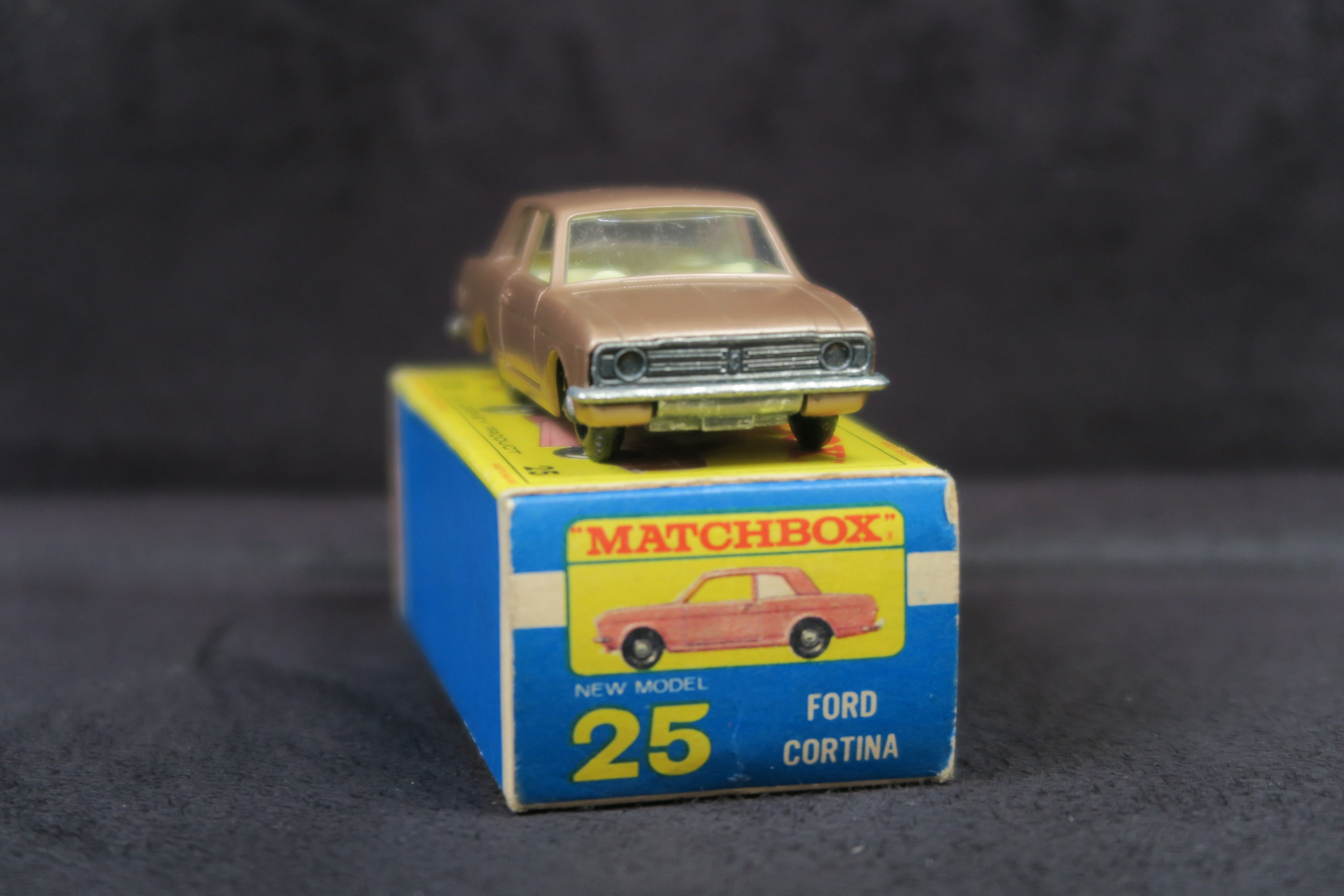 Matchbox No.25 Ford Cortina in a lovely light metallic brown with cream/pale yellow interior and tow hook and unpainted baseplate.
