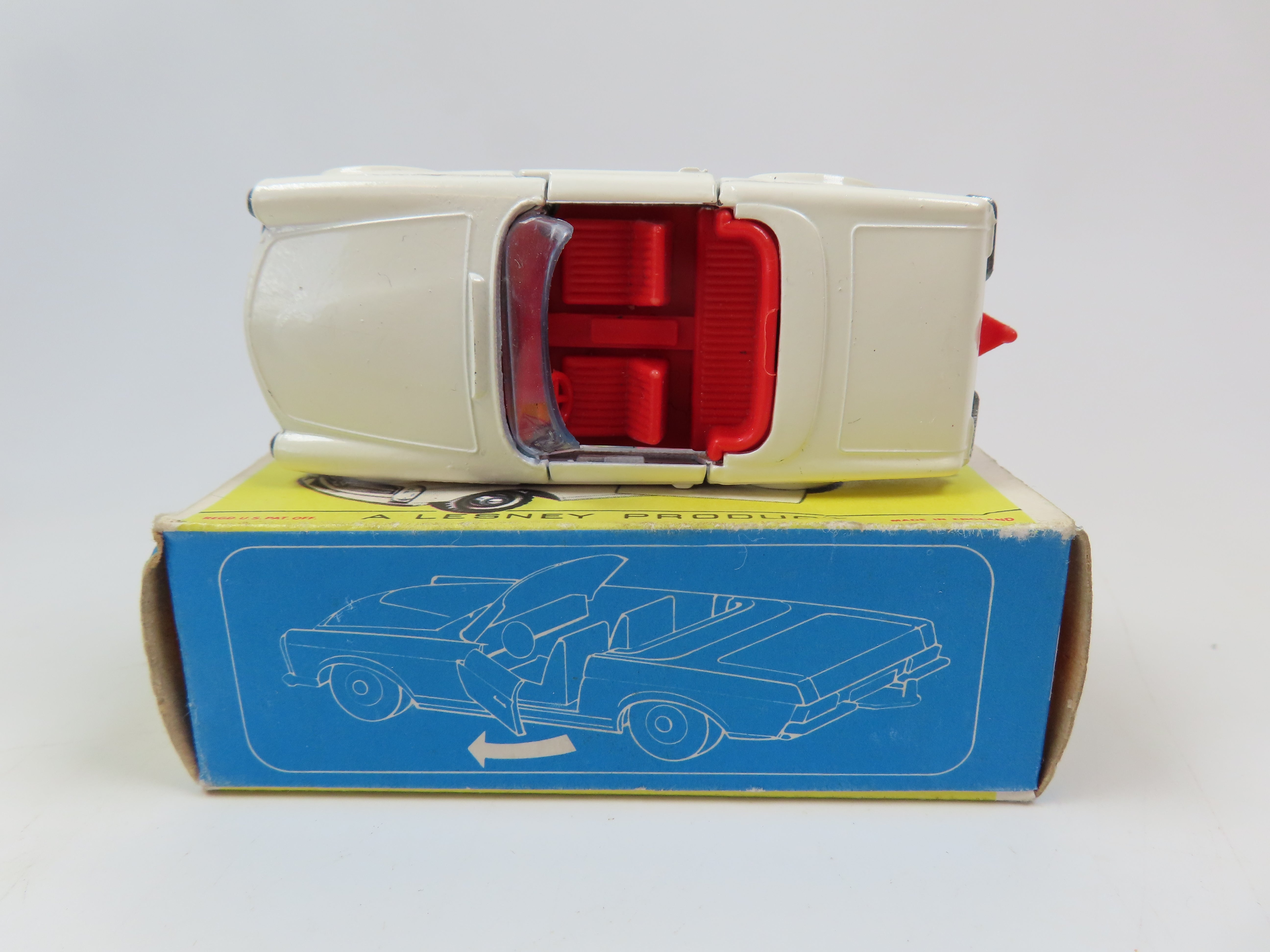 Matchbox No.27 Mercedes Benz 230 SL in cream with red interior and red plastic tow hook to the rear.