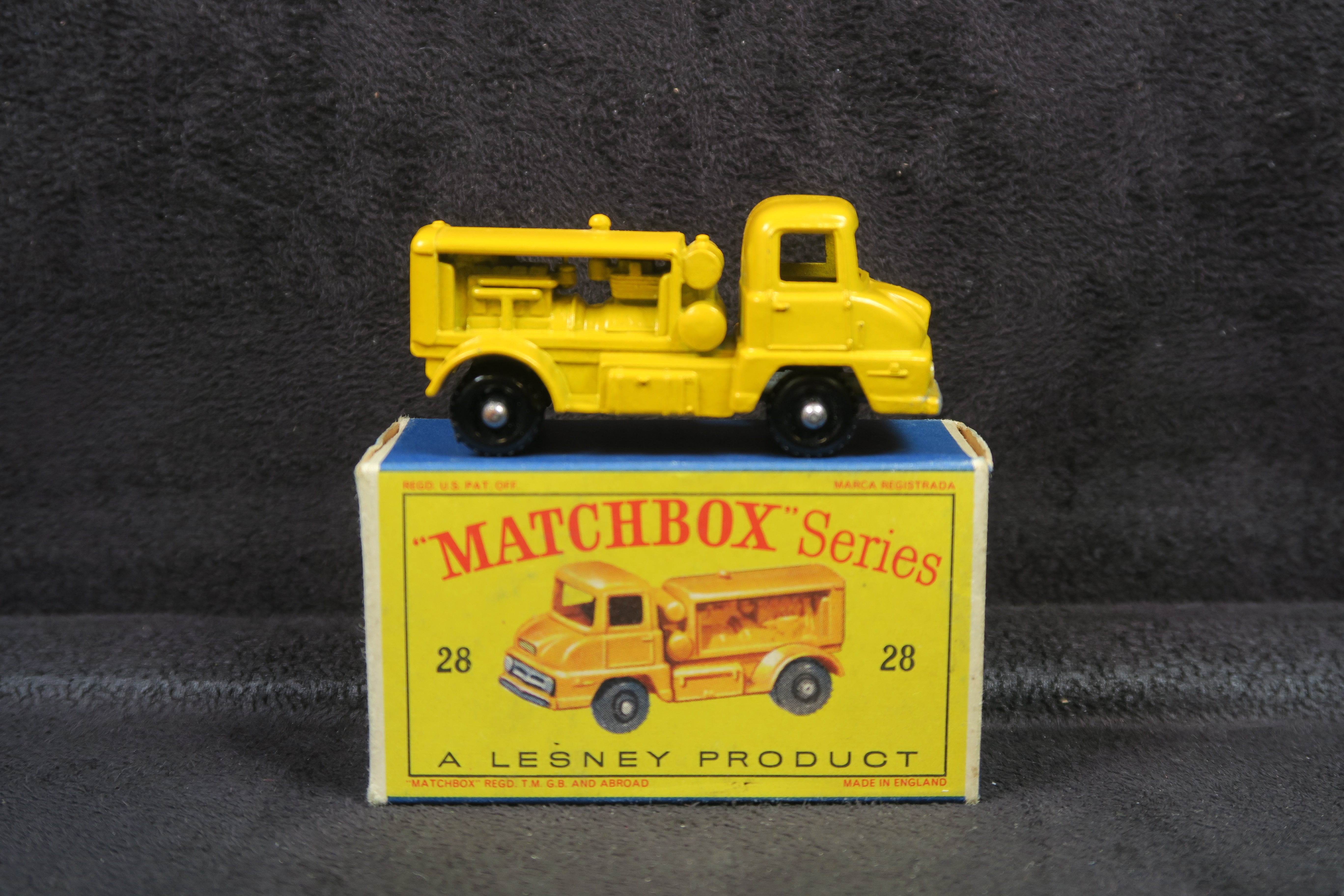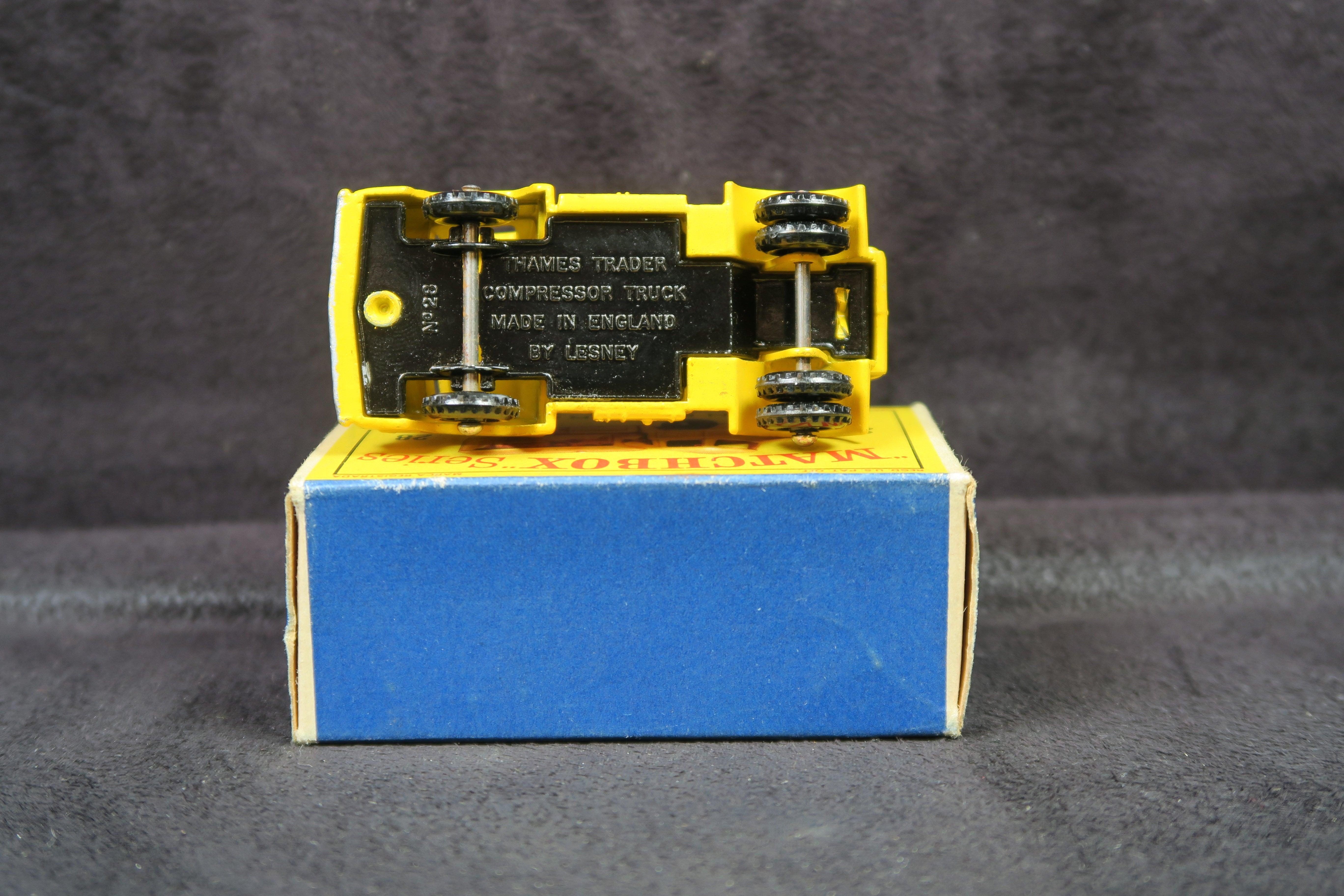 Matchbox No.28 Thames Trader Compressor Lorry in yellow , with a black baseplate and black plastic tyres.