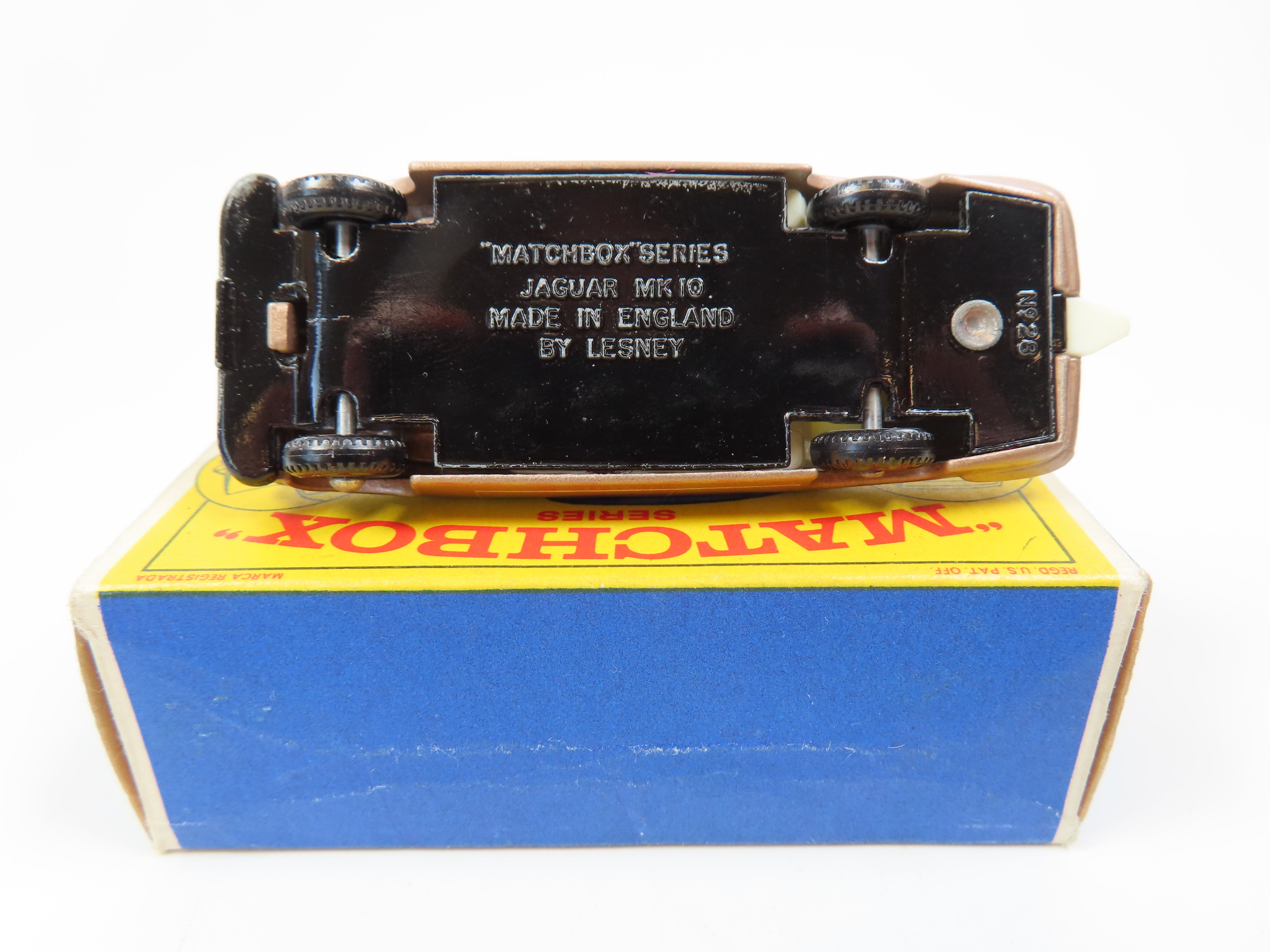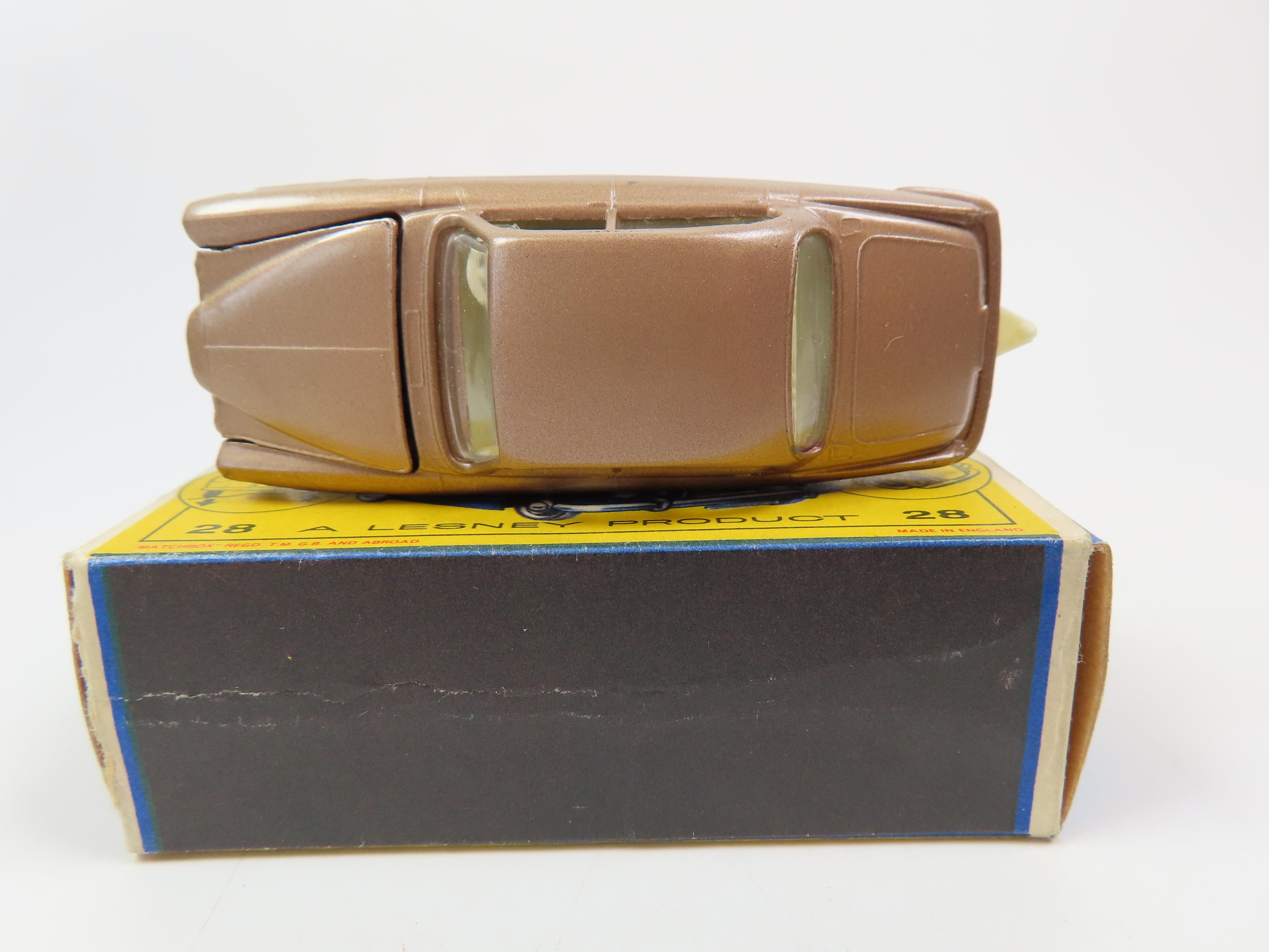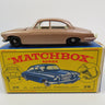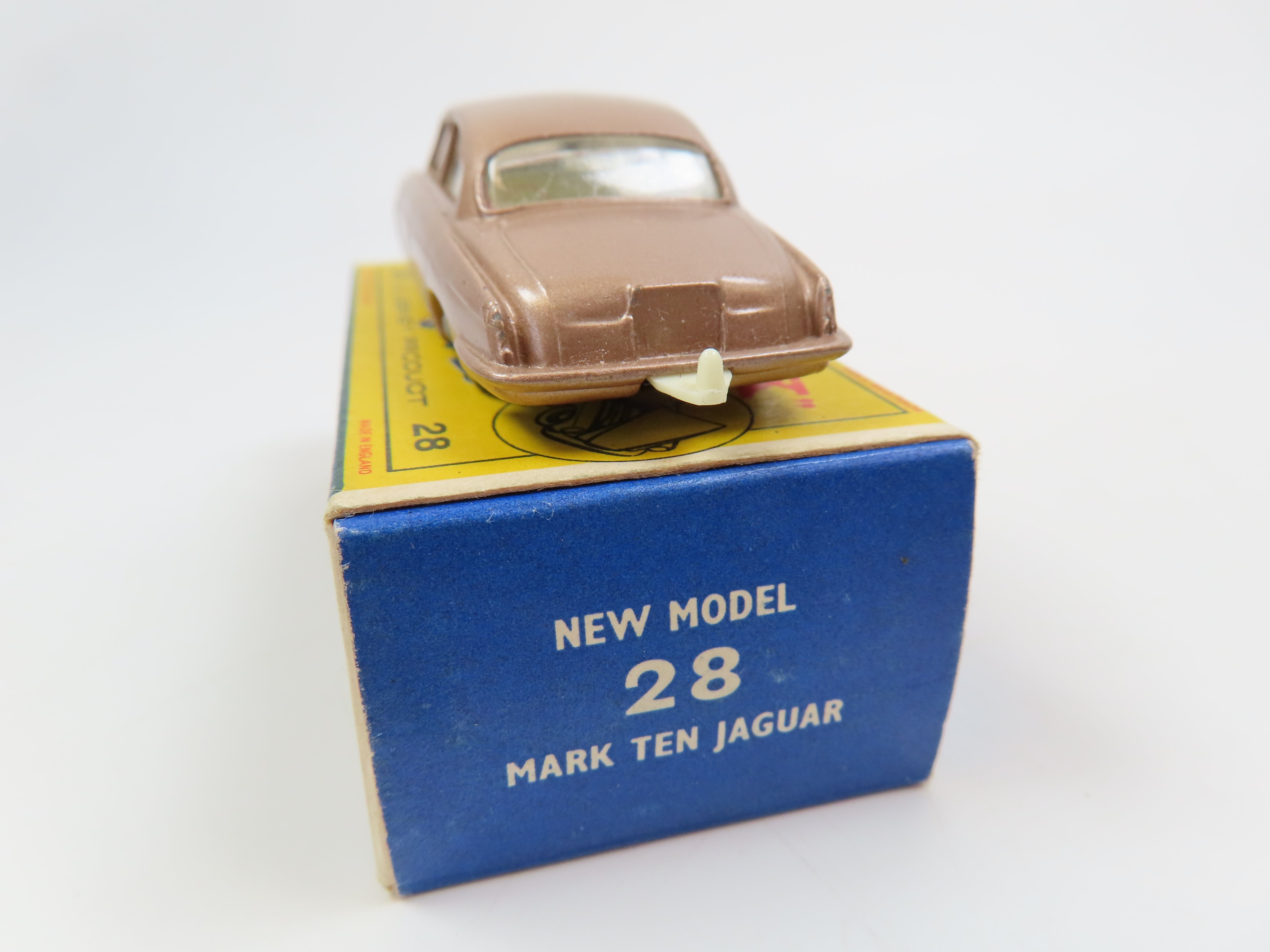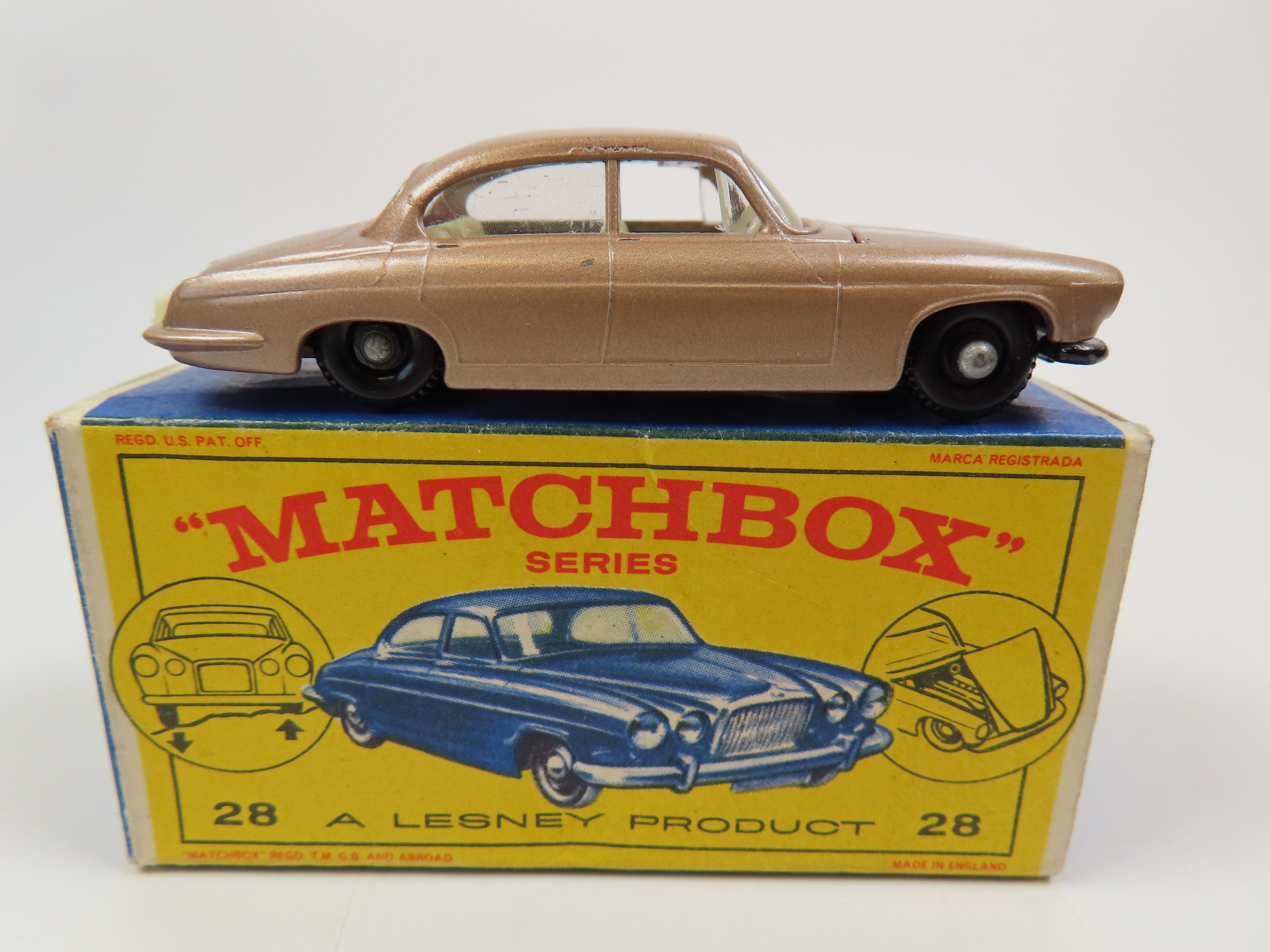 Matchbox No.28 Mark Ten Jaguar in a lovely metallic light brown colour, with black base plate and cream plastic tow hook.