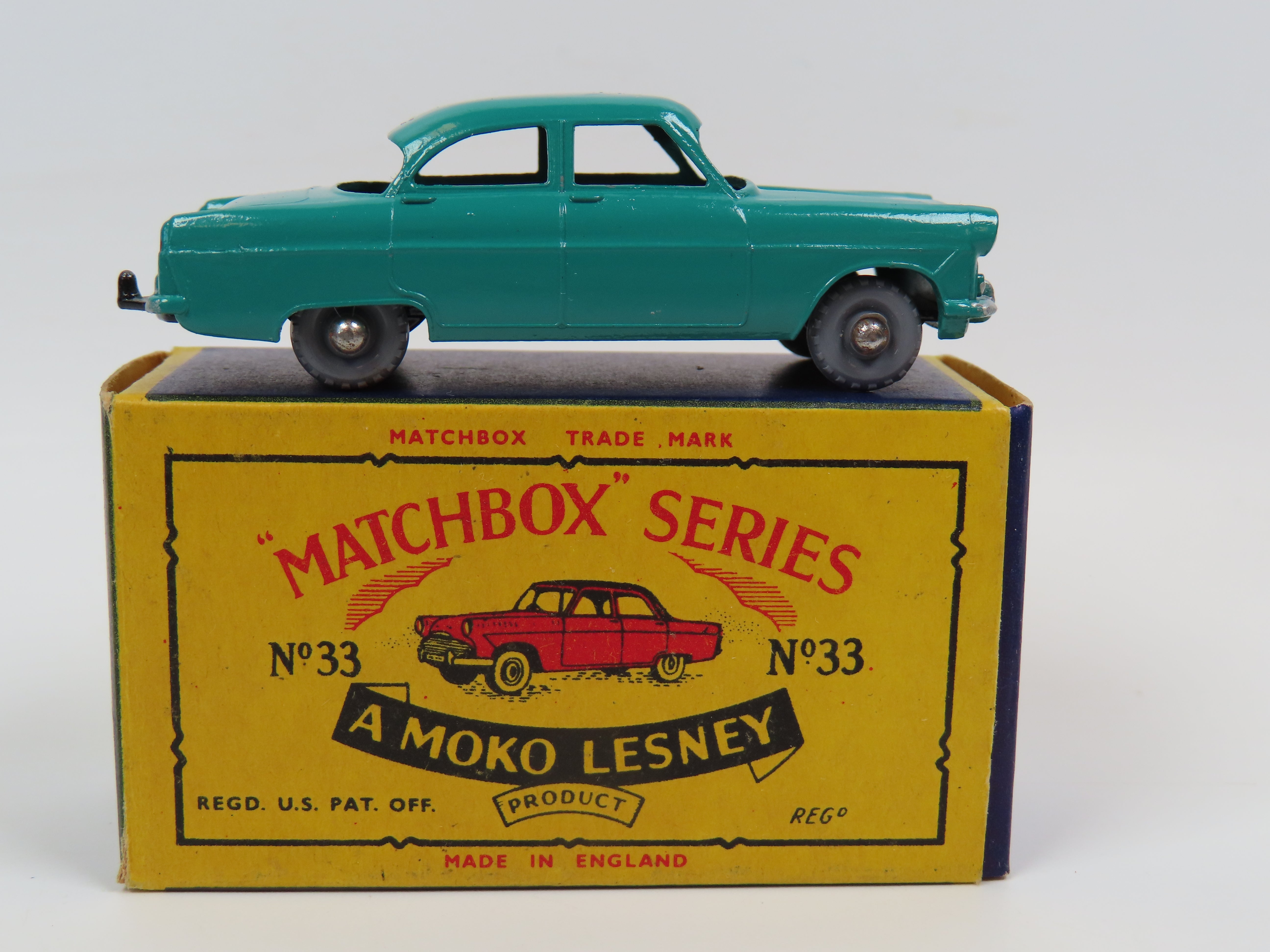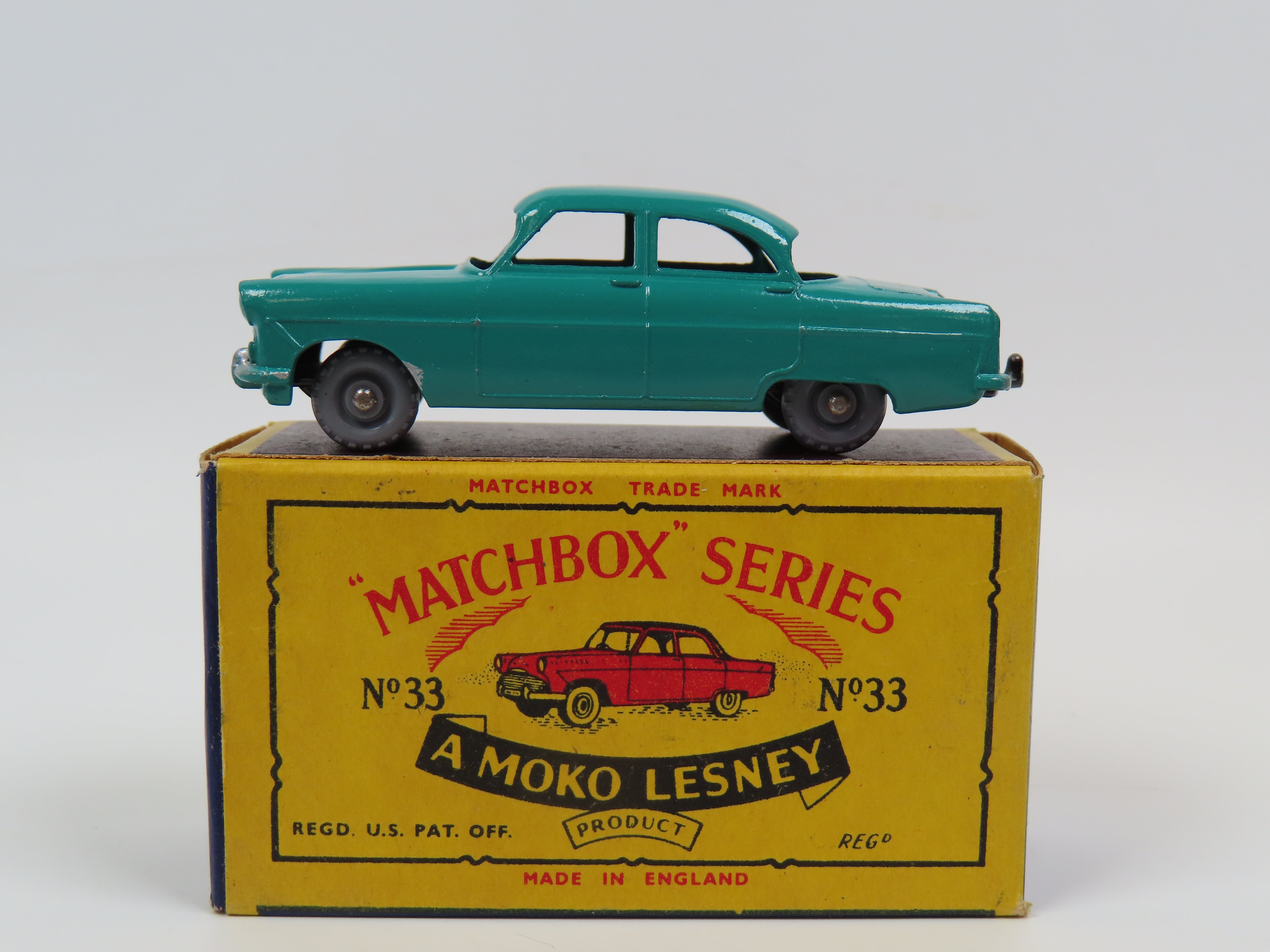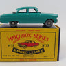 Matchbox No.33 Ford "Zodiac" in sea green with silver painted grille and bumper and grey plastic wheels.